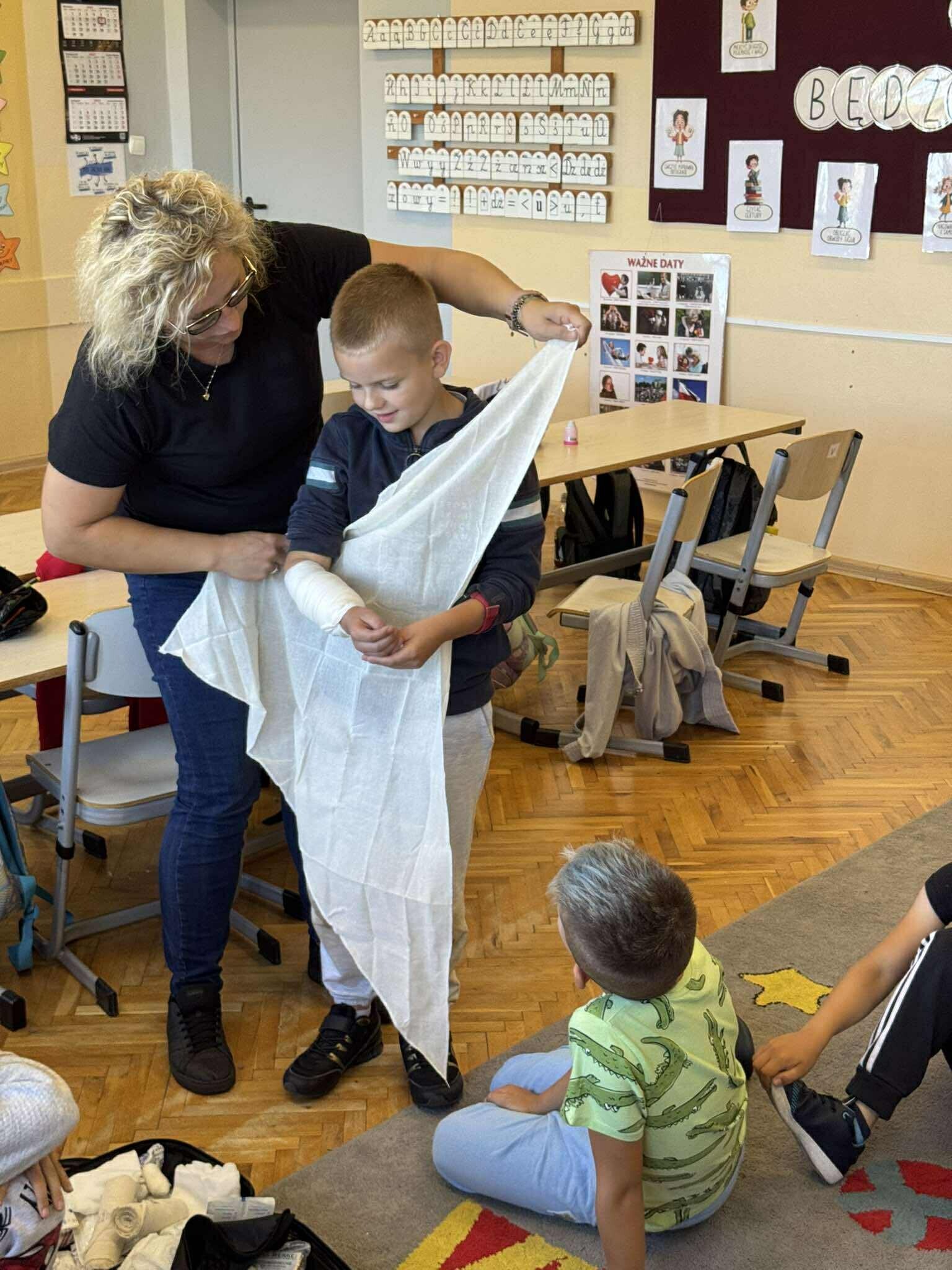 W klasie 3. odbyły się zajęcia z opatrywania ran i krwotoków oraz stabilizacji ręki za pomocą chusty.