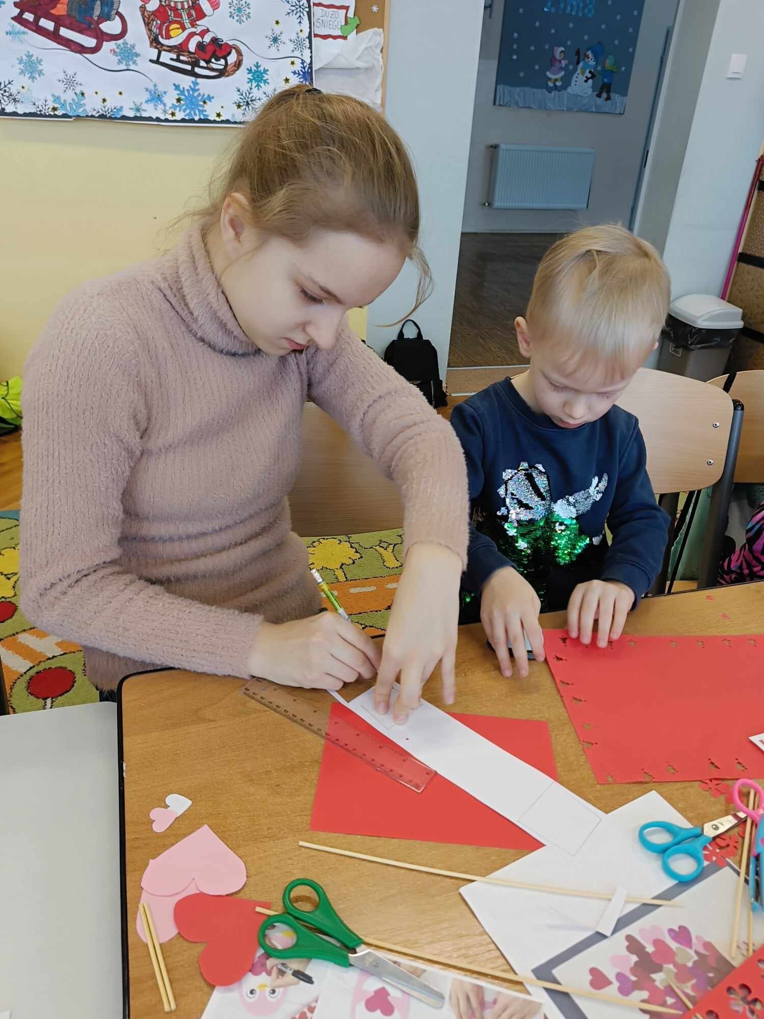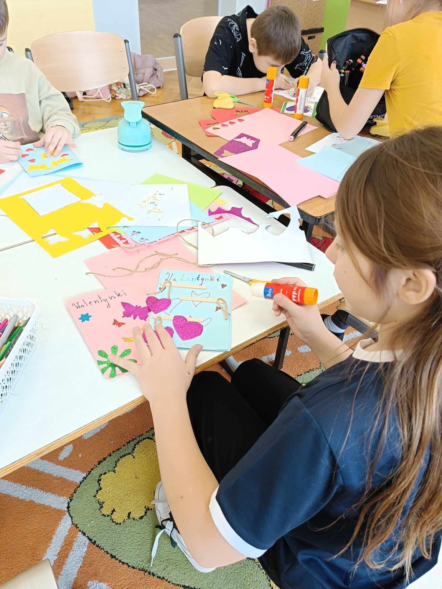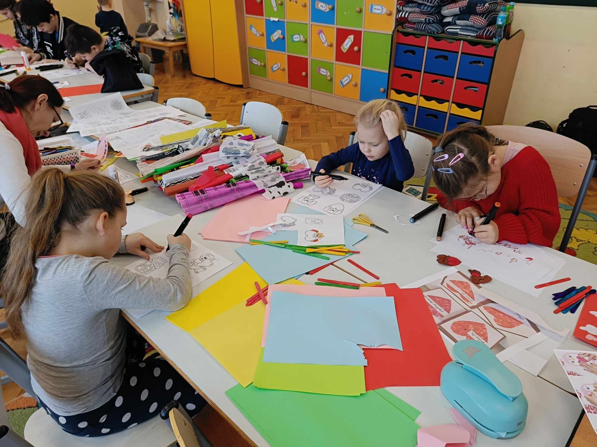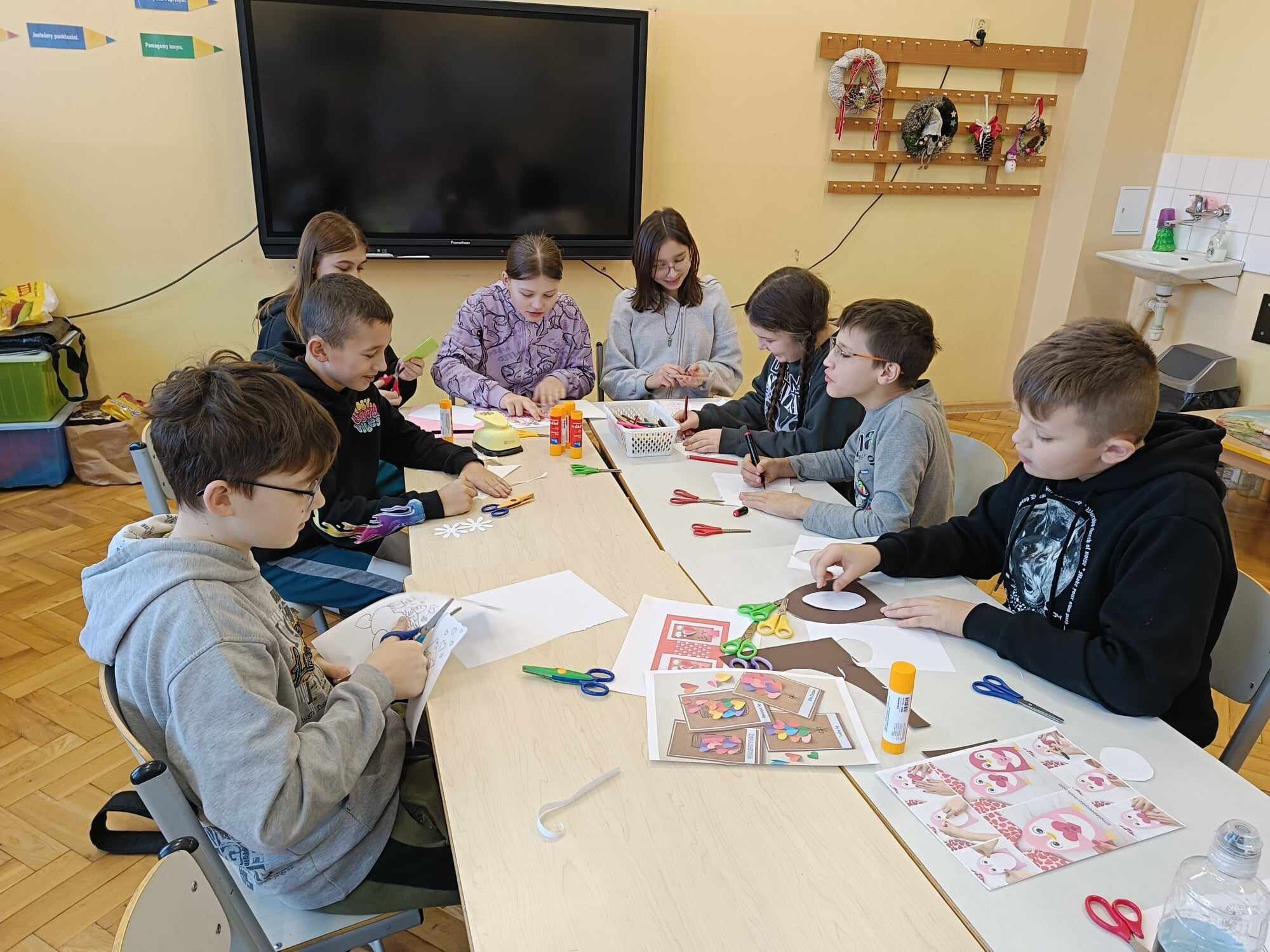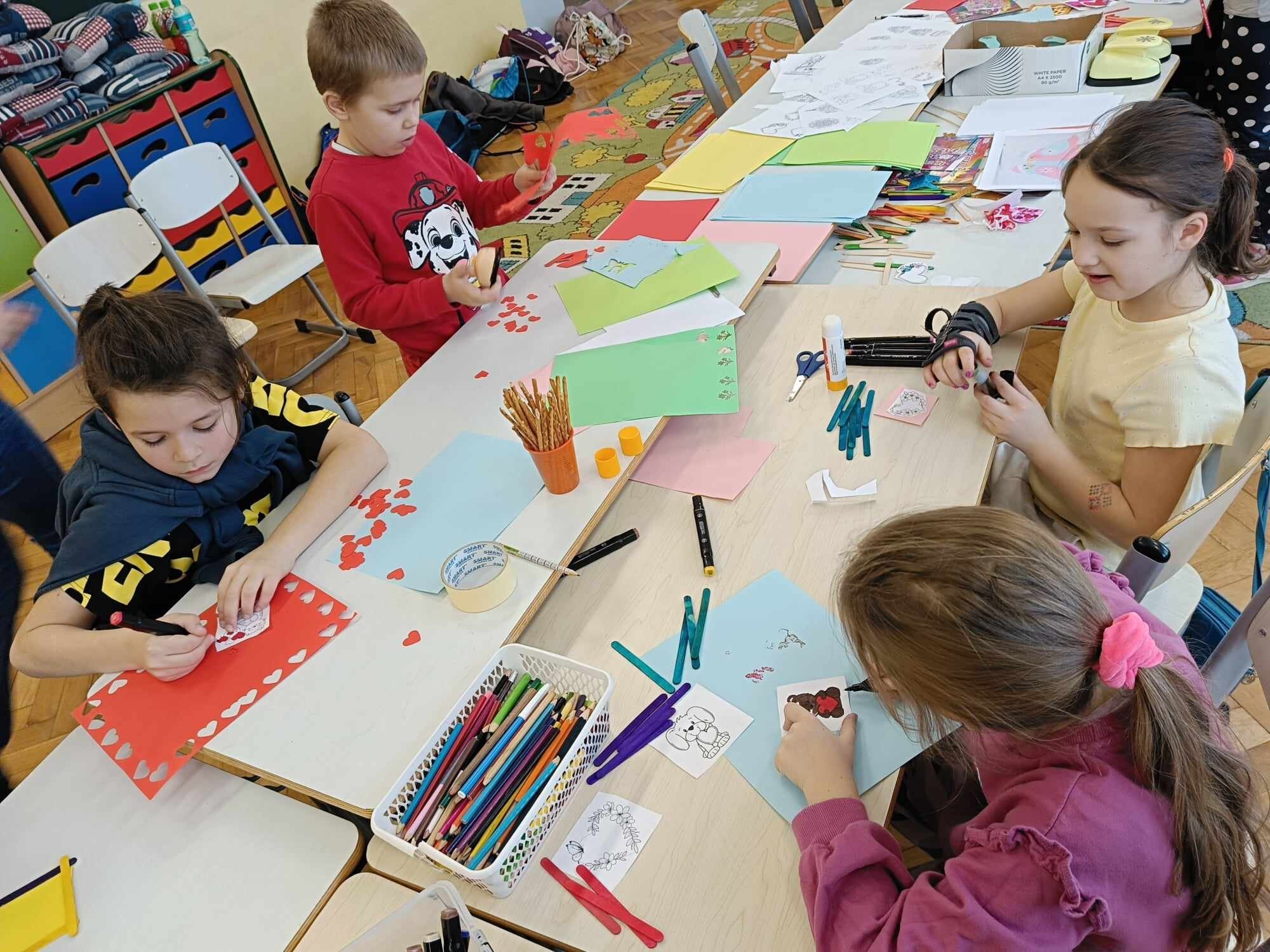Czwarty dzień ferii na zajęciach plastycznych minął pod hasłem: walentynki. Dzieci oprócz kartek walentynkowych tworzyły także obrazki w ramkach z wykorzystaniem drewnianych patyczków. Nie zabrakło także zabawy integracyjnych, które świetnie pogłębiły relacje rówieśnicze. Na zajęciach sportowych dalsza część integracji poprzez zabawy zespołowe, a później ulubiona gra wszystkich uczestników ferii – unihokej. Niezastąpione panie z kuchni oprócz pysznego żurku przygotowały także frytki.