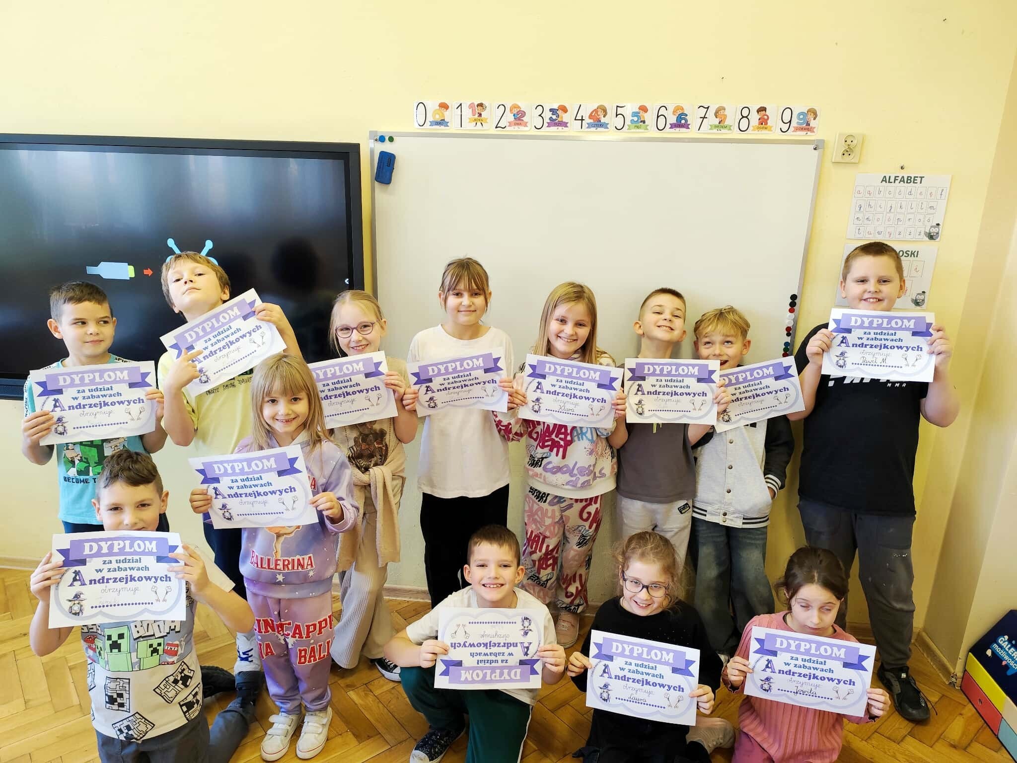 Andrzejki to czas radości, magii i wspólnej zabawy. Uczniowie klas I-III zapoznali się z andrzejkowymi tradycjami, a każde dziecko dzięki wróżbom miało możliwość poznania swojej przyszłości, oczywiście z „przymrużeniem oka”. Nie zabrakło ustawiania bucików i przebijania szpilką papierowych serc z imionami przyszłej sympatii. Dzieci losowały nazwy zawodów, które być może będą wykonywały w przyszłości. Czas pomiędzy wróżbami urozmaicały tańce, zaś energię zapewnił słodki poczęstunek.