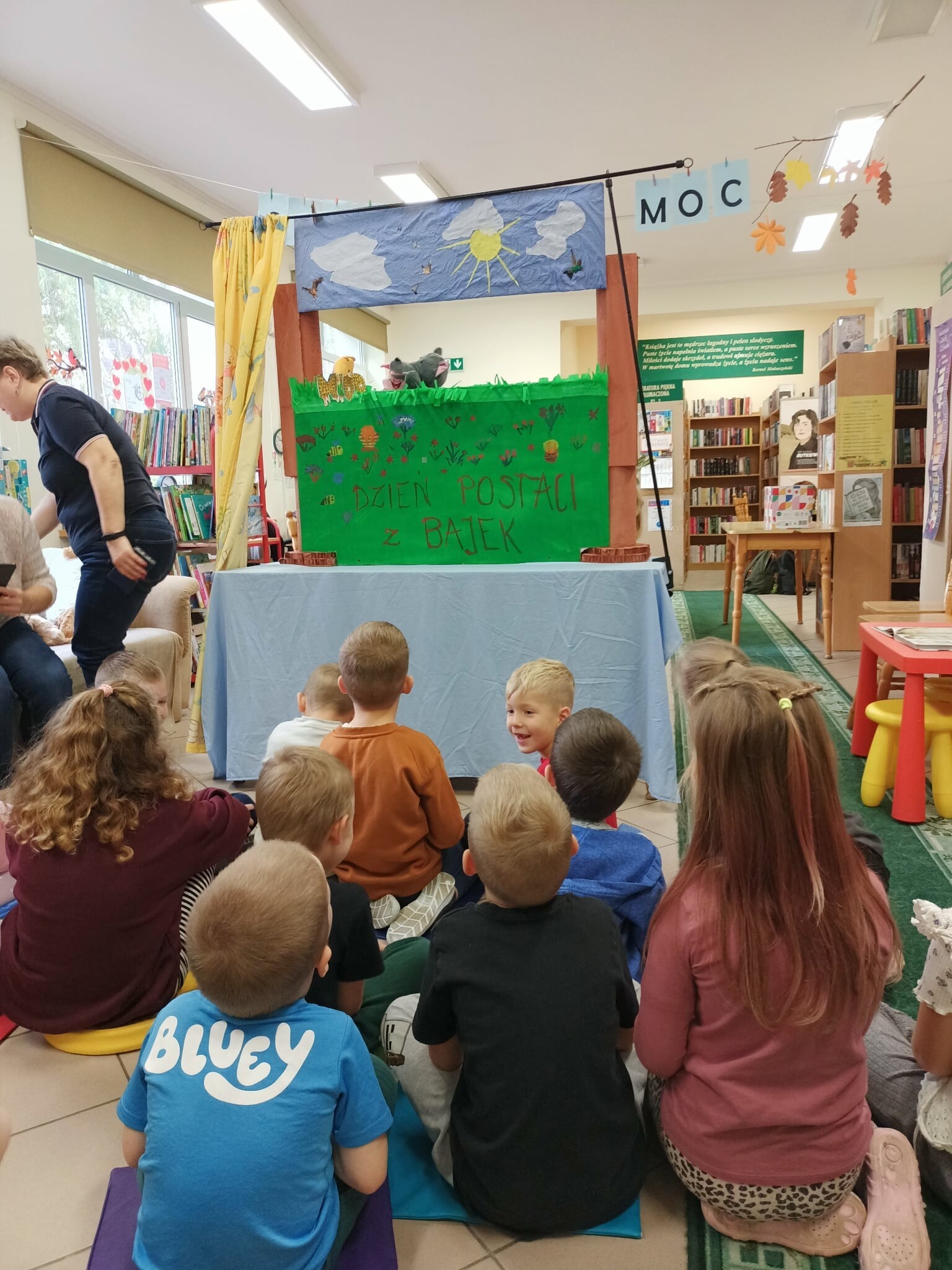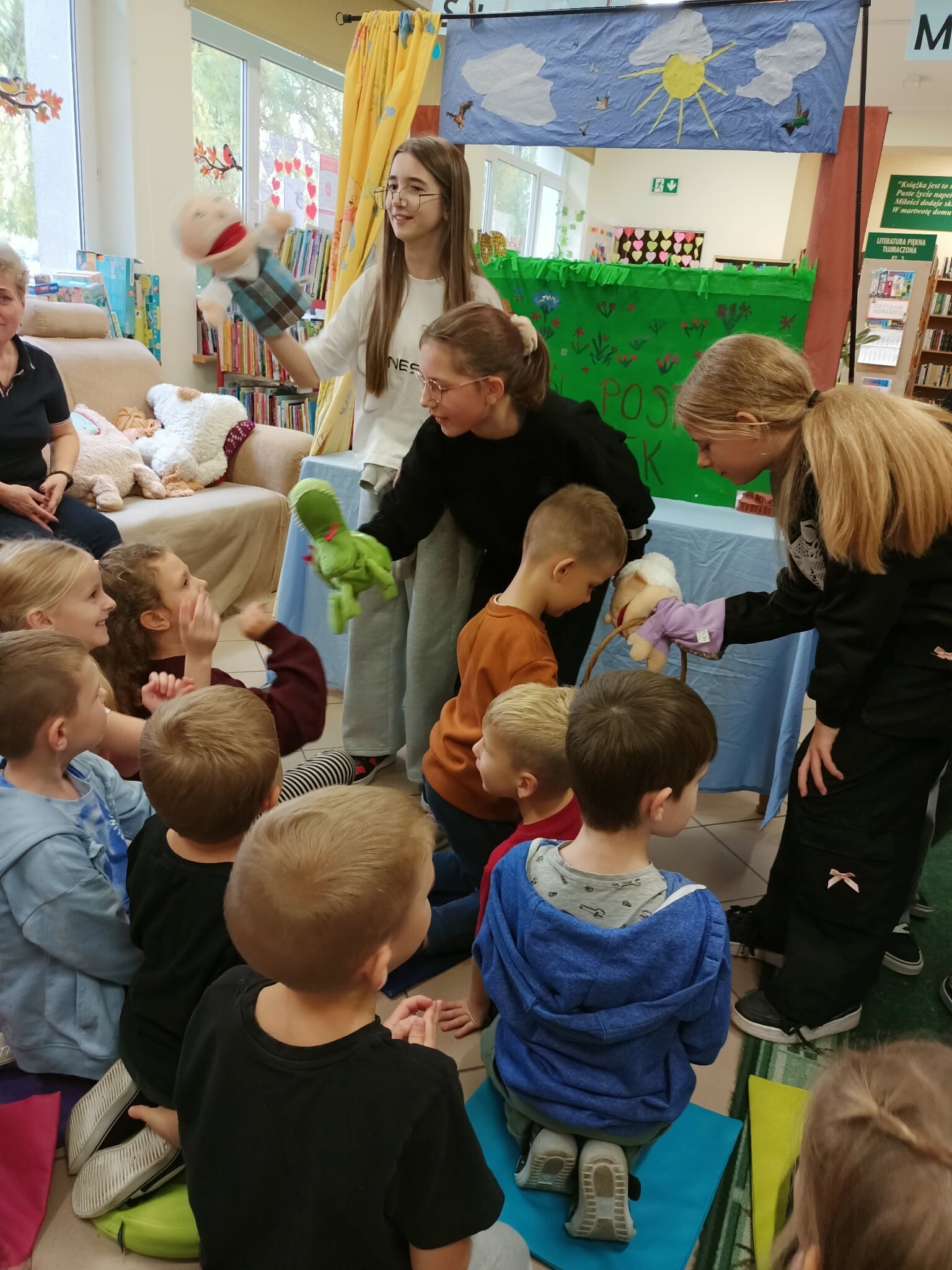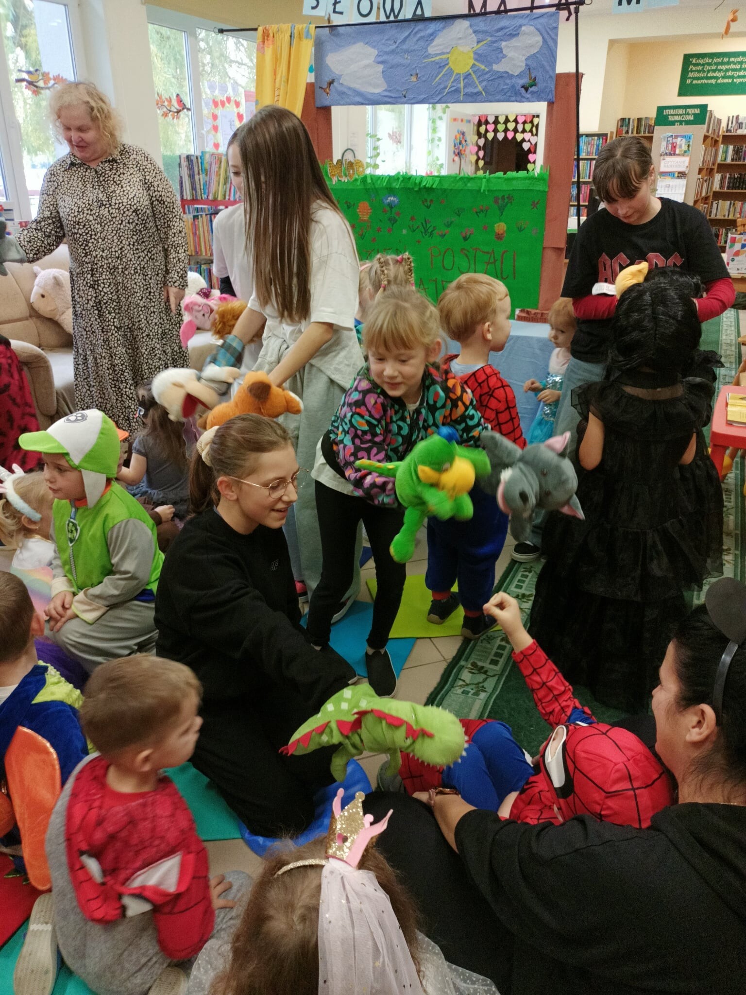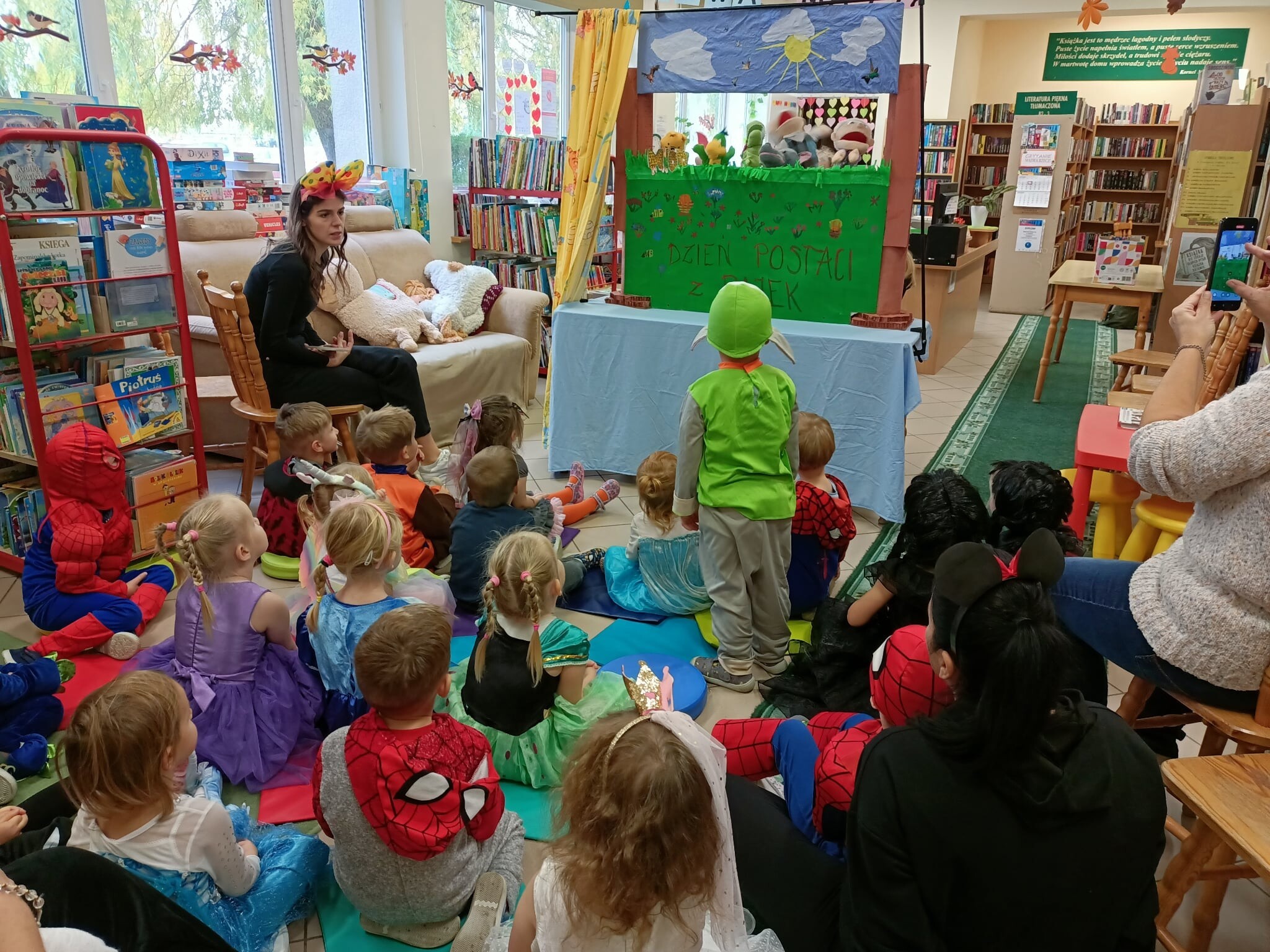 6 listopada Biblioteka gościła Calineczki, Koty w Butach, Czerwone Kapturki, królewny, księżniczki, a także superbohaterów i wiele innych postaci. Aby zachęcić najmłodszych do czytania bajek zaprosiliśmy je do obejrzenia przedstawienia przygotowanego według scenariusza pani Kasi z Biblioteki Publicznej. Postaciom z bajek głosu udzieliły uczennice z klas 3, 5 i 6. Starały się przekonać młodsze koleżanki i kolegów, że ważna jest zgoda i wspólne działanie.