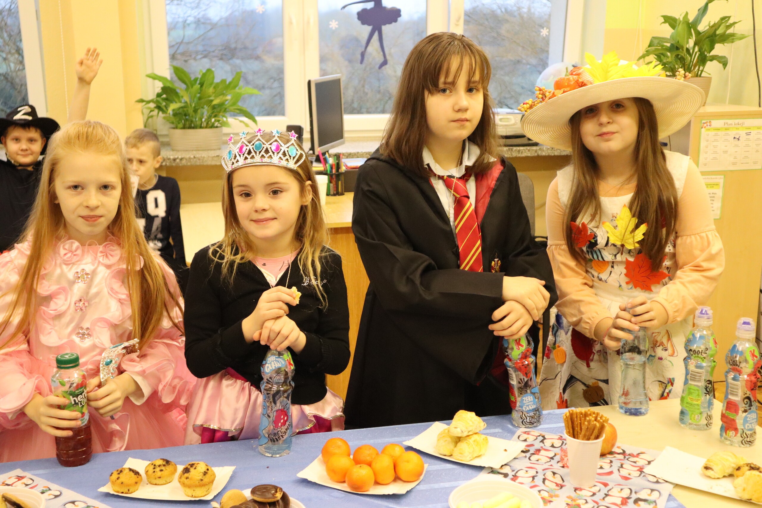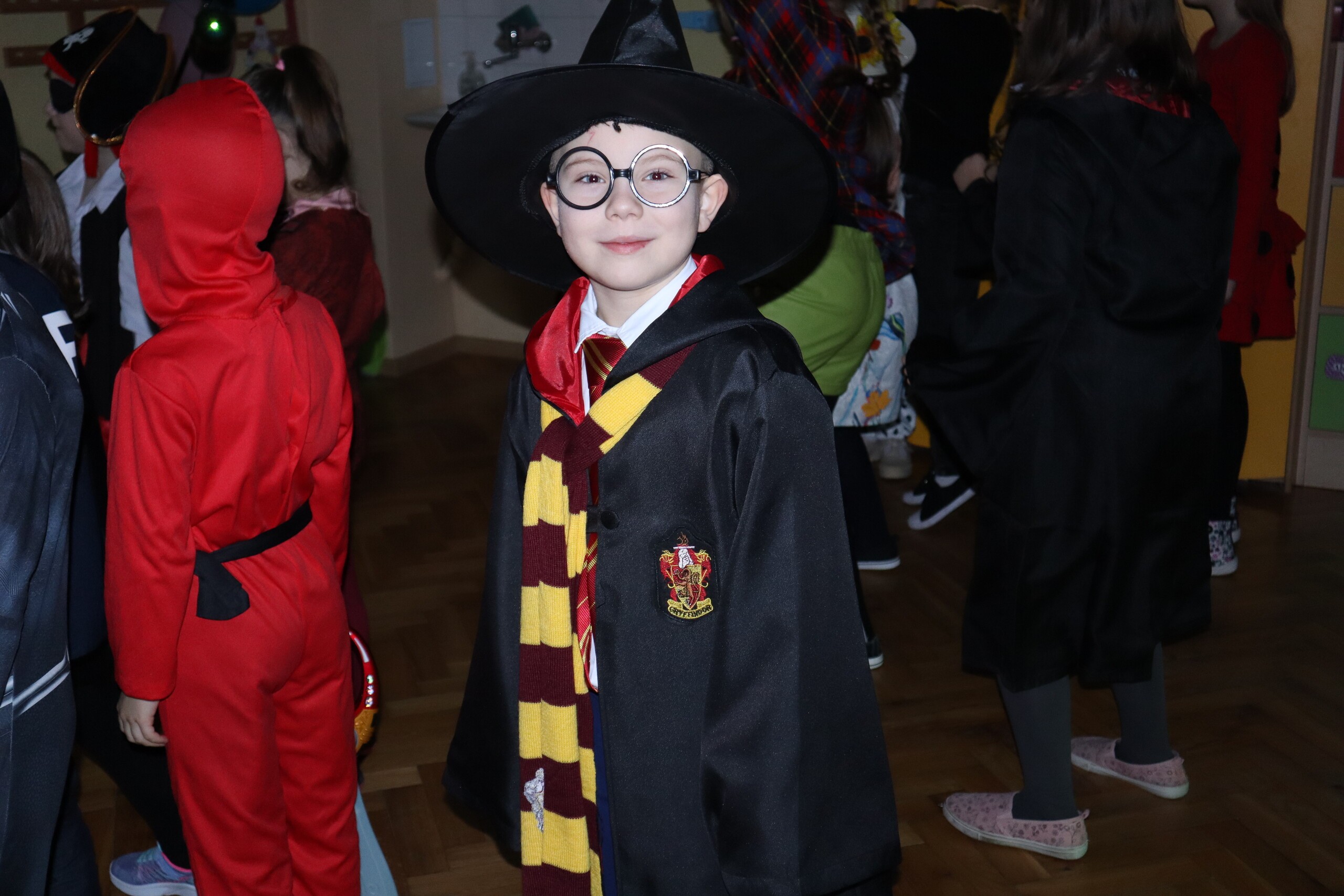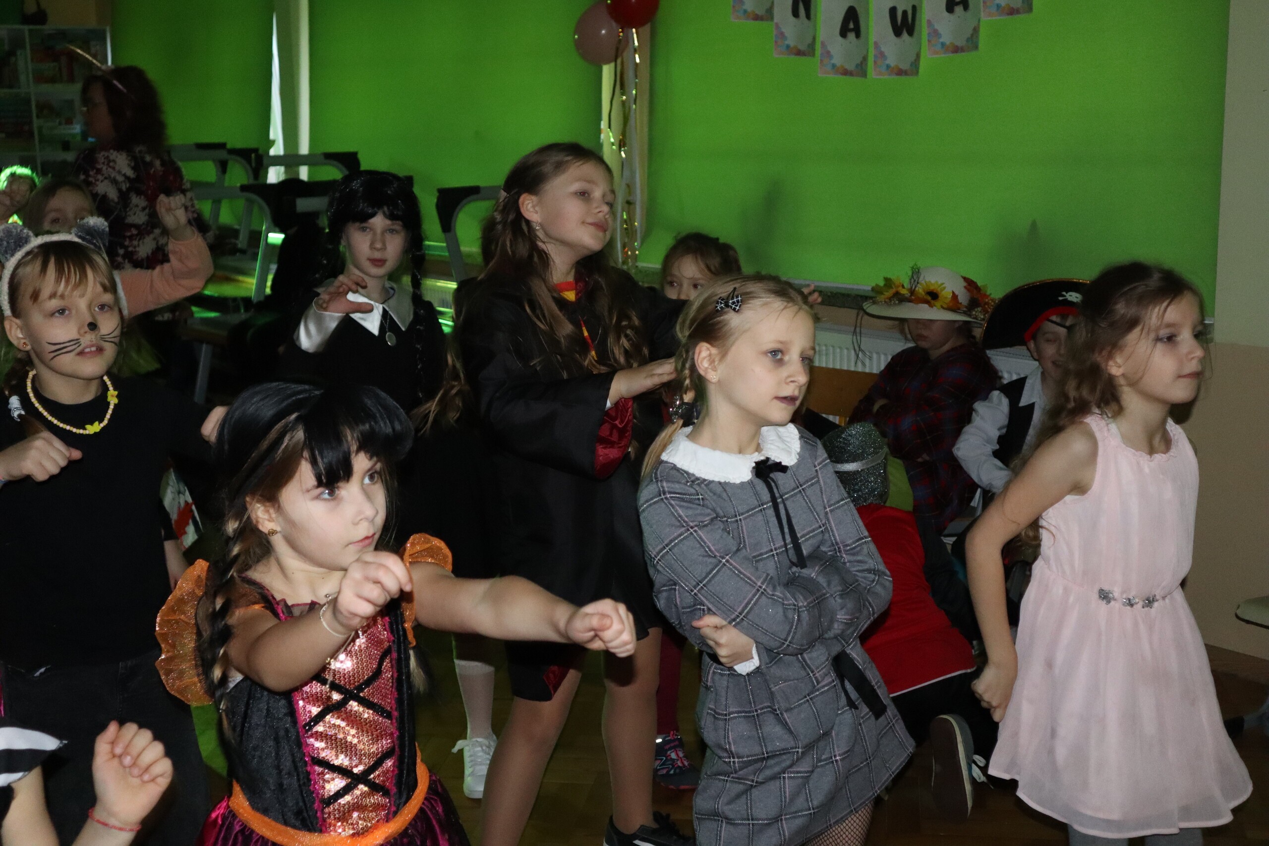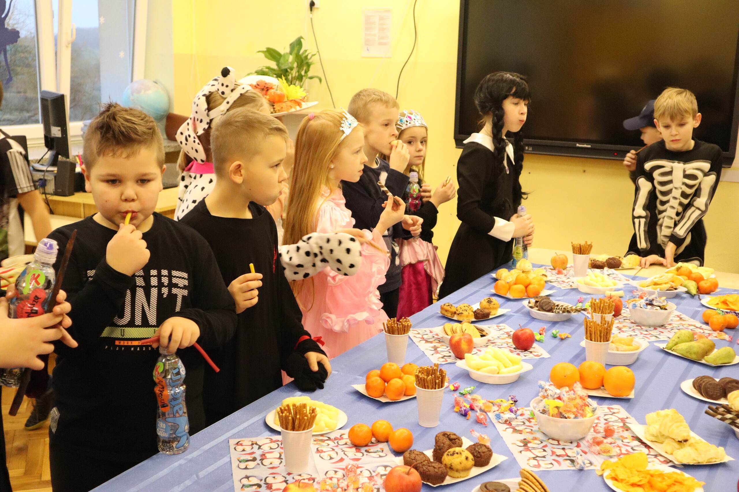 Tego dnia dzieciom towarzyszyło wiele emocji i wrażeń. Na szkolnym korytarzu można było spotkać wróżki, księżniczki, piłkarzy, policjantów oraz wiele innych barwnych postaci. Przy dźwiękach muzycznych hitów uczniowie bawili się znakomicie. Nie zabrakło także słodkiego poczęstunku przygotowanego przez rodziców.