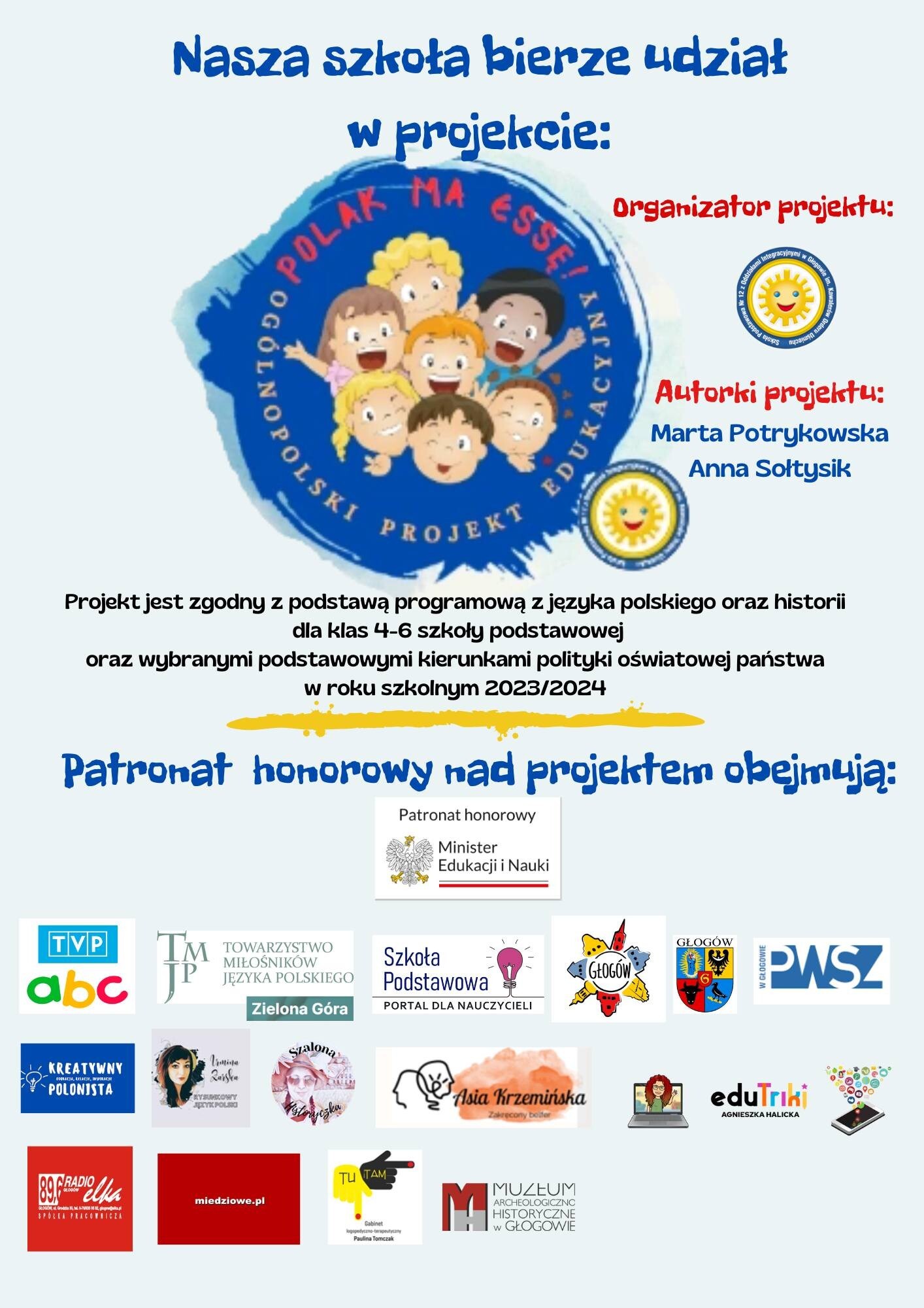 Uczniowie klasy 5 wraz z nauczycielką języka polskiego biorą udział w Ogólnopolskim Projekcie Edukacyjnym „Polak ma essę”. Celem projektu jest utrwalenie zdobytej wiedzy z języka polskiego i historii oraz nabywanie nowych umiejętności poprzez zabawę i integrację uczniów. Polega na wykonaniu zadań i publikację ich efektów na oficjalnej stronie Projektu i szkoły.