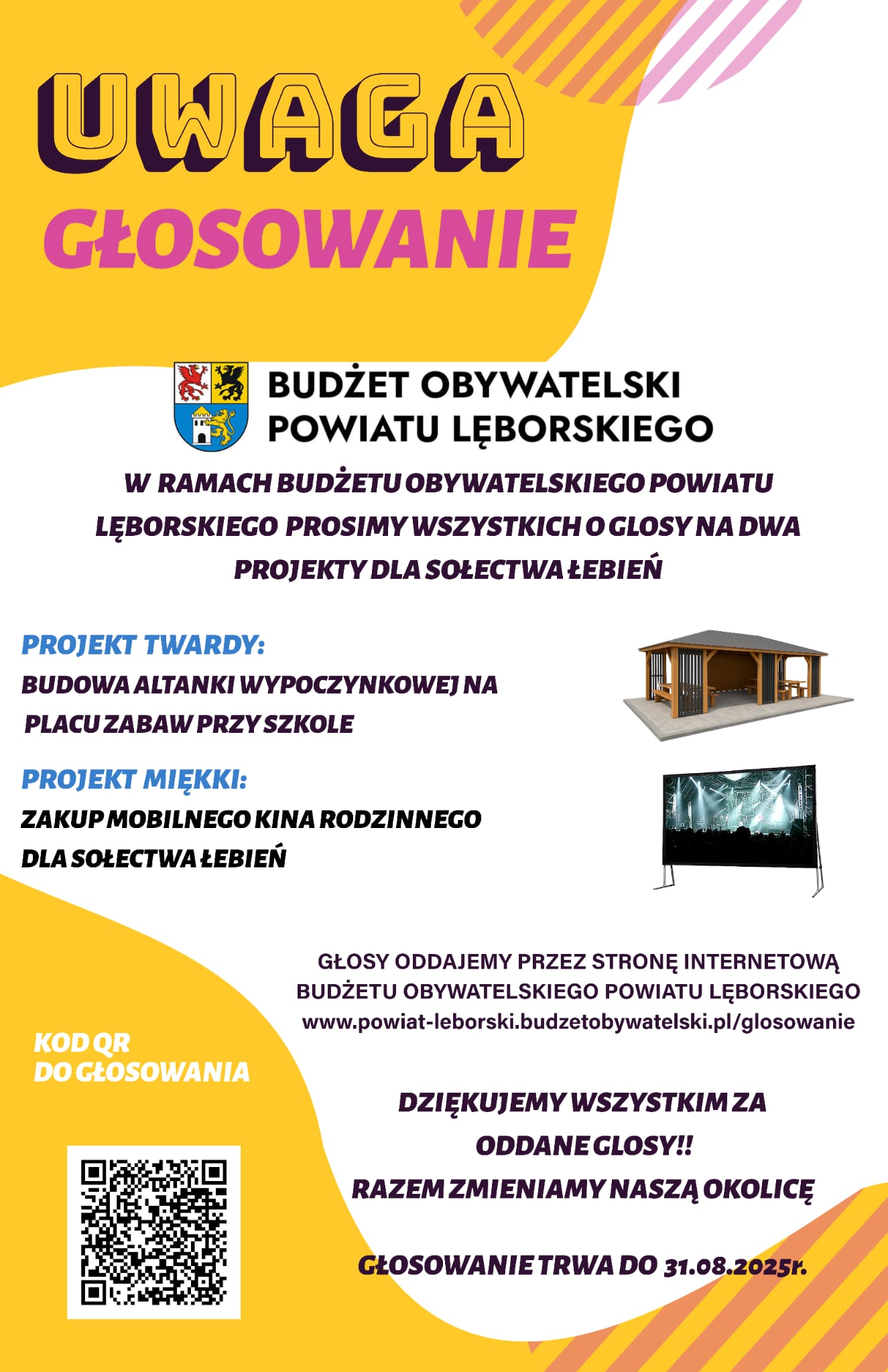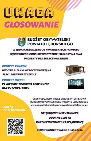 W ramach budżetu obywatelskiego powiatu lęborskiego prosimy wszystkich o głosy na dwa projekty dla Sołectwa Łebień.