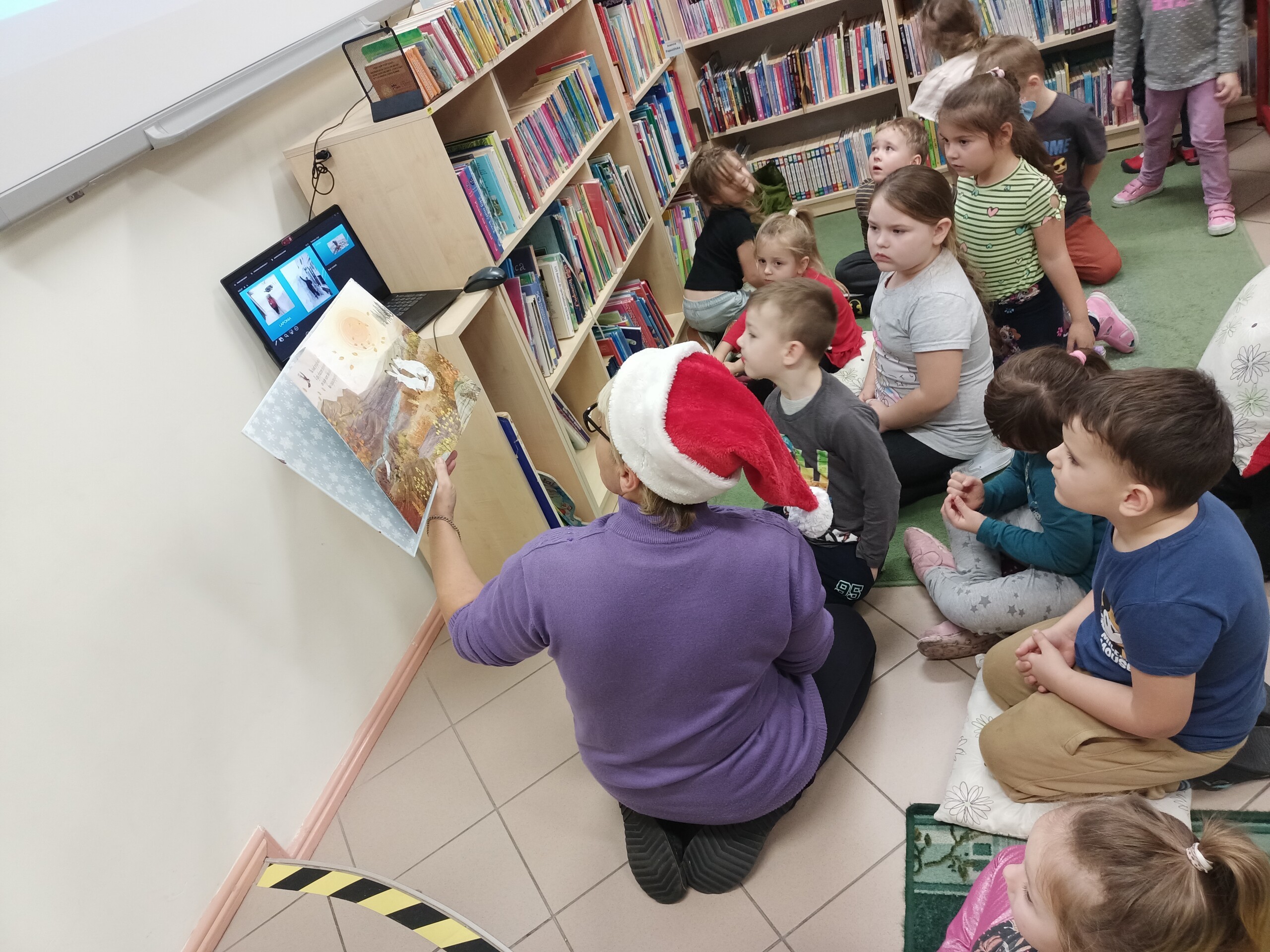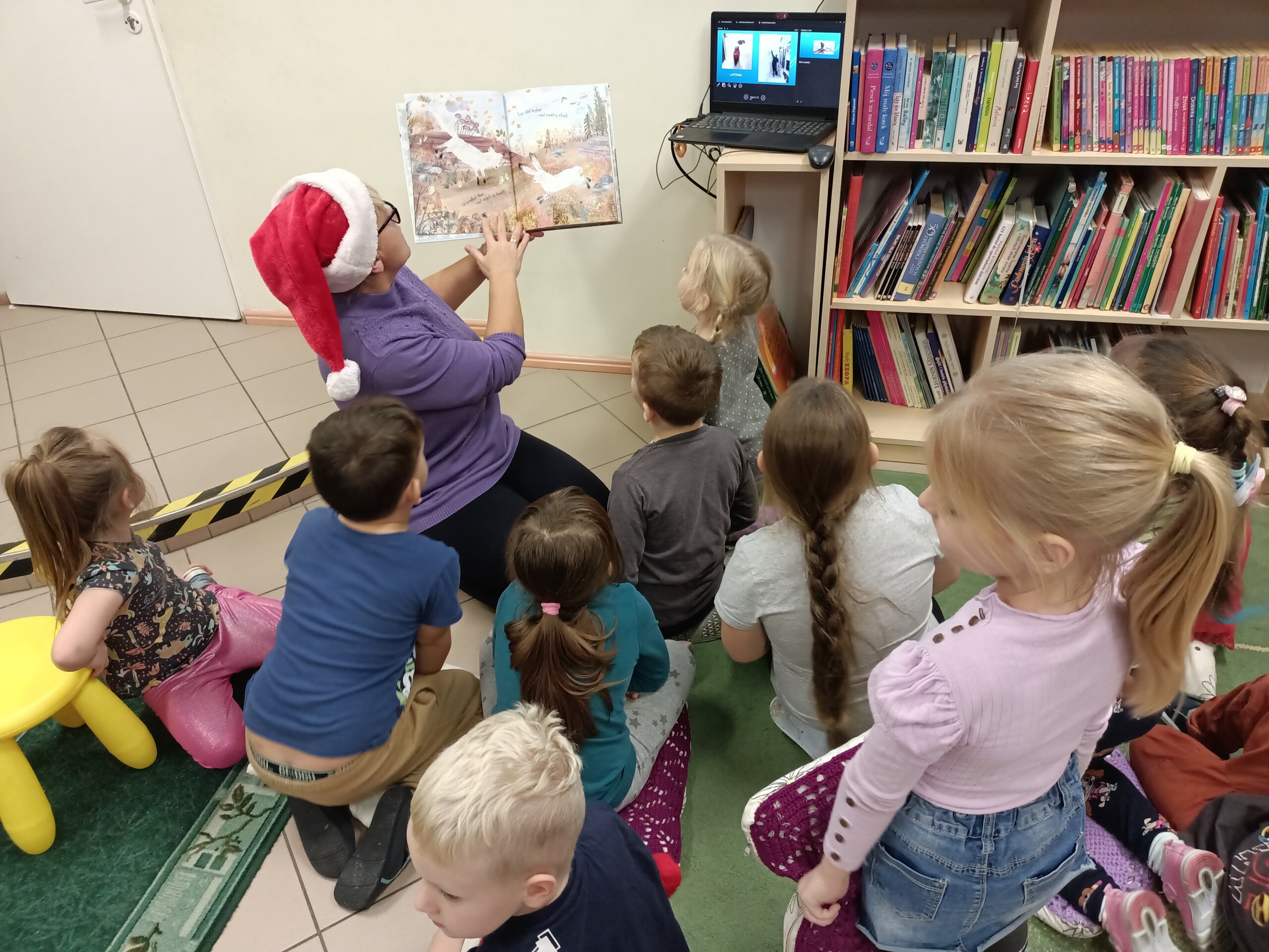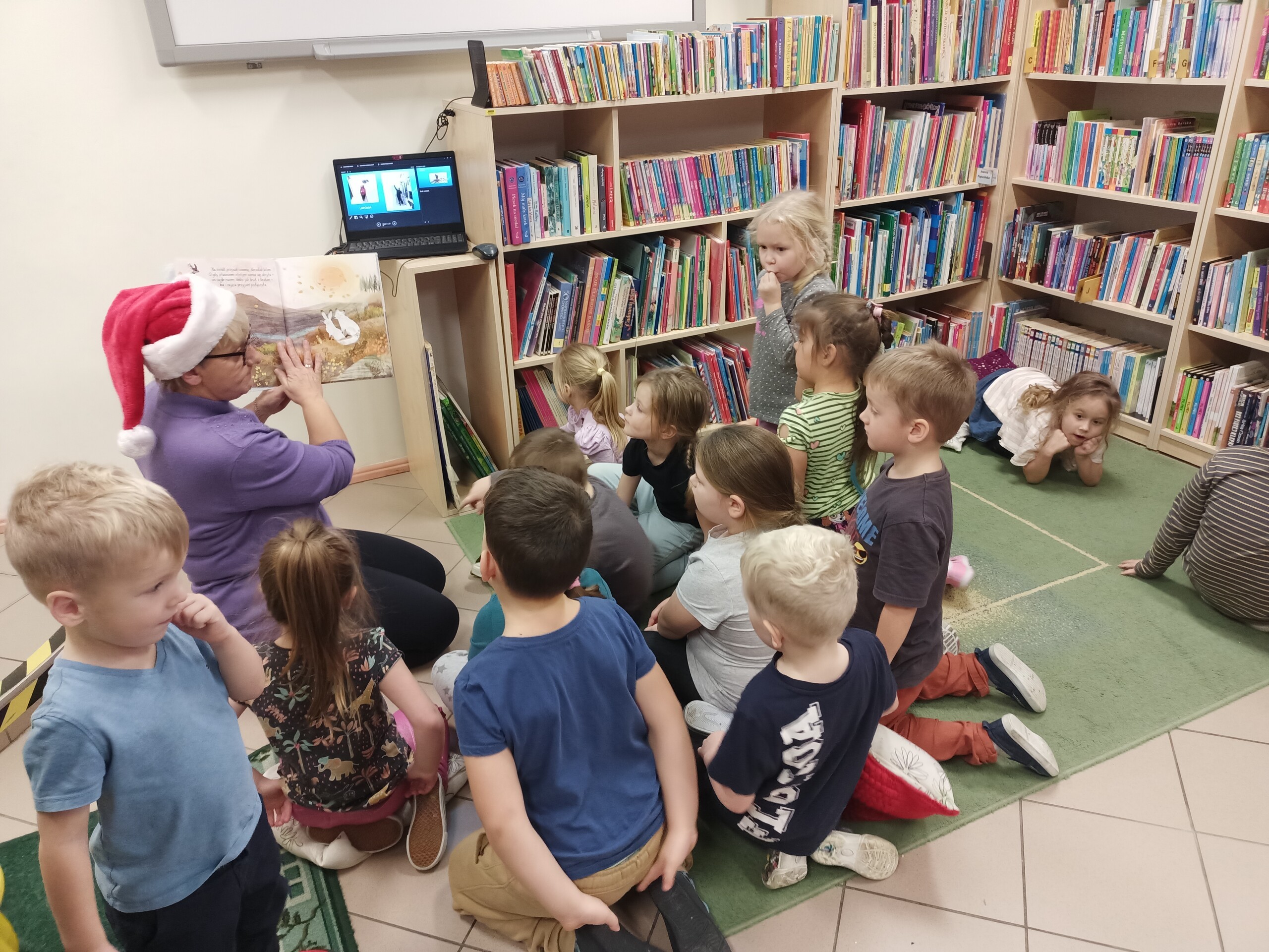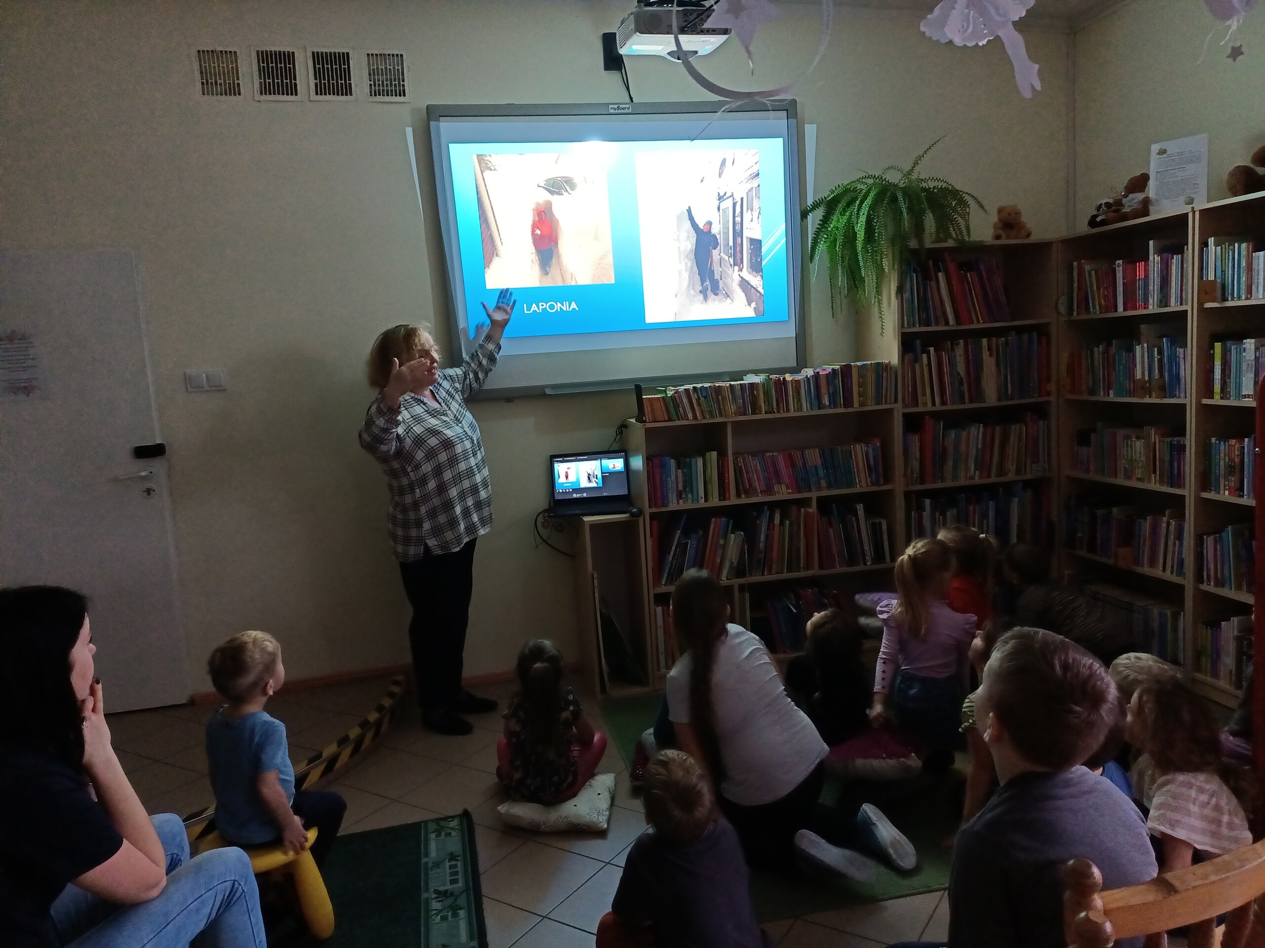20 grudnia dzieci z przedszkola kolejny raz odwiedziły bibliotekę. Tym razem zostały zabrane w podróż do krainy świętego Mikołaja, czyli Laponii. Szukały tego miejsca na globusie i na mapie, w książkach i we wspomnieniach. Z uwagą obejrzały prezentację o zimowej krainie, opowiadały o upragnionych prezentach, a także wysłuchały czytania książek zakupionych w ramach Narodowego Programu rozwoju Czytelnictwa, np.: „Co to jest ten śnieg?”