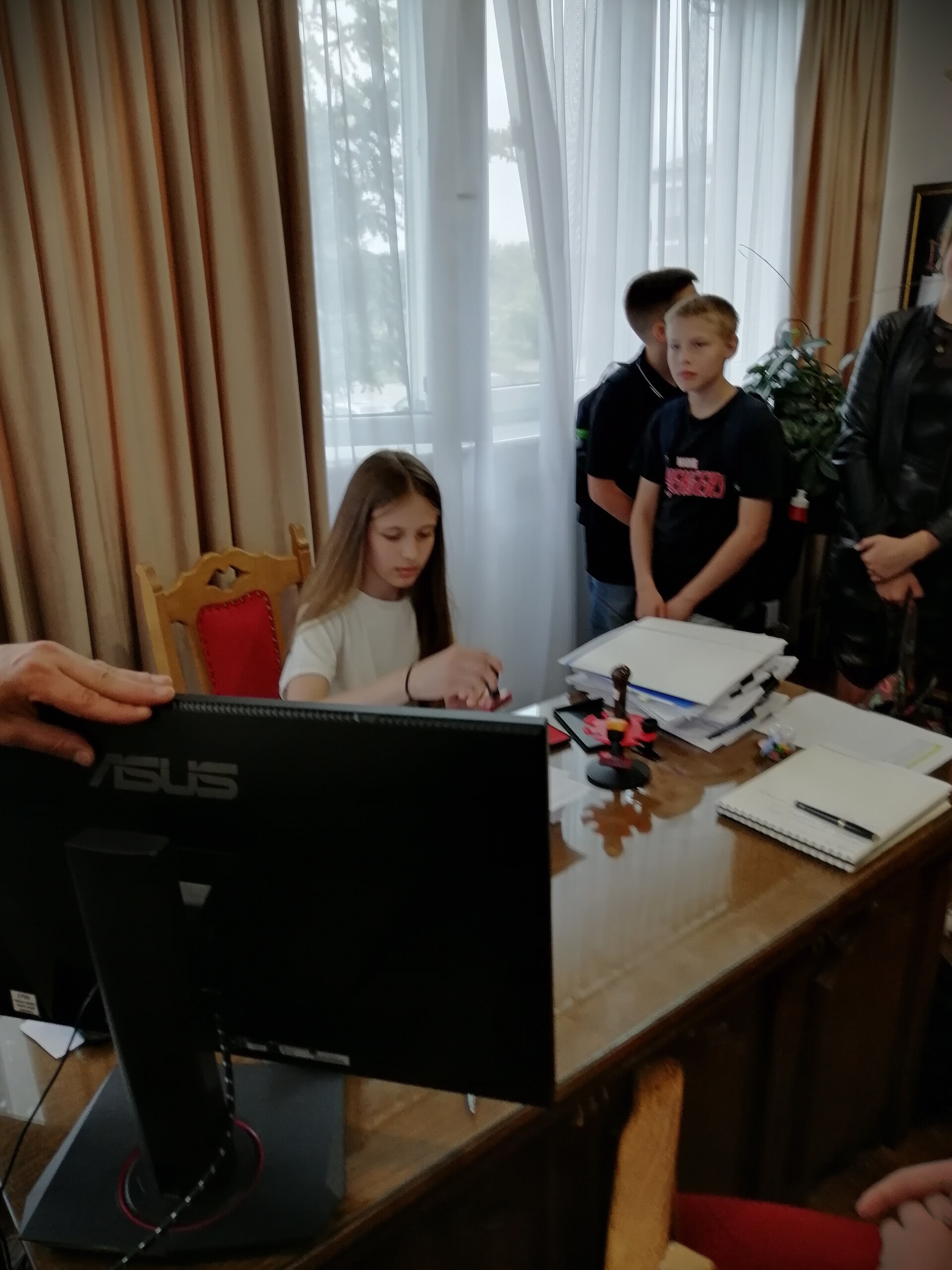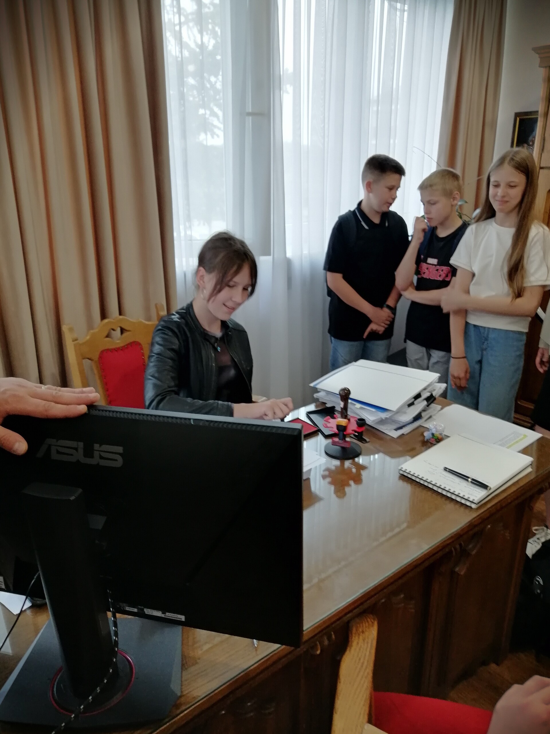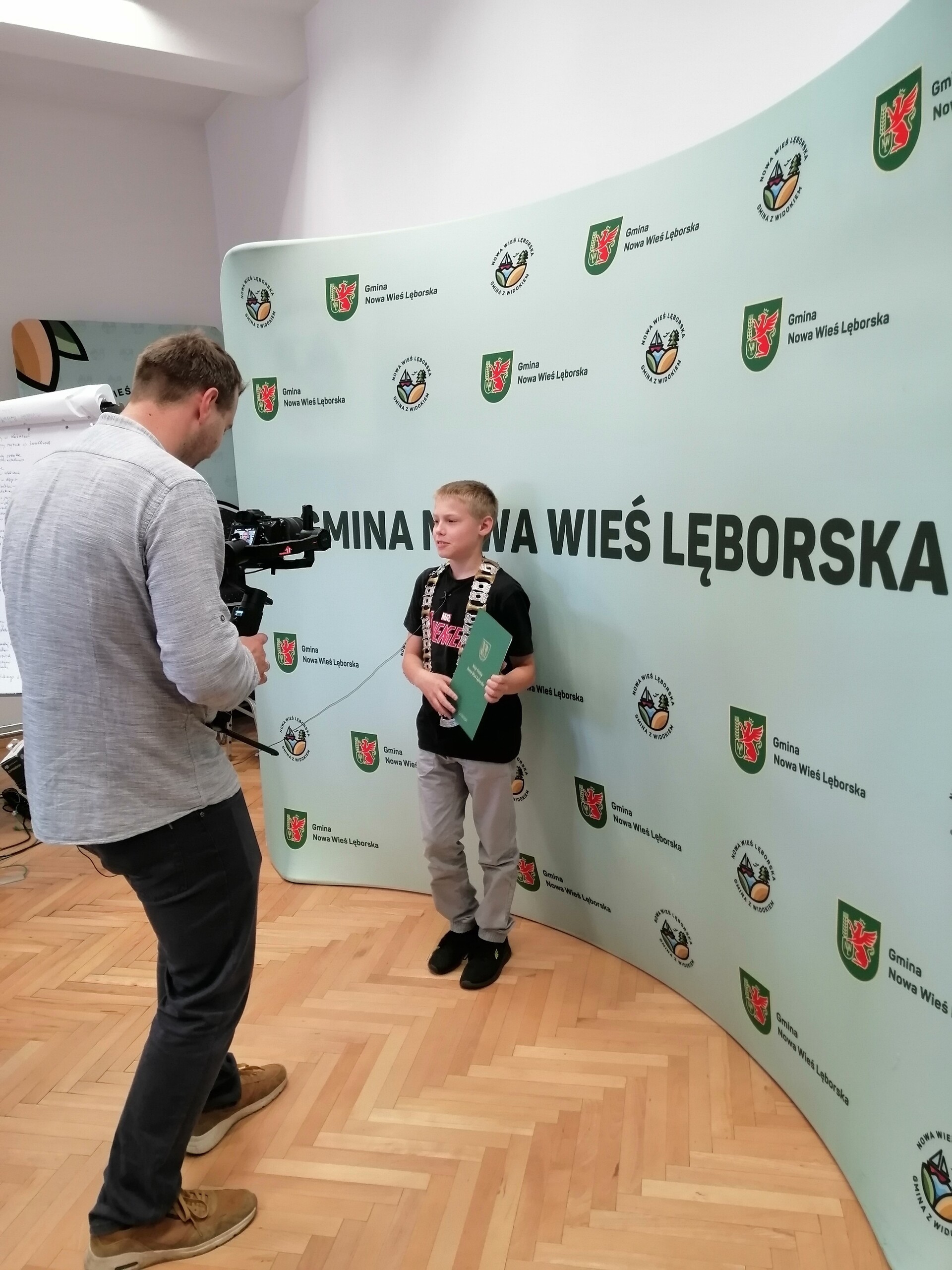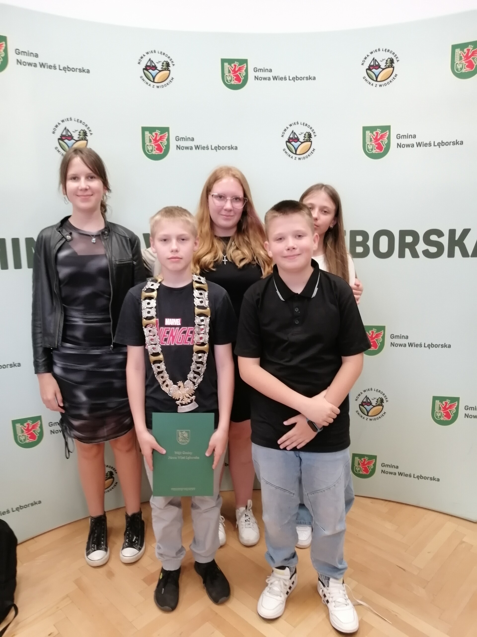 3 czerwca 2024 r. nasi uczniowie gościli w Urzędzie Gminy w Nowej Wsi Lęborskiej. Z okazji Dnia Dziecka Wójt Gminy pan Szymon Medalion zaprosił uczniów z wszystkich szkół podstawowych z terenu naszej gminy. Celem wizyty było zwiedzenie budynku, a przede wszystkim zapoznanie się z pracą urzędu i urzędników. W gabinecie pana Wójta mieli okazję zasiąść za biurkiem i podpisywać dokumenty. W oczekiwaniu na wejście do Sali Sesyjnej był popcorn i gwarne rozmowy uczniów. W Sali Sesyjnej na uczniów czekała niespodzianka – posiedzenie Okolicznościowej Młodzieżowej Sesji Rady Gminy Nowa Wieś Lęborska. Młodzi radni w tajnym głosowaniu wybrali spośród siebie przewodniczącego oraz jego zastępców. Przewodniczącym został nasz uczeń Paweł Cieszkowski, który z wielkim zaangażowaniem przewodniczył posiedzeniu młodych radnych. Podczas obrad uczniowie przedstawili 100 postulatów na usprawnienie funkcjonowania gminy, z których trzy zostaną zrealizowane.