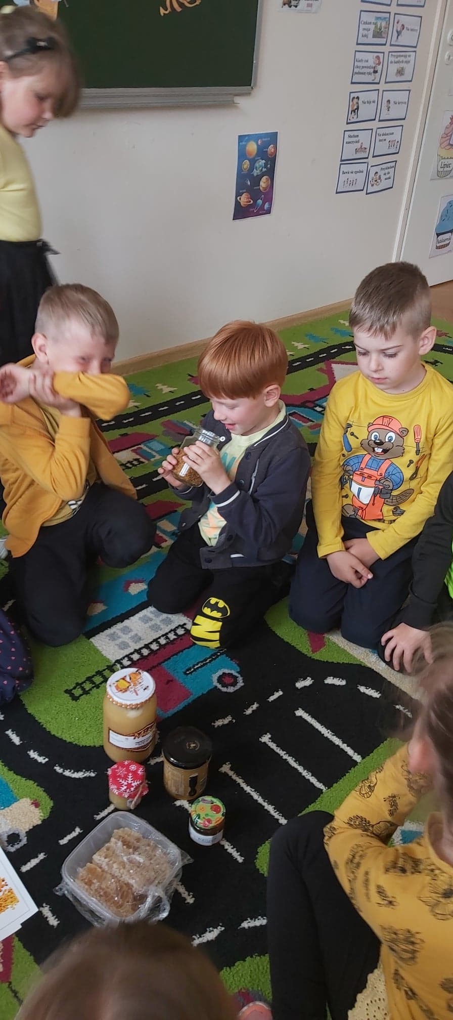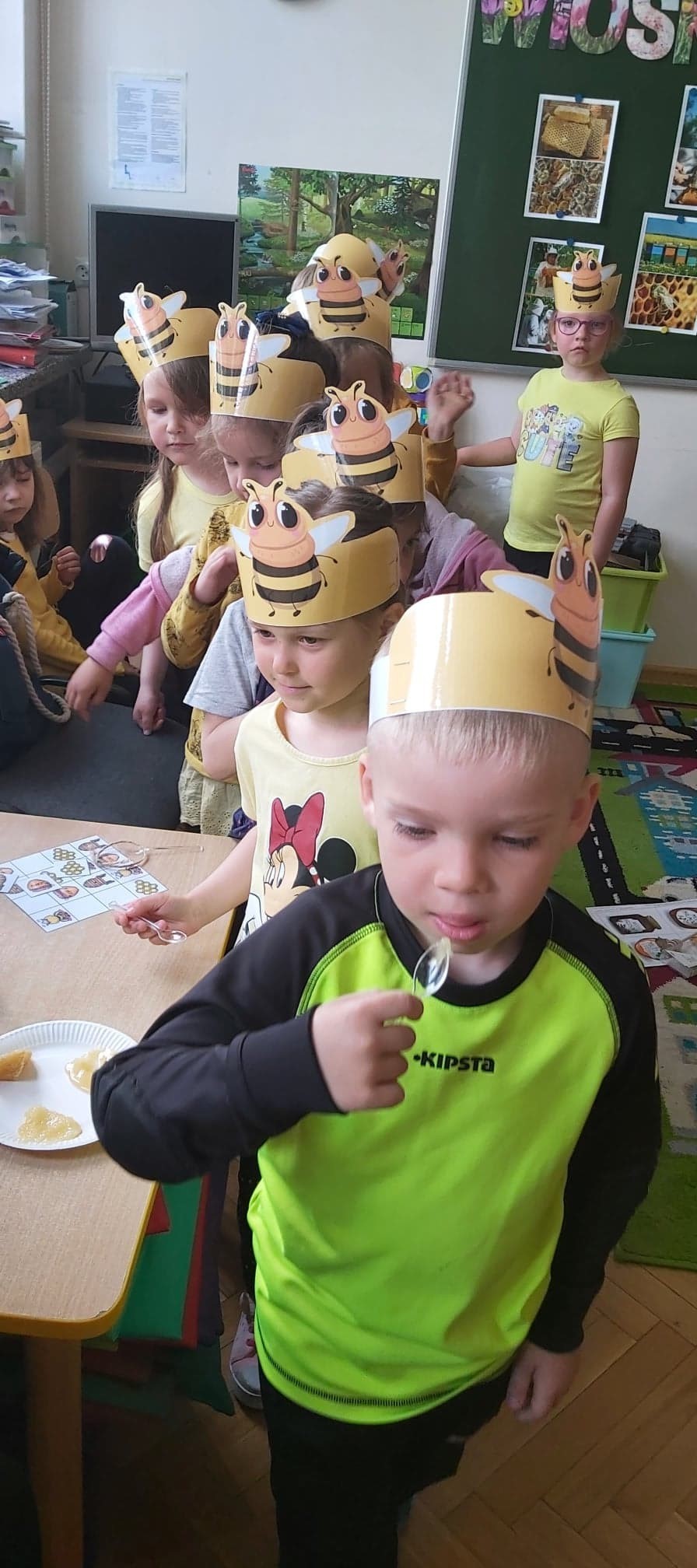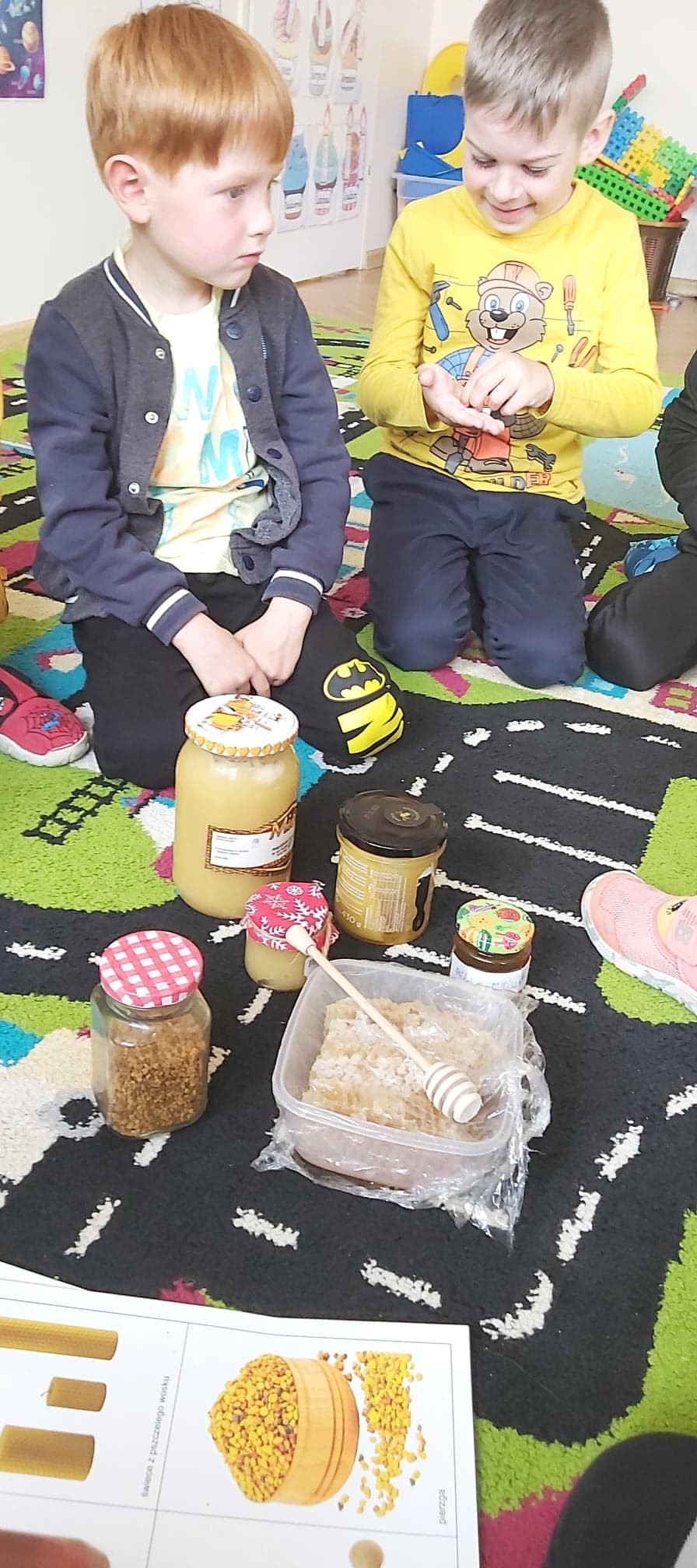 Przedszkolaki miały okazję spróbować różnych gatunków miodu, obejrzeć i przymierzyć strój pszczelarza, poznać budowę ula, poobserwować przez lupę pyłek kwiatowy, przekonać się do czego służą ramki w ulu i z czego są zrobione, poczuć zapach prawdziwego, pszczelego wosku oraz smak miodu. Dzieci obejrzały także prezentacje multimedialną o pszczołach.