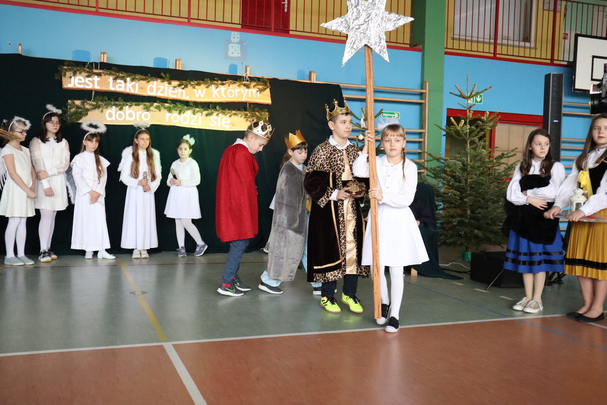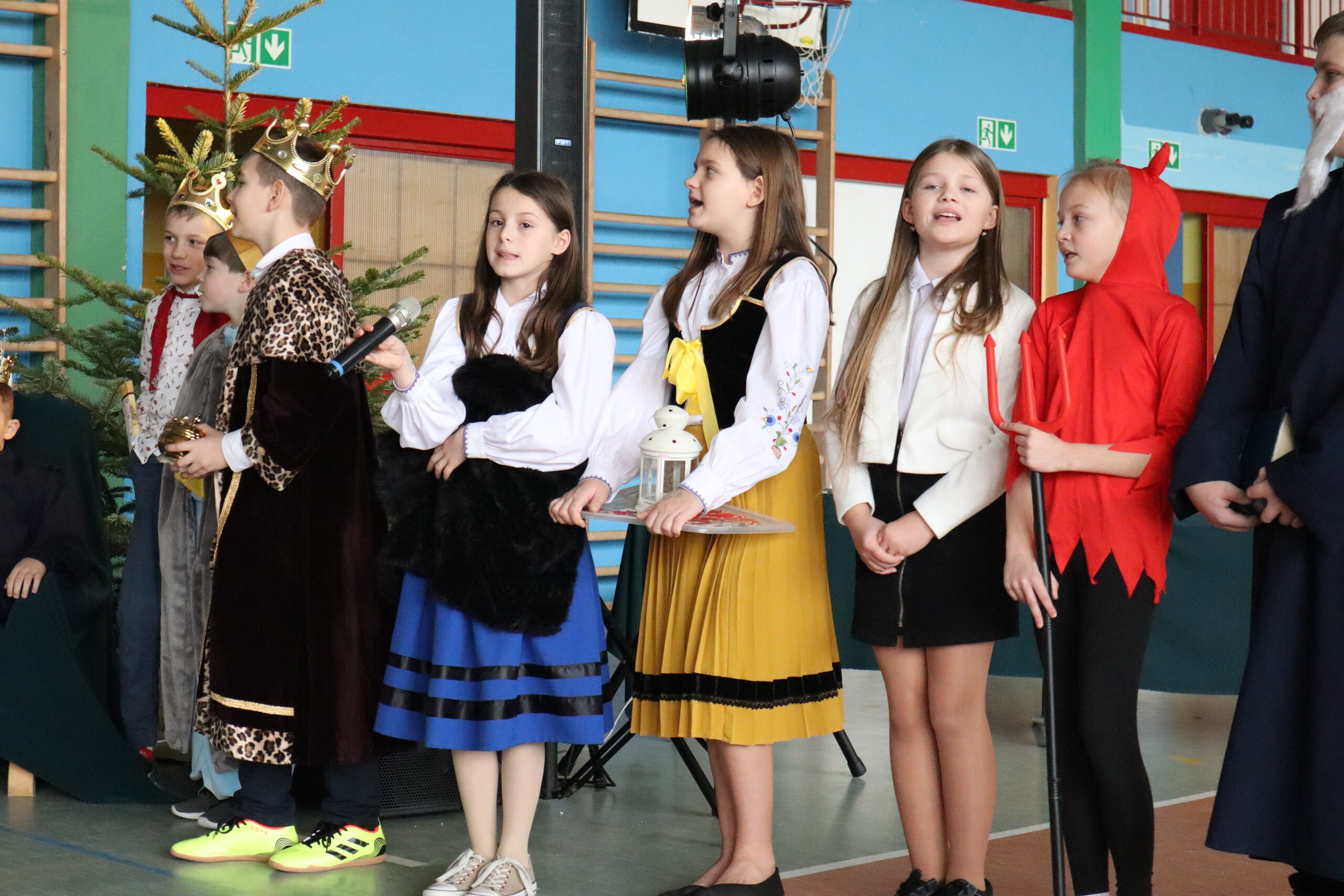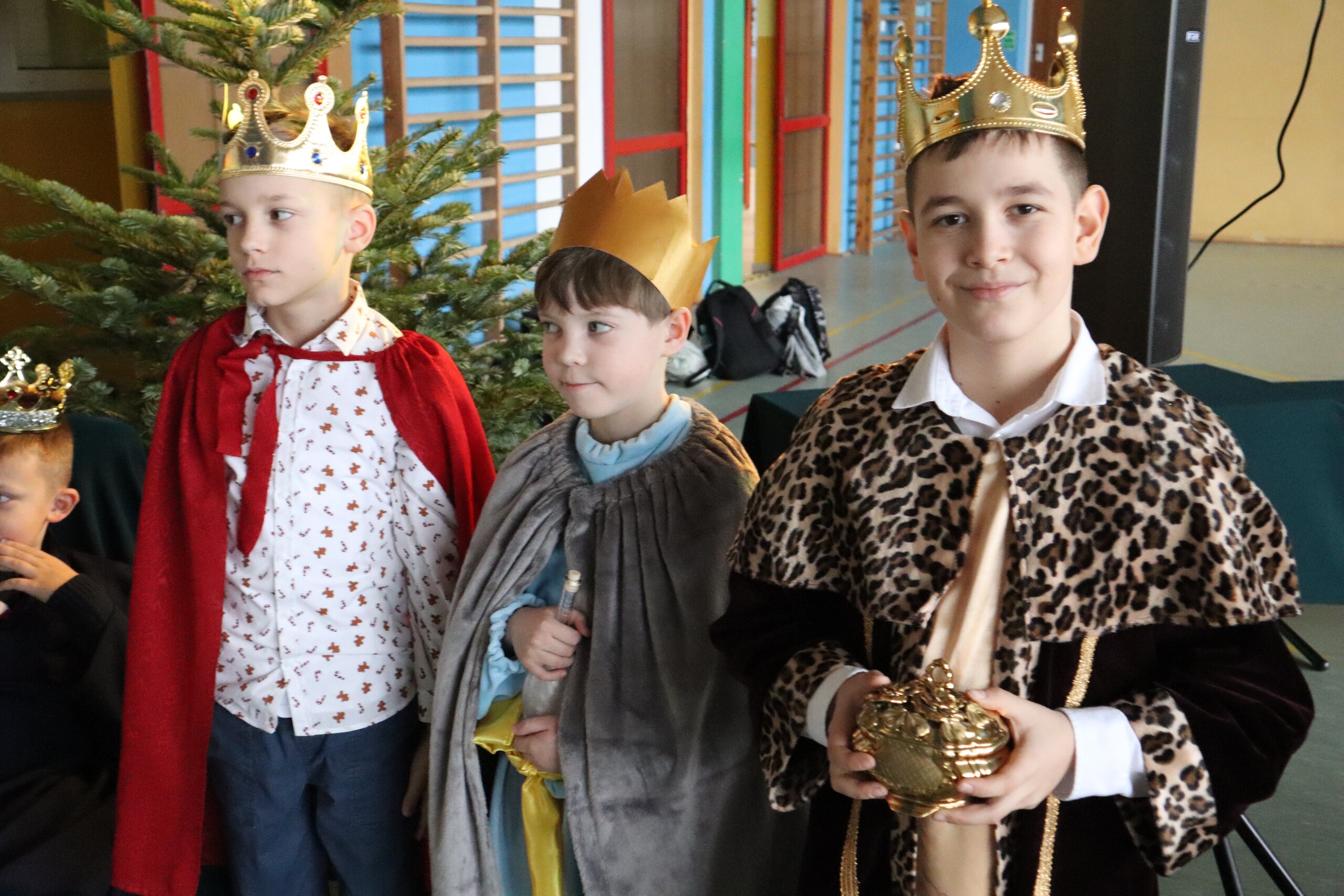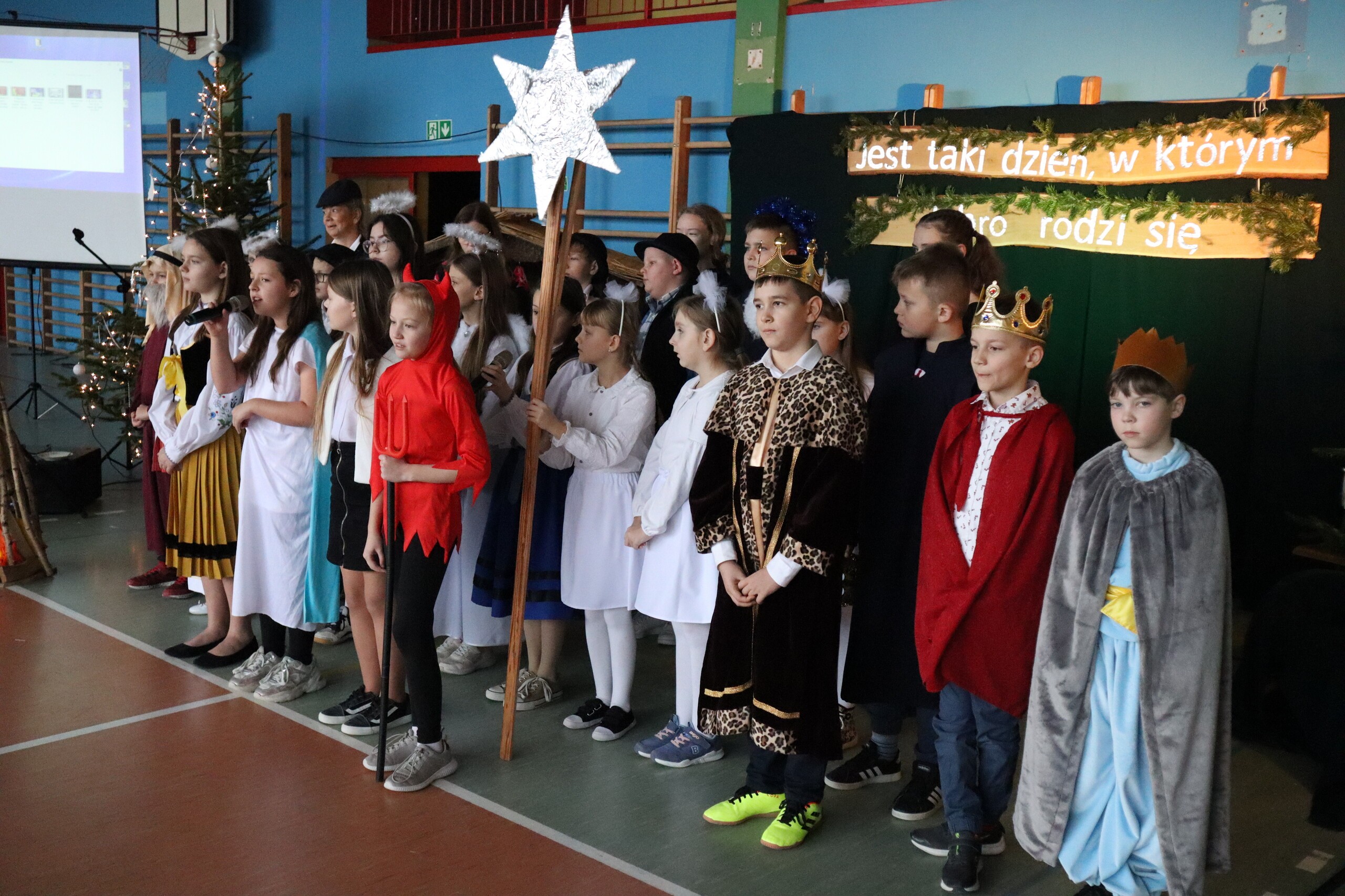 Tradycją naszej szkoły są coroczne jasełka przygotowywane przez uczniów pod opieką nauczycieli. „On jest królem” – to tytuł przedstawienia, które zaprezentowali uczniowie z klasy drugiej, trzeciej, czwartej i szóstej. Mali artyści odgrywali różne sceny przybliżające dzieciom dzieje narodzin Pana Jezusa. Każda scena zakończona była kolędą lub pastorałką. Piękny śpiew, bogata dekoracja i nastrojowe oświetlenie wprowadziły nas w klimat zbliżających się świąt. Kiedy część artystyczna dobiegła końca, występujący aktorzy otrzymali gromkie brawa. Występ był niezwykłym przeżyciem zarówno dla aktorów, nauczycieli i pracowników szkoły.