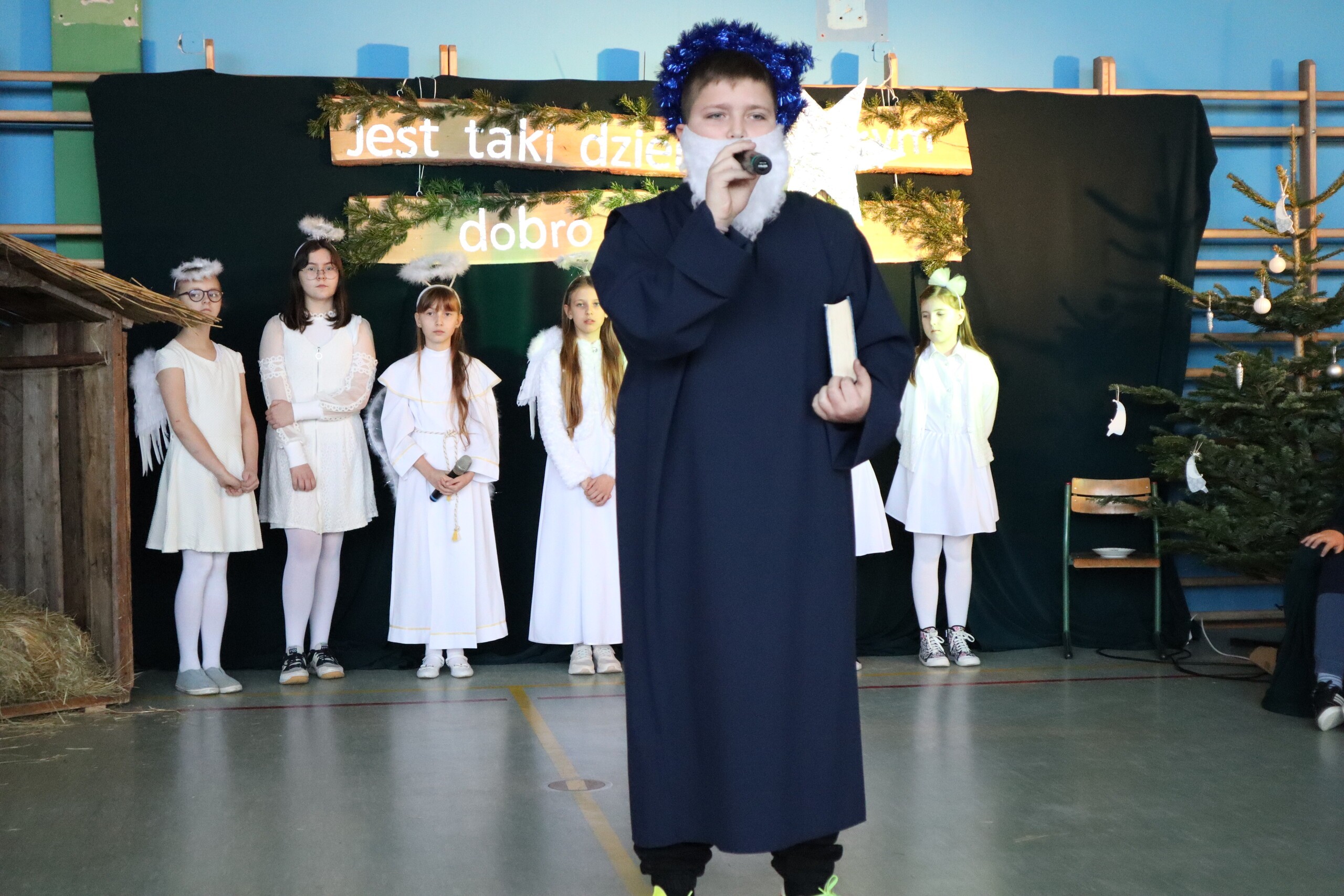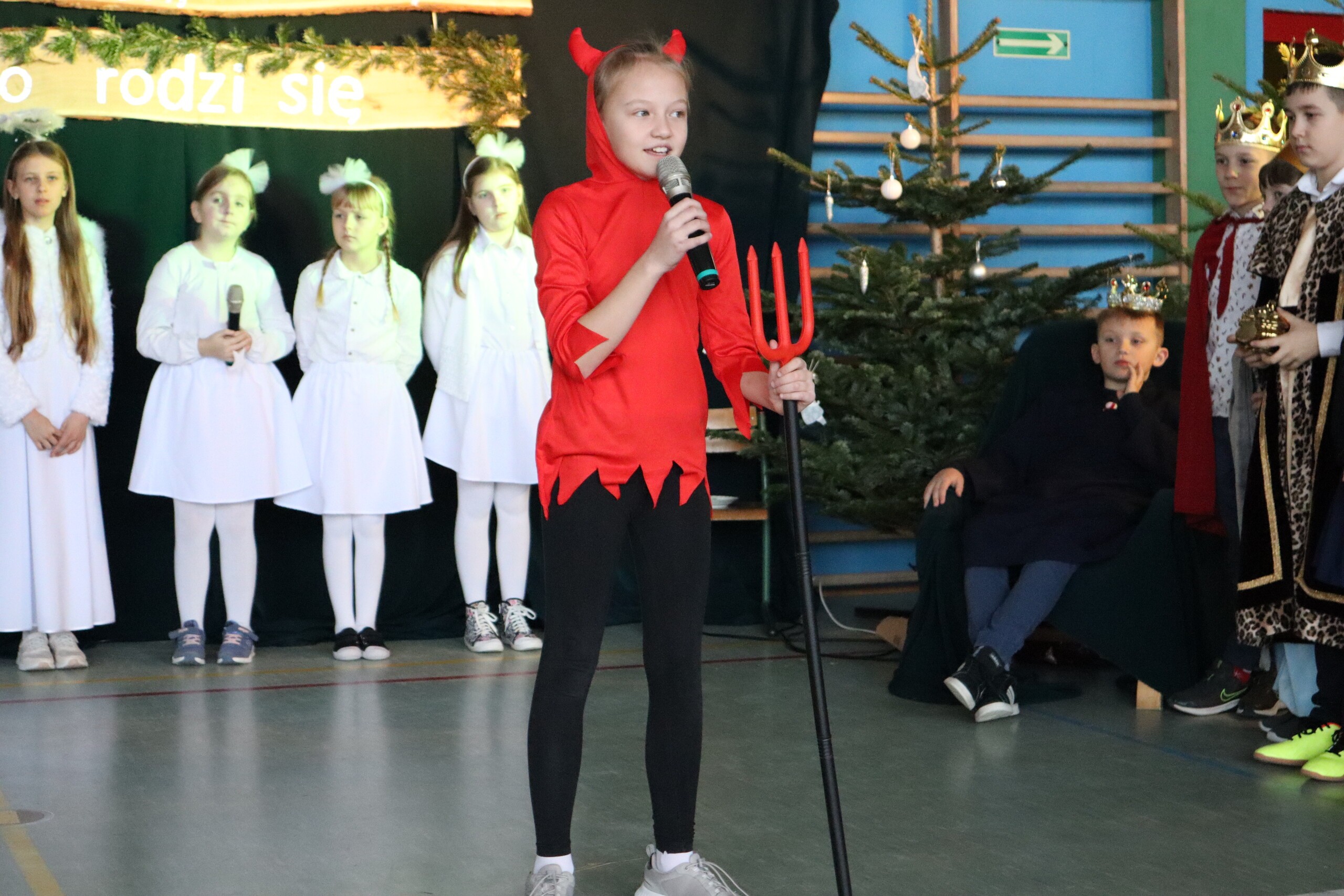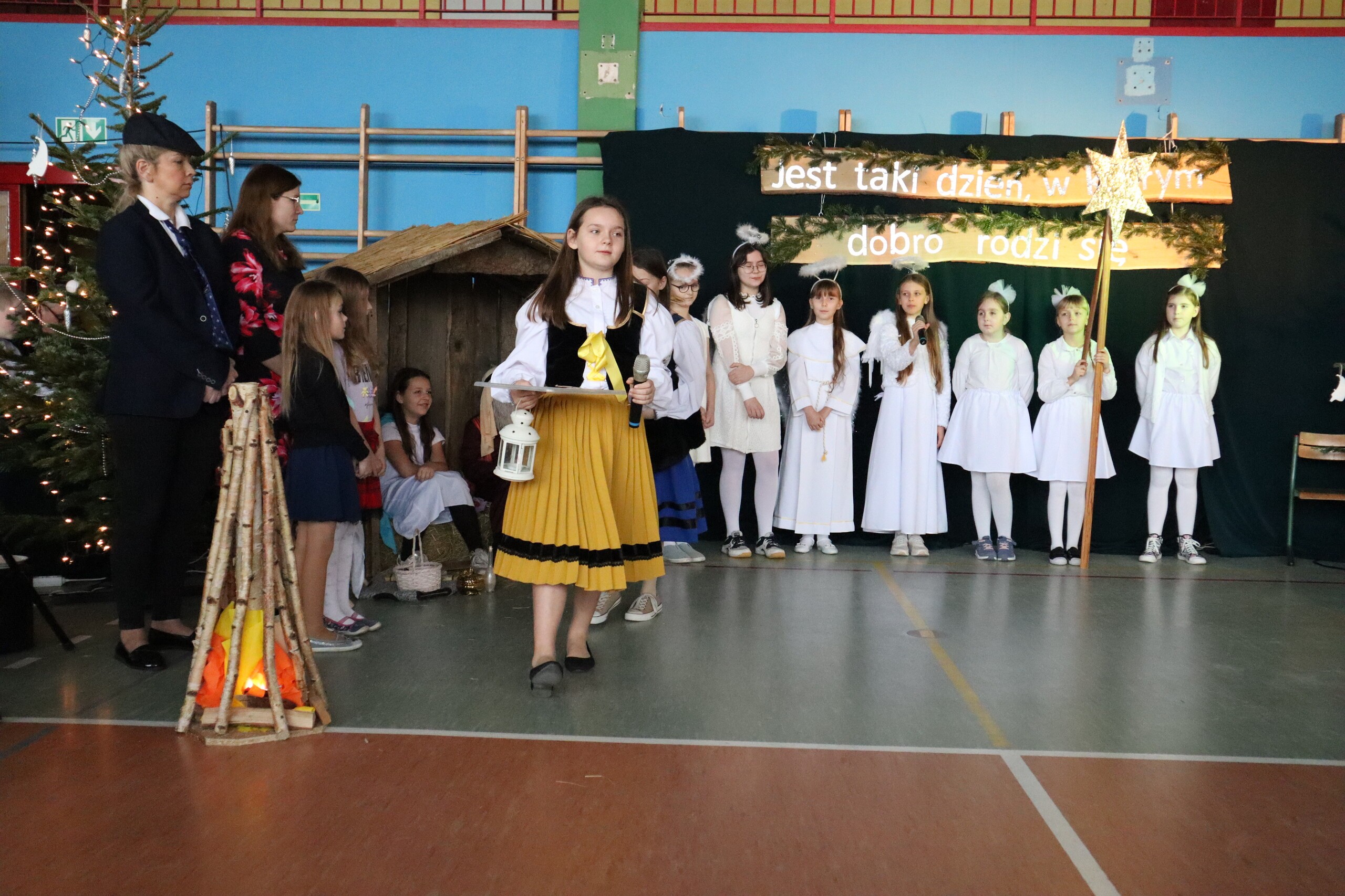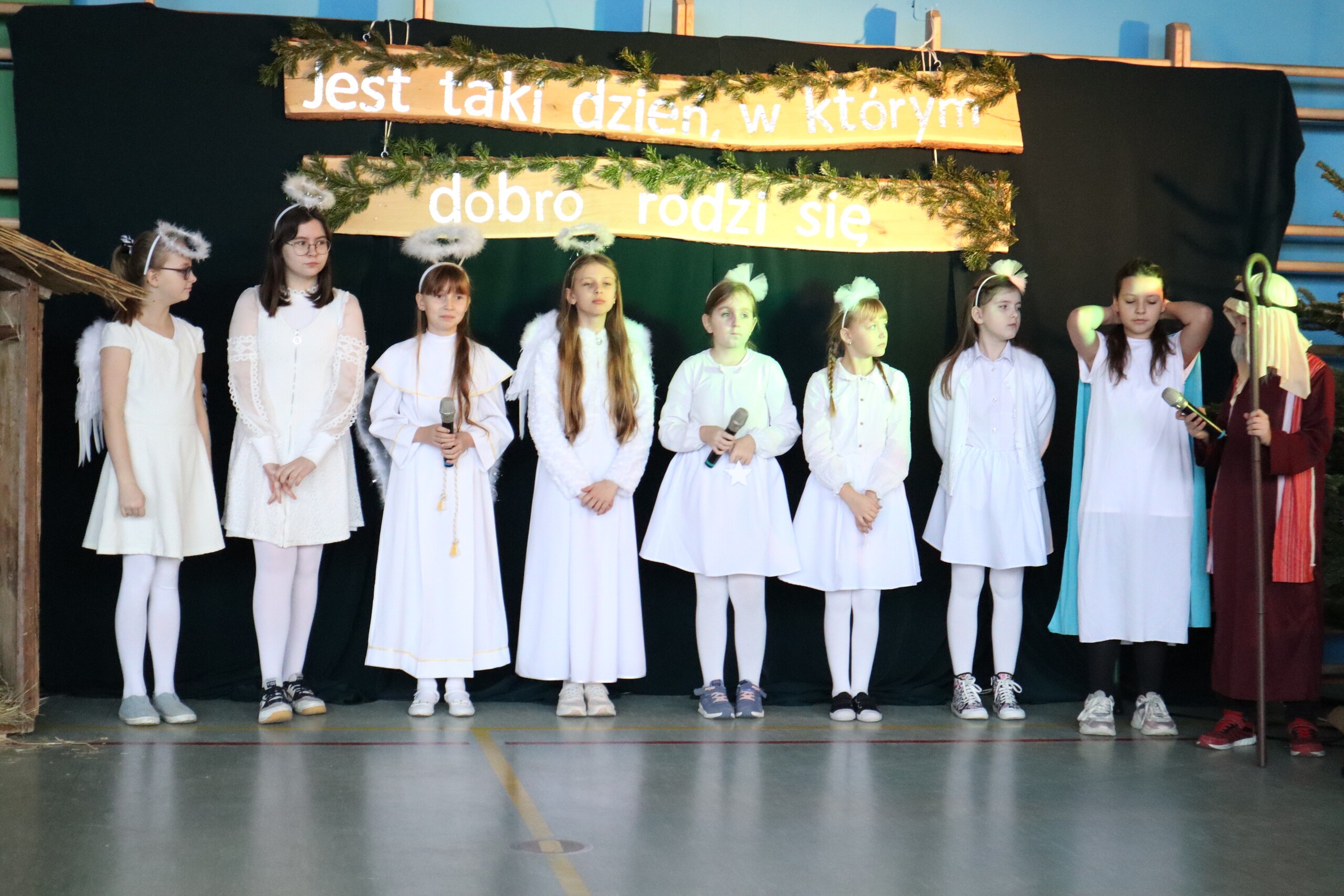 Tradycją naszej szkoły są coroczne jasełka przygotowywane przez uczniów pod opieką nauczycieli. „On jest królem” – to tytuł przedstawienia, które zaprezentowali uczniowie z klasy drugiej, trzeciej, czwartej i szóstej. Mali artyści odgrywali różne sceny przybliżające dzieciom dzieje narodzin Pana Jezusa. Każda scena zakończona była kolędą lub pastorałką. Piękny śpiew, bogata dekoracja i nastrojowe oświetlenie wprowadziły nas w klimat zbliżających się świąt. Kiedy część artystyczna dobiegła końca, występujący aktorzy otrzymali gromkie brawa. Występ był niezwykłym przeżyciem zarówno dla aktorów, nauczycieli i pracowników szkoły.