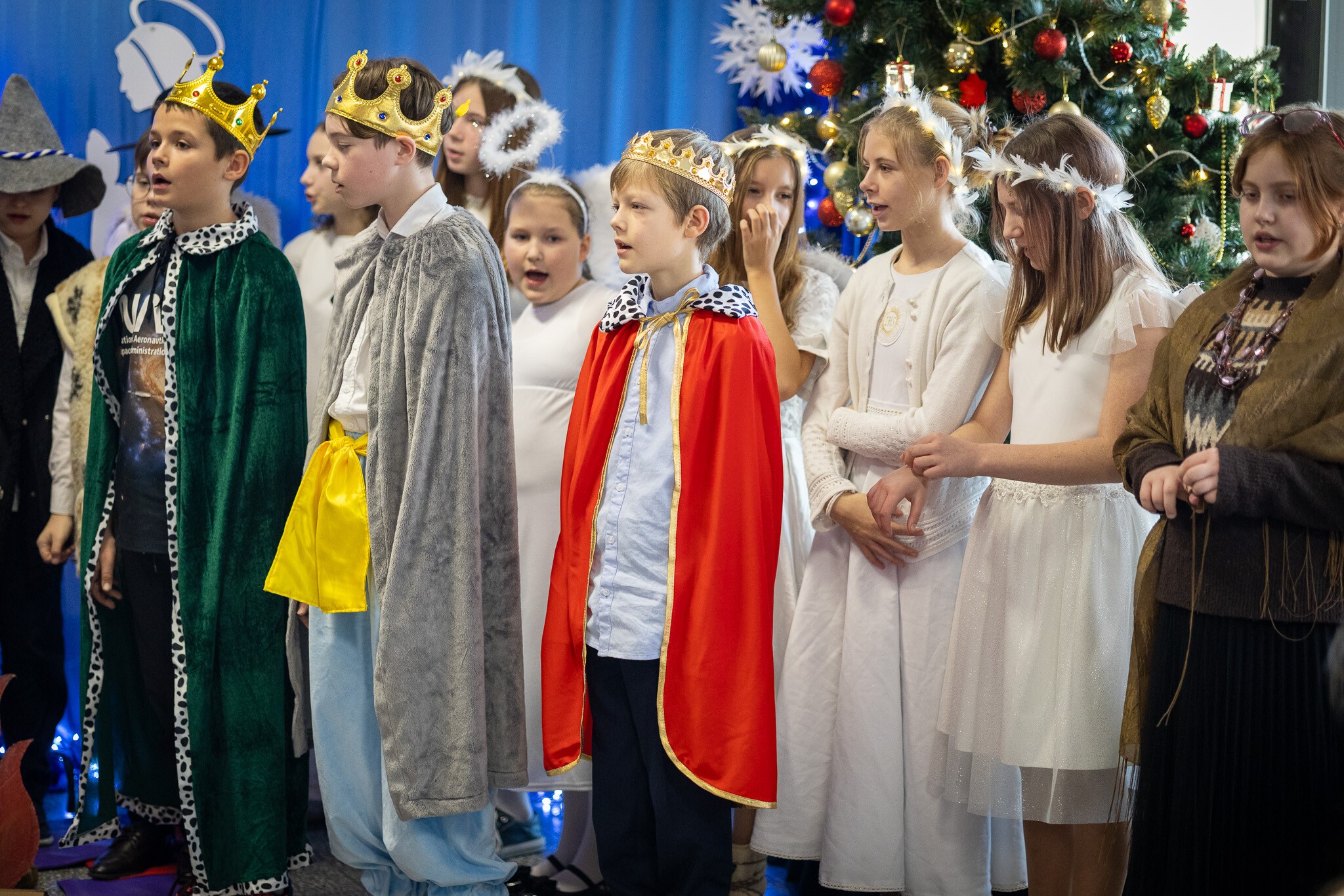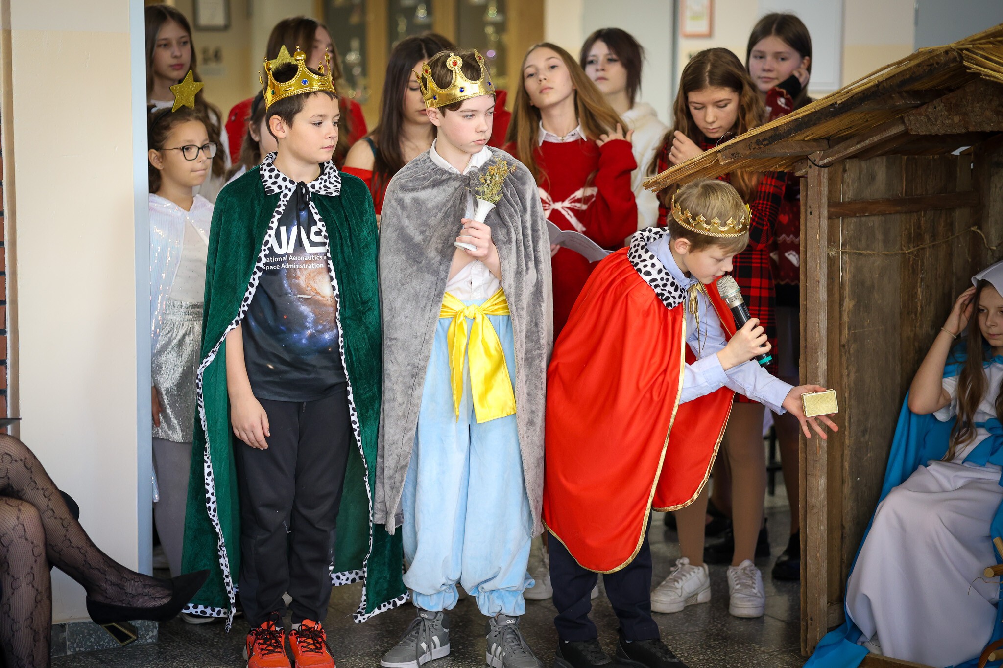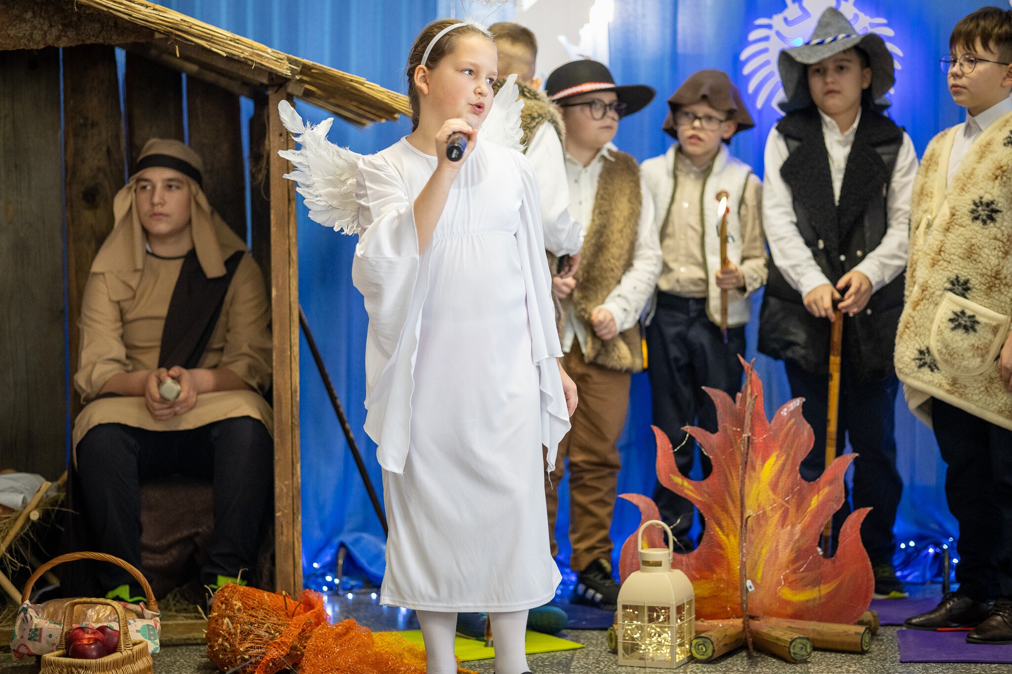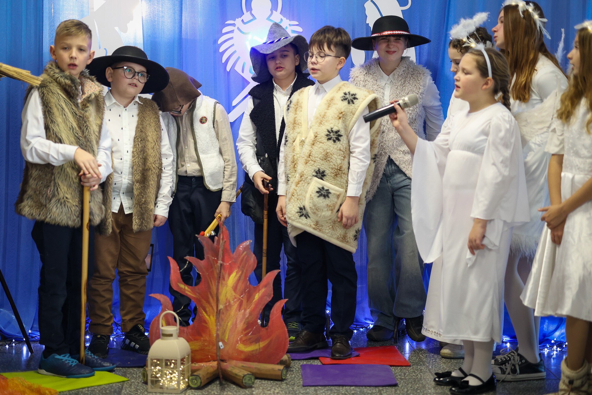 19 XII 2025r. piątek - ten dzień upłynął nam w świątecznym nastroju. Już o godzinie ósmej rano dzieci z zerówki i uczniowie klas I - III obejrzeli jasełka, a o 9.30 przedstawienie bożonarodzeniowe obejrzeli uczniowie klas IV - VIII oraz zaproszeni goście. Uczniowie wcielili się w role Maryi i Józefa, pasterzy, aniołów, Trzech Królów oraz dzieci przybywających złożyć pokłon Jezusowi narodzonemu w ubogiej stajence. Przedstawienie pokazujące scenki z życia nowonarodzonego dzieciątka przeplatały kolędy i pastorałki. Na zakończenie zabrał głos dyrektor szkoły dziękując za przygotowania. Życzenia składali także ksiądz proboszcz Janusz Góral, przewodnicząca Rady Rodziców Justyna Wilga oraz sołtys Łebienia Adam Folga. W świątecznych nastrojach rozeszliśmy się do sal, w których odbyły się klasowe spotkania wigilijne.