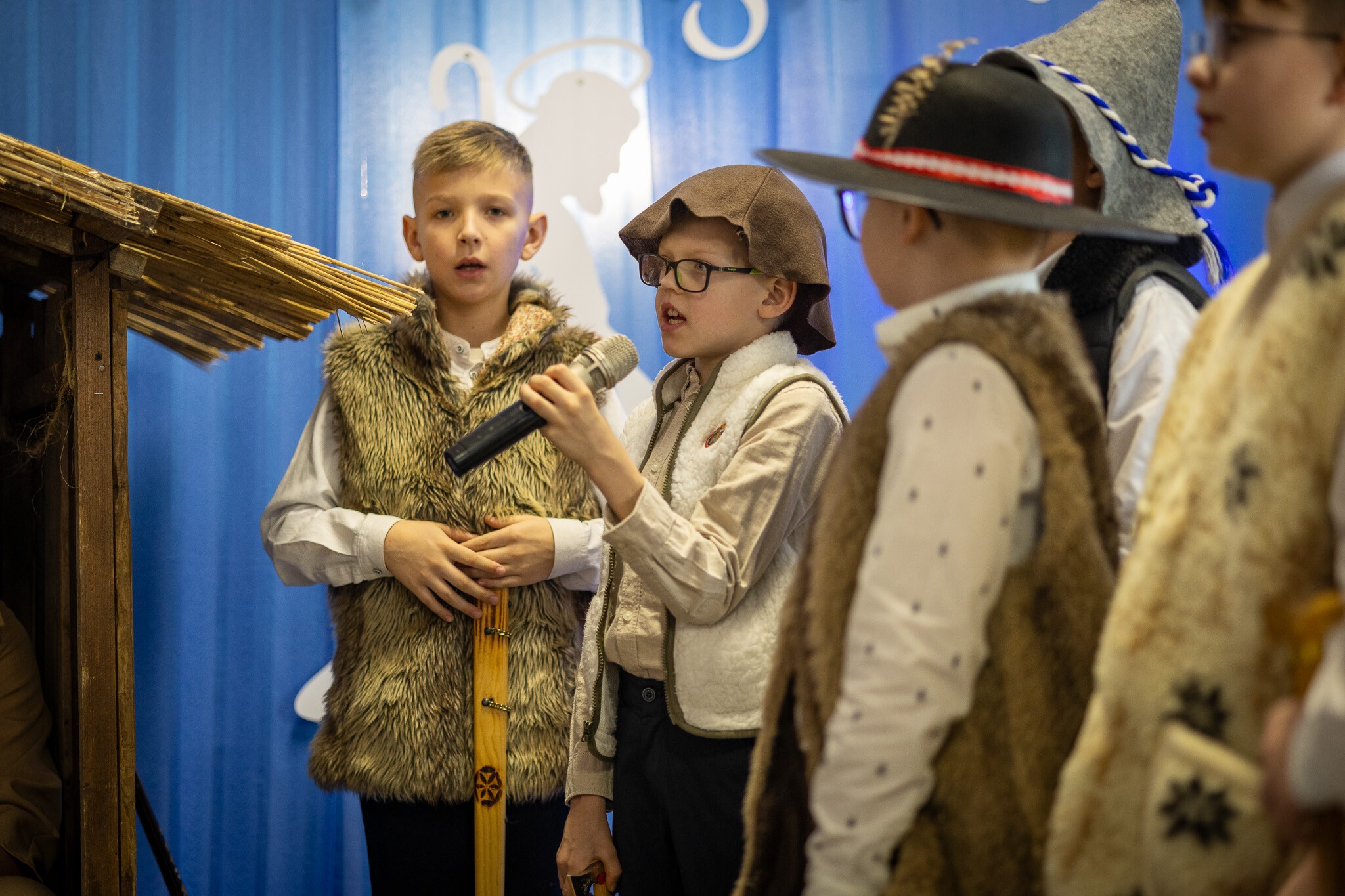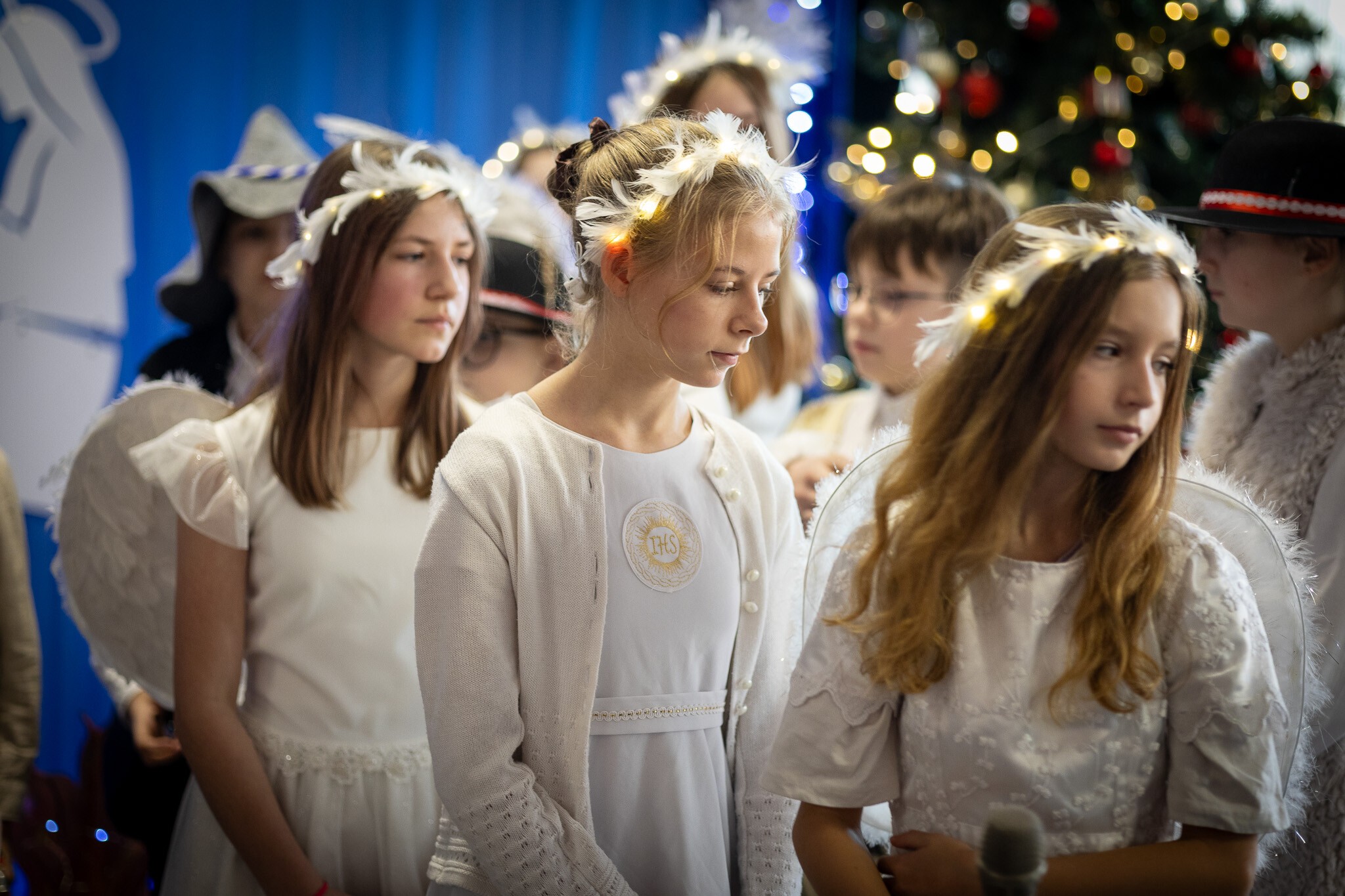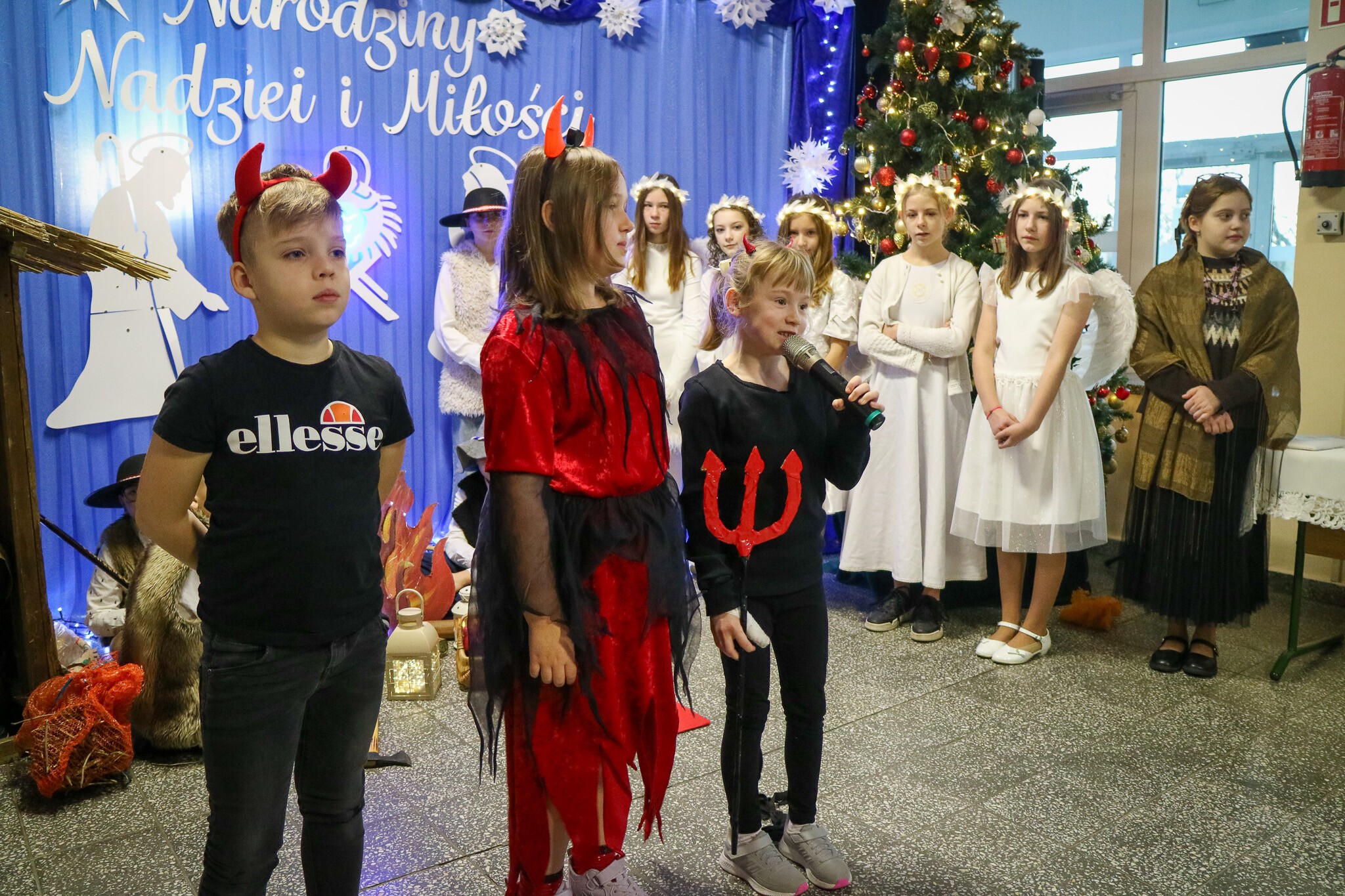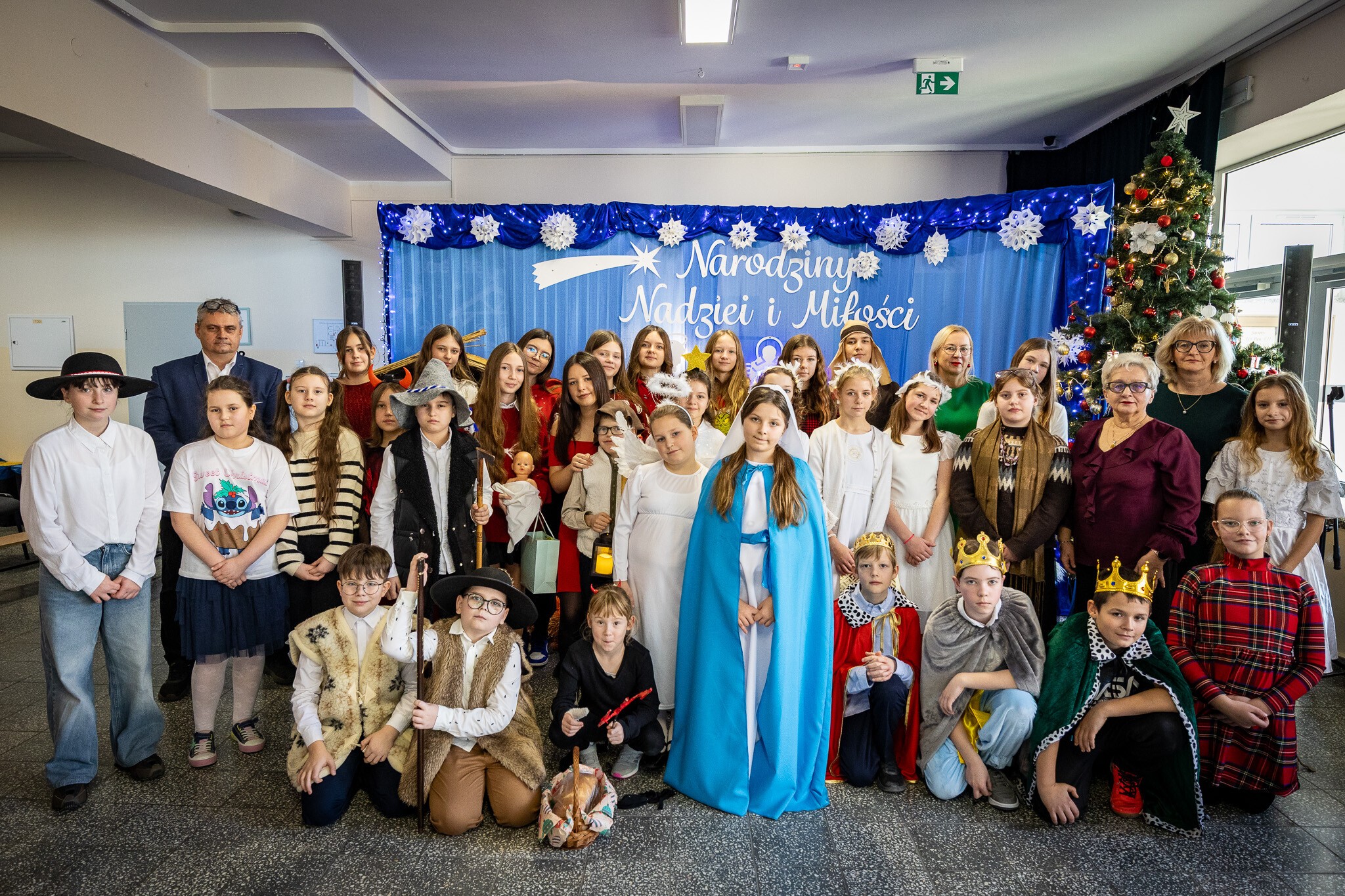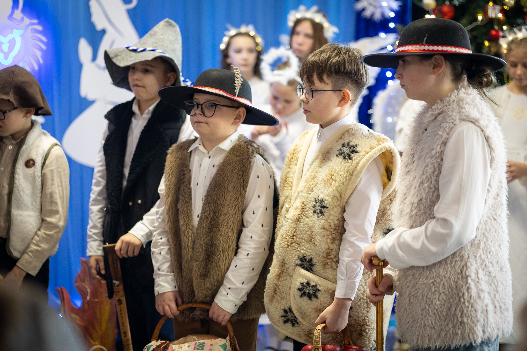 19 XII 2025r. piątek - ten dzień upłynął nam w świątecznym nastroju. Już o godzinie ósmej rano dzieci z zerówki i uczniowie klas I - III obejrzeli jasełka, a o 9.30 przedstawienie bożonarodzeniowe obejrzeli uczniowie klas IV - VIII oraz zaproszeni goście. Uczniowie wcielili się w role Maryi i Józefa, pasterzy, aniołów, Trzech Królów oraz dzieci przybywających złożyć pokłon Jezusowi narodzonemu w ubogiej stajence. Przedstawienie pokazujące scenki z życia nowonarodzonego dzieciątka przeplatały kolędy i pastorałki. Na zakończenie zabrał głos dyrektor szkoły dziękując za przygotowania. Życzenia składali także ksiądz proboszcz Janusz Góral, przewodnicząca Rady Rodziców Justyna Wilga oraz sołtys Łebienia Adam Folga. W świątecznych nastrojach rozeszliśmy się do sal, w których odbyły się klasowe spotkania wigilijne.