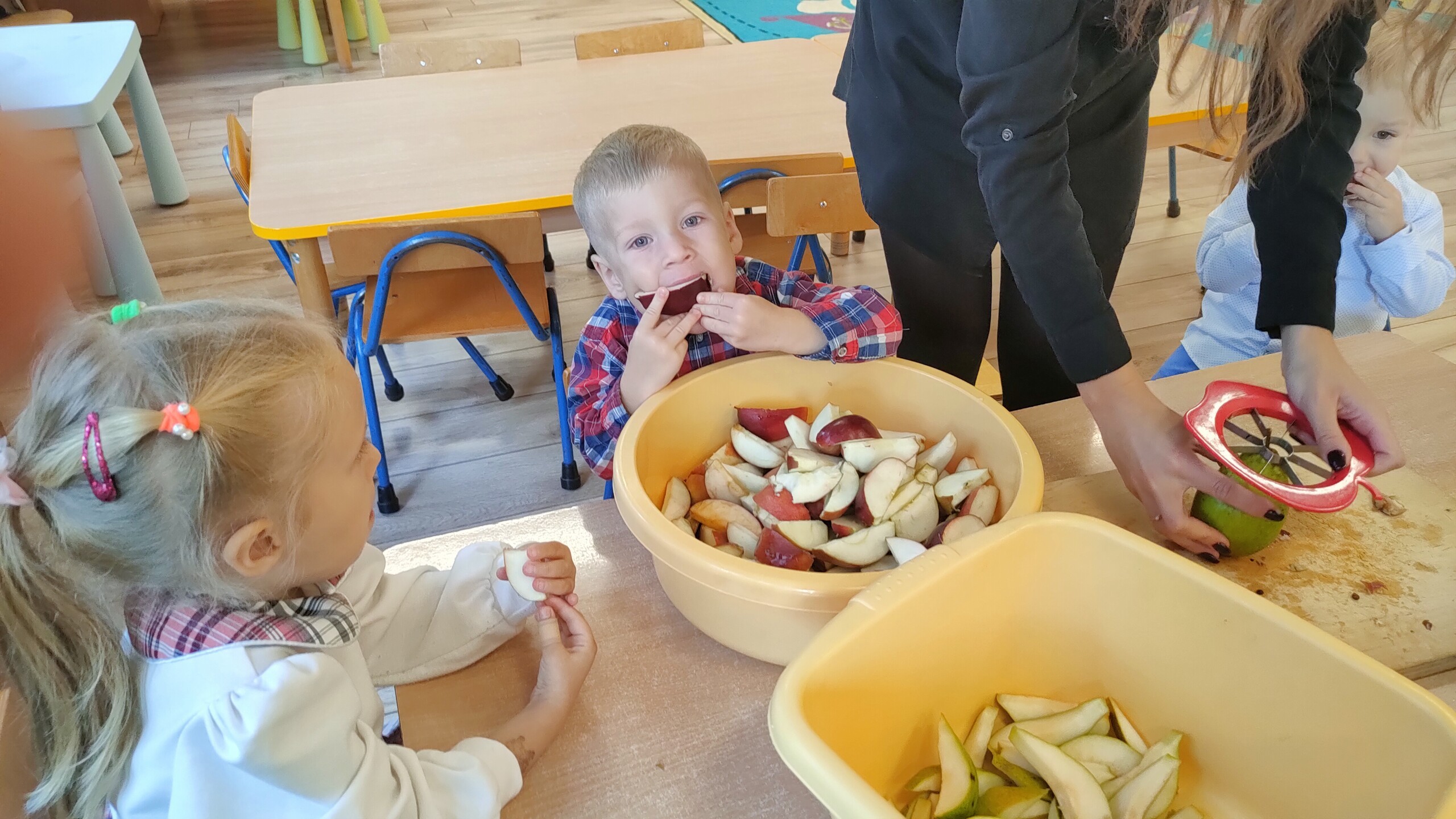 Wspólnie umyliśmy oraz pokroiliśmy jabłka i gruszki na części.