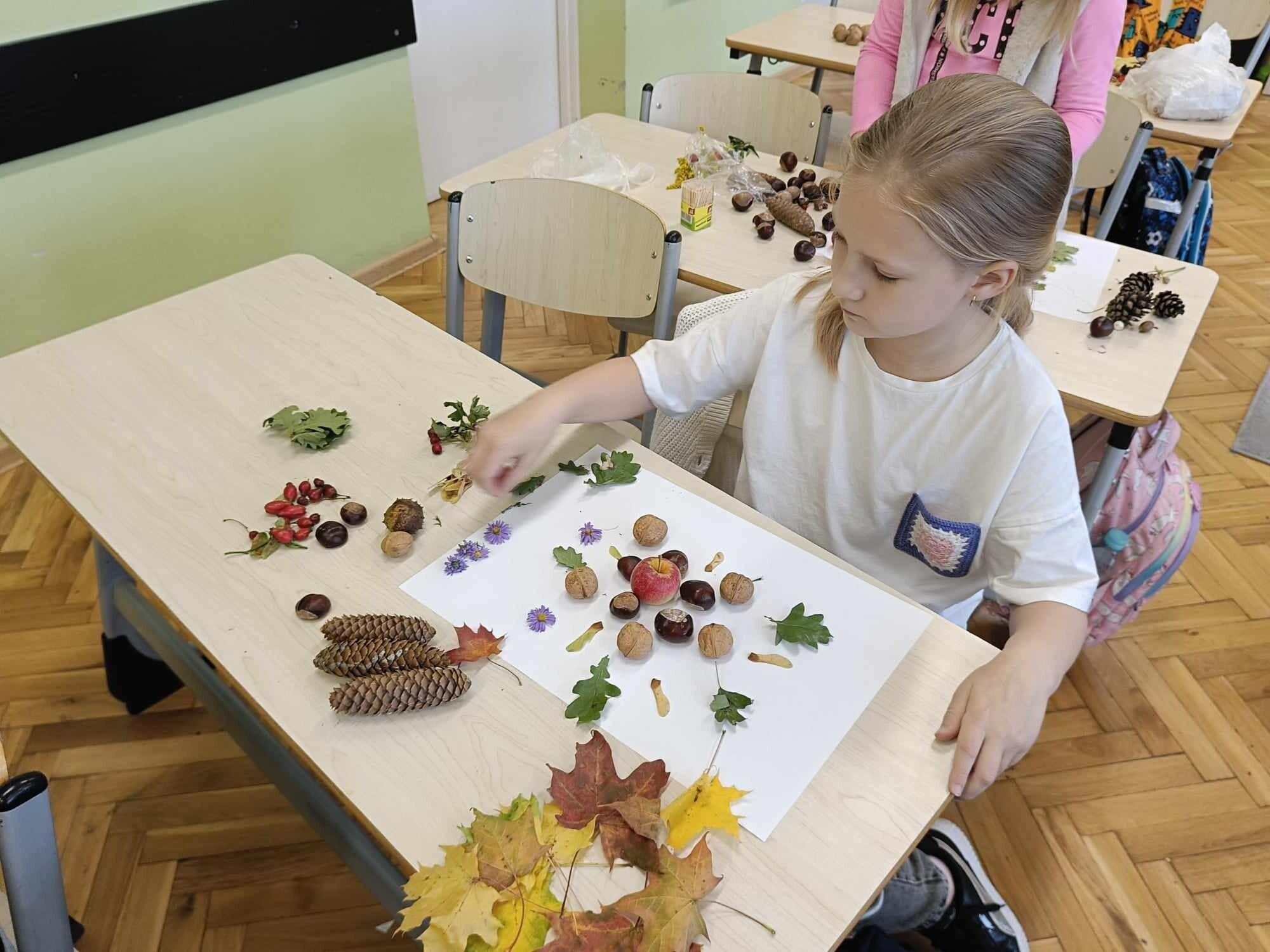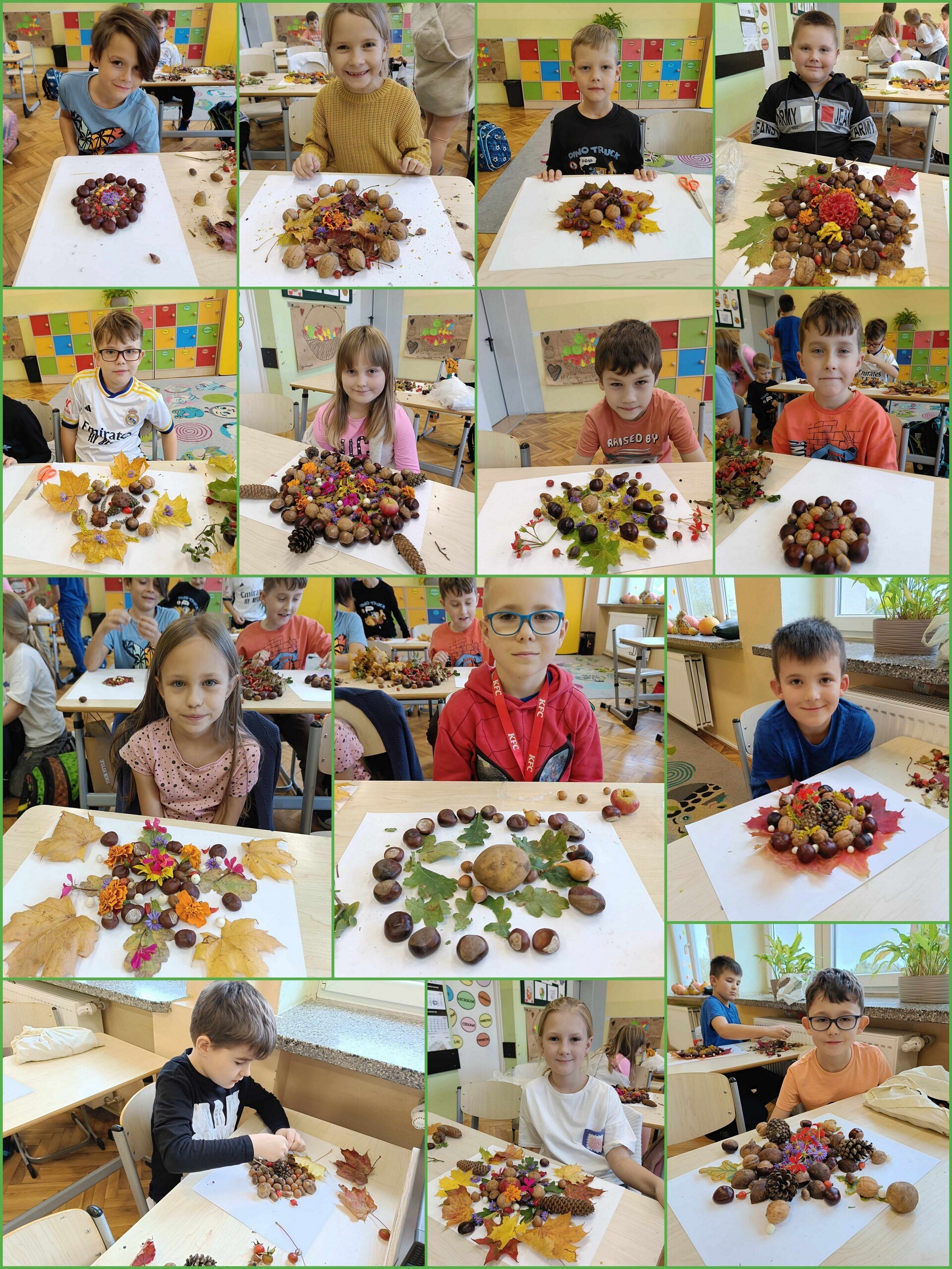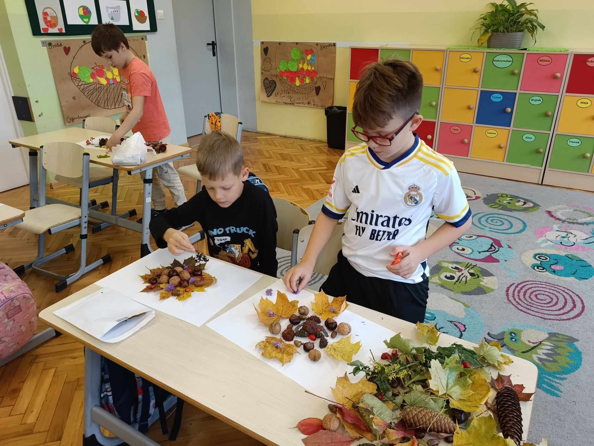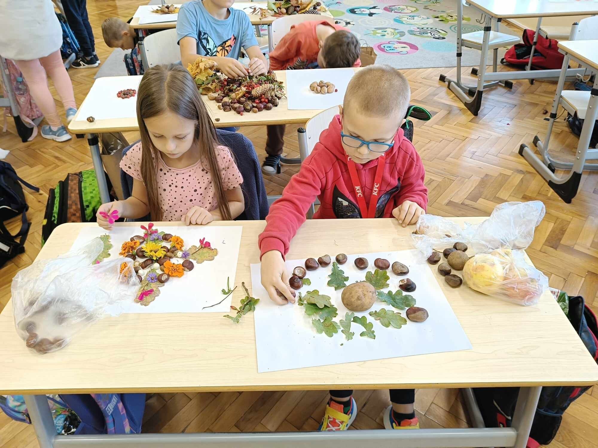 Uczniowie klasy 2 zrealizowali dwa jesienne moduły w ramach projektu „Kreatywna matematyka”. Pierwszy moduł pod hasłem „Matematyka w przyrodzie” zakładał szukanie darów jesieni i stworzenie z nich symetrycznej kompozycji. Idealne stały się mandale tworzone na bazie koła. Drugi moduł to „Matematyka wokół nas”, gdzie celem było rozwijanie spostrzegawczości i logicznego myślenia. Uczniowie dorysowywali brakującą część liścia w oparciu o oś symetrii.