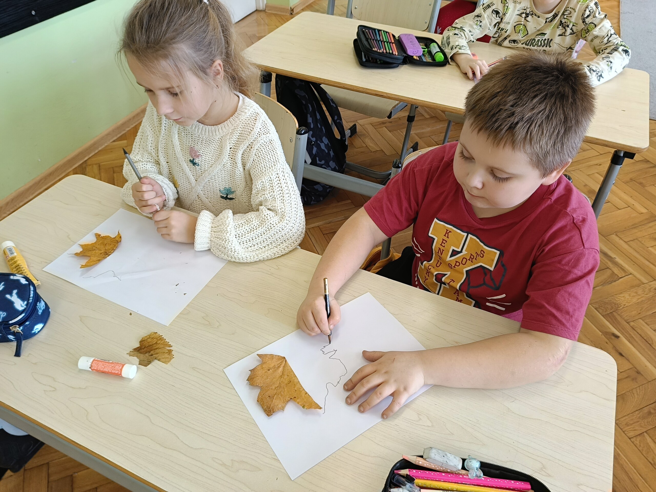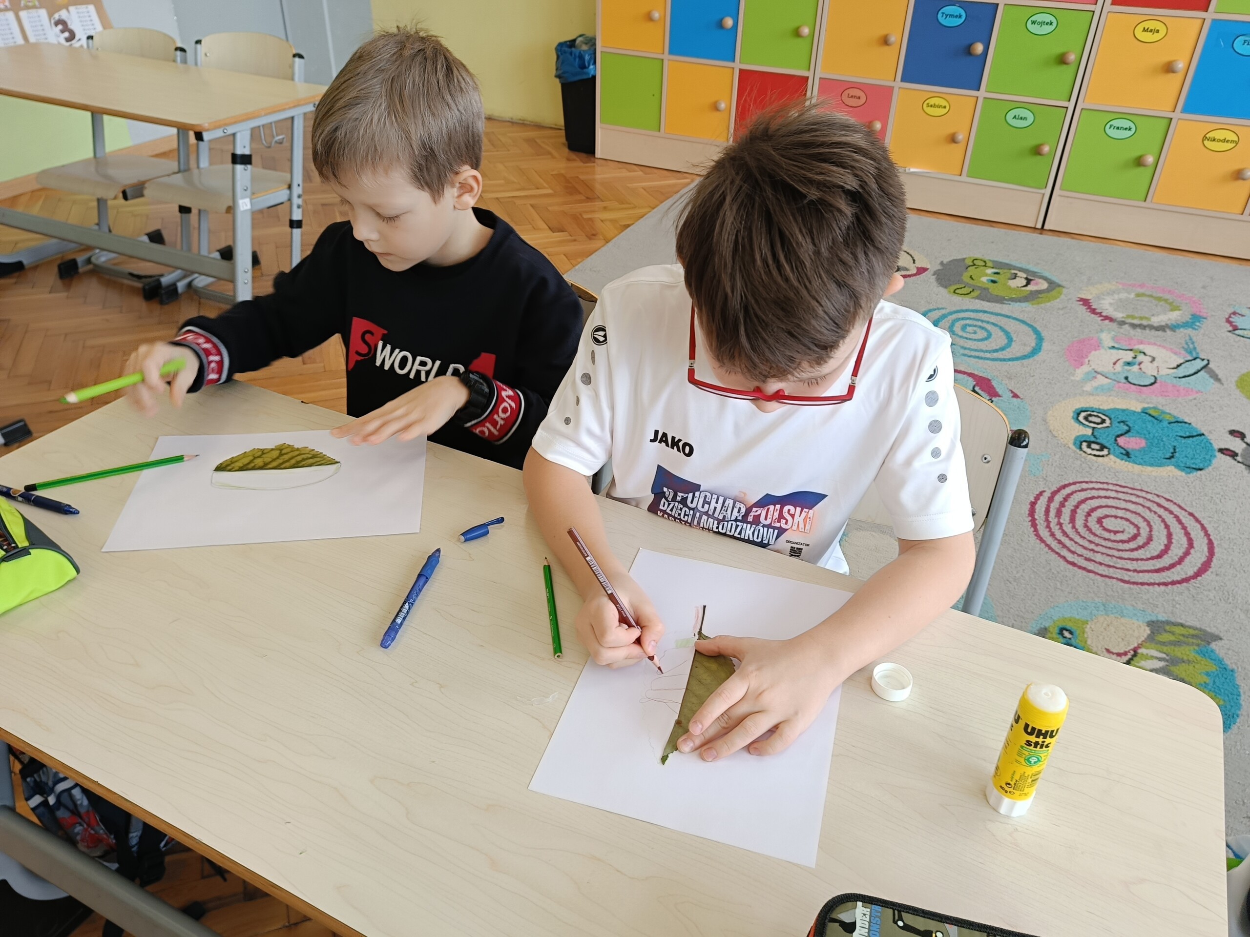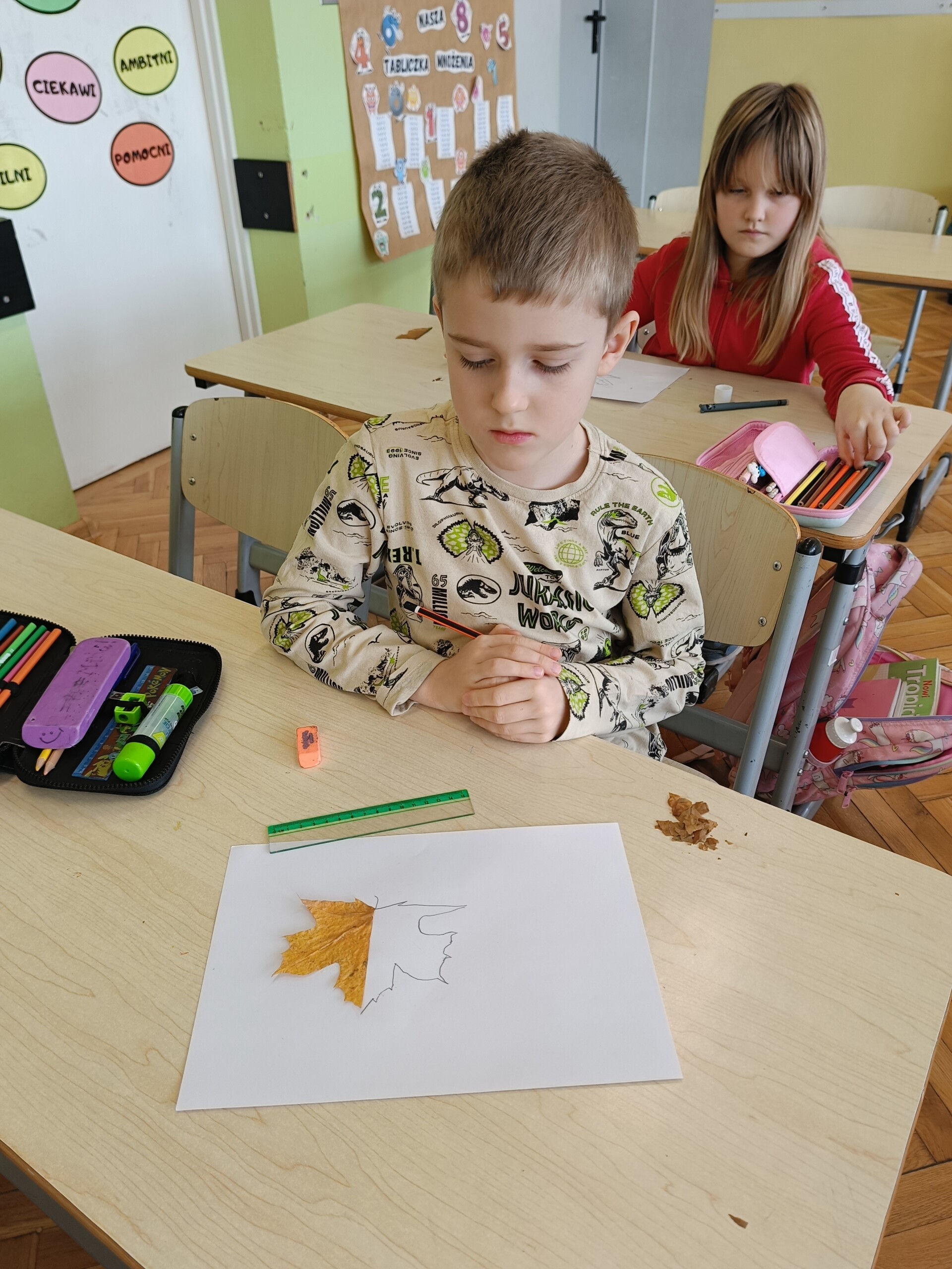 Uczniowie klasy 2 zrealizowali dwa jesienne moduły w ramach projektu „Kreatywna matematyka”. Pierwszy moduł pod hasłem „Matematyka w przyrodzie” zakładał szukanie darów jesieni i stworzenie z nich symetrycznej kompozycji. Idealne stały się mandale tworzone na bazie koła. Drugi moduł to „Matematyka wokół nas”, gdzie celem było rozwijanie spostrzegawczości i logicznego myślenia. Uczniowie dorysowywali brakującą część liścia w oparciu o oś symetrii.