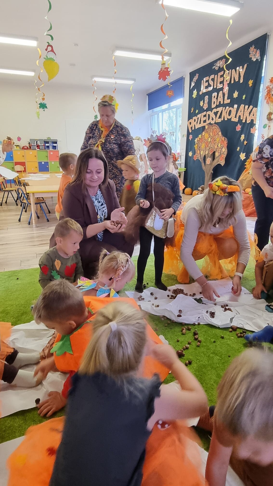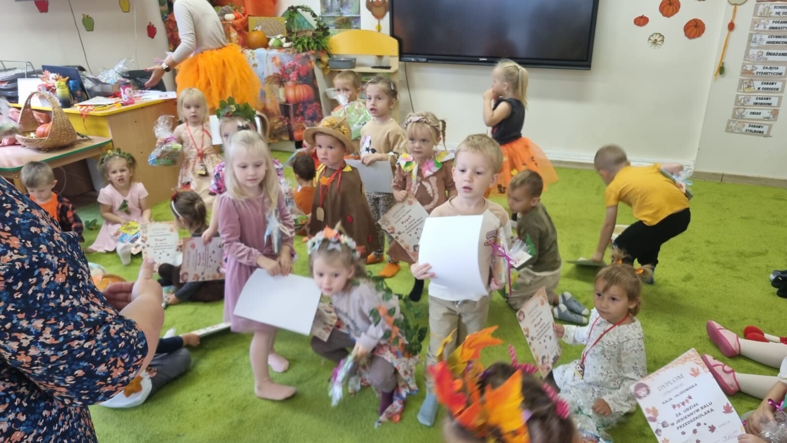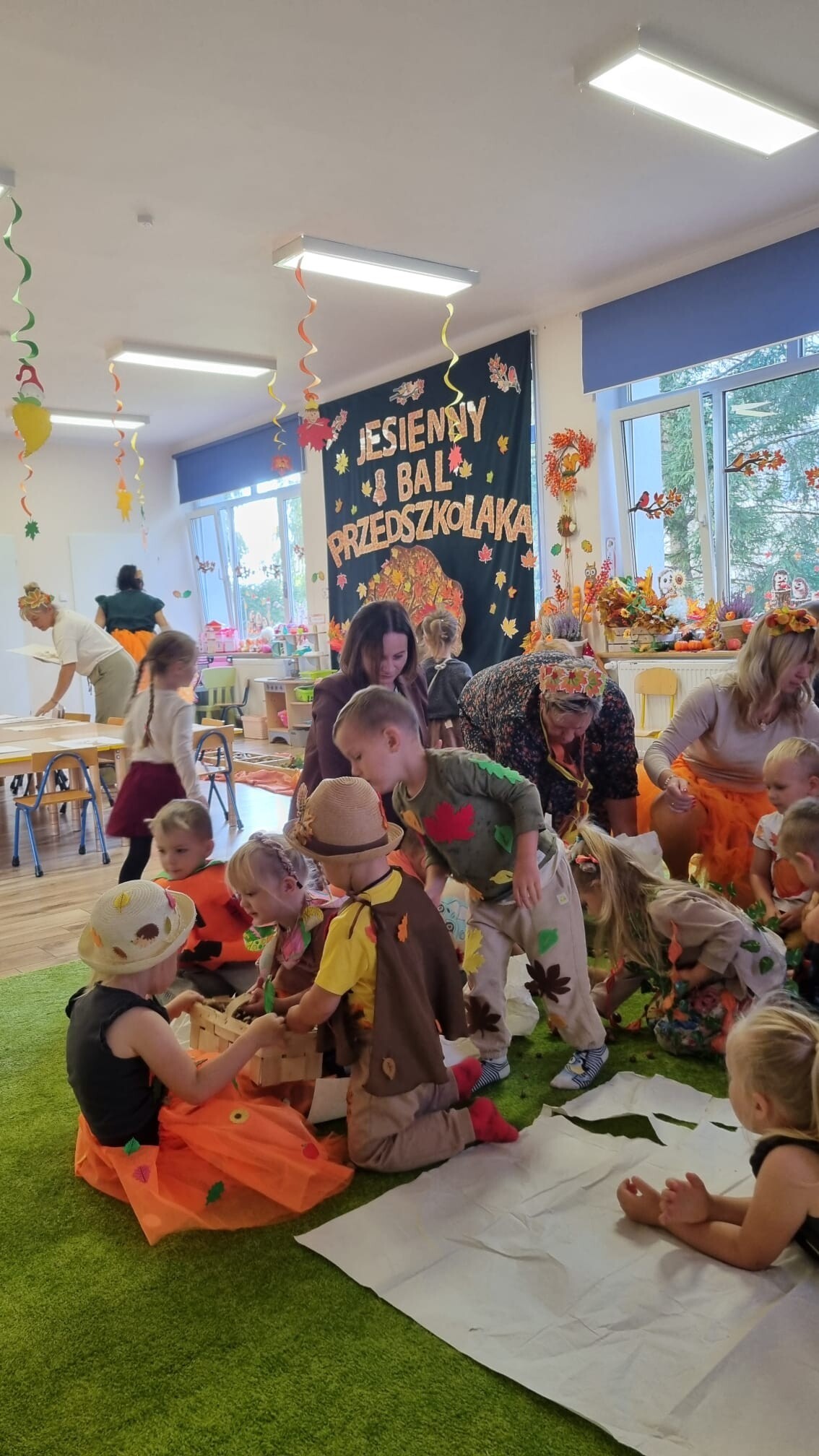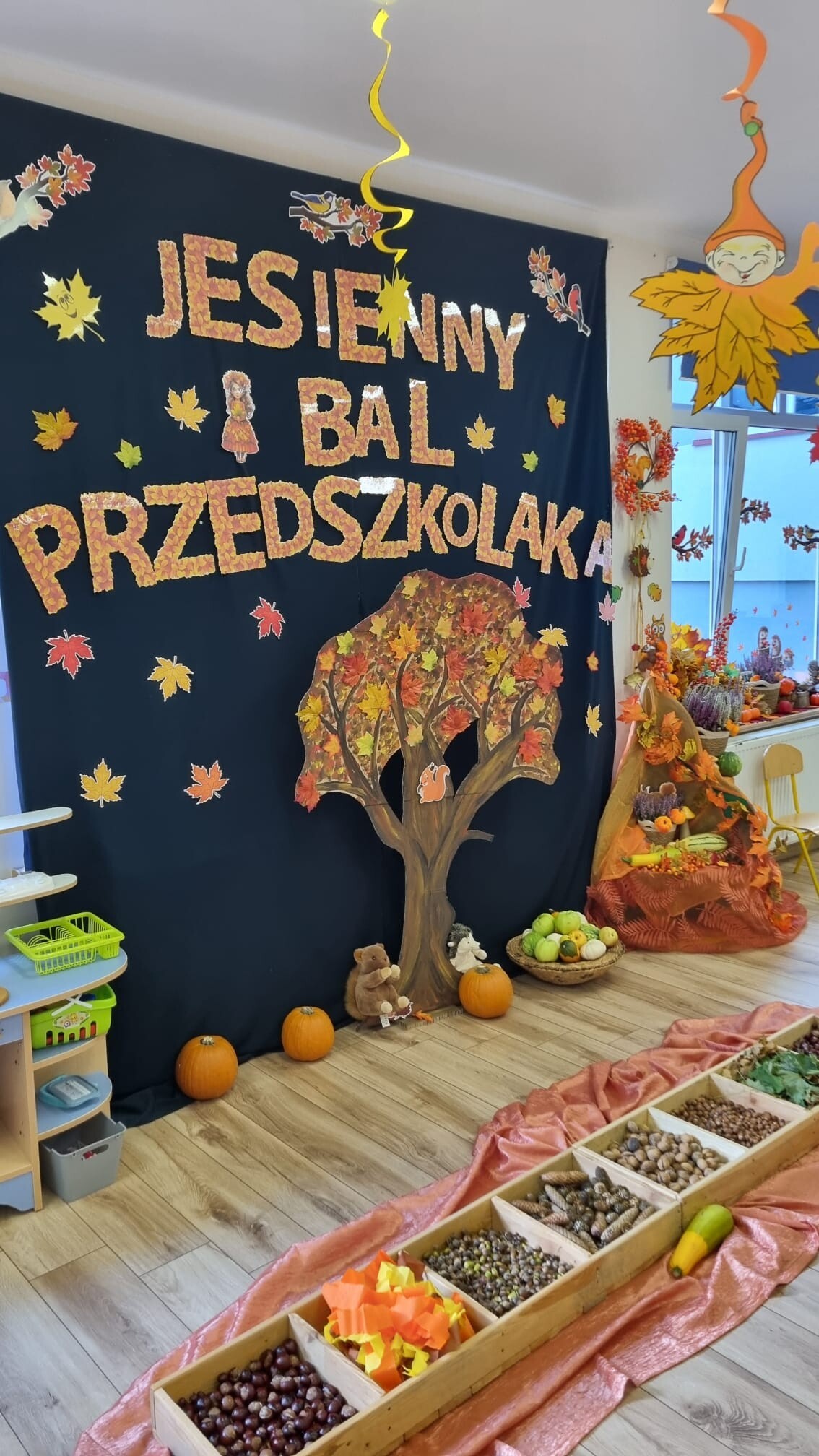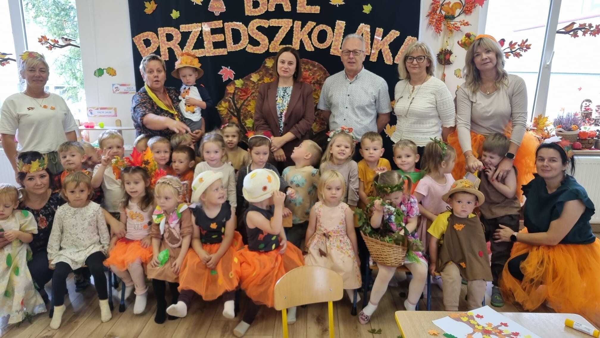 23 września 2025 r. nasze przedszkolaki powitały nową porę roku- JESIEŃ. Tego dnia w naszym przedszkolu odbyła się wyjątkowa uroczystość - Jesienny Bal Przedszkolaka. W sali przedszkolnej, w której odbywał się bal dominowały kolory jesieni - pomarańczowy, żółty, brązowy i czerwony. Przepiękne, pomysłowe stroje jesienne, w których przybyły dzieci uświetniły wydarzenie i wprowadziły uczestników w jesienny klimat. Były wspólne, tańce, piosenki, oraz spacer po przygotowanej ścieżce sensorycznej. Dzieci segregowały dary jesieni, wykonały przepiękne prace plastyczne „Drzewko jesienne”, a na koniec wspólnie przy stoliku degustowały zdrowe, jesienne owoce: jabłka, śliwki i gruszki.