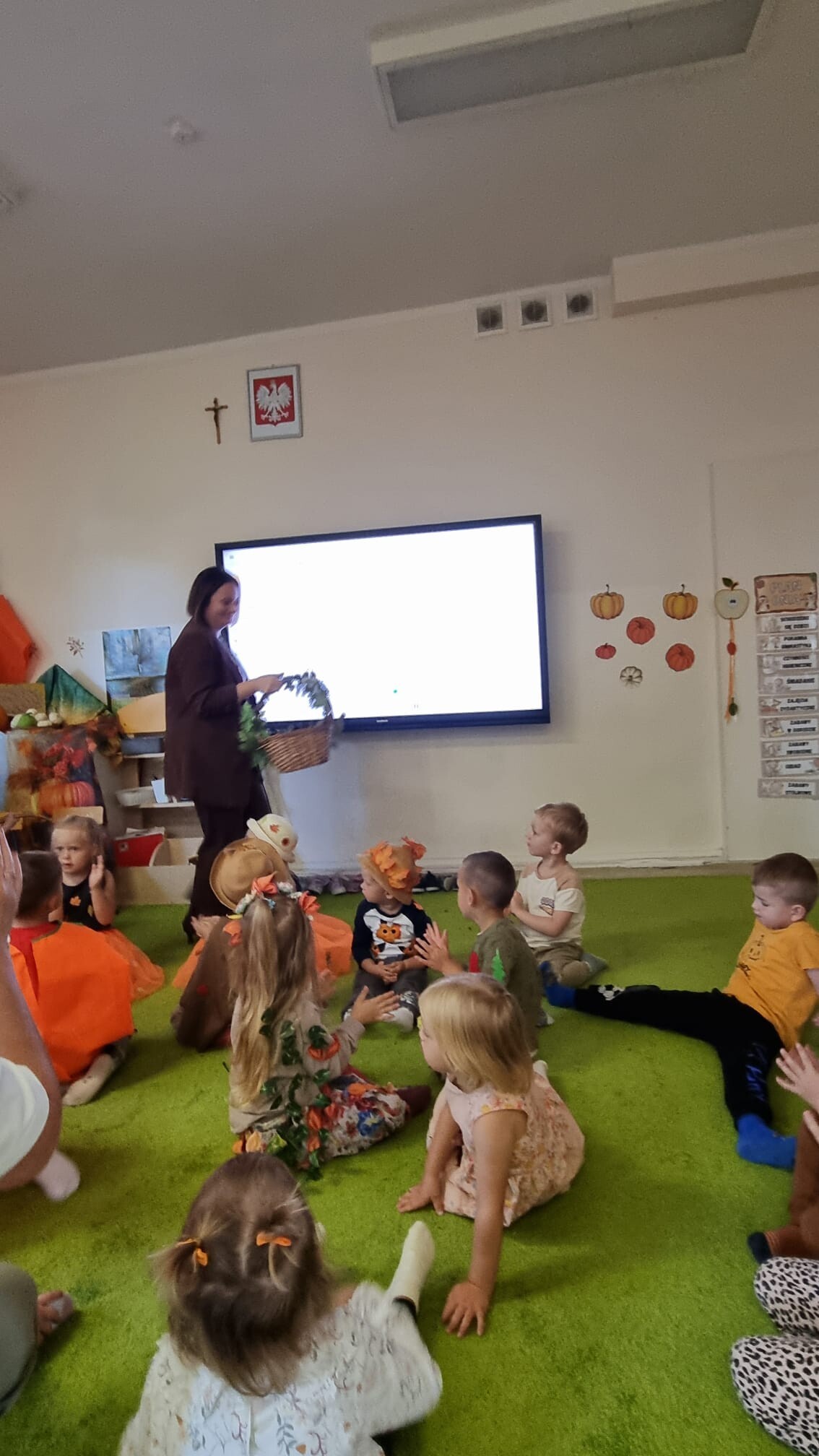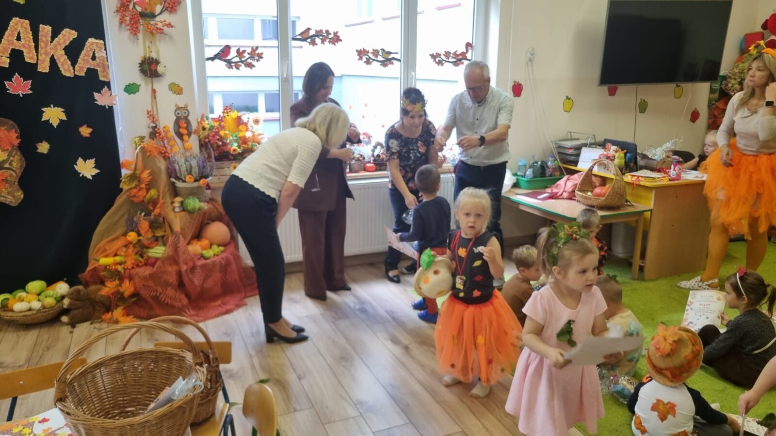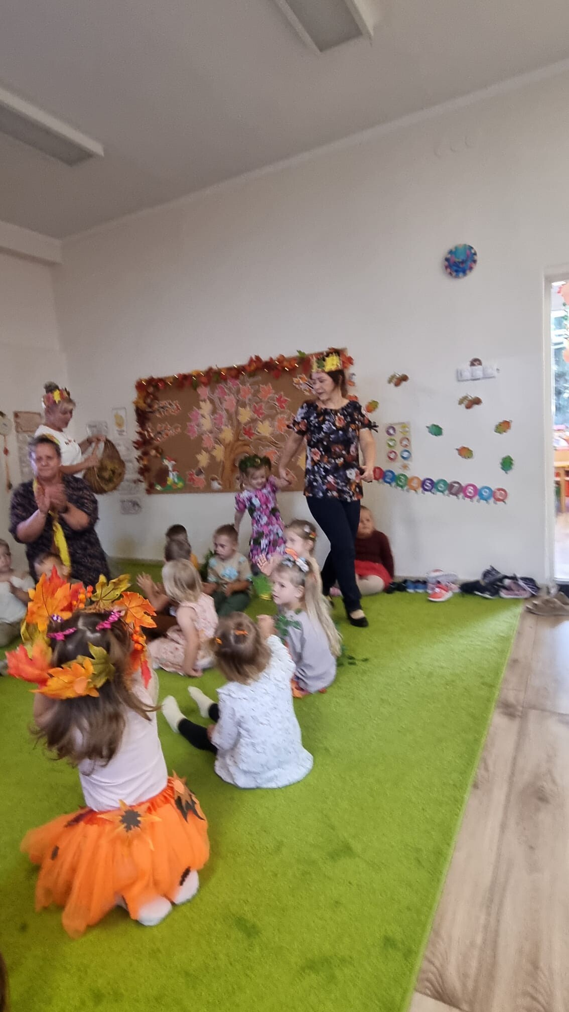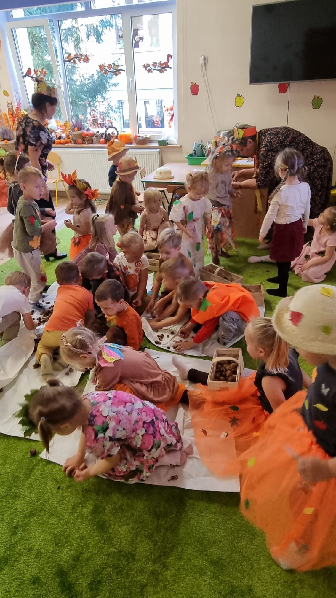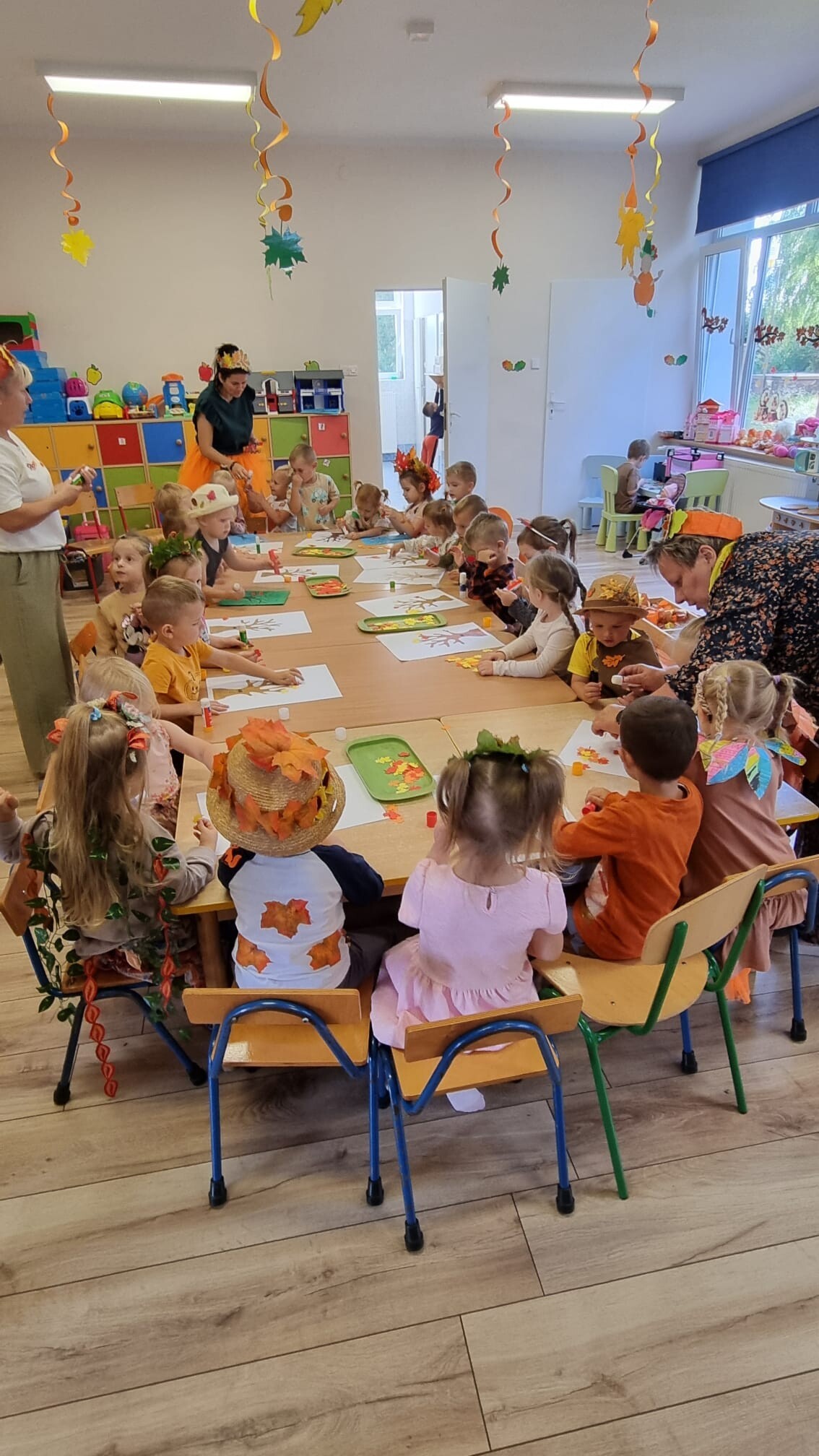 23 września 2025 r. nasze przedszkolaki powitały nową porę roku- JESIEŃ. Tego dnia w naszym przedszkolu odbyła się wyjątkowa uroczystość - Jesienny Bal Przedszkolaka. W sali przedszkolnej, w której odbywał się bal dominowały kolory jesieni - pomarańczowy, żółty, brązowy i czerwony. Przepiękne, pomysłowe stroje jesienne, w których przybyły dzieci uświetniły wydarzenie i wprowadziły uczestników w jesienny klimat. Były wspólne, tańce, piosenki, oraz spacer po przygotowanej ścieżce sensorycznej. Dzieci segregowały dary jesieni, wykonały przepiękne prace plastyczne „Drzewko jesienne”, a na koniec wspólnie przy stoliku degustowały zdrowe, jesienne owoce: jabłka, śliwki i gruszki.