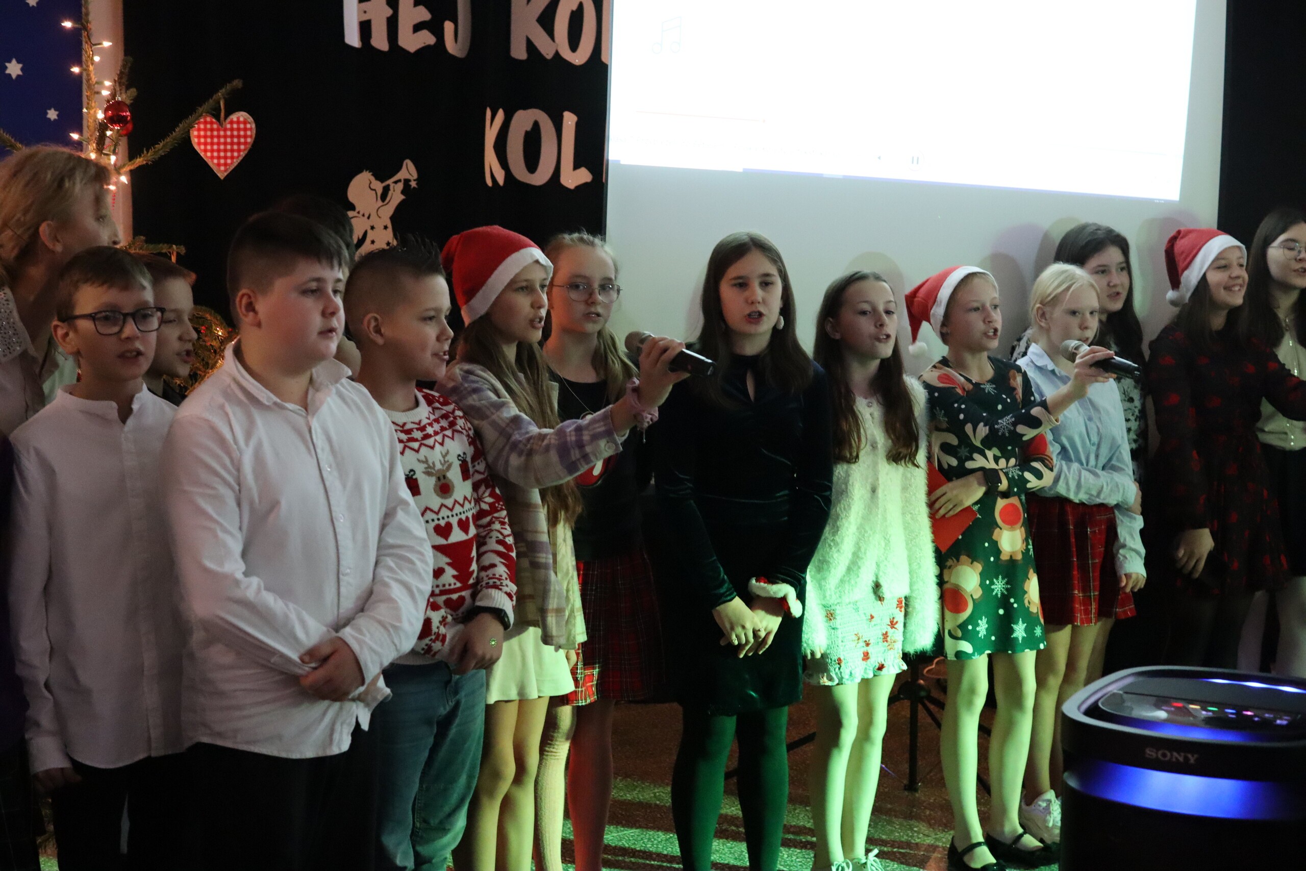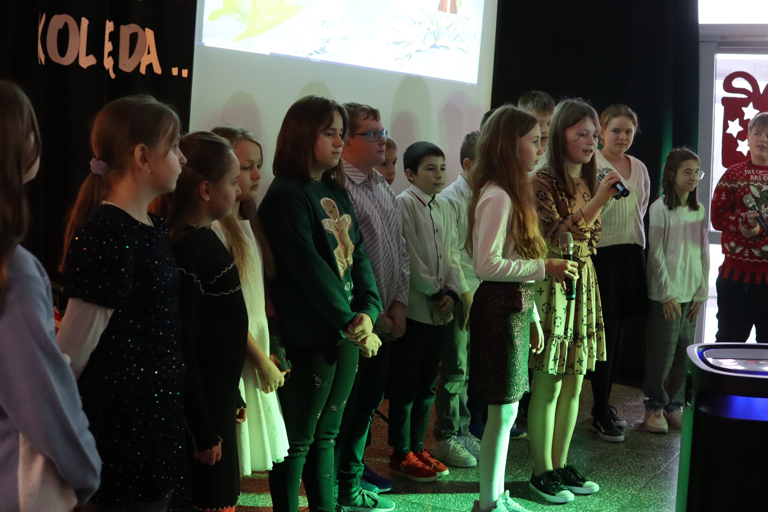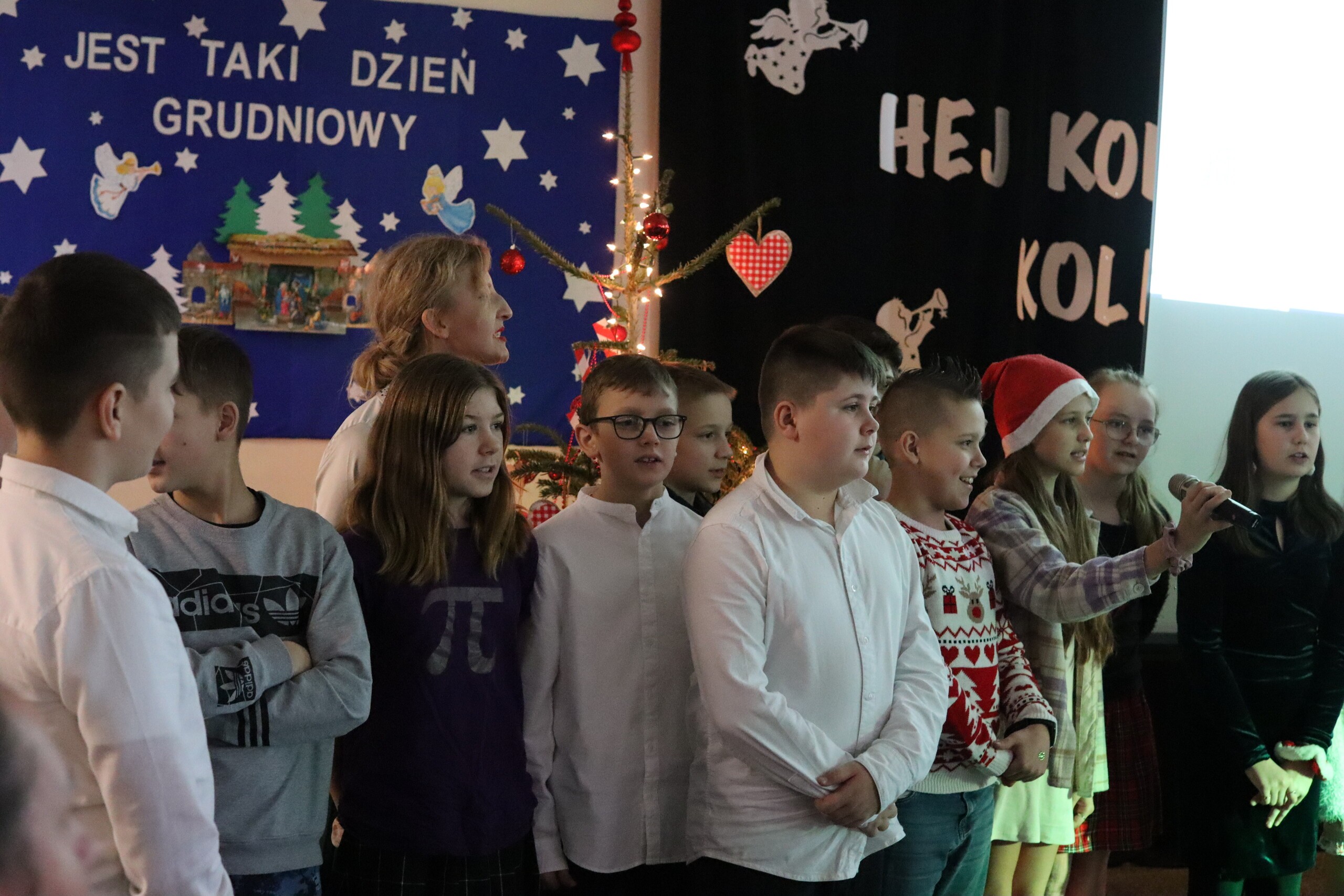 Święta tuż, tuż. Tradycją ostatniego dnia w naszej szkole jest wspólne spotkanie całej społeczności szkolnej. Uroczystość rozpoczęliśmy od wręczenia nagród za konkursy. Odwiedziła nas Pani Magdalena Downar – Zapolska z Gminnego Ośrodka w Nowej Wsi Lęborskiej, która wręczyła nagrody za Gminny Konkurs pt. „Kartka świąteczna”. Konkurs cieszył się w naszej szkole dużym powodzeniem, ponad 30 uczniów wzięło w nim udział. Następnie wręczone zostały nagrody za Konkurs na „Najpiękniejszy list do Św. Mikołaja”. Przyszła pora na życzenia świąteczne. Piękne życzenia wszystkim zgromadzonym złożyli Przewodnicząca Samorządu Uczniowskiego Wiktoria Kusznierewicz, Przewodnicząca Rady Rodziców Pani Emilia Stanuch i Pan Dyrektor Krzysztof Wojtysiak. Następnie każda klasa zaprezentowała przygotowaną wcześniej kolędę lub pastorałkę, do występów dołączyli wszyscy nauczyciele i chętni uczniowie. W tym świątecznym nastroju uczniowie wraz z wychowawcami udali się na Wigilie klasowe.