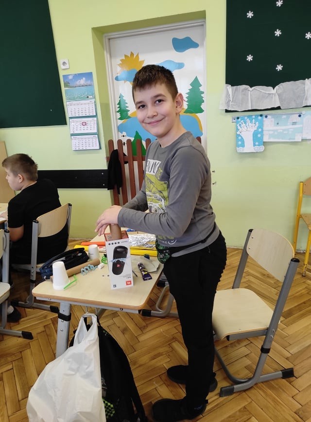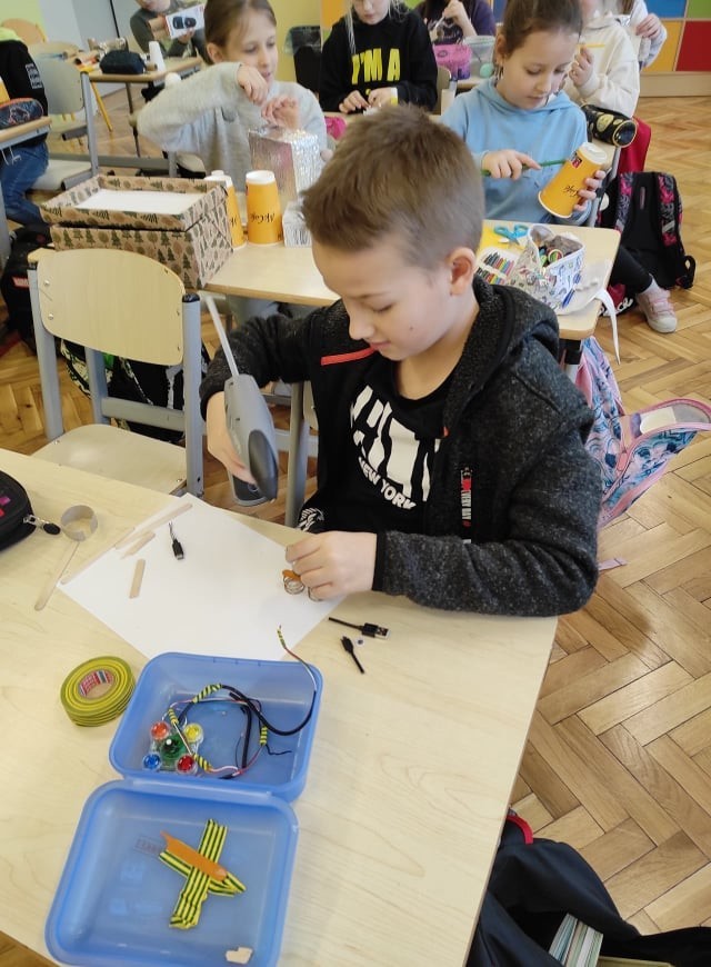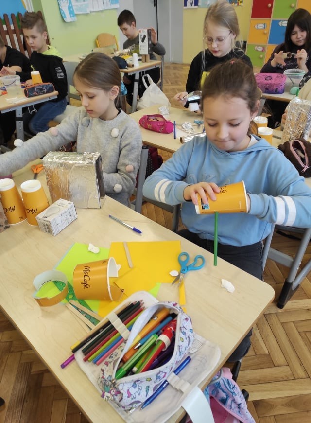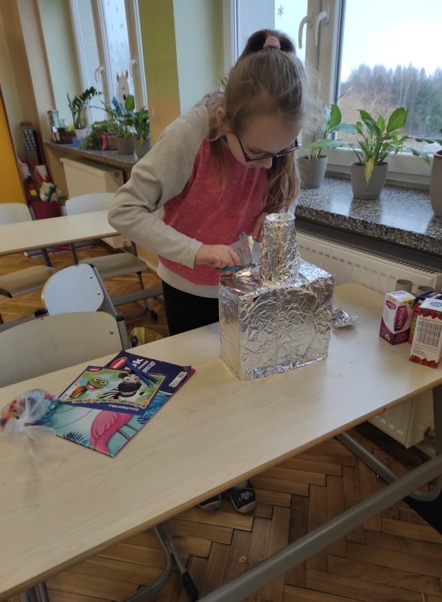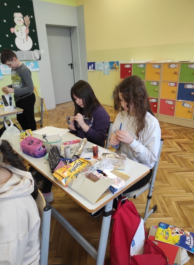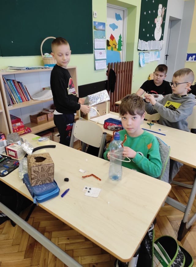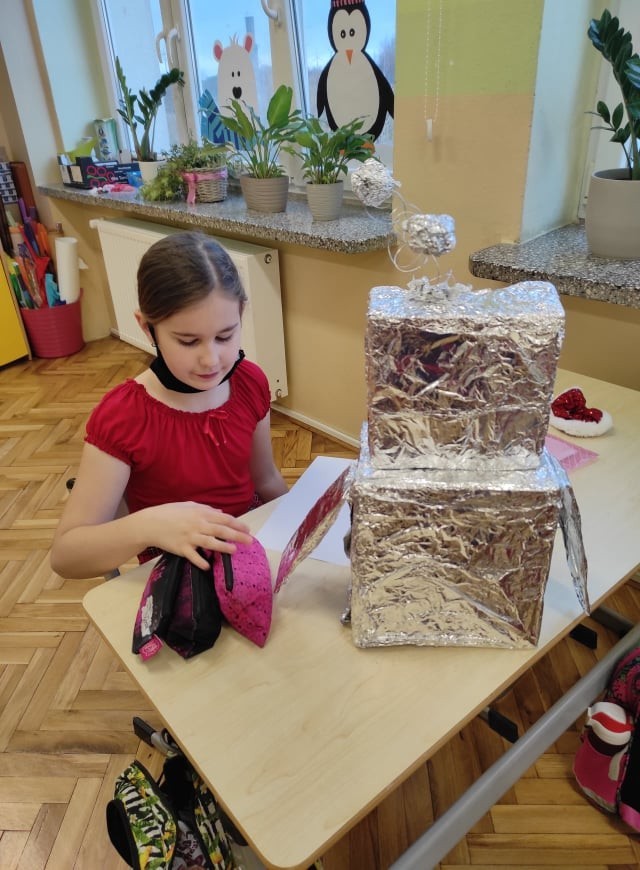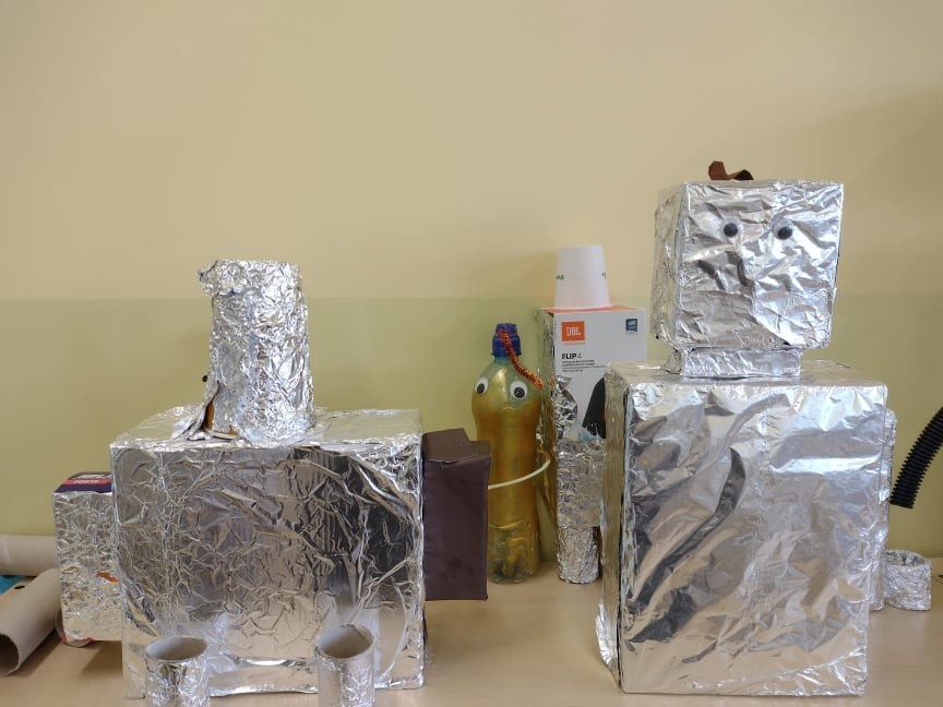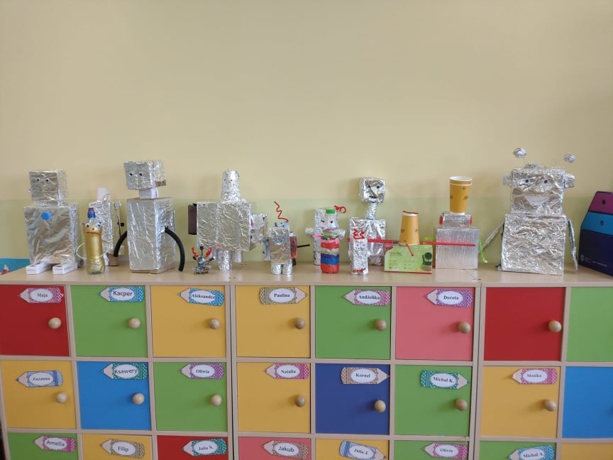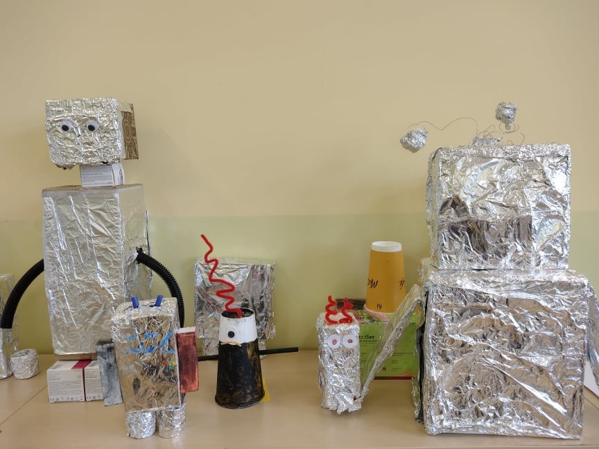 Uczniowie klasy III uczyli się o robotach humanoidalnych, czyli zastępujących ludzi w wykonywaniu różnych zadań, np. pracują w recepcji hotelowej, podają kawę w biurze. Na lekcjach techniki dzieci zaprojektowały i wykonały z różnych materiałów robota, którego chciałyby mieć w swoim domu. Efekty ich pracy można podziwiać na zdjęciach.