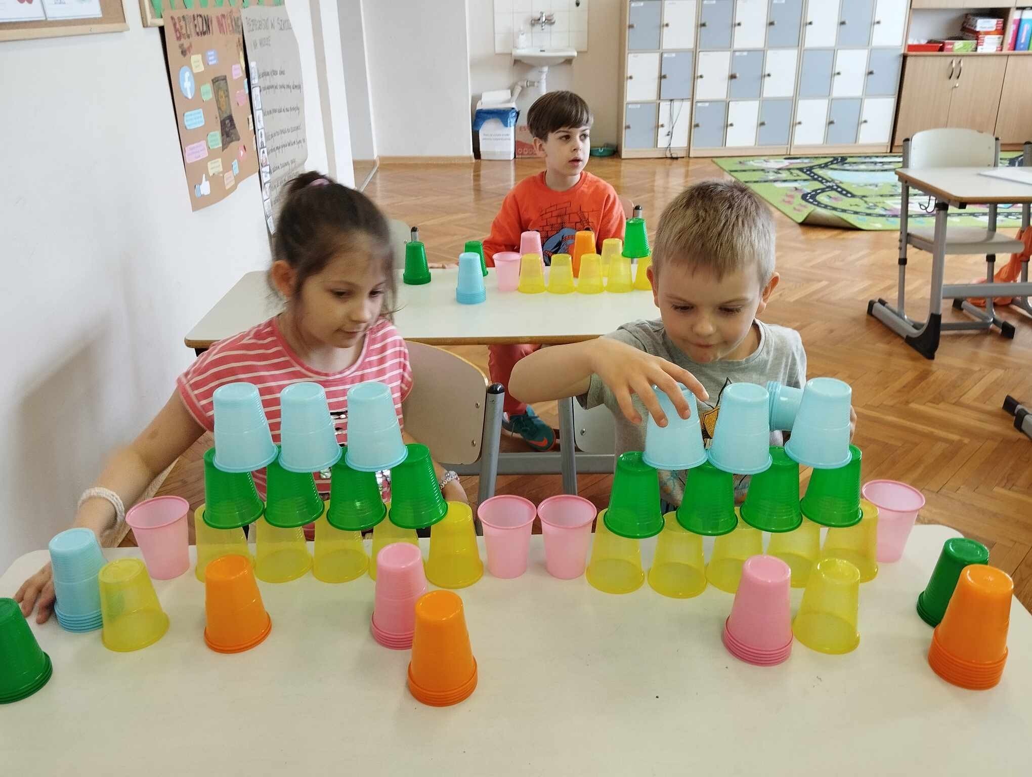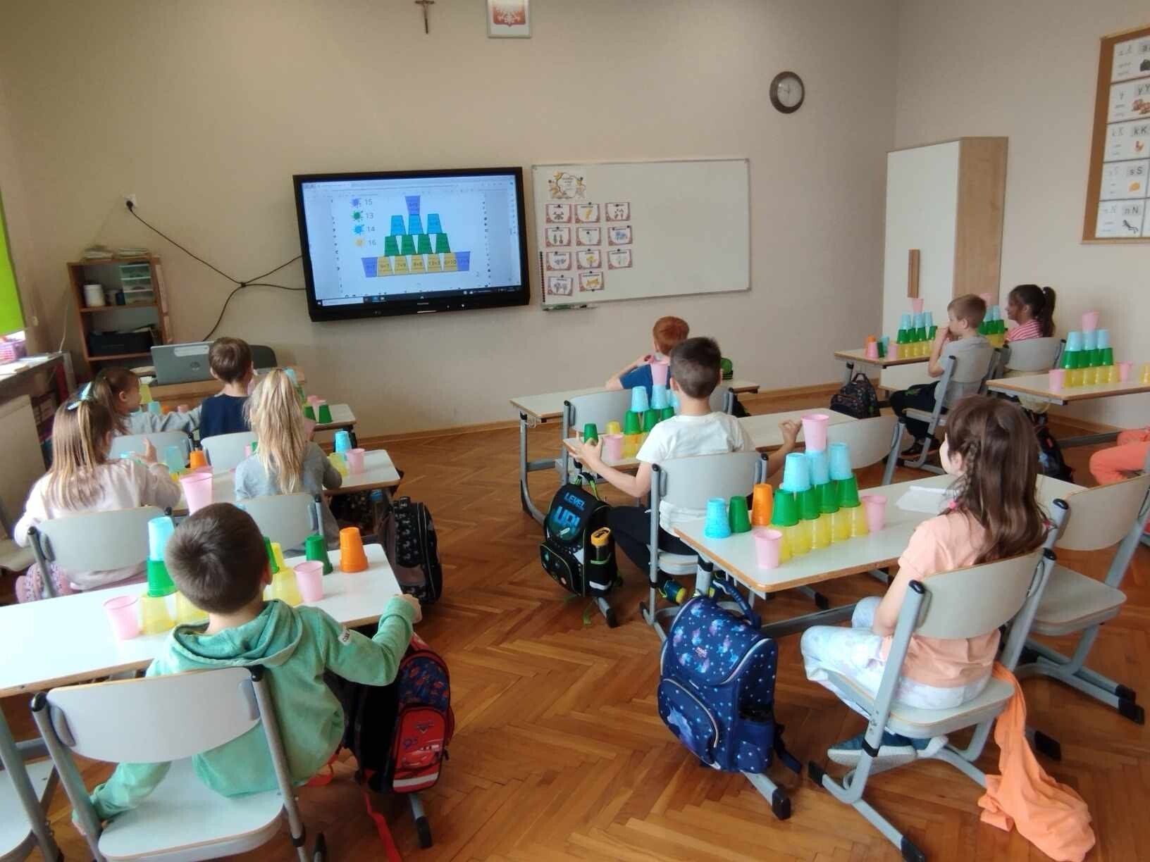 "Kubeczkowy zawrót głowy" dotarł także do klasy 1 a. Na zajęciach z edukacji matematycznej uczniowie wykorzystali kolorowe kubeczki do zdobywania i rozwijania różnych kompetencji, tj. logiczne myślenie, precyzja, koncentracja uwagi. Zadaniem dzieci było ułożenie kolorowych wież obliczając wynik dodawania i odejmowania.