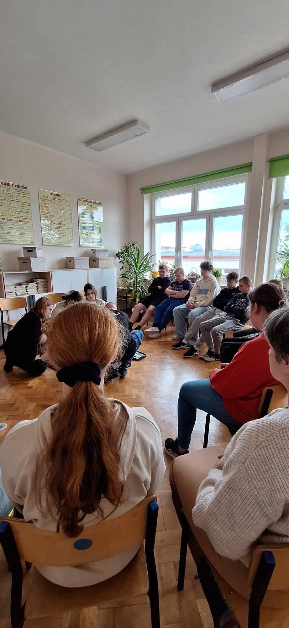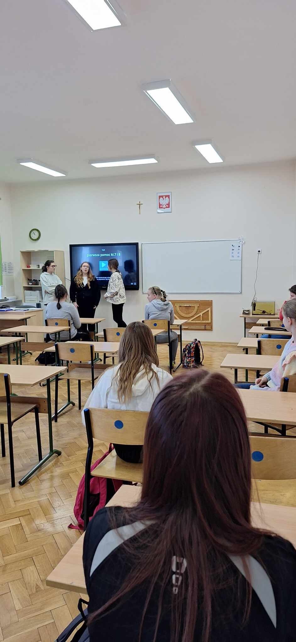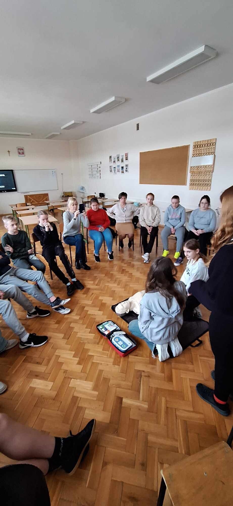 W piątek podczas lekcji wychowawczych uczennice: Zuzanna Stanuch, Michalina Gafk, Julia Jeka i Wiktoria Kusznierewicz zorganizowały dla swoich koleżanek i kolegów z klasy 7 i 8 zajęcia z udzielania pierwszej pomocy przedmedycznej. Uczennice są druhnami Młodzieżowej Drużyny Pożarniczej, dzięki czemu zagadnienia z udzielania pierwszej pomocy nie są im obce. Lekcja cieszyła się dużym zainteresowaniem wśród uczniów, ponieważ po omówieniu zagadnienia od razu przechodzili do części praktycznej. Uczniowie po tych zajęciach z pewnością wiedzą jak rozpoznać zatrzymanie krążenia, jak zadzwonić po pomoc, jak ułożyć poszkodowanego w pozycji bocznej, jak prawidłowo przeprowadzić resuscytację krążeniowo - oddechową, co to jest AED i jak się go używa. Na koniec prowadzące przeprowadziły test sprawdzający wiedzę uczniów. Całe zajęcia odbyły się pod czujnym okiem opiekuna MDP Radosława Gafk. Bardzo cieszy nas fakt, iż uczniowie naszej szkoły posiadają tak ogromną wiedzę z zakresu pierwszej pomocy i chcą się nią dzielić z innymi. Dziękujemy opiekunowi MDP za sprzęt i poświęcony czas.