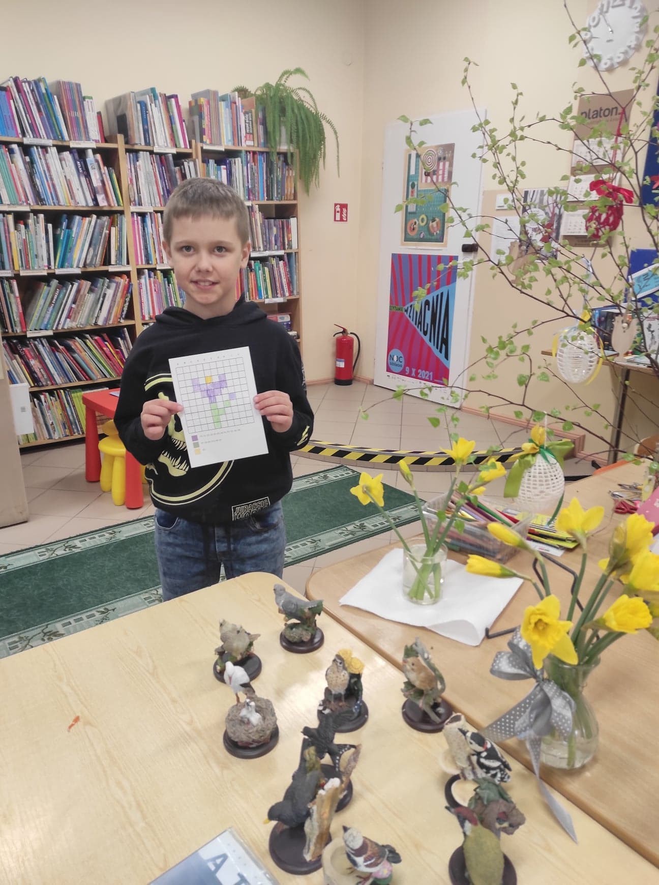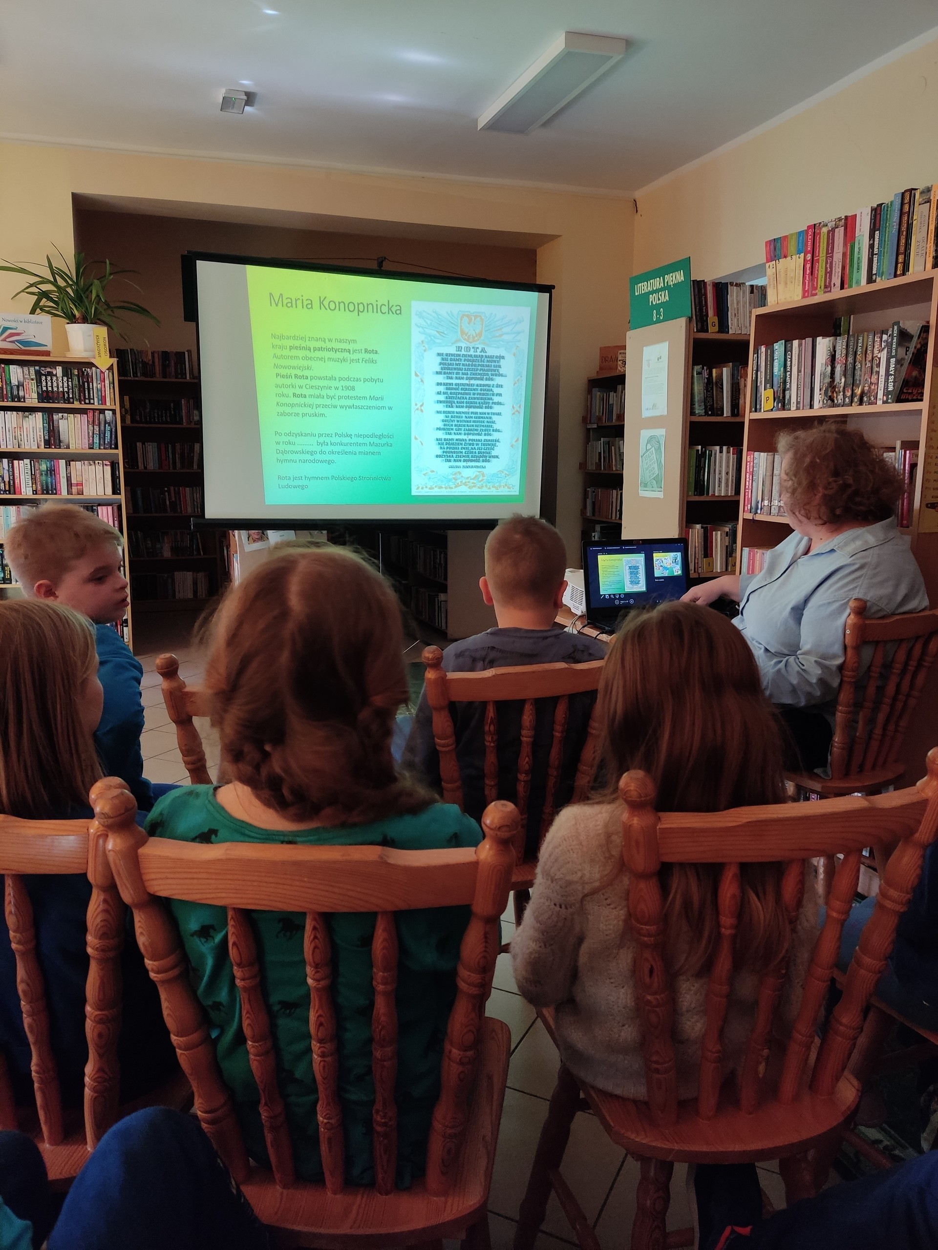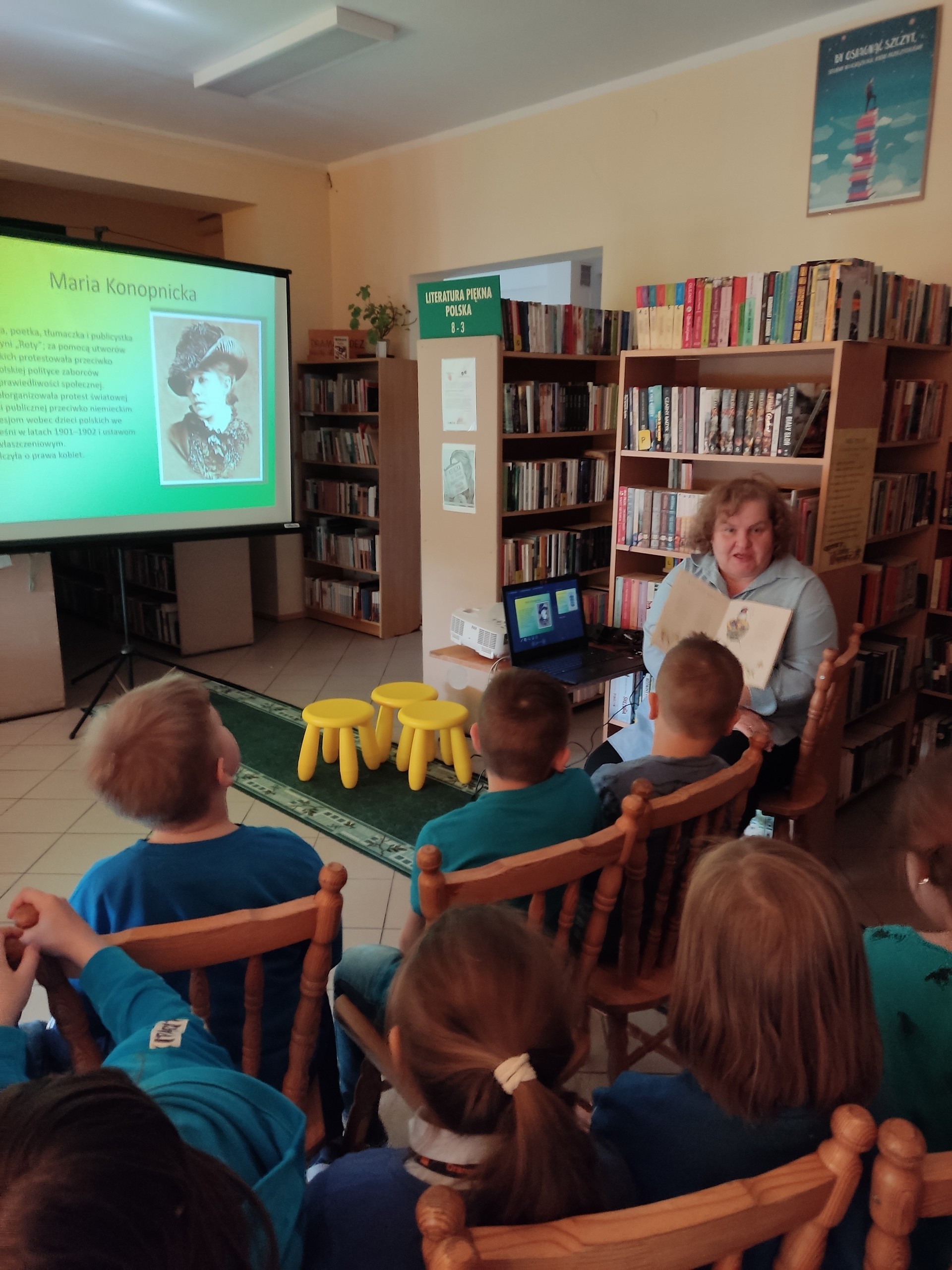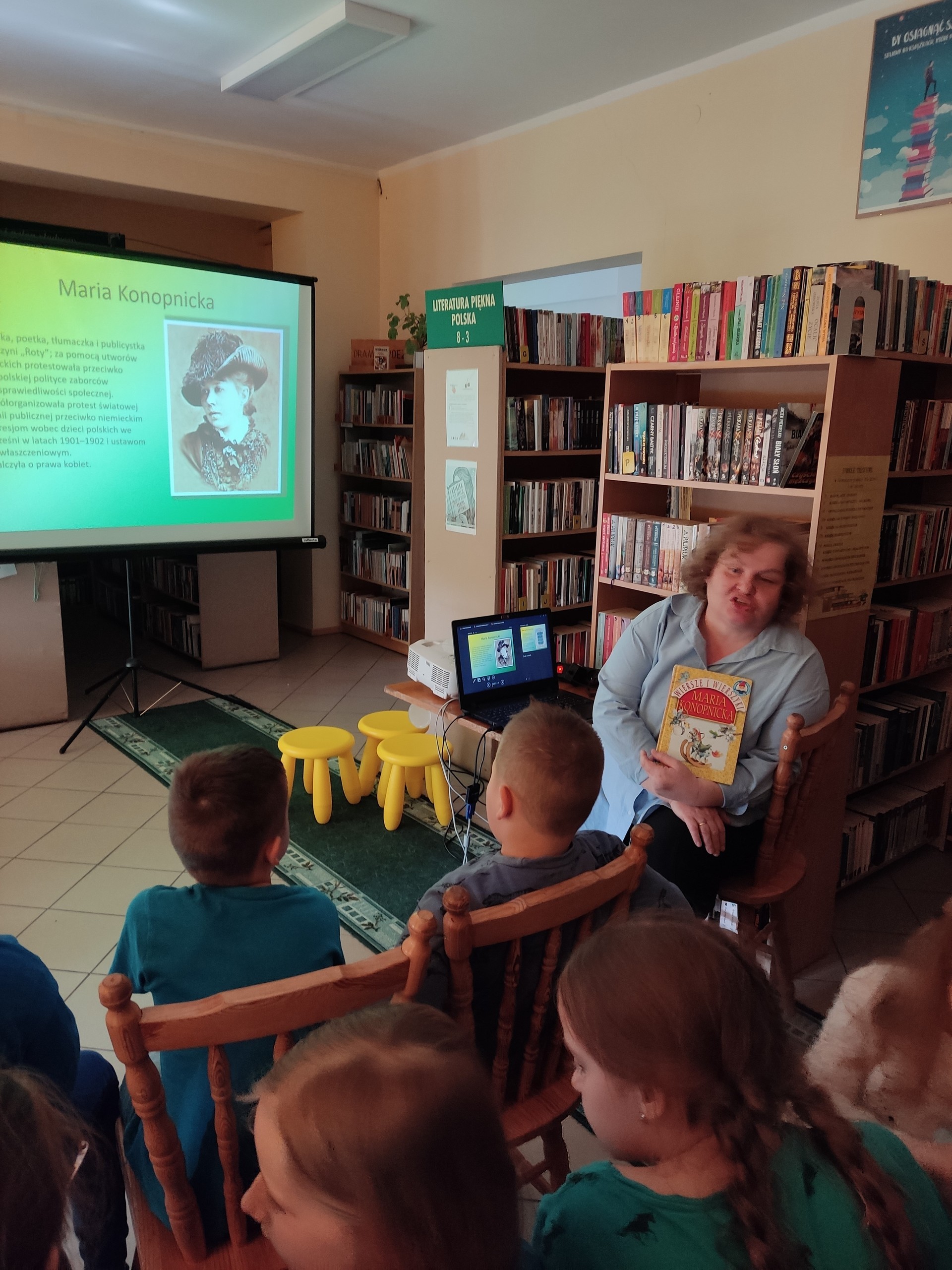 28 marca i 1 kwietnia najmłodsi uczniowie odwiedzili bibliotekę, aby poznać poezję Marii Konopnickiej – literackiej patronki roku 2022. Okazało się, że dzieci znają „Stefka Burczymuchę”, a podczas spotkania poznały inne wiersze poetki, np. „Powitanie wiosny “, „Nasze kwiaty”, „O czem ptaszek śpiewa” i inne. Ostatni wymieniony wiersz stał się podstawą do przypomnienia dzieciom o pierwszych wiosennych kwiatach. Z zaciekawieniem wzięły udział w odkodowaniu i rozpoznaniu kolorowych zwiastunów wiosny. Trzecioklasiści bez trudu rozpoznawali ptaki, które jako pierwsze odwiedzają nas po długich zimowych zimnych miesiącach. Ich śpiew rozbrzmiewał podczas wiosennego spotkania z poezją.