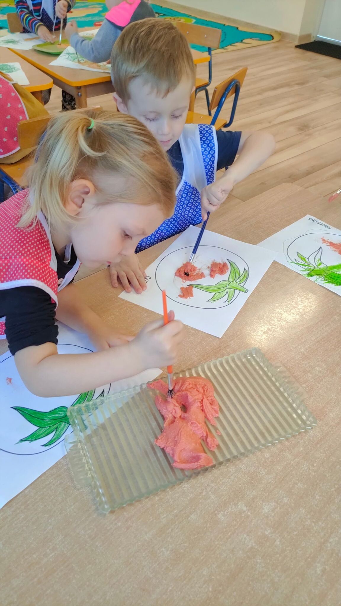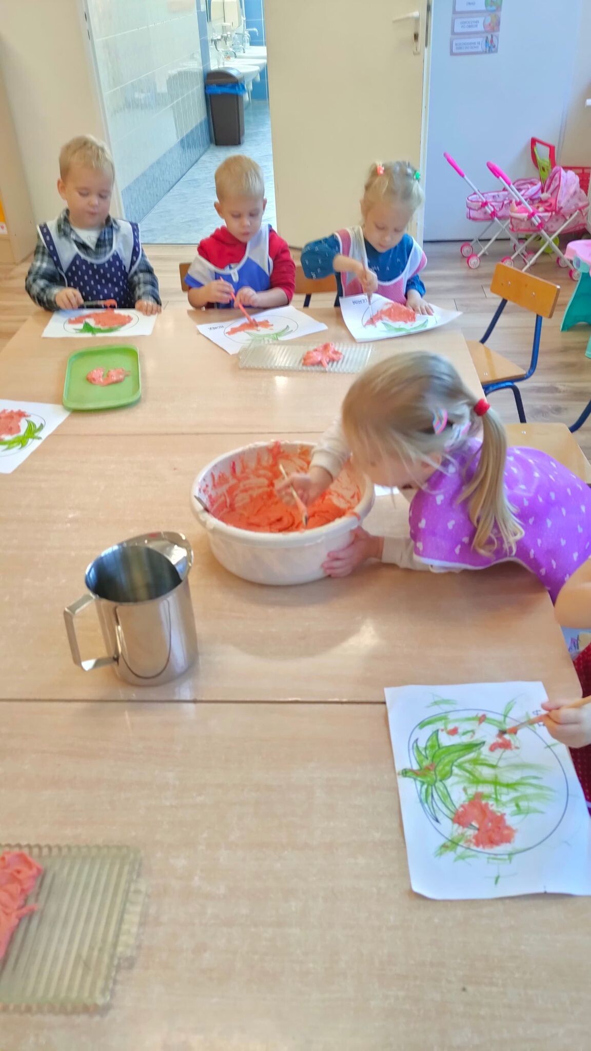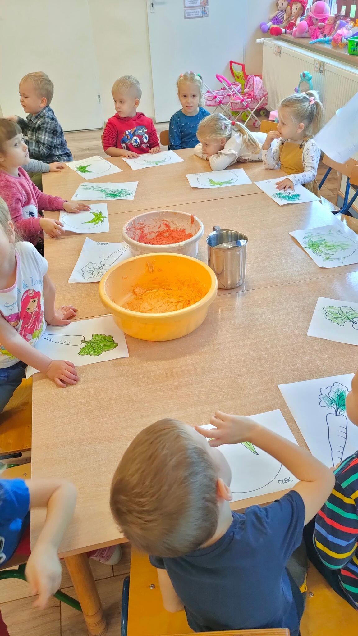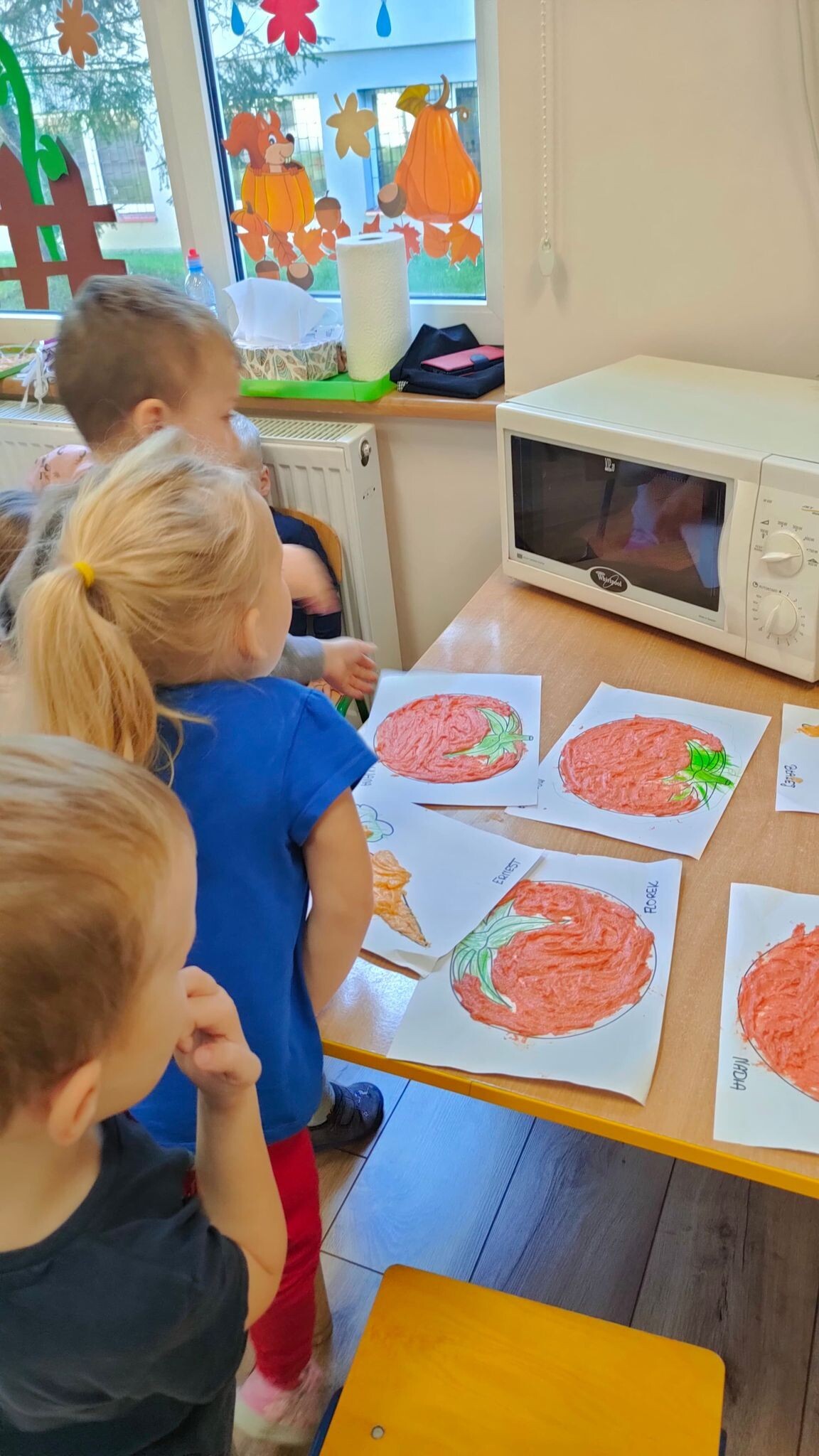"Słoneczka" poznały dzisiaj magię rosnącej masy i z jej pomocą stworzyły piękne prace plastyczne. Wszyscy z niecierpliwością obserwowali, jak w mikrofali urosną warzywne obrazki.