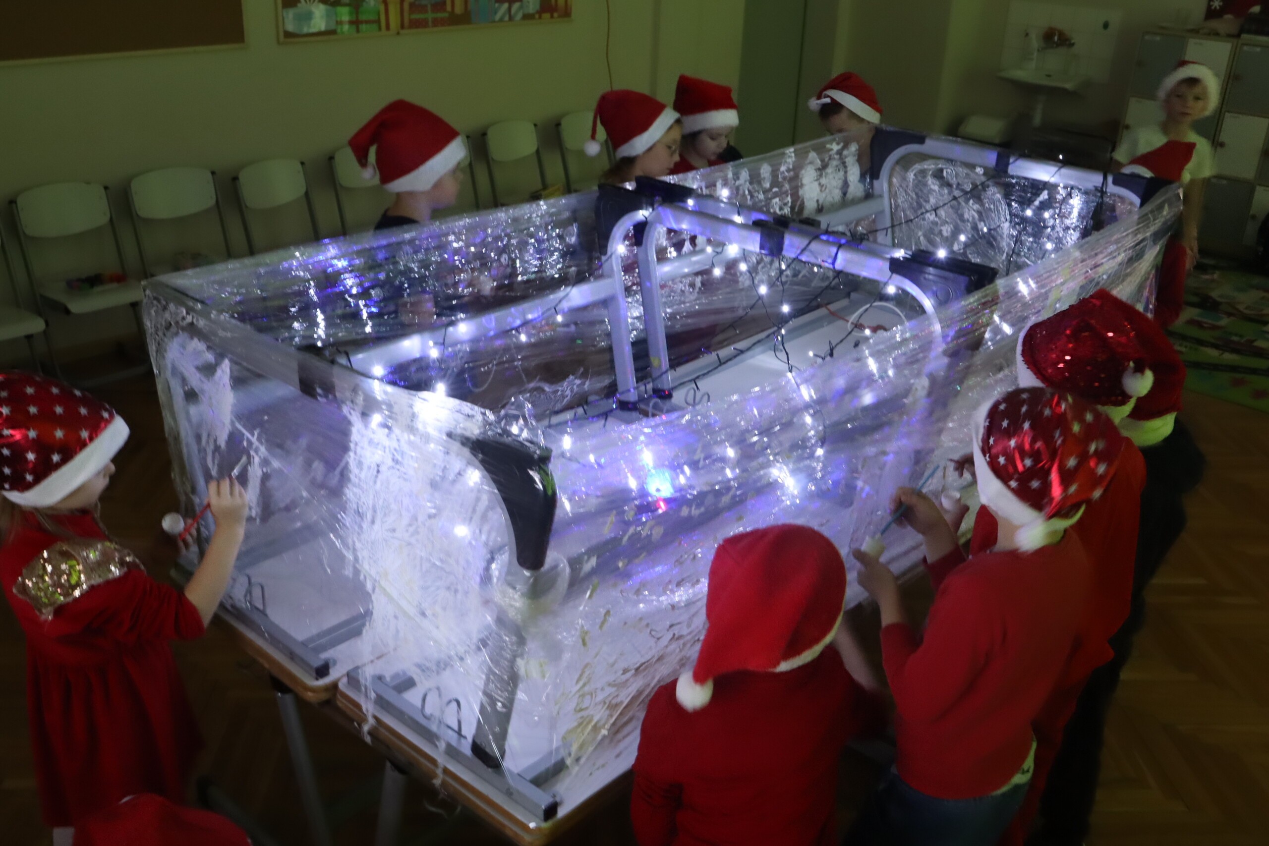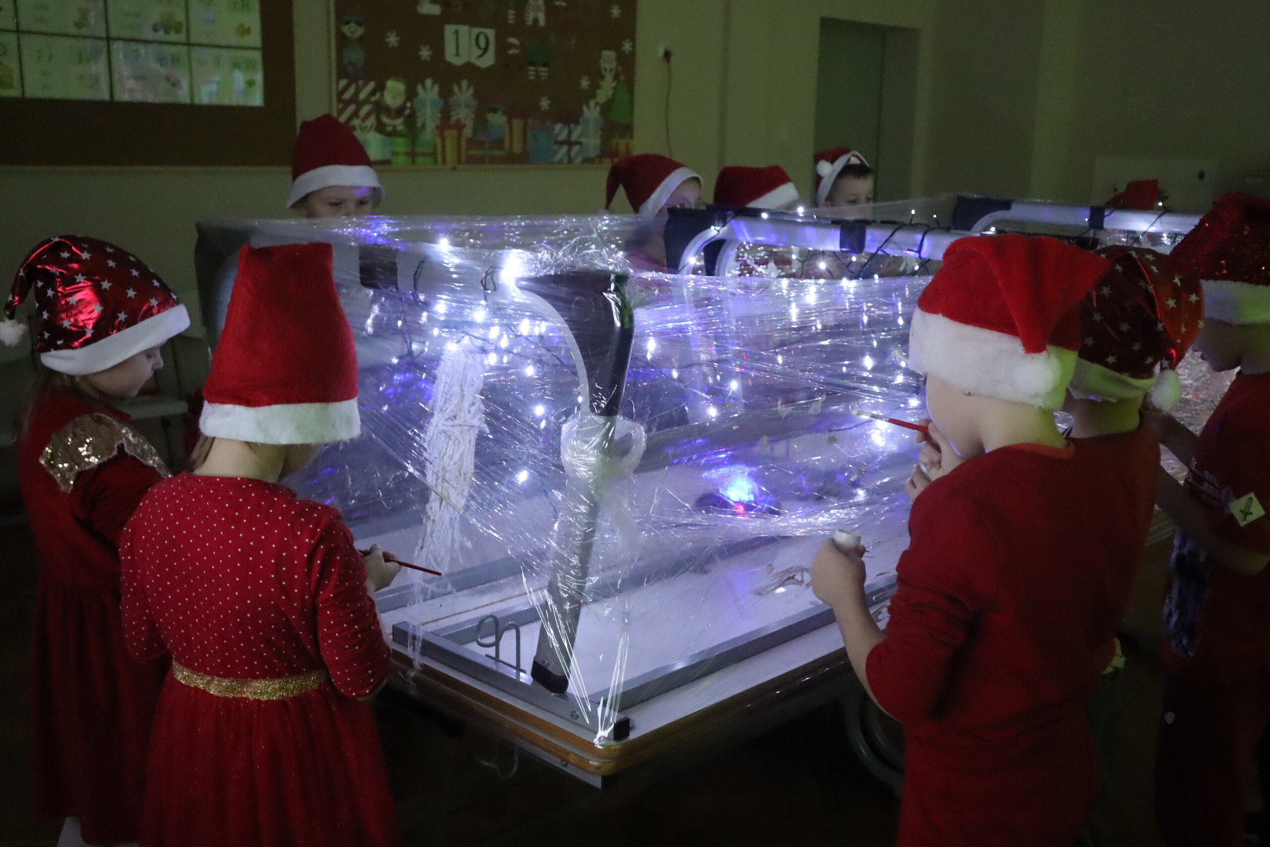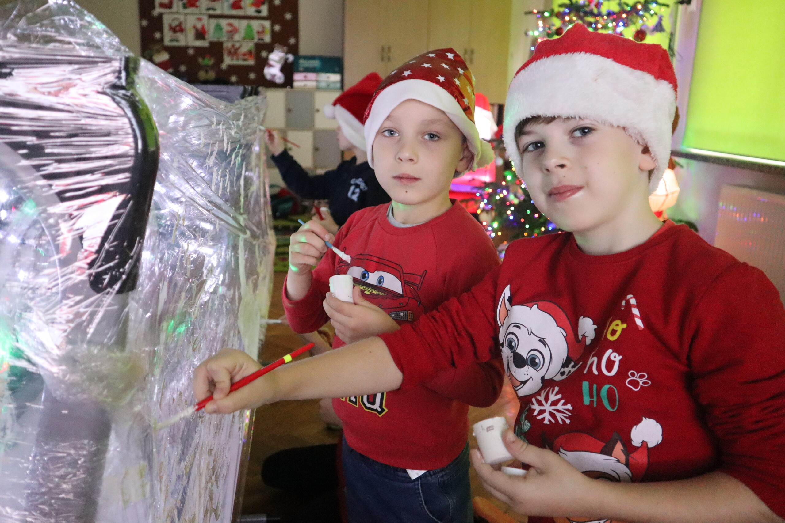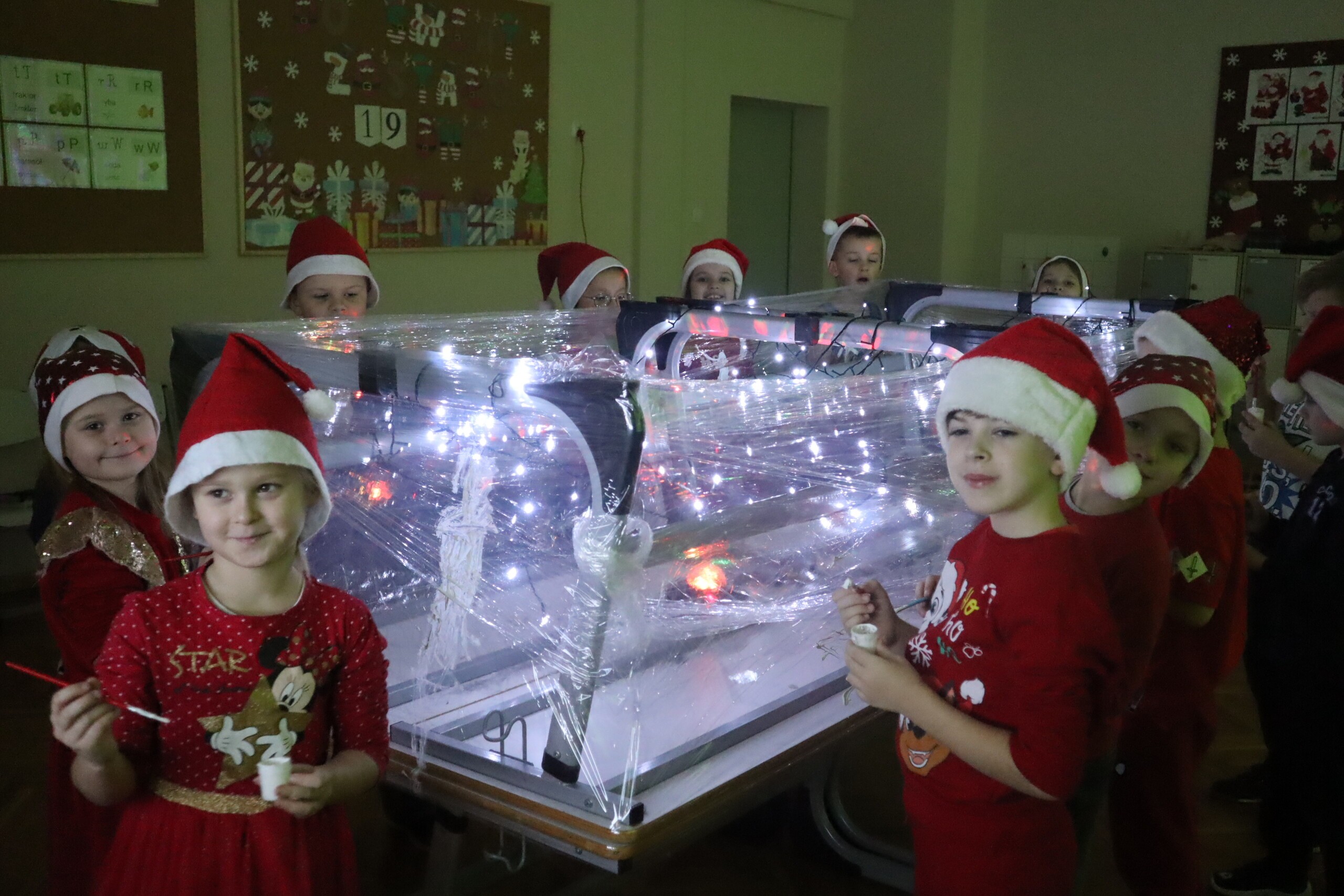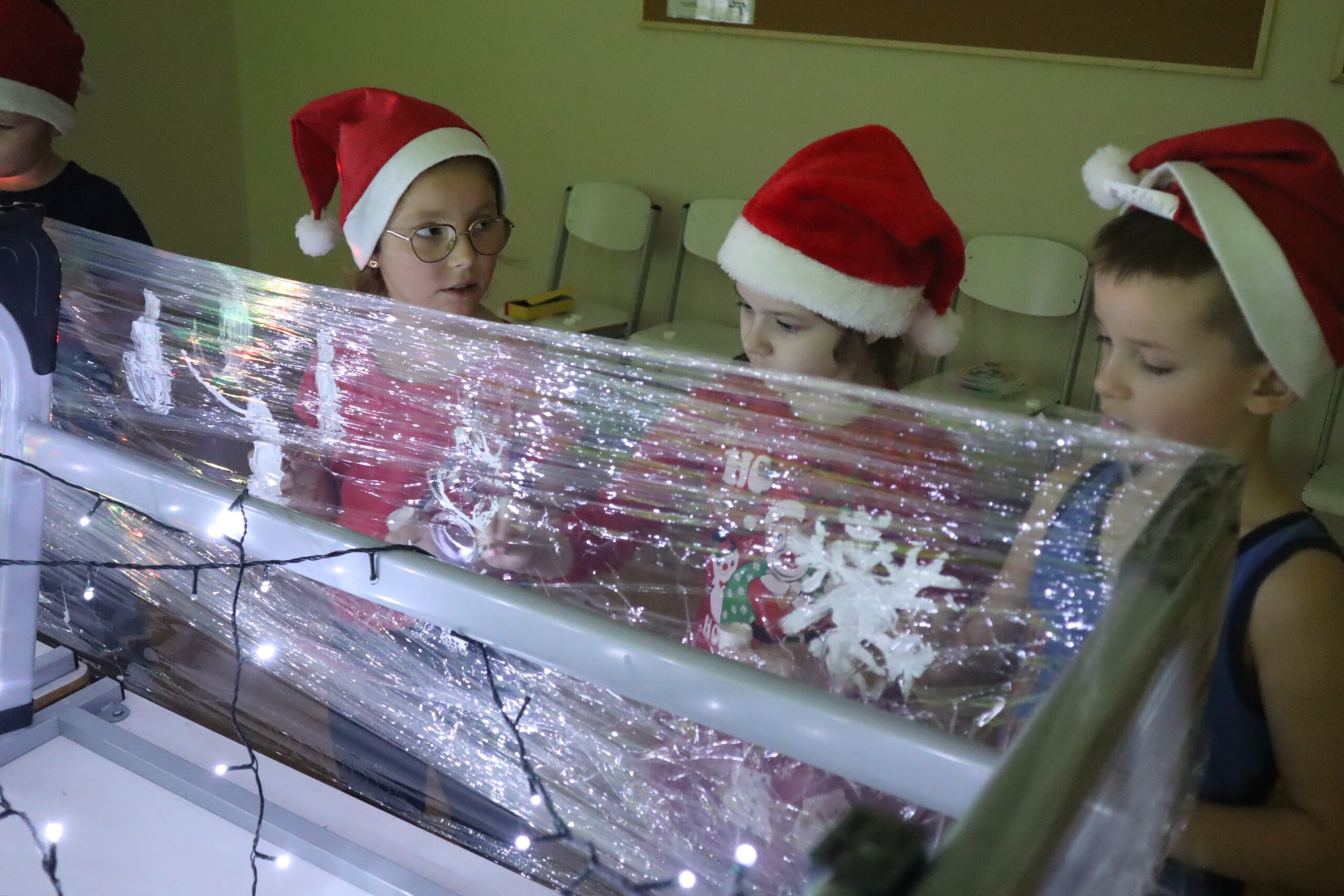 6 grudnia 2023r. to data, którą zna każde dziecko: mikołajki. Tego dnia świąteczny nastrój zagościł wśród pierwszaków i jak co roku nie zabrakło radości ze znalezionych pod choinką prezentów. Wszyscy pojawili się w czerwonych czapkach oddając się wspaniałej zabawie plastyczno - sensorycznej, czyli malowaniu na podświetlonej folii stretch. Magiczna zabawa, w której dzieci uczestniczyły z wielką uciechą, przekształciła się w wielozmysłowe pole doświadczalne oraz była okazją do artystycznych uniesień. Uczniowie niezwykle twórczo oddawali się natchnieniu, co zaowocowało pięknym dziełem artystycznym. Dodatkowo muzyka świąteczna wzmocniła odczucia atmosfery Świąt Bożego Narodzenia.