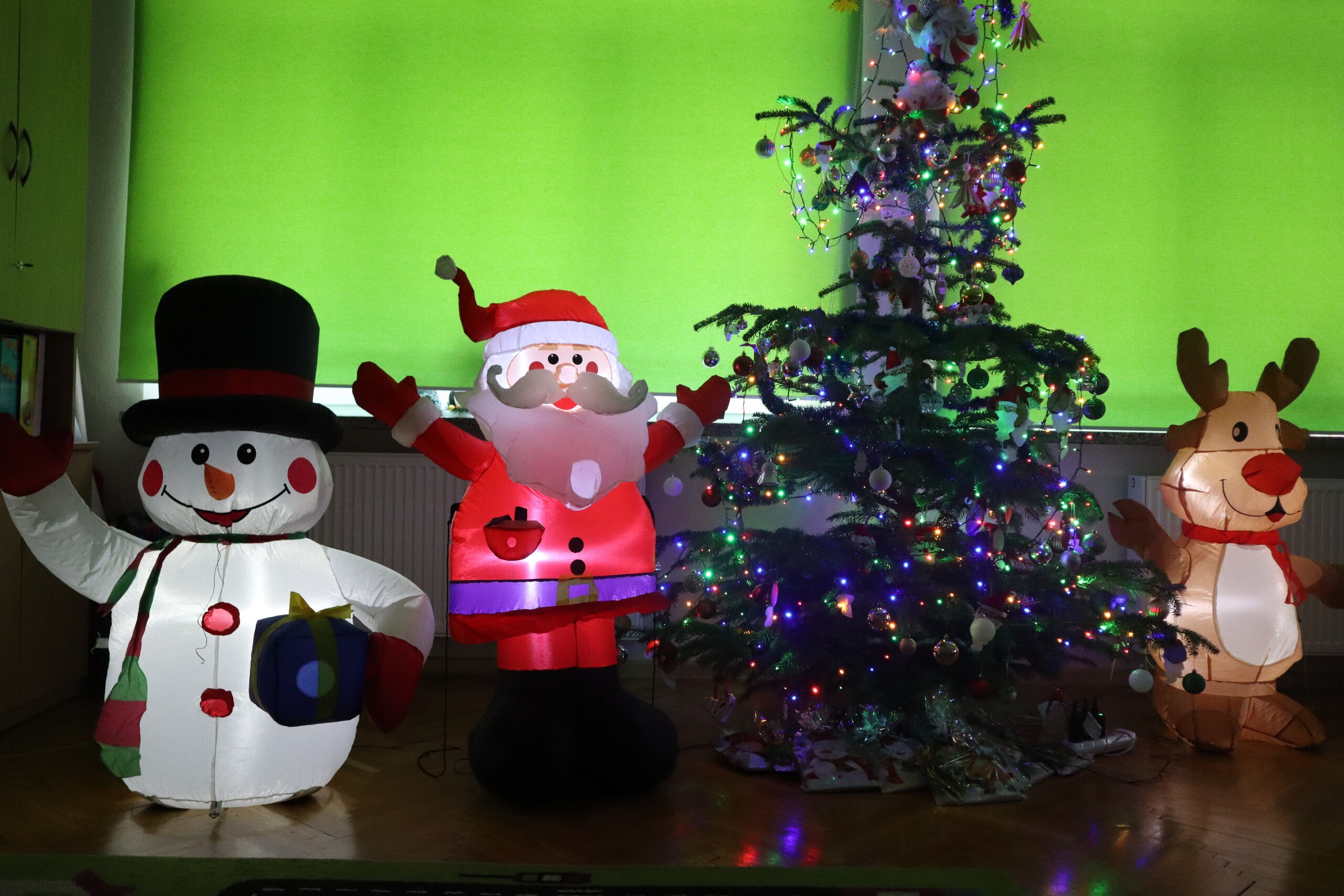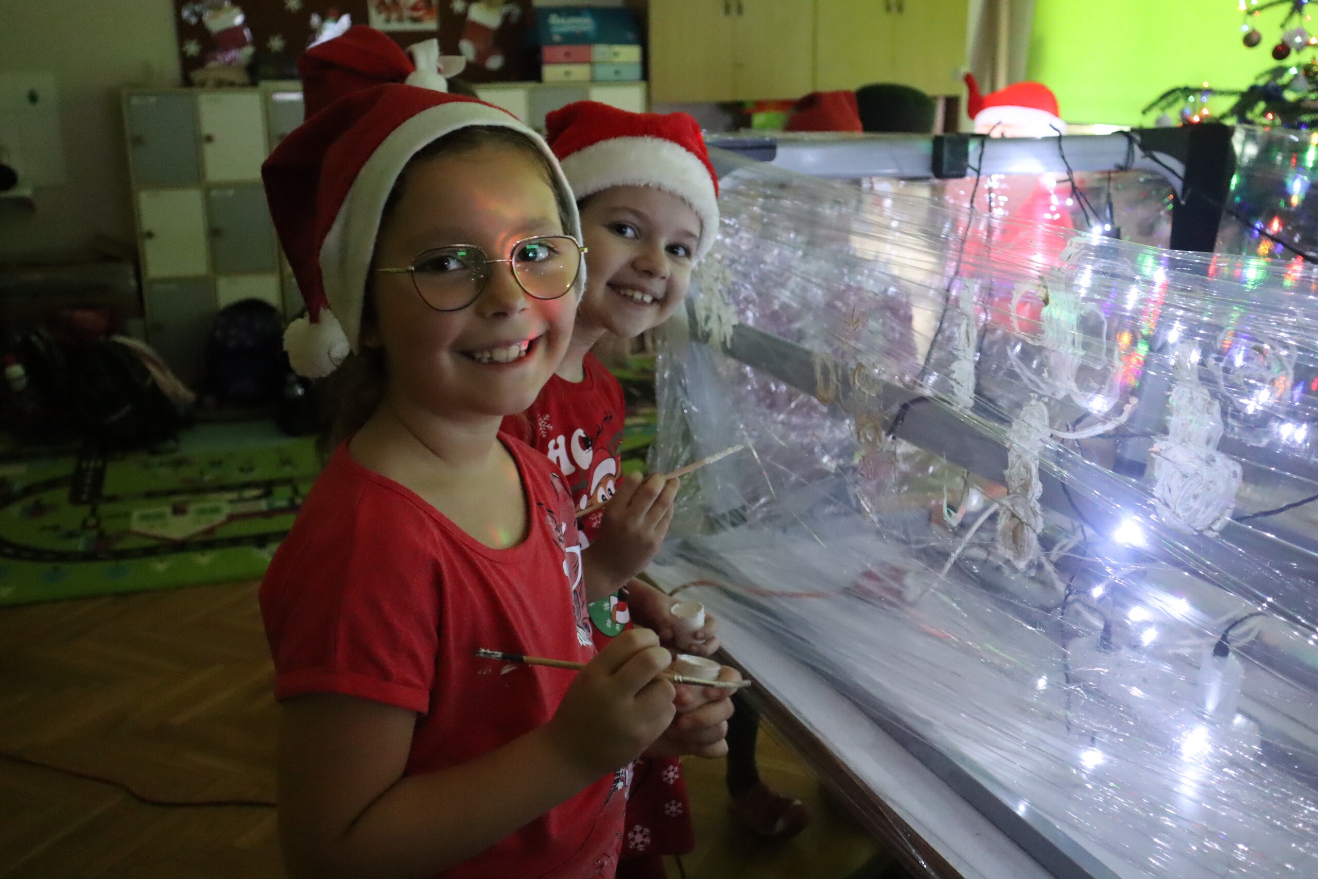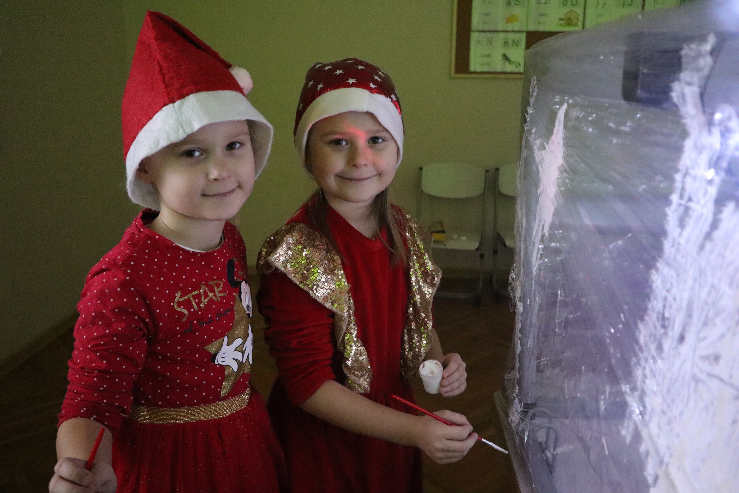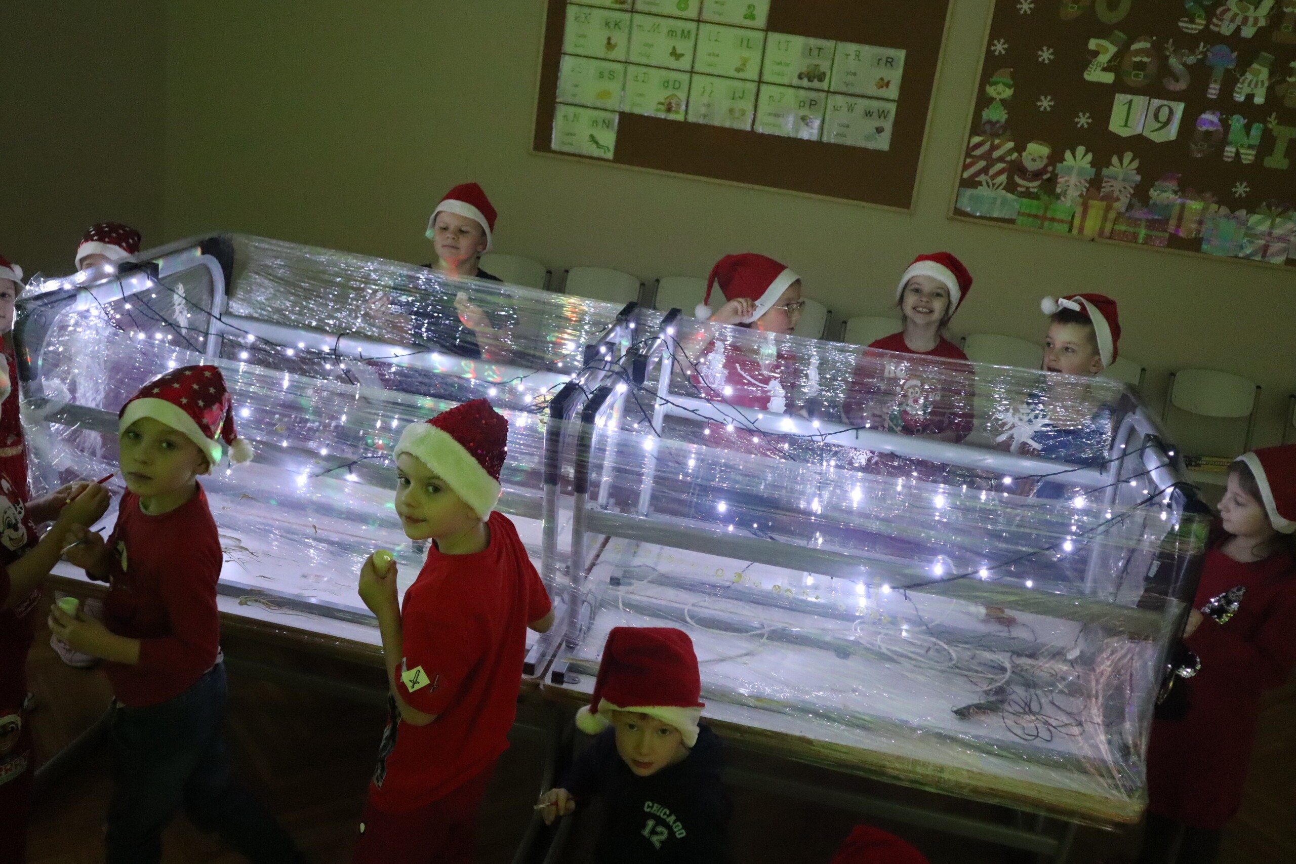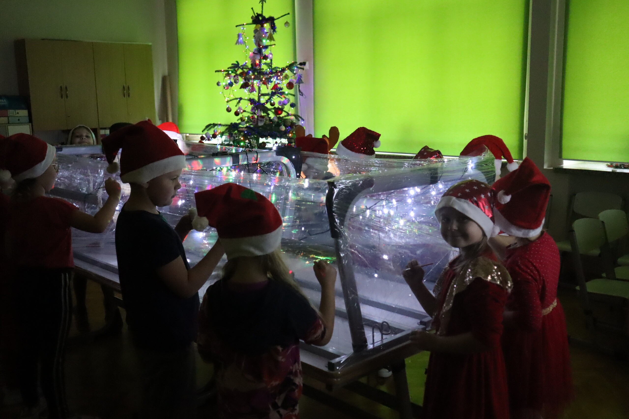 6 grudnia 2023r. to data, którą zna każde dziecko: mikołajki. Tego dnia świąteczny nastrój zagościł wśród pierwszaków i jak co roku nie zabrakło radości ze znalezionych pod choinką prezentów. Wszyscy pojawili się w czerwonych czapkach oddając się wspaniałej zabawie plastyczno - sensorycznej, czyli malowaniu na podświetlonej folii stretch. Magiczna zabawa, w której dzieci uczestniczyły z wielką uciechą, przekształciła się w wielozmysłowe pole doświadczalne oraz była okazją do artystycznych uniesień. Uczniowie niezwykle twórczo oddawali się natchnieniu, co zaowocowało pięknym dziełem artystycznym. Dodatkowo muzyka świąteczna wzmocniła odczucia atmosfery Świąt Bożego Narodzenia.