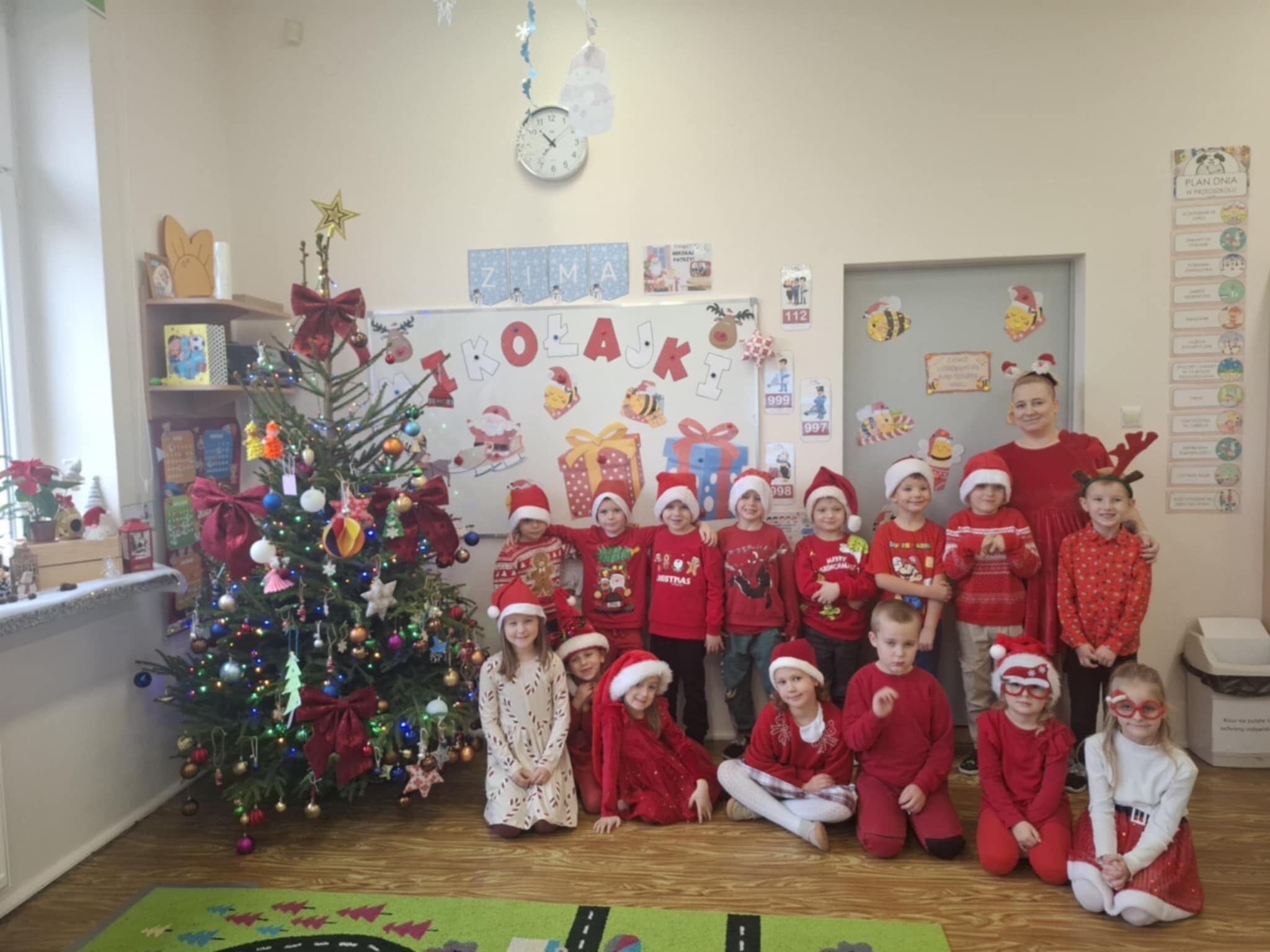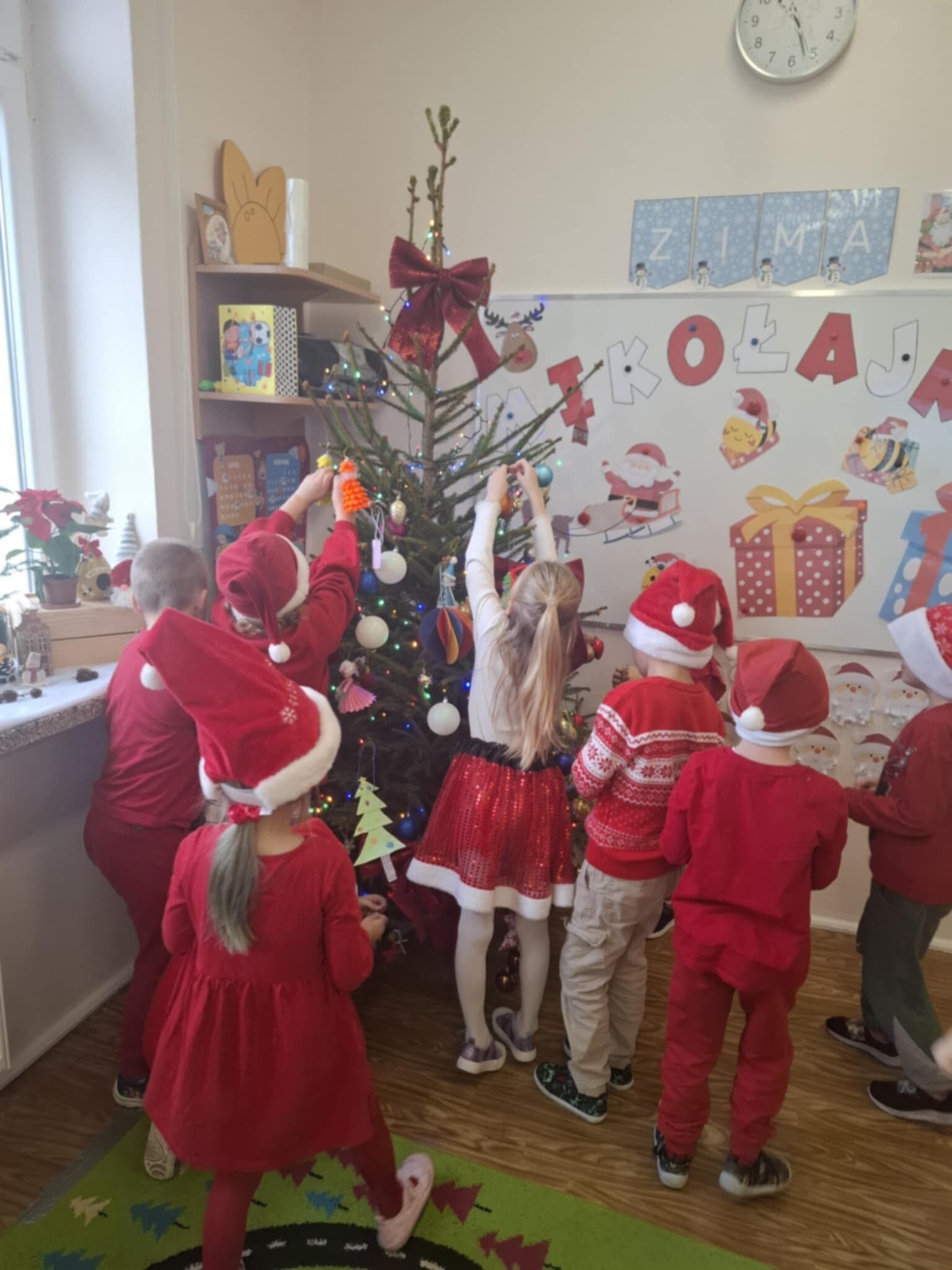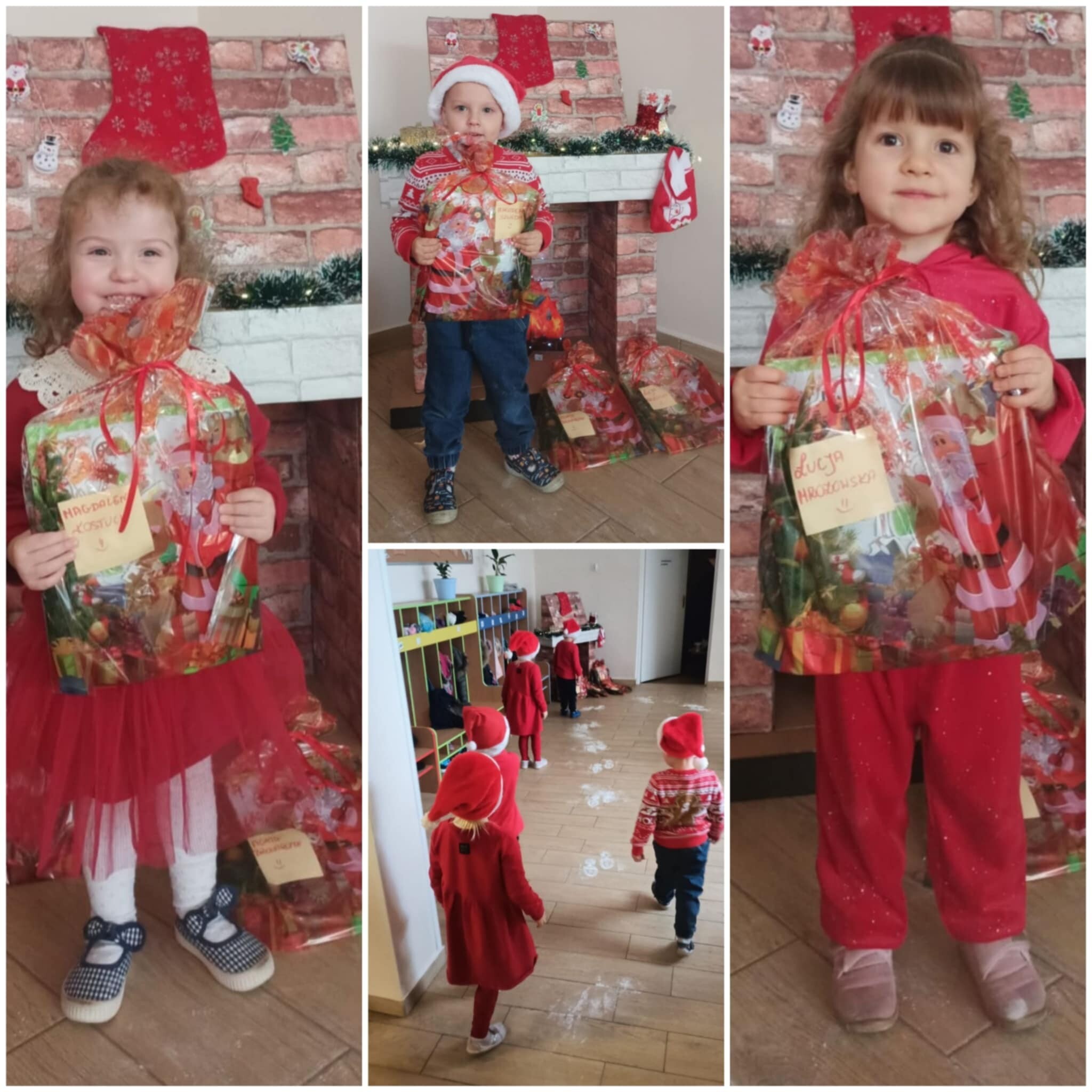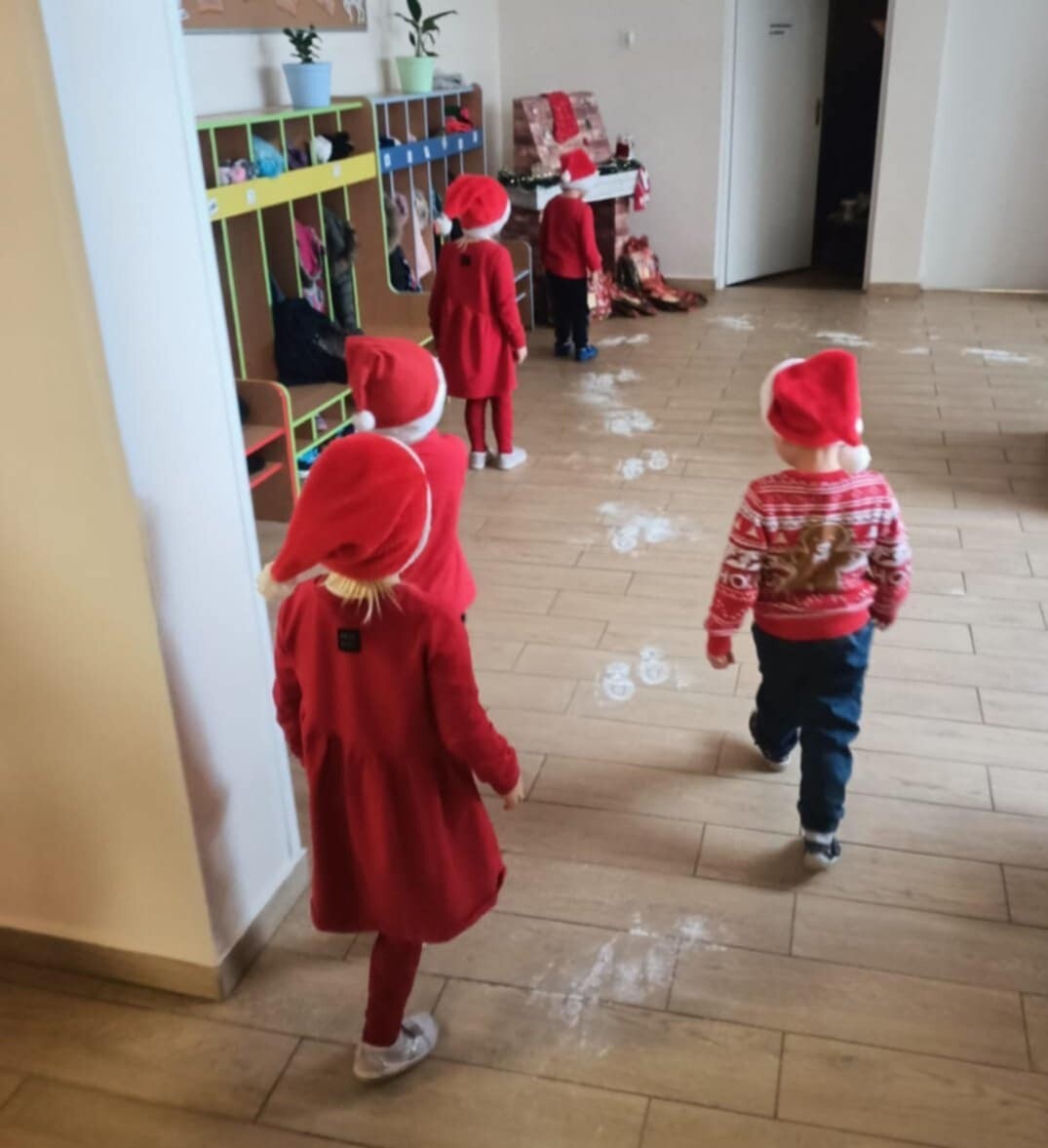W naszym przedszkolu dzieci od samego rana ciężko pracowały, bo ubrały choinkę w sali, zrobiły pracę plastyczną i uczyły się piosenki o Mikołaju, by zaśpiewać ją temu niezwykłemu gościowi. Mikołaj nie zawiódł dzieci, zostawił nie tylko ślady stóp, ale też list i co najważniejsze prezenty pod kominkiem. Ma teraz wiele pracy, a chce uszczęśliwić miliony dzieci na świecie, dlatego podrzucił tylko podarunki i ruszył w dalszą misję. Ucieszone prezentami dzieci, dowiedziały się z listu, że 19 grudnia spotkają go osobiście, a on według zwyczaju i ich zasług obdaruje ich prezentami, o które prosiły w liście.