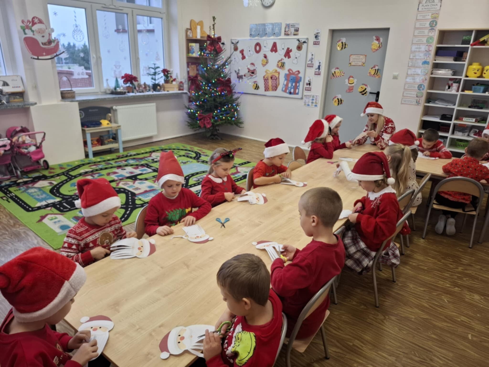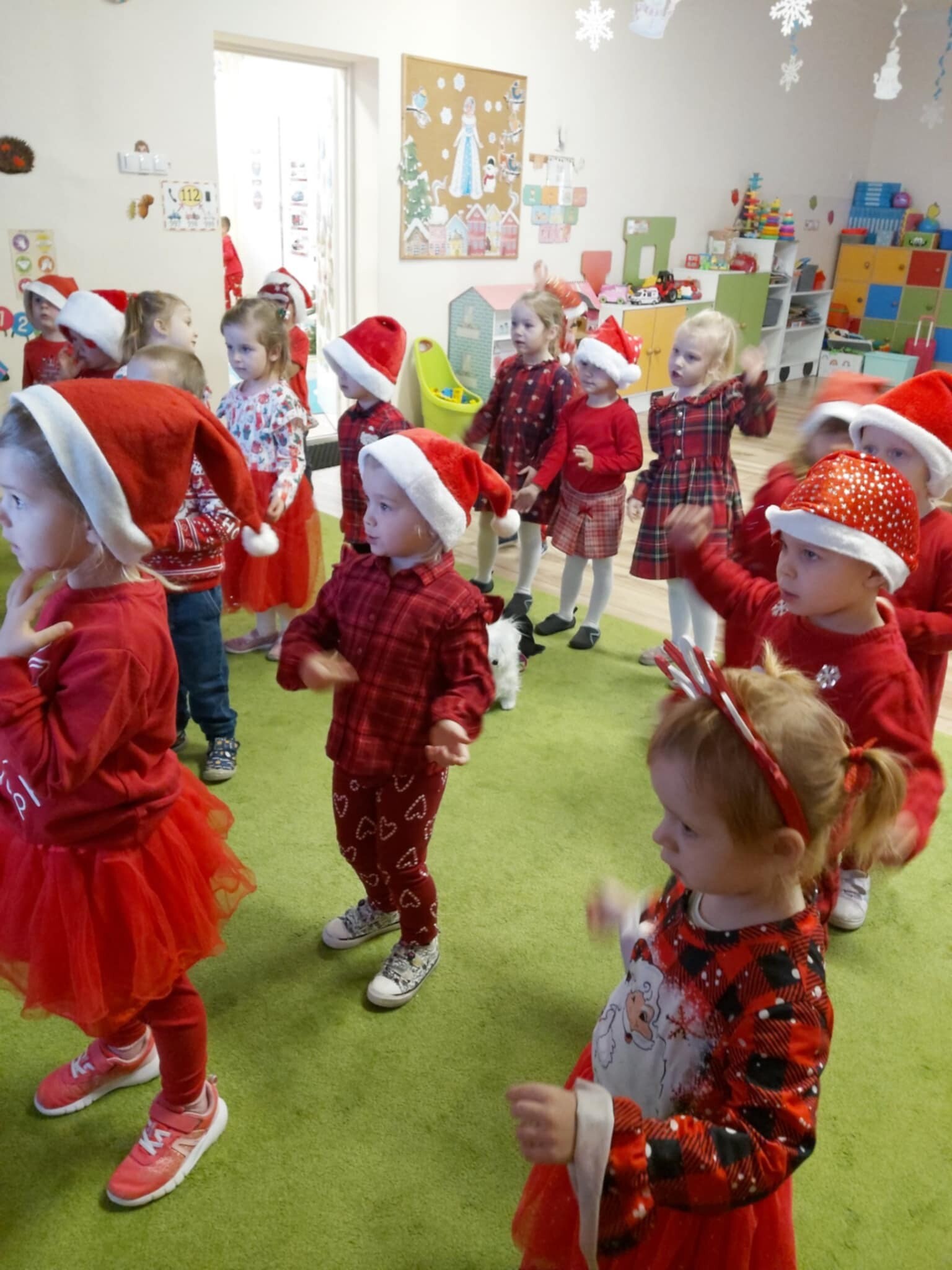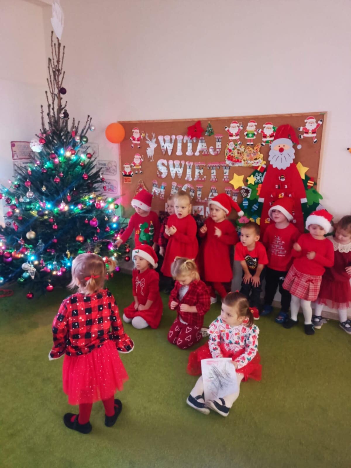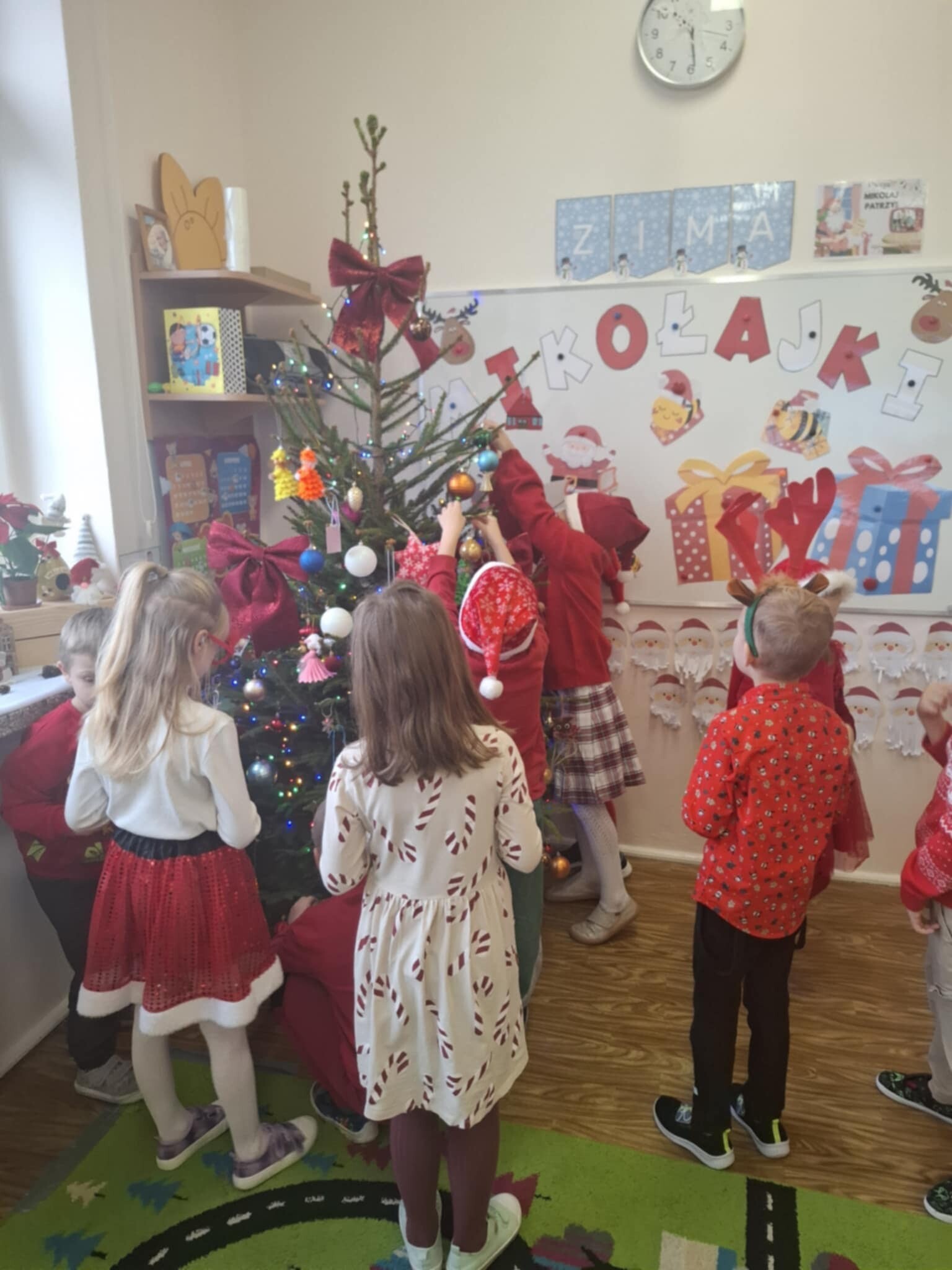 W naszym przedszkolu dzieci od samego rana ciężko pracowały, bo ubrały choinkę w sali, zrobiły pracę plastyczną i uczyły się piosenki o Mikołaju, by zaśpiewać ją temu niezwykłemu gościowi. Mikołaj nie zawiódł dzieci, zostawił nie tylko ślady stóp, ale też list i co najważniejsze prezenty pod kominkiem. Ma teraz wiele pracy, a chce uszczęśliwić miliony dzieci na świecie, dlatego podrzucił tylko podarunki i ruszył w dalszą misję. Ucieszone prezentami dzieci, dowiedziały się z listu, że 19 grudnia spotkają go osobiście, a on według zwyczaju i ich zasług obdaruje ich prezentami, o które prosiły w liście.