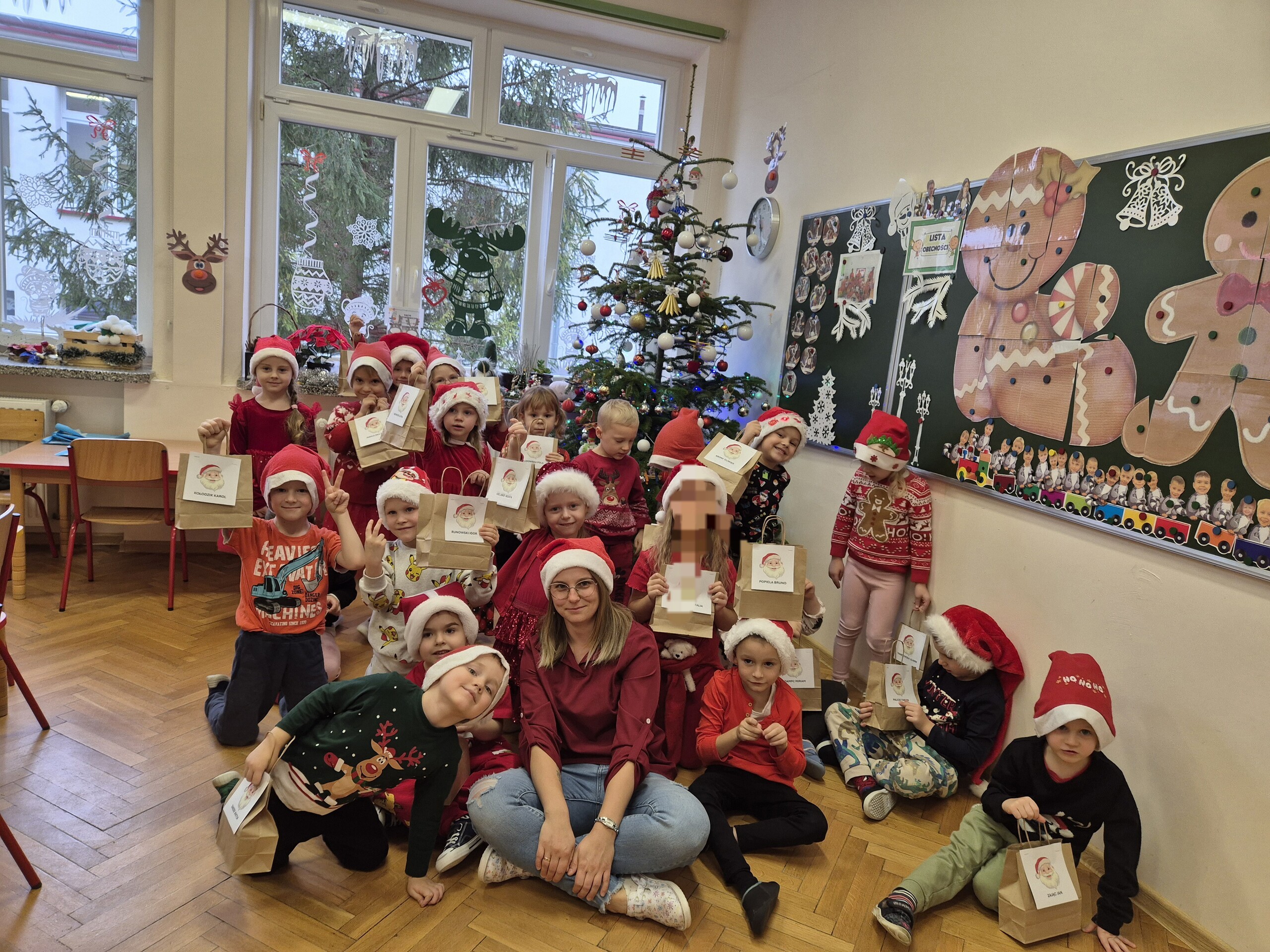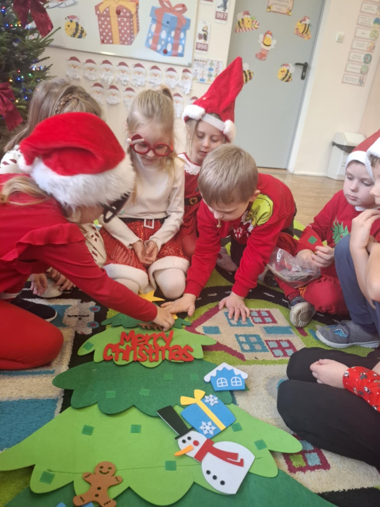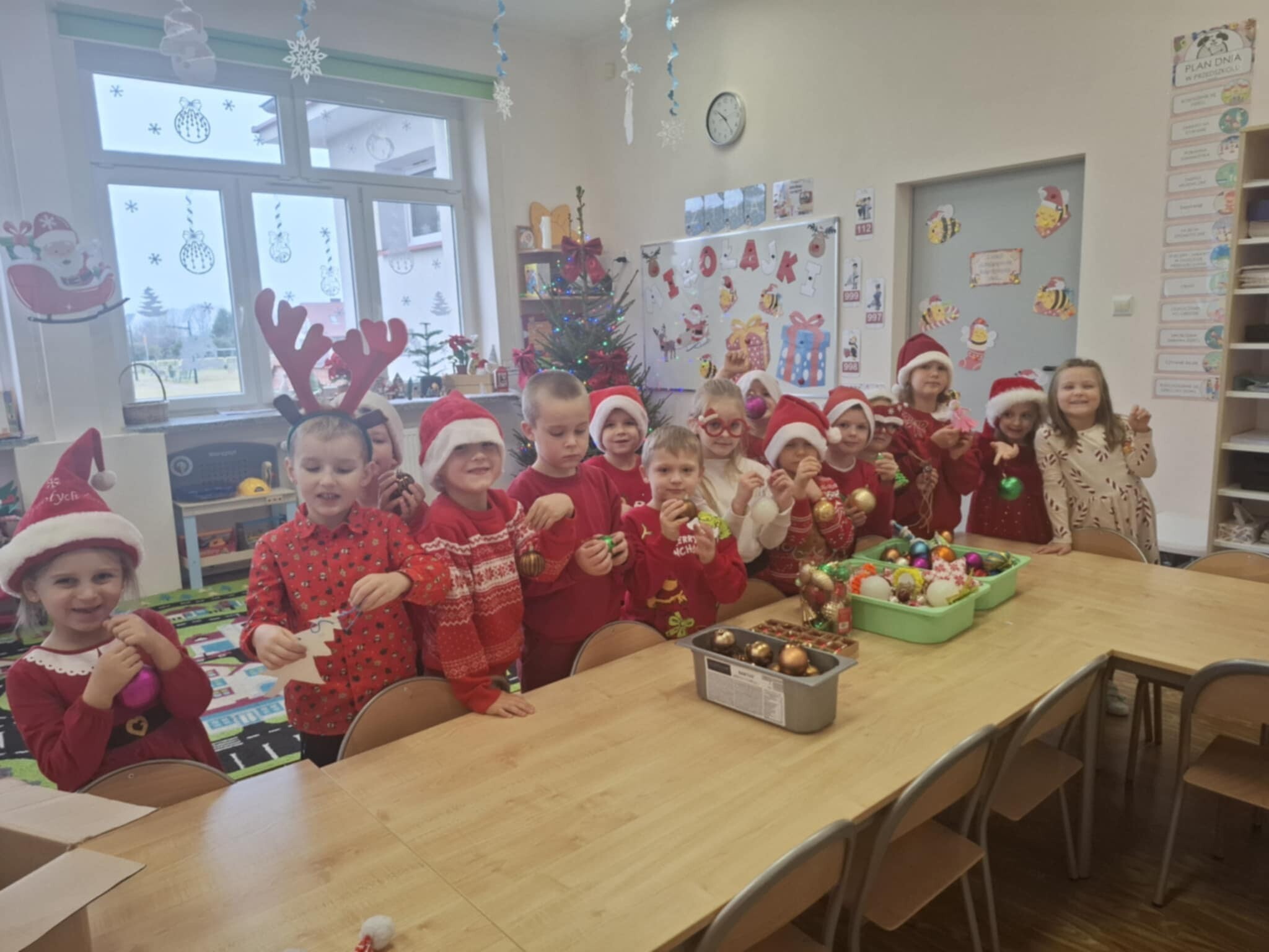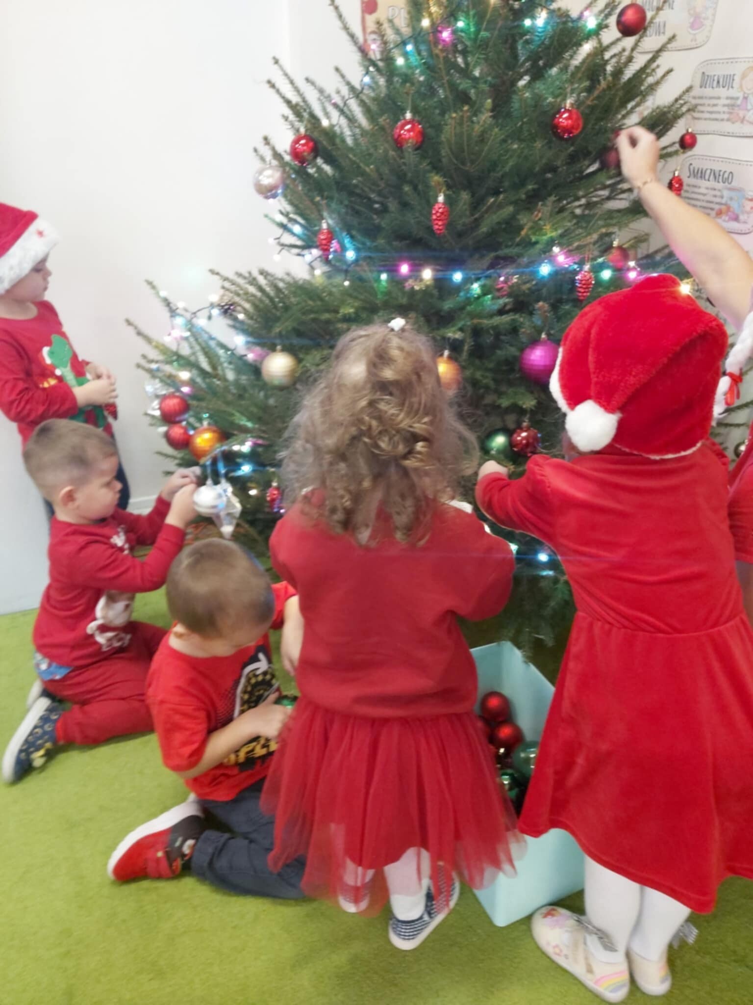 W naszym przedszkolu dzieci od samego rana ciężko pracowały, bo ubrały choinkę w sali, zrobiły pracę plastyczną i uczyły się piosenki o Mikołaju, by zaśpiewać ją temu niezwykłemu gościowi. Mikołaj nie zawiódł dzieci, zostawił nie tylko ślady stóp, ale też list i co najważniejsze prezenty pod kominkiem. Ma teraz wiele pracy, a chce uszczęśliwić miliony dzieci na świecie, dlatego podrzucił tylko podarunki i ruszył w dalszą misję. Ucieszone prezentami dzieci, dowiedziały się z listu, że 19 grudnia spotkają go osobiście, a on według zwyczaju i ich zasług obdaruje ich prezentami, o które prosiły w liście.