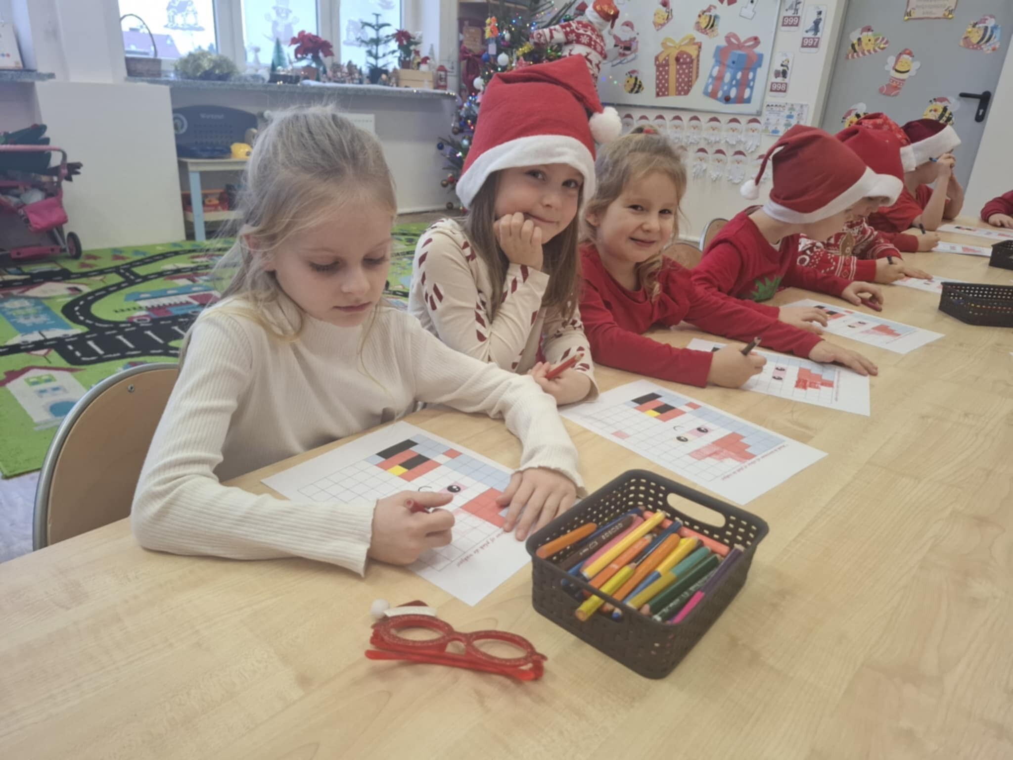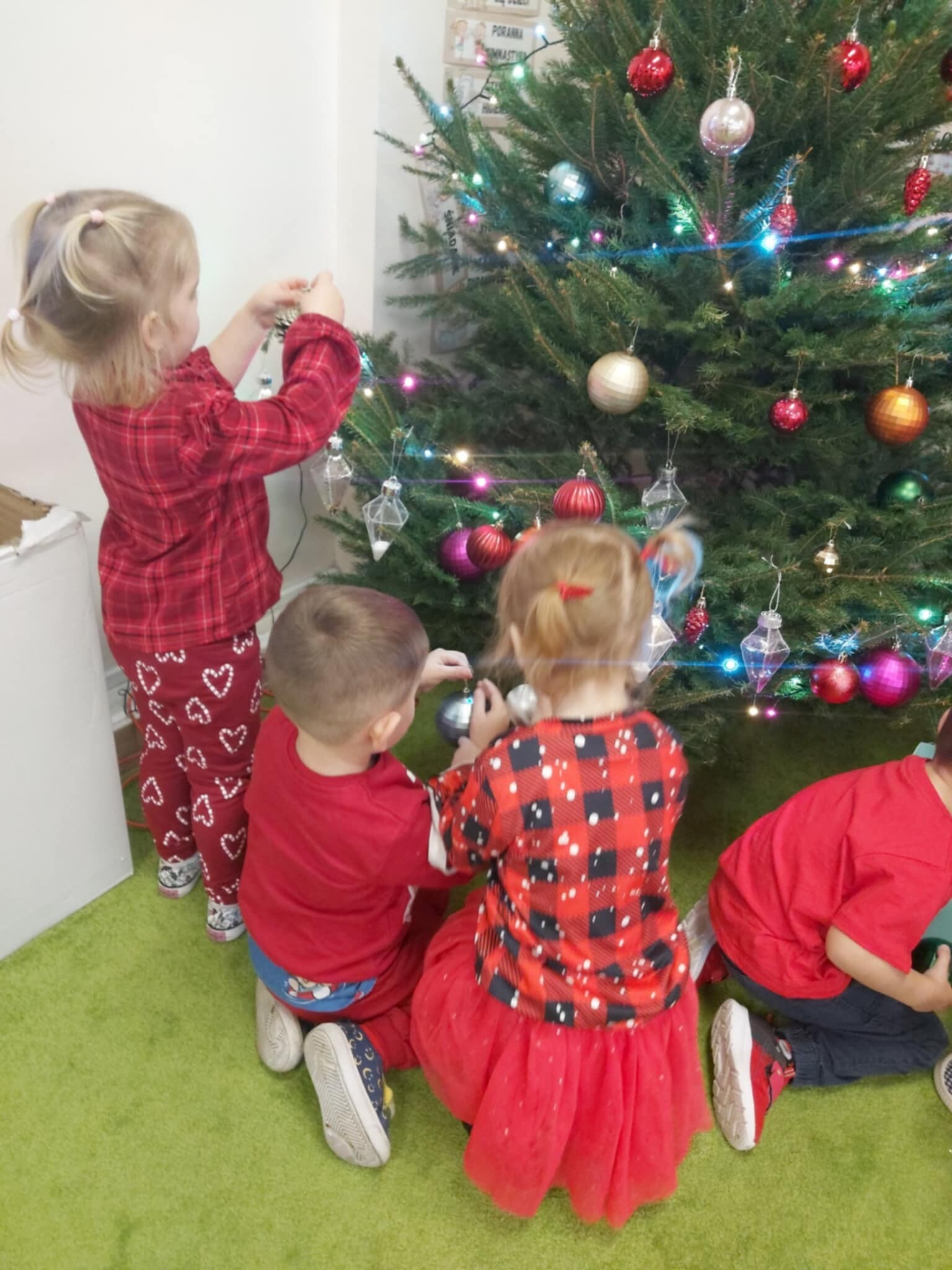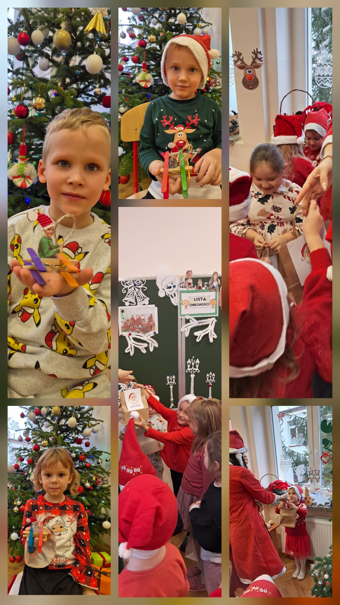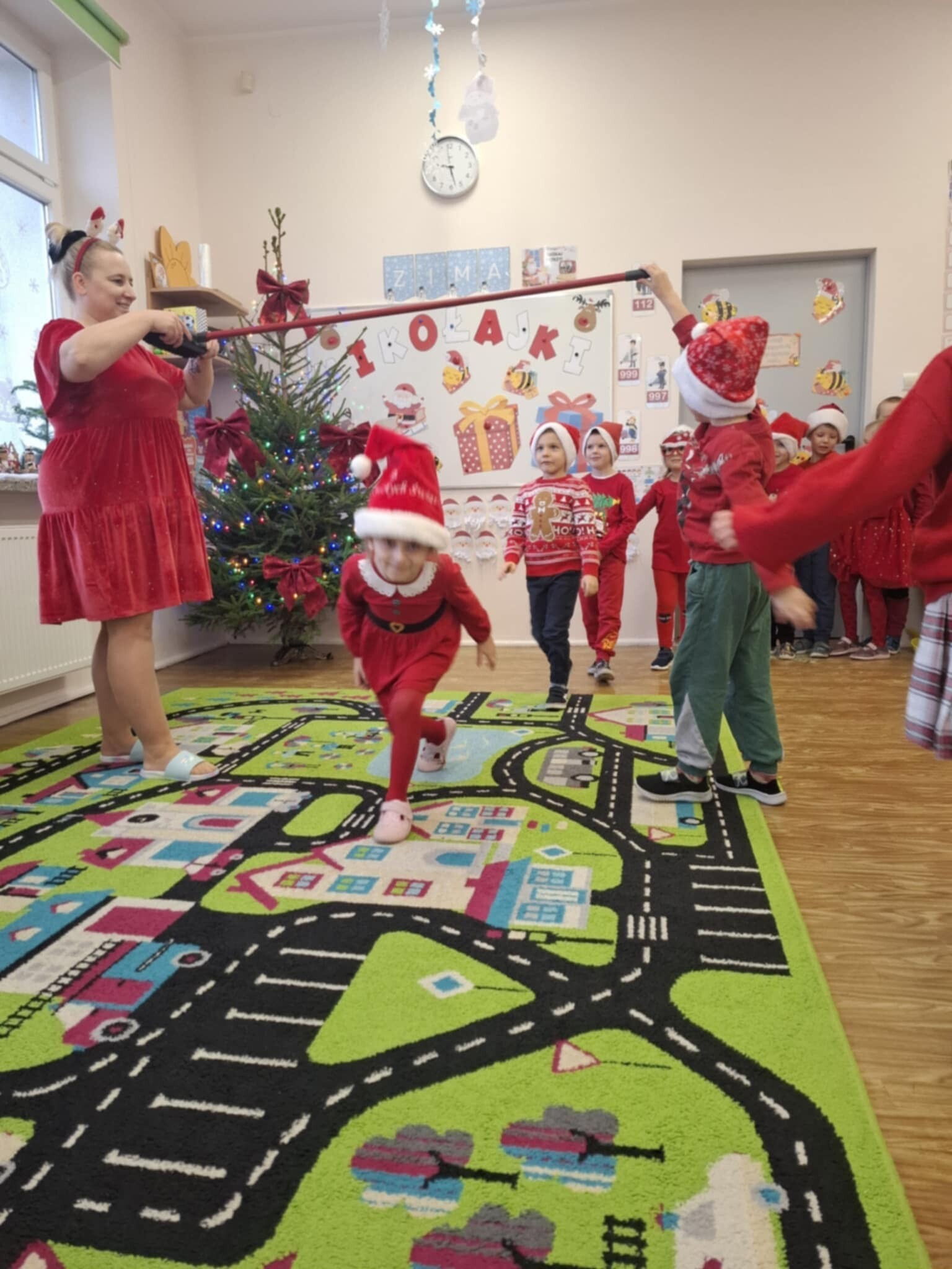 W naszym przedszkolu dzieci od samego rana ciężko pracowały, bo ubrały choinkę w sali, zrobiły pracę plastyczną i uczyły się piosenki o Mikołaju, by zaśpiewać ją temu niezwykłemu gościowi. Mikołaj nie zawiódł dzieci, zostawił nie tylko ślady stóp, ale też list i co najważniejsze prezenty pod kominkiem. Ma teraz wiele pracy, a chce uszczęśliwić miliony dzieci na świecie, dlatego podrzucił tylko podarunki i ruszył w dalszą misję. Ucieszone prezentami dzieci, dowiedziały się z listu, że 19 grudnia spotkają go osobiście, a on według zwyczaju i ich zasług obdaruje ich prezentami, o które prosiły w liście.
