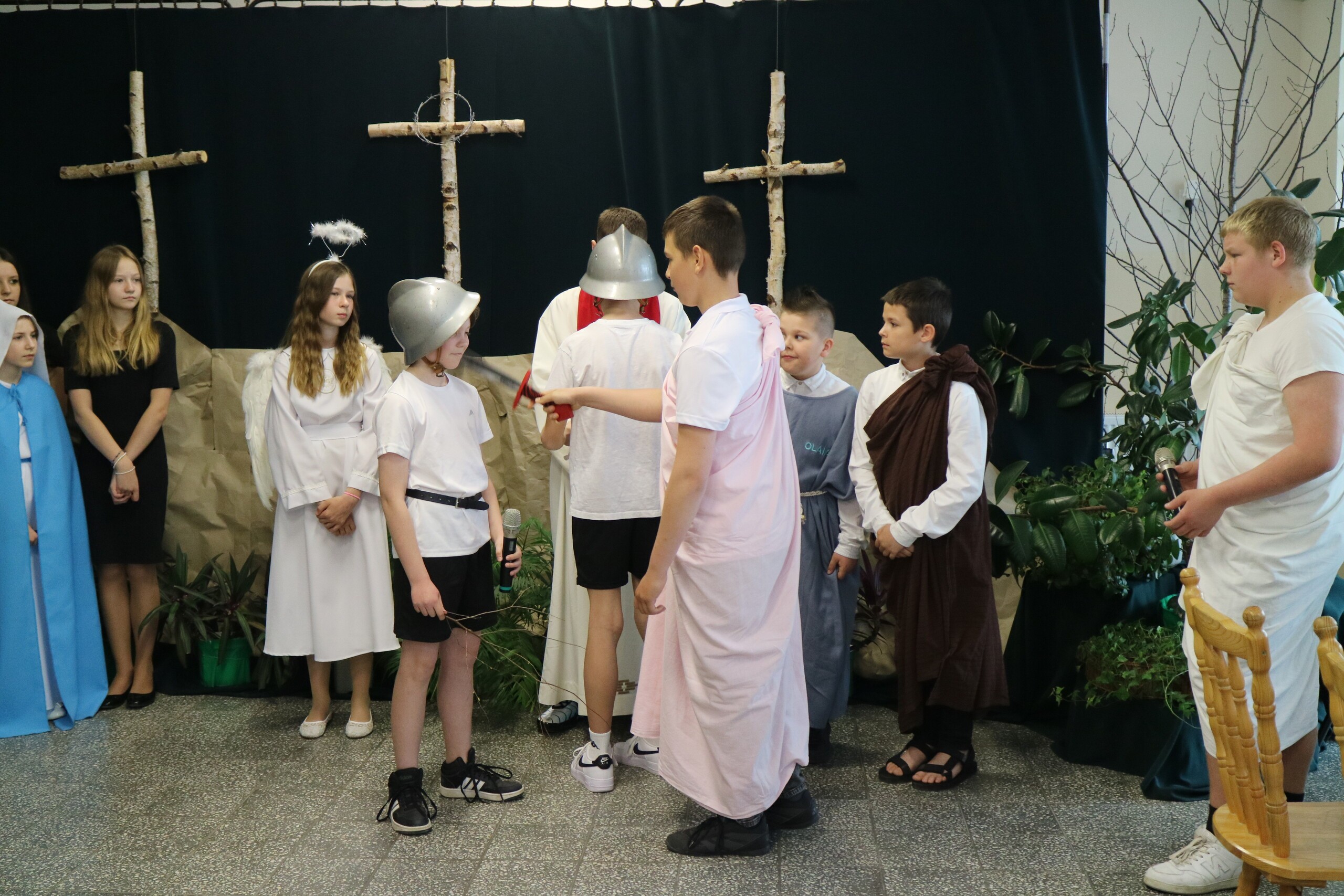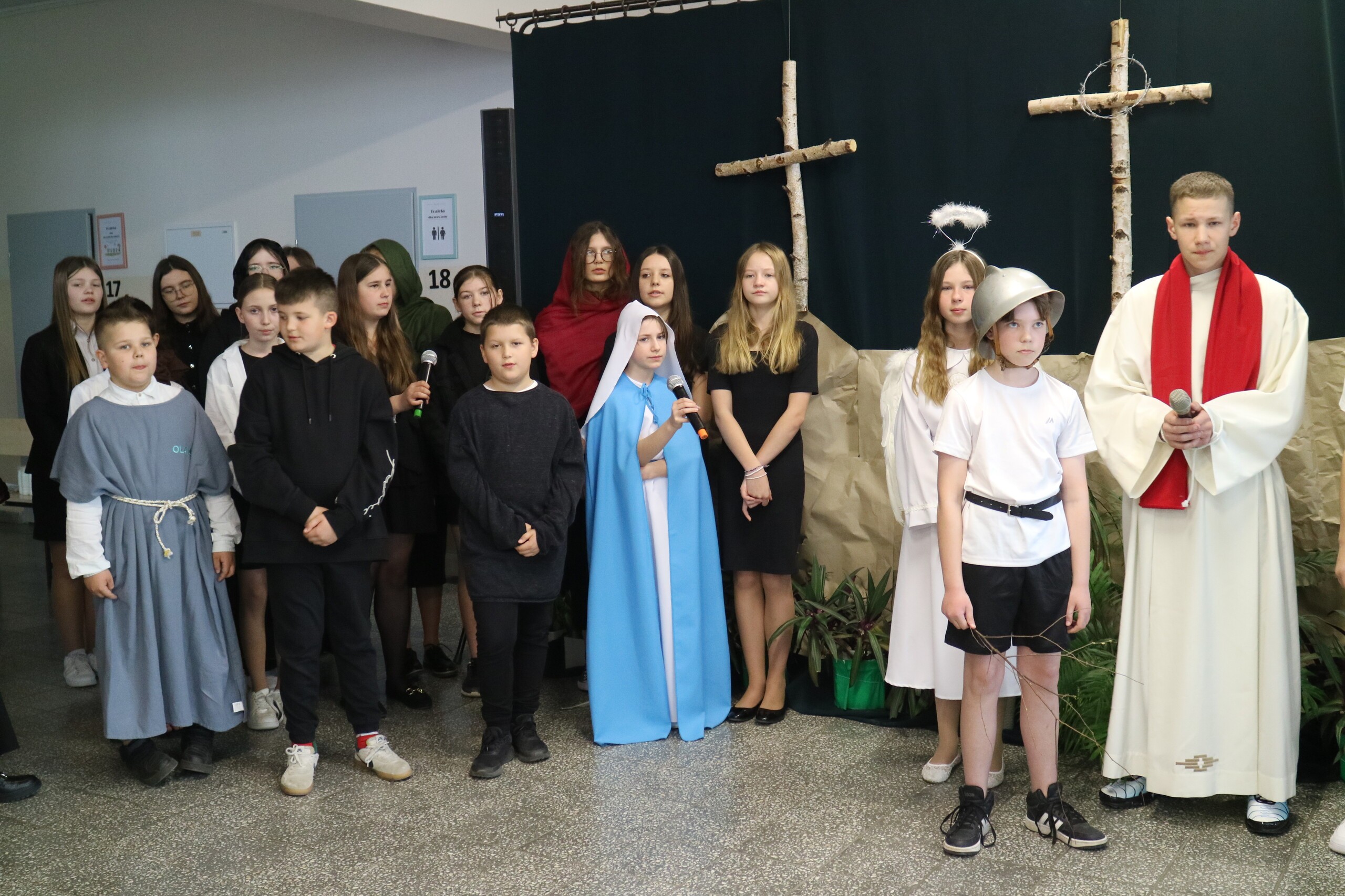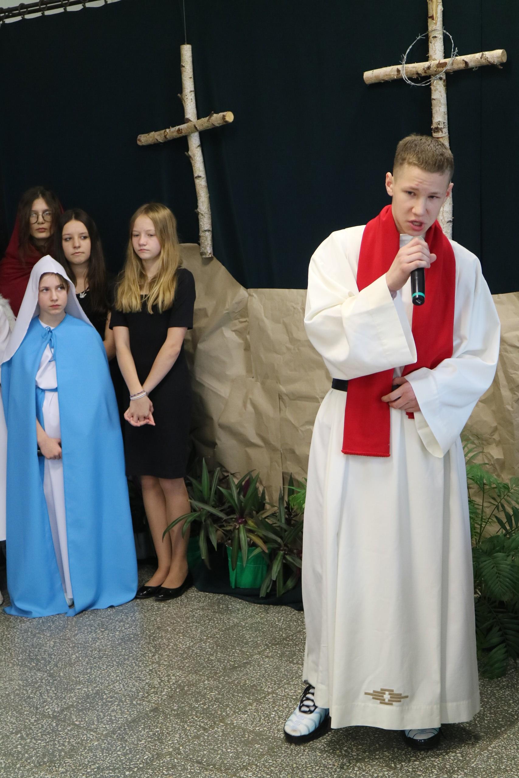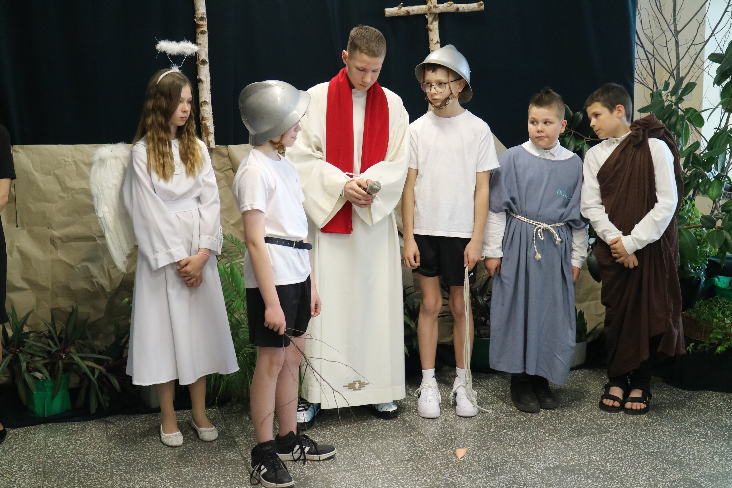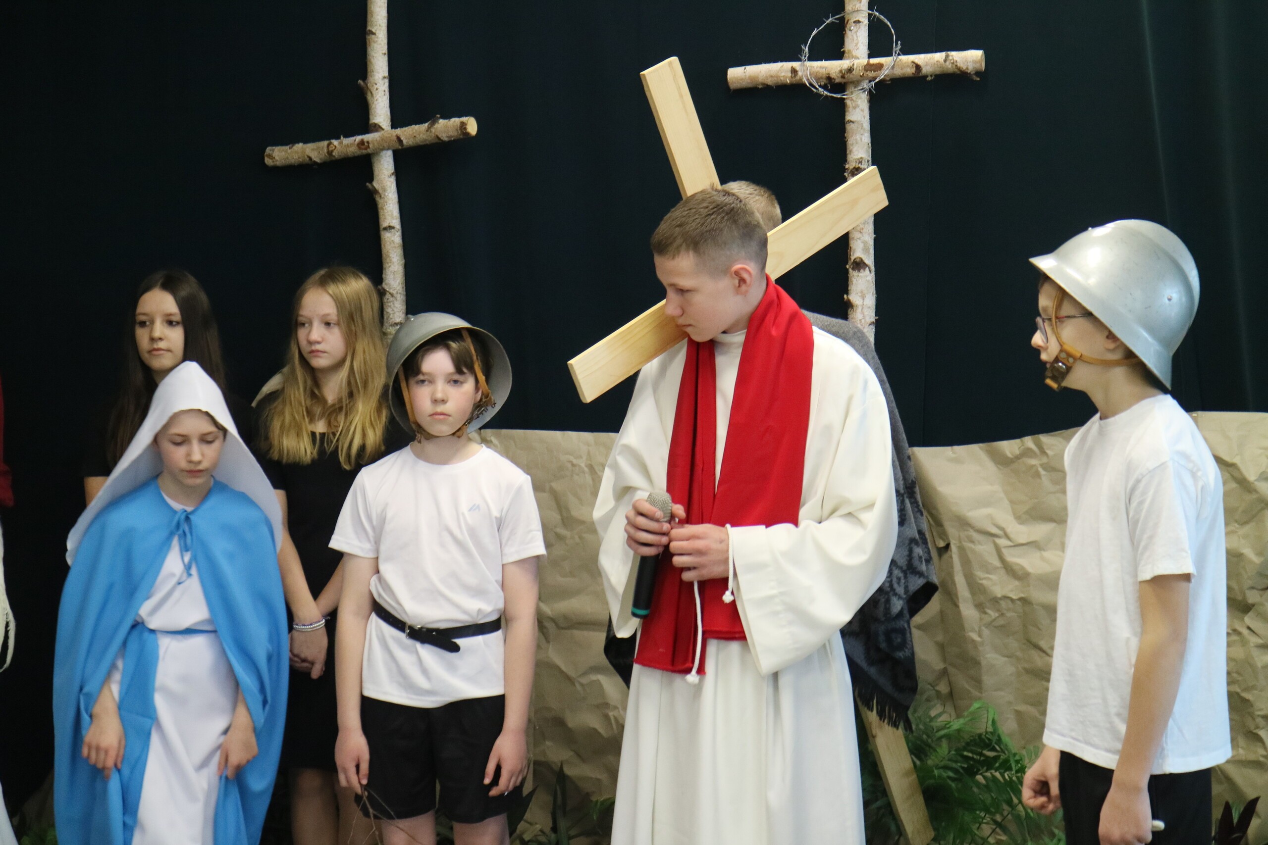 Trwa Wielki Tydzień i przygotowujemy się do obchodów najważniejszych świąt, a są to Święta Wielkanocne. Z tej okazji uczniowie klas IV, VI i VIII przygotowali Misterium Męki Pańskiej. Zaproszeni goście: ksiądz proboszcz Janusz Góral, Przewodnicząca Rady Rodziców pani Justyna Wilga i cała społeczność szkolna mogła zobaczyć przedstawienie przypominające ważne wydarzenia z życia Pana Jezusa. Przeżywamy je co roku, ale zawsze jakby to było po raz pierwszy. Uczniowie doskonale wcielili się w biblijne postaci. Wymowna dekoracja, stroje i odpowiednio dobrane wielkopostne pieśni potęgowały poważny nastrój. Oglądany spektakl spotkał się z uznaniem oglądających i nagrodzony gromkimi brawami. Dyrektor Krzysztof Wojtysiak podziękował uczniom i nauczycielom, którzy przygotowali to ważne wydarzenie oraz złożył życzenia z okazji Świąt Wielkanocnych. Życzenia świąteczne złożył również proboszcz Janusz Góral i Przewodnicząca Rady rodziców Justyna Wilga. W świątecznym nastroju rozeszliśmy się do klas.