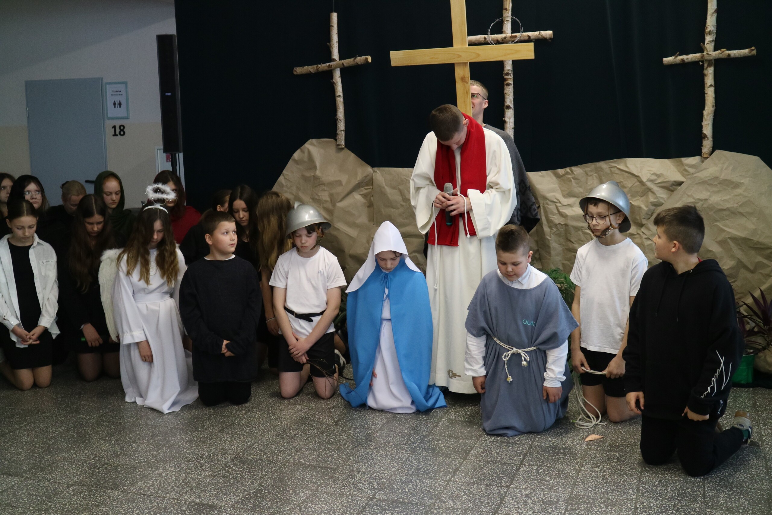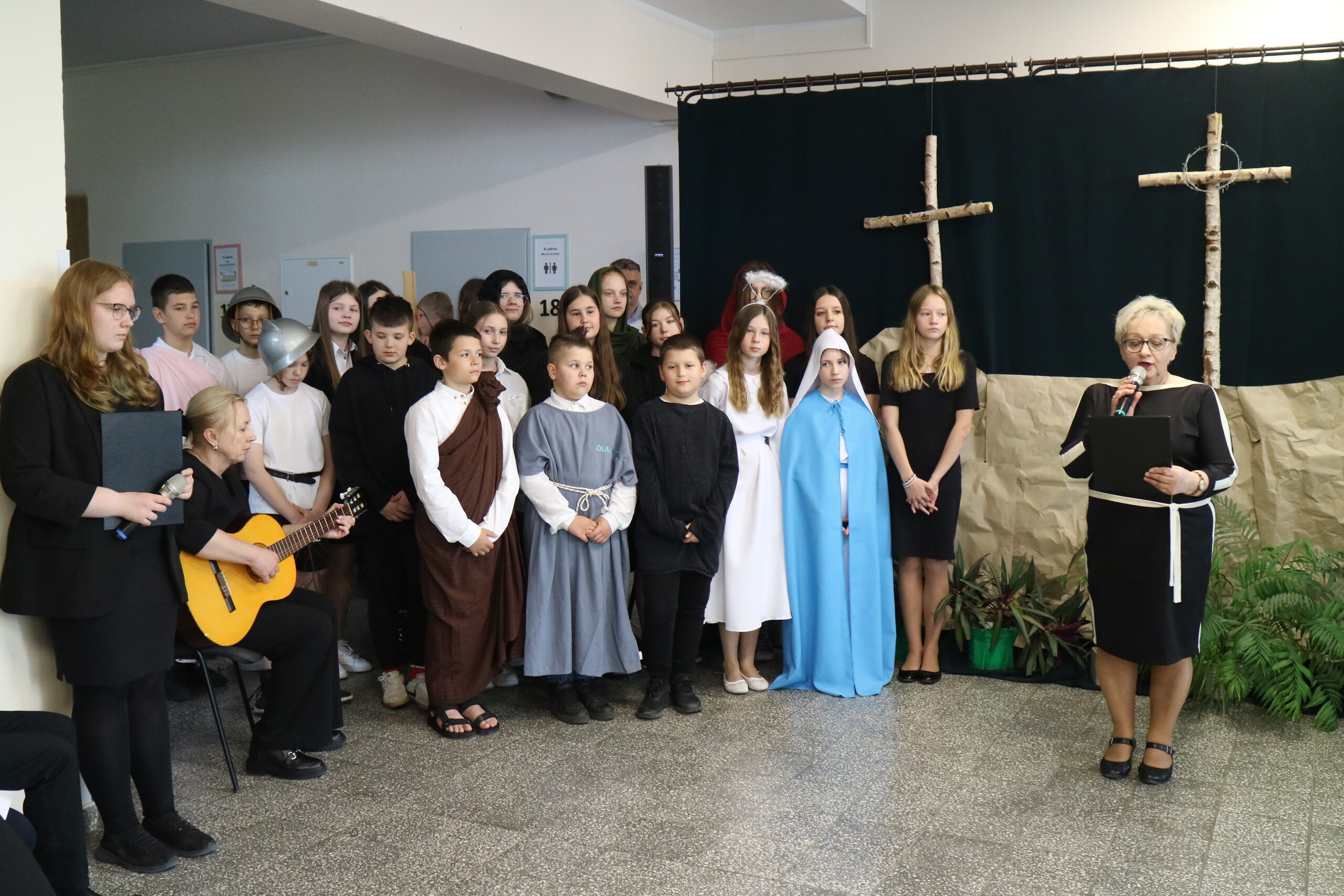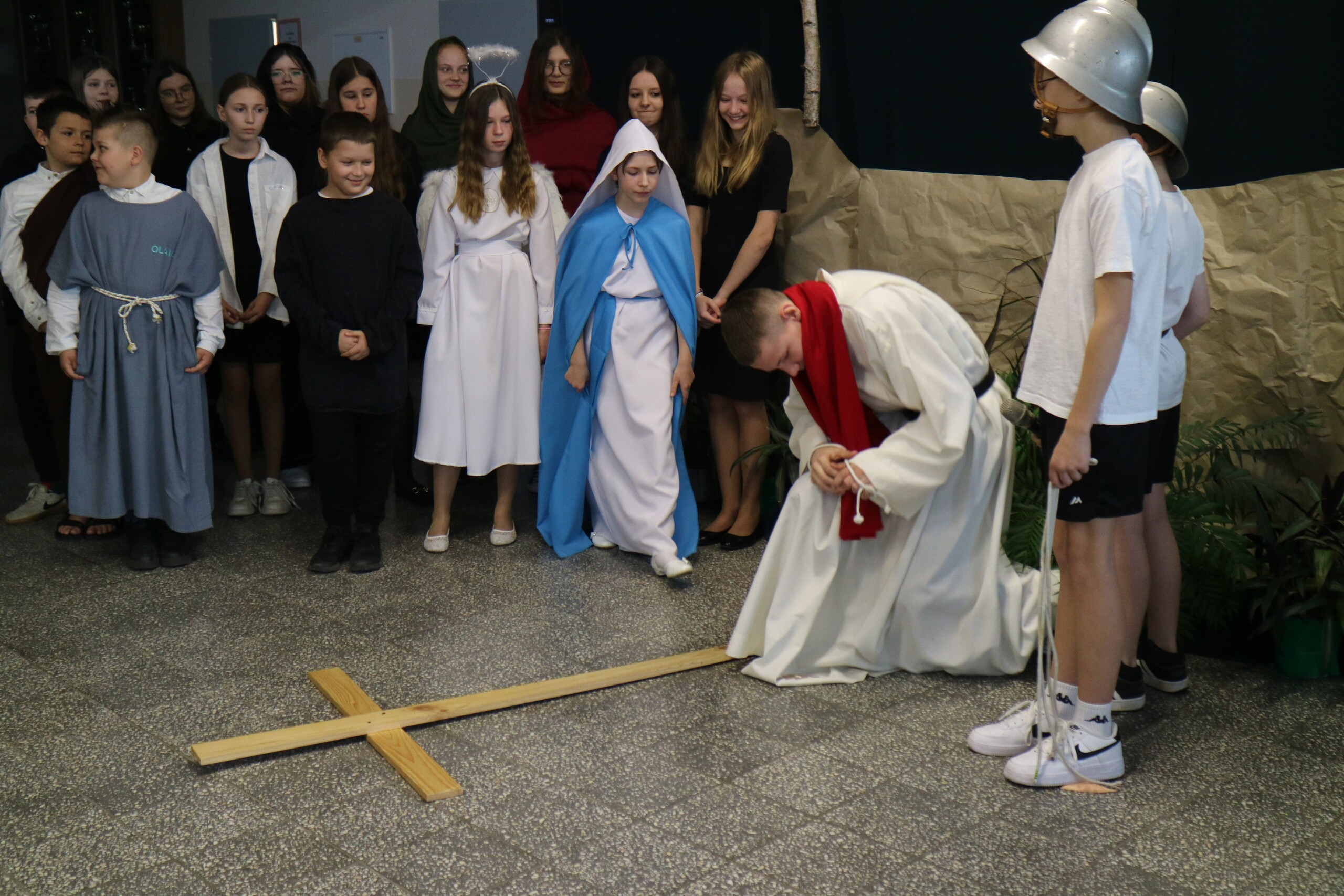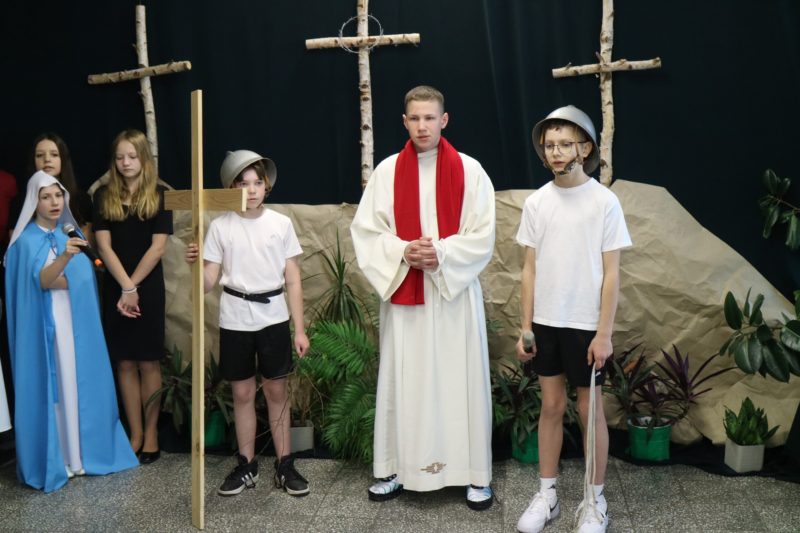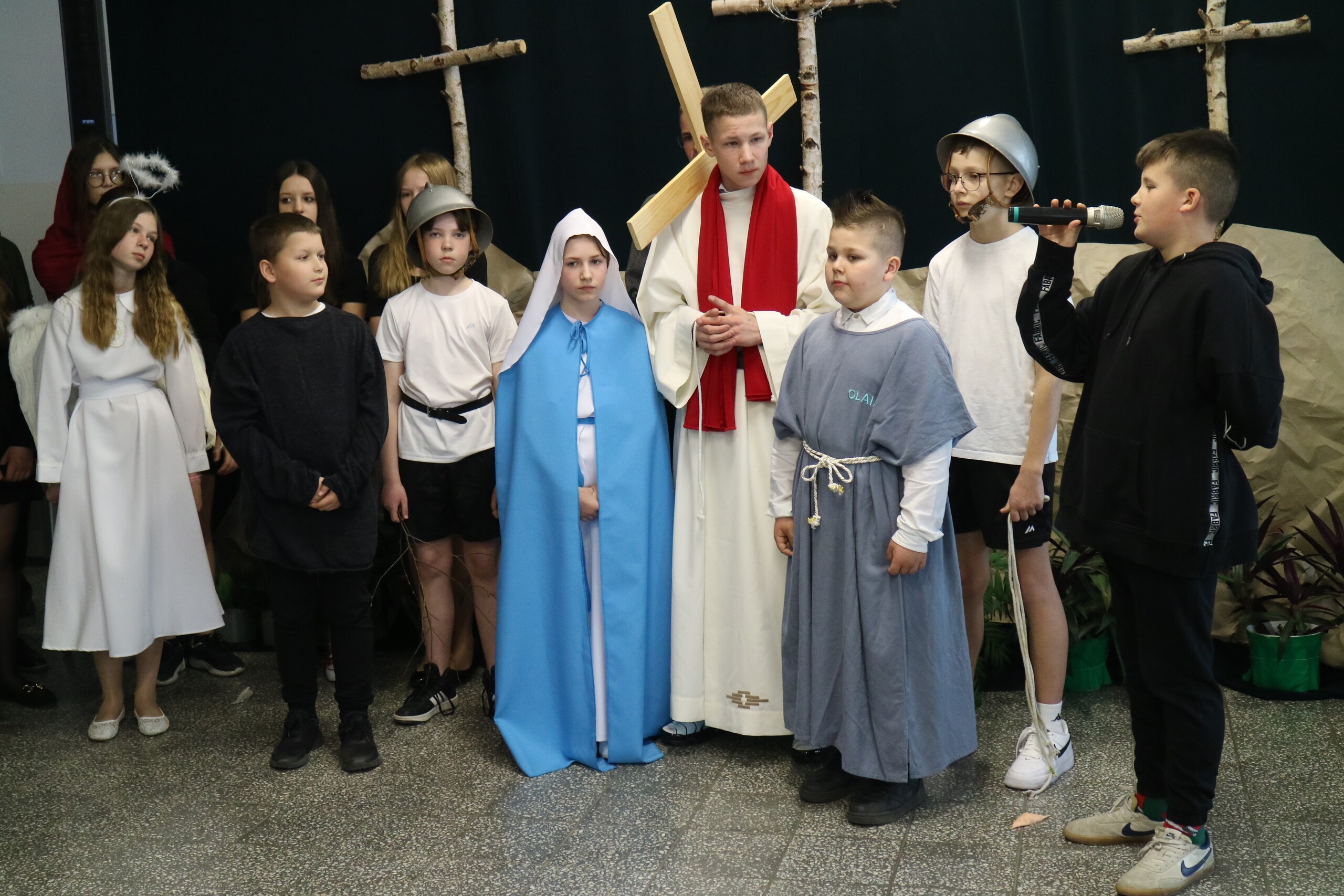 Trwa Wielki Tydzień i przygotowujemy się do obchodów najważniejszych świąt, a są to Święta Wielkanocne. Z tej okazji uczniowie klas IV, VI i VIII przygotowali Misterium Męki Pańskiej. Zaproszeni goście: ksiądz proboszcz Janusz Góral, Przewodnicząca Rady Rodziców pani Justyna Wilga i cała społeczność szkolna mogła zobaczyć przedstawienie przypominające ważne wydarzenia z życia Pana Jezusa. Przeżywamy je co roku, ale zawsze jakby to było po raz pierwszy. Uczniowie doskonale wcielili się w biblijne postaci. Wymowna dekoracja, stroje i odpowiednio dobrane wielkopostne pieśni potęgowały poważny nastrój. Oglądany spektakl spotkał się z uznaniem oglądających i nagrodzony gromkimi brawami. Dyrektor Krzysztof Wojtysiak podziękował uczniom i nauczycielom, którzy przygotowali to ważne wydarzenie oraz złożył życzenia z okazji Świąt Wielkanocnych. Życzenia świąteczne złożył również proboszcz Janusz Góral i Przewodnicząca Rady rodziców Justyna Wilga. W świątecznym nastroju rozeszliśmy się do klas.