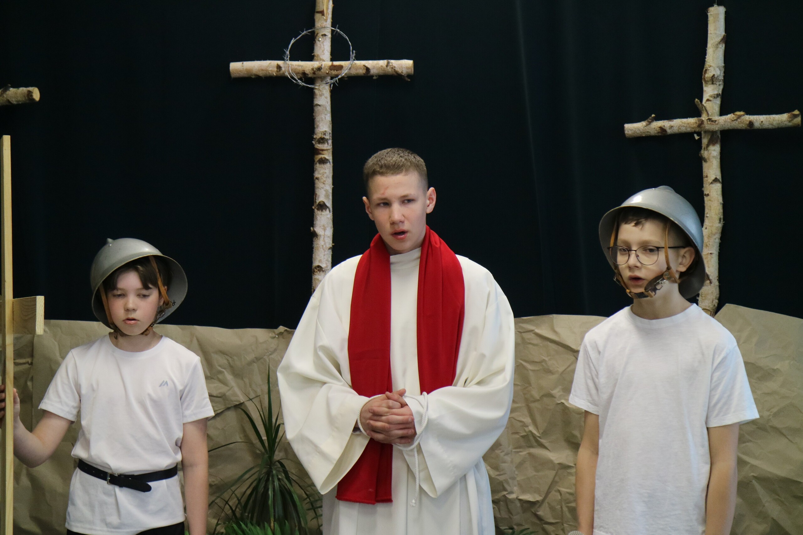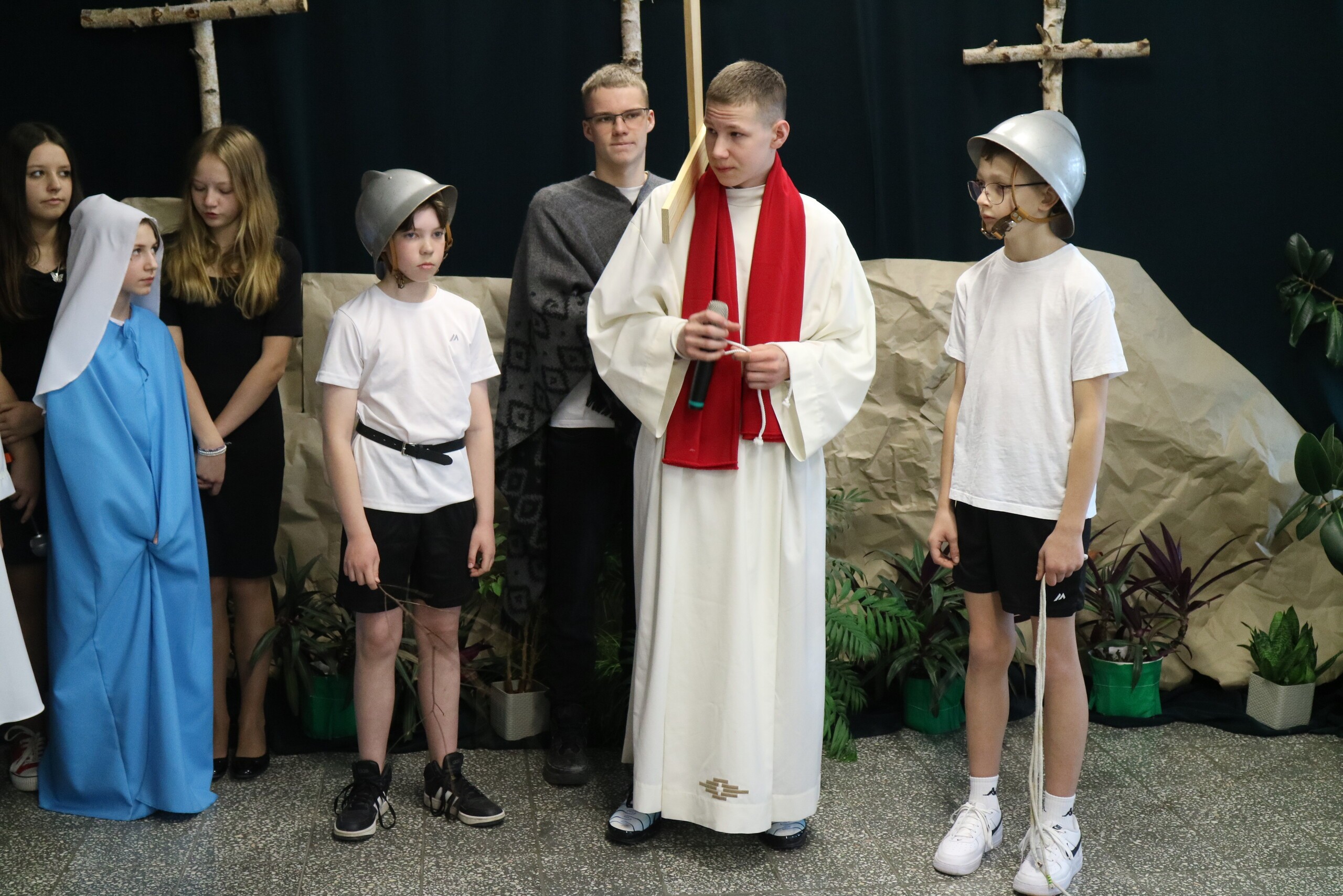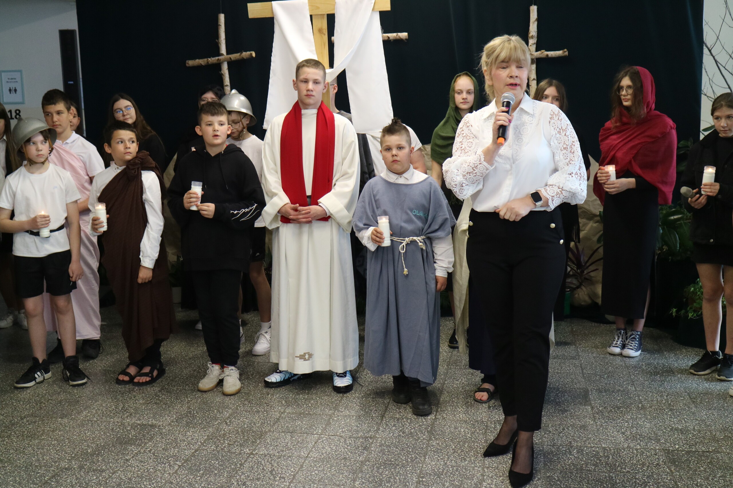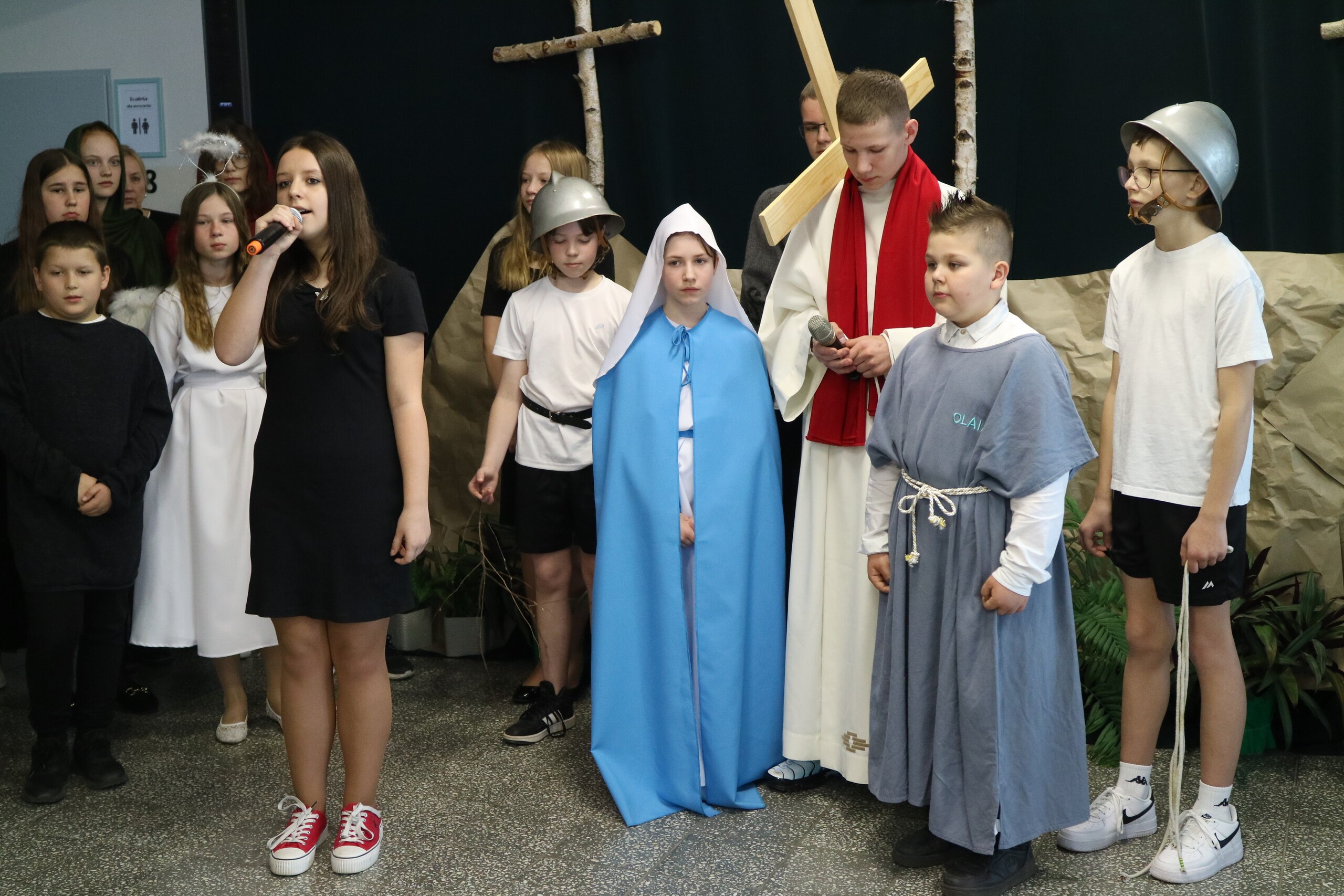 Trwa Wielki Tydzień i przygotowujemy się do obchodów najważniejszych świąt, a są to Święta Wielkanocne. Z tej okazji uczniowie klas IV, VI i VIII przygotowali Misterium Męki Pańskiej. Zaproszeni goście: ksiądz proboszcz Janusz Góral, Przewodnicząca Rady Rodziców pani Justyna Wilga i cała społeczność szkolna mogła zobaczyć przedstawienie przypominające ważne wydarzenia z życia Pana Jezusa. Przeżywamy je co roku, ale zawsze jakby to było po raz pierwszy. Uczniowie doskonale wcielili się w biblijne postaci. Wymowna dekoracja, stroje i odpowiednio dobrane wielkopostne pieśni potęgowały poważny nastrój. Oglądany spektakl spotkał się z uznaniem oglądających i nagrodzony gromkimi brawami. Dyrektor Krzysztof Wojtysiak podziękował uczniom i nauczycielom, którzy przygotowali to ważne wydarzenie oraz złożył życzenia z okazji Świąt Wielkanocnych. Życzenia świąteczne złożył również proboszcz Janusz Góral i Przewodnicząca Rady rodziców Justyna Wilga. W świątecznym nastroju rozeszliśmy się do klas.