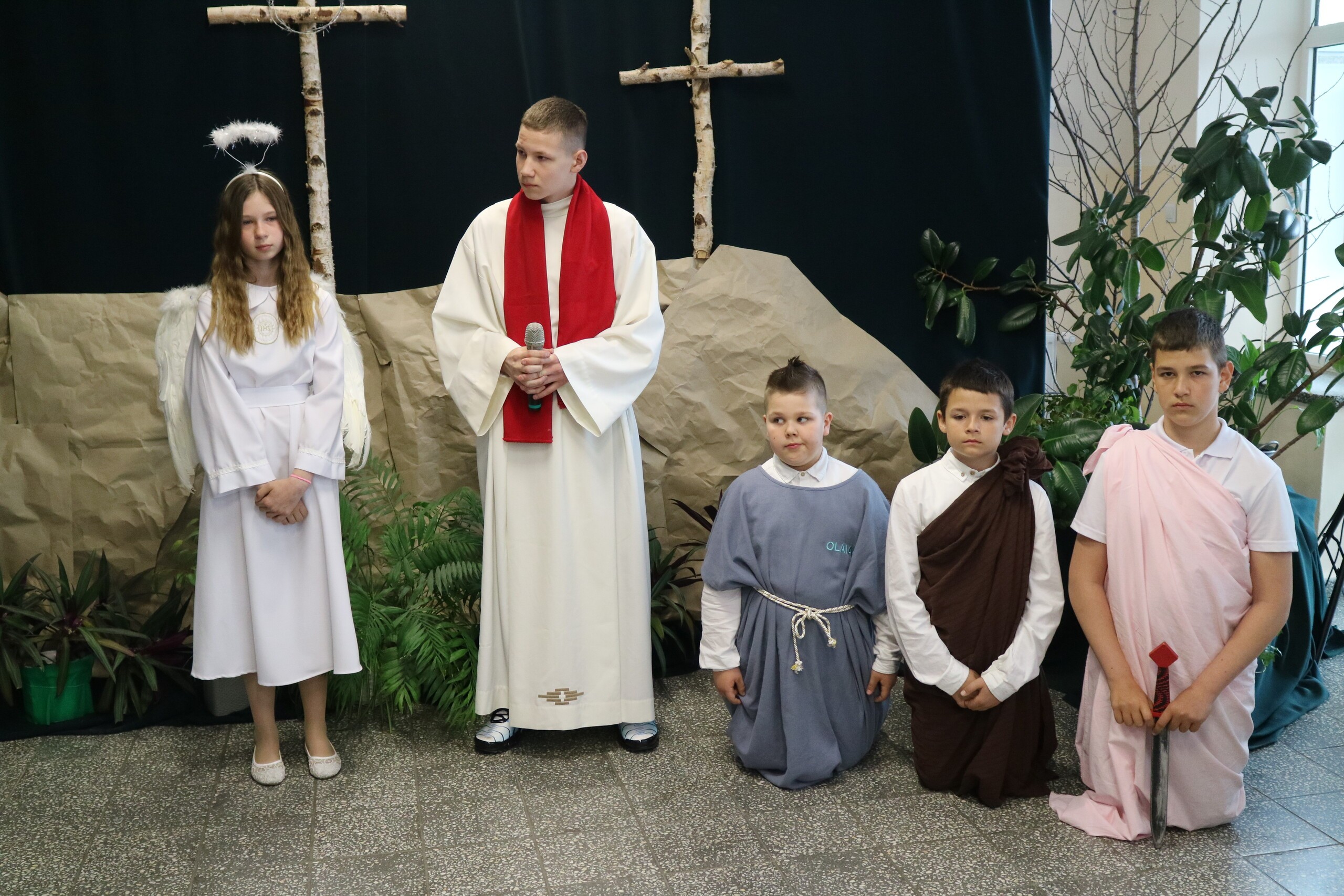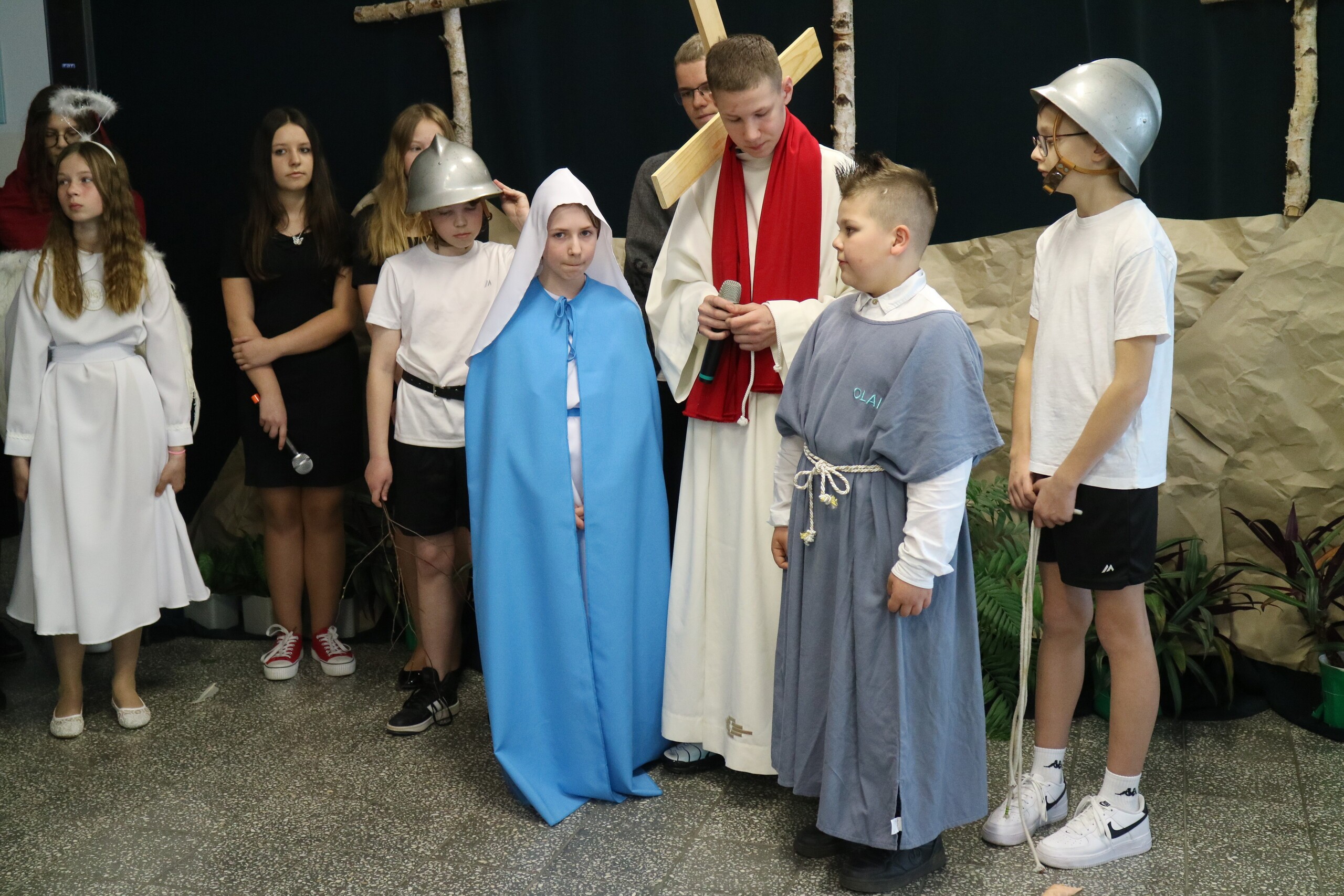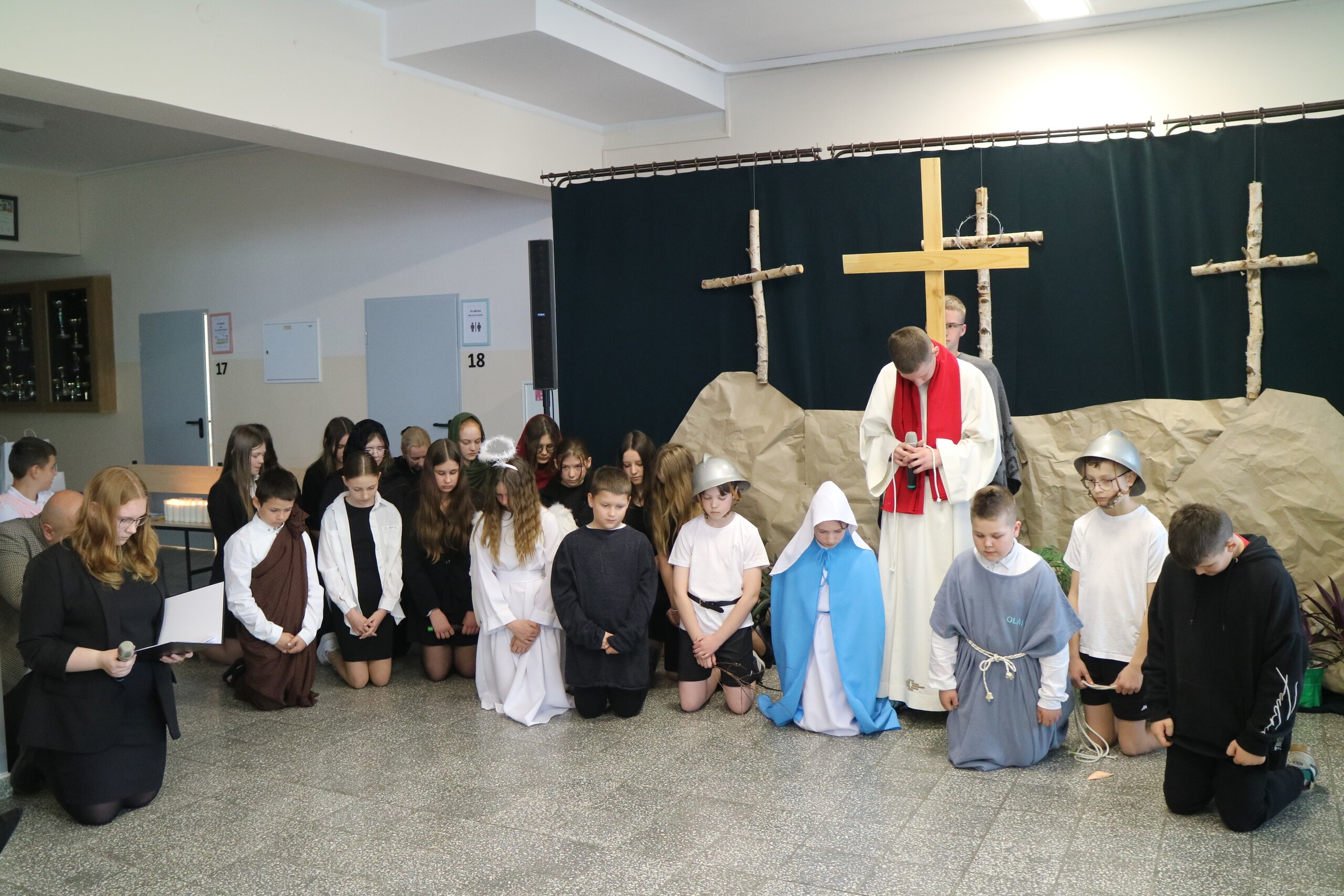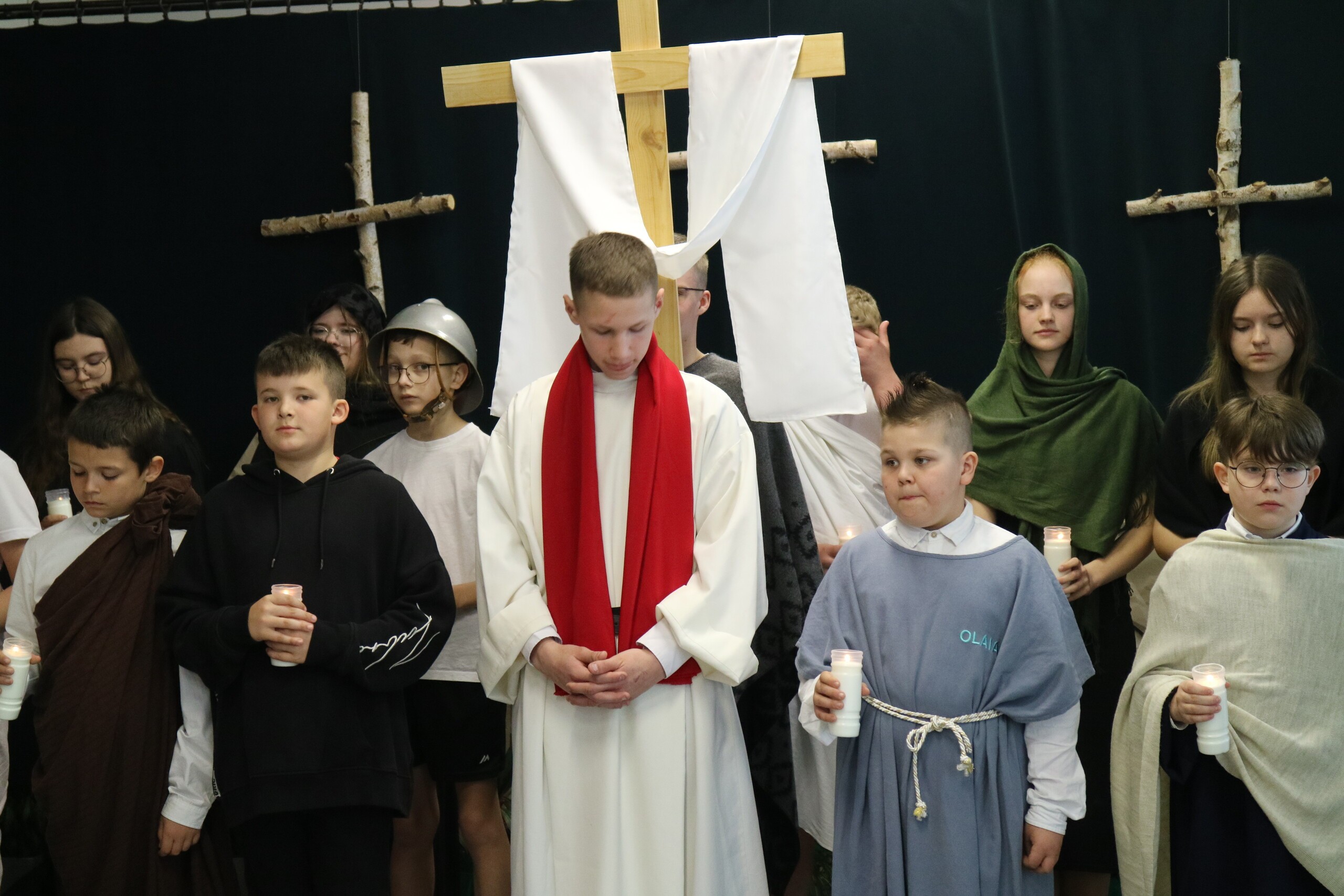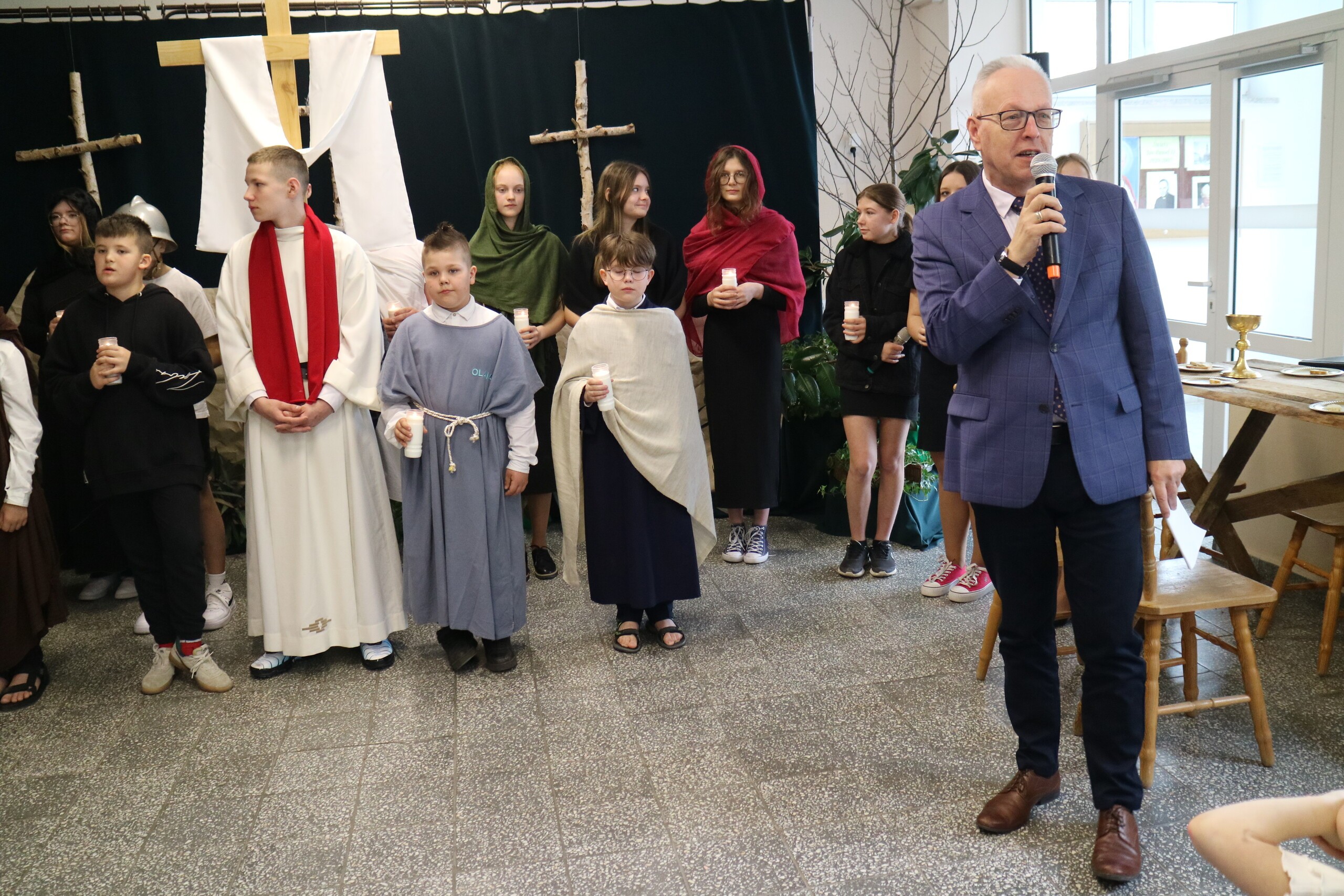 Trwa Wielki Tydzień i przygotowujemy się do obchodów najważniejszych świąt, a są to Święta Wielkanocne. Z tej okazji uczniowie klas IV, VI i VIII przygotowali Misterium Męki Pańskiej. Zaproszeni goście: ksiądz proboszcz Janusz Góral, Przewodnicząca Rady Rodziców pani Justyna Wilga i cała społeczność szkolna mogła zobaczyć przedstawienie przypominające ważne wydarzenia z życia Pana Jezusa. Przeżywamy je co roku, ale zawsze jakby to było po raz pierwszy. Uczniowie doskonale wcielili się w biblijne postaci. Wymowna dekoracja, stroje i odpowiednio dobrane wielkopostne pieśni potęgowały poważny nastrój. Oglądany spektakl spotkał się z uznaniem oglądających i nagrodzony gromkimi brawami. Dyrektor Krzysztof Wojtysiak podziękował uczniom i nauczycielom, którzy przygotowali to ważne wydarzenie oraz złożył życzenia z okazji Świąt Wielkanocnych. Życzenia świąteczne złożył również proboszcz Janusz Góral i Przewodnicząca Rady rodziców Justyna Wilga. W świątecznym nastroju rozeszliśmy się do klas.