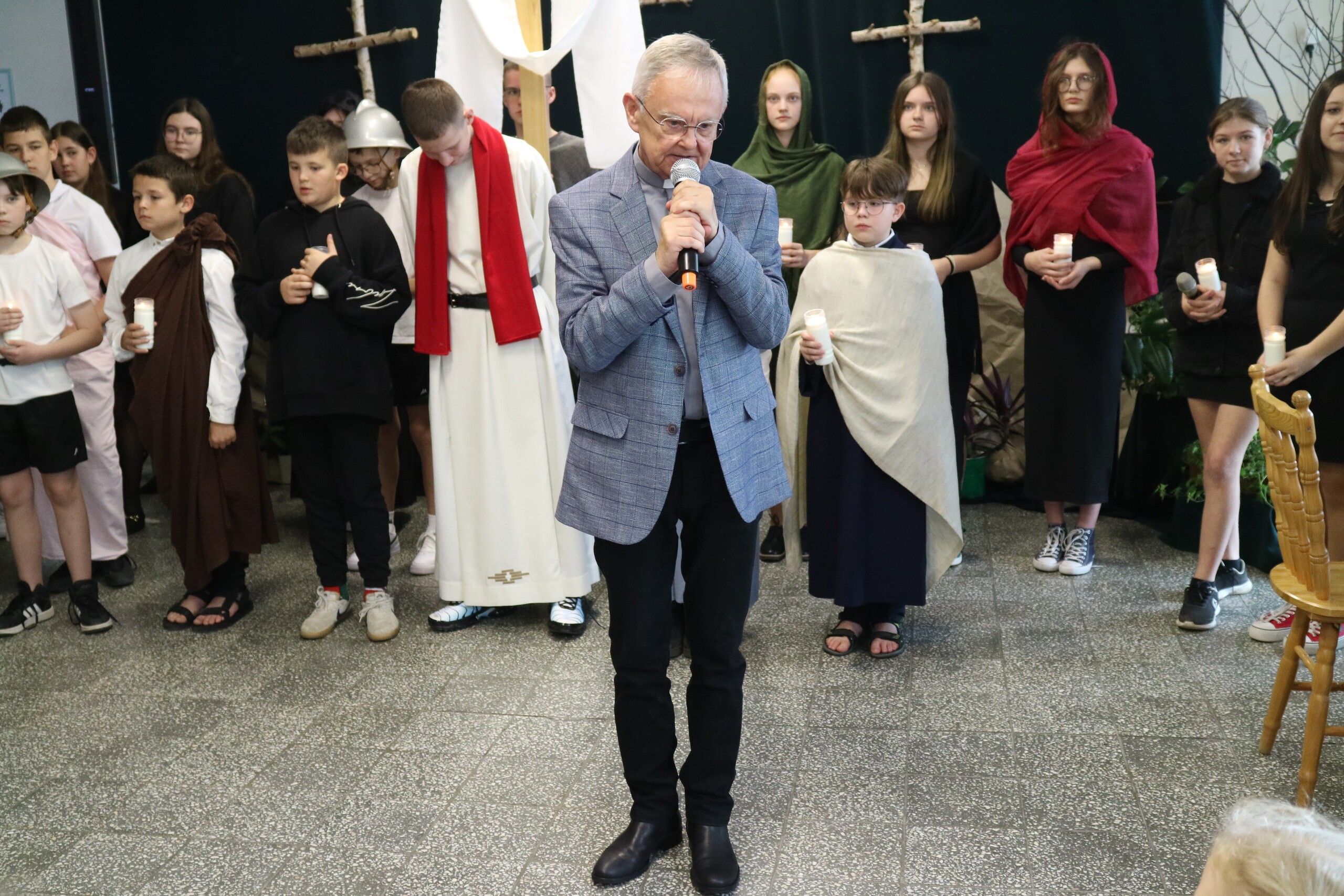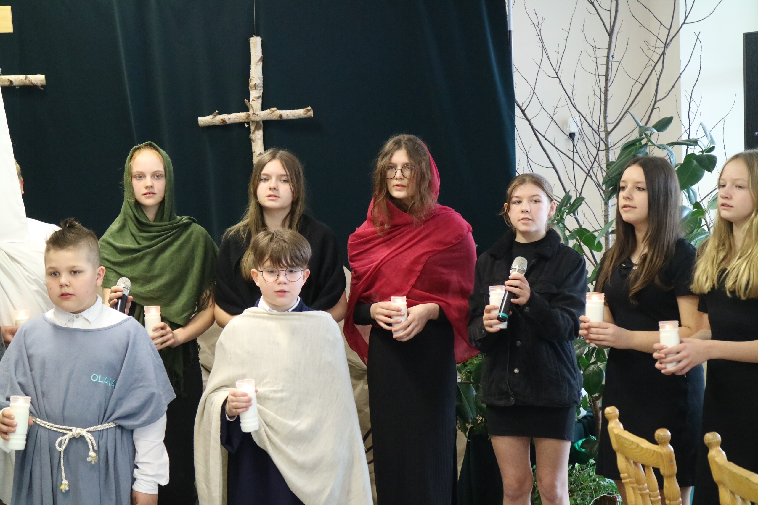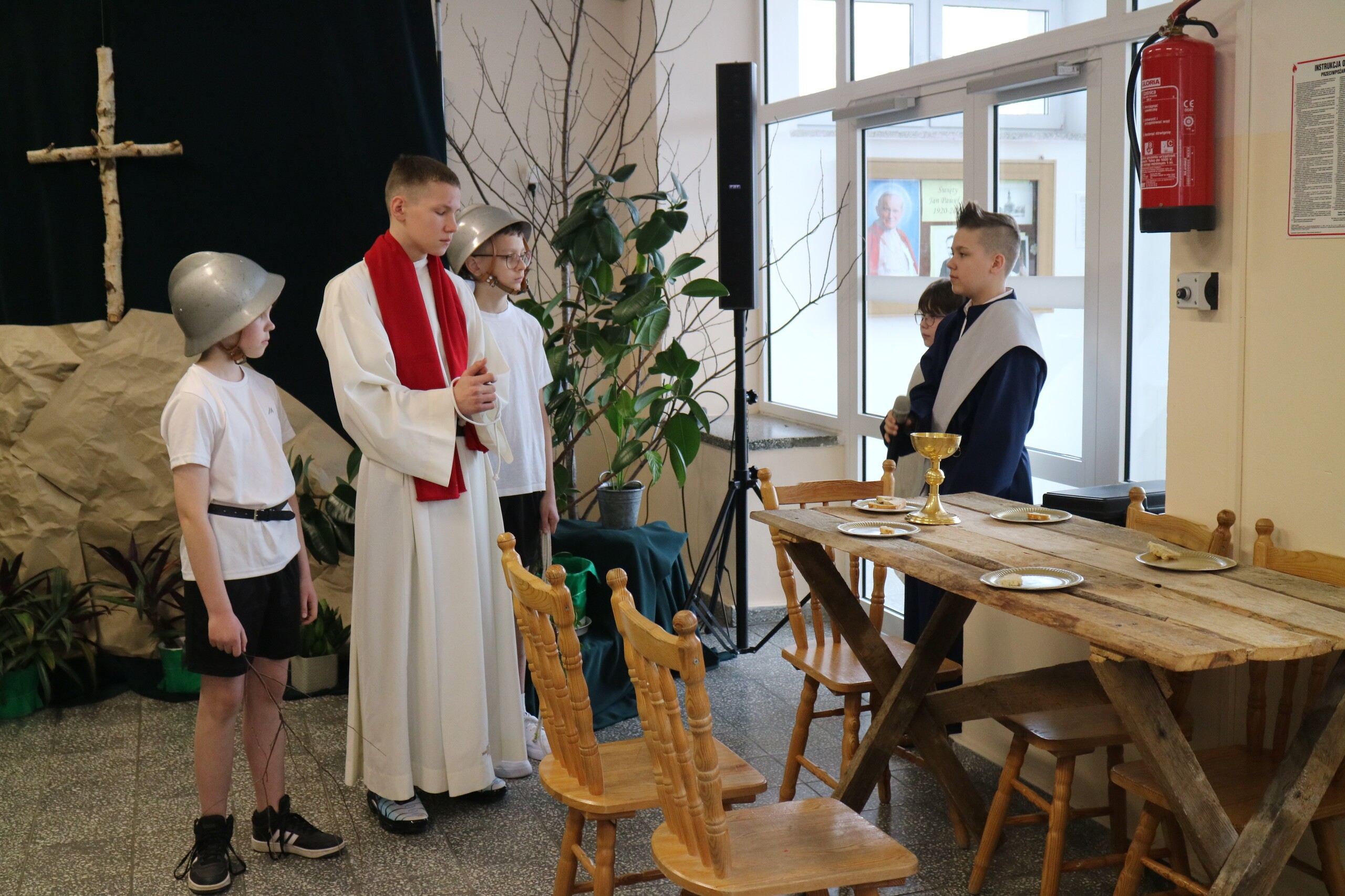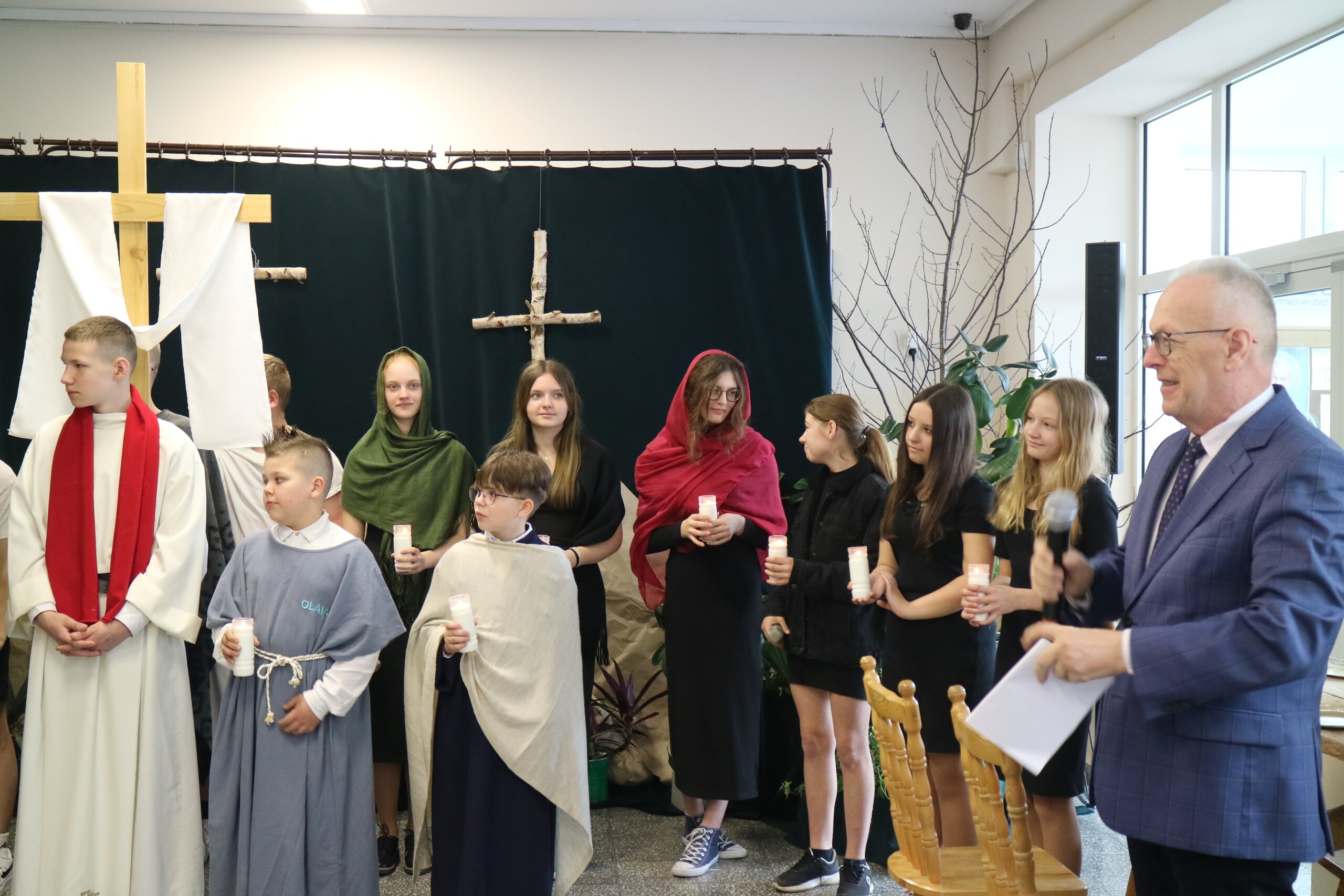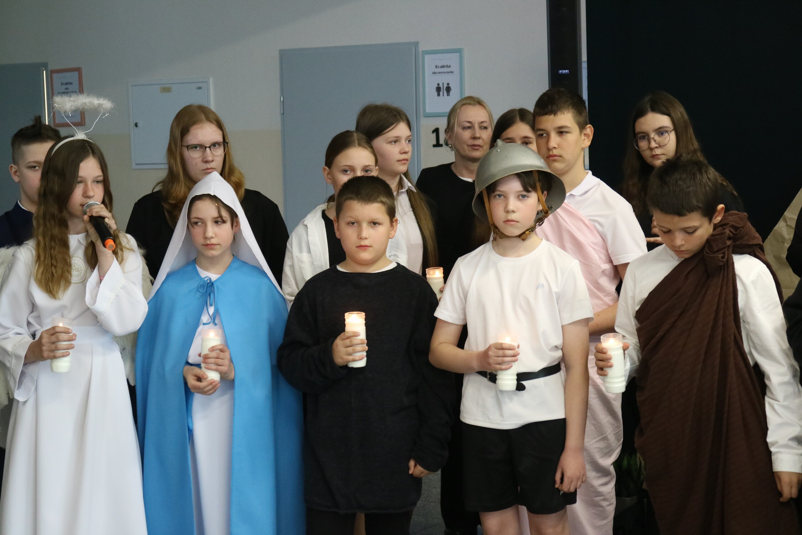 Trwa Wielki Tydzień i przygotowujemy się do obchodów najważniejszych świąt, a są to Święta Wielkanocne. Z tej okazji uczniowie klas IV, VI i VIII przygotowali Misterium Męki Pańskiej. Zaproszeni goście: ksiądz proboszcz Janusz Góral, Przewodnicząca Rady Rodziców pani Justyna Wilga i cała społeczność szkolna mogła zobaczyć przedstawienie przypominające ważne wydarzenia z życia Pana Jezusa. Przeżywamy je co roku, ale zawsze jakby to było po raz pierwszy. Uczniowie doskonale wcielili się w biblijne postaci. Wymowna dekoracja, stroje i odpowiednio dobrane wielkopostne pieśni potęgowały poważny nastrój. Oglądany spektakl spotkał się z uznaniem oglądających i nagrodzony gromkimi brawami. Dyrektor Krzysztof Wojtysiak podziękował uczniom i nauczycielom, którzy przygotowali to ważne wydarzenie oraz złożył życzenia z okazji Świąt Wielkanocnych. Życzenia świąteczne złożył również proboszcz Janusz Góral i Przewodnicząca Rady rodziców Justyna Wilga. W świątecznym nastroju rozeszliśmy się do klas.