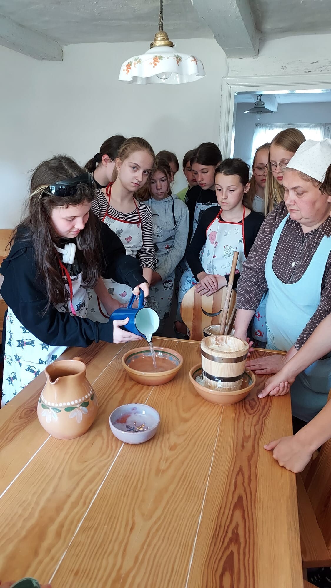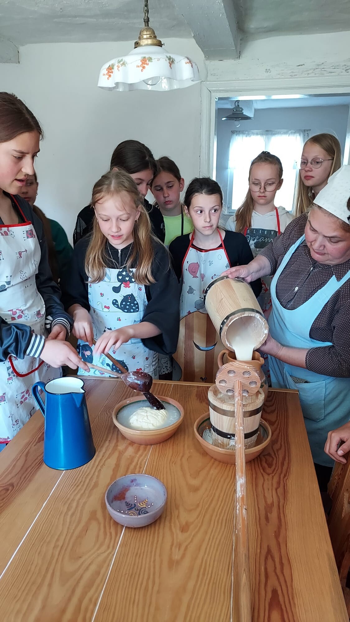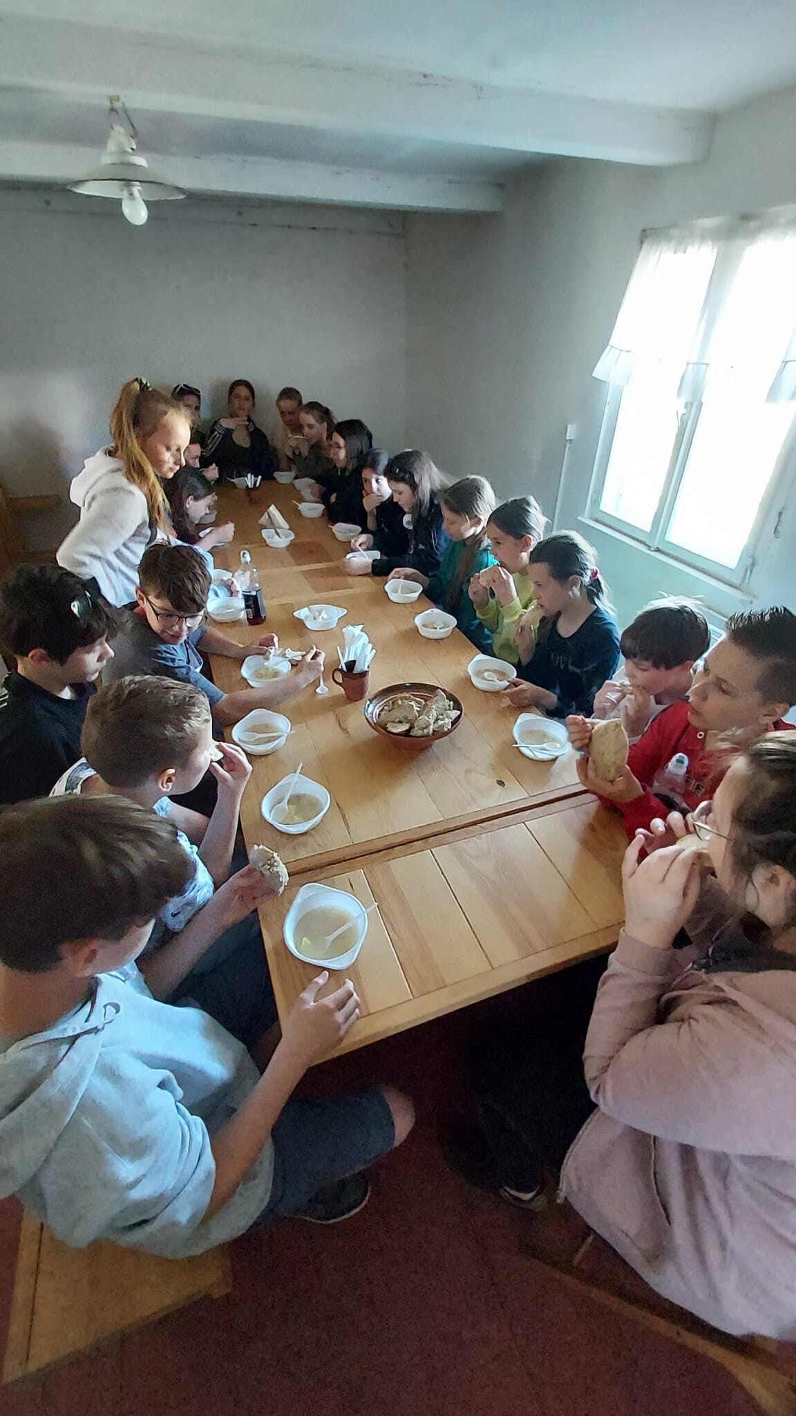 Najprzyjemniejszym etapem wycieczki jest zwykle posiłek. Ten, przygotowany przez uczniów, był podwójnie smaczny. Zjedliśmy ze smakiem zupę kartoflaną, chleb z masłem, popiliśmy maślanką i jeszcze dostaliśmy na deser wafle zrobione na starej wafelnicy i upieczone na kaflowym piecu.