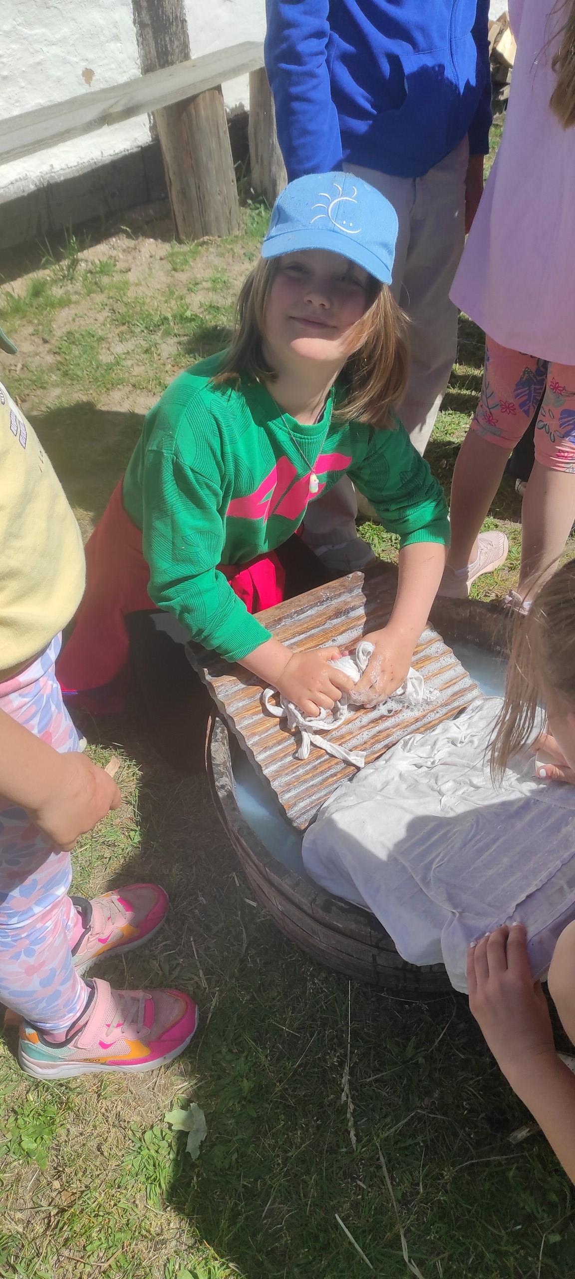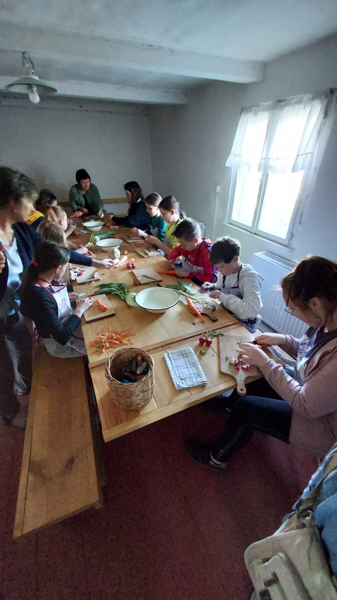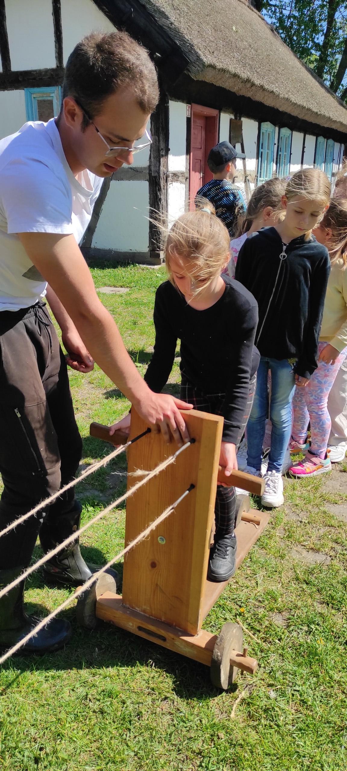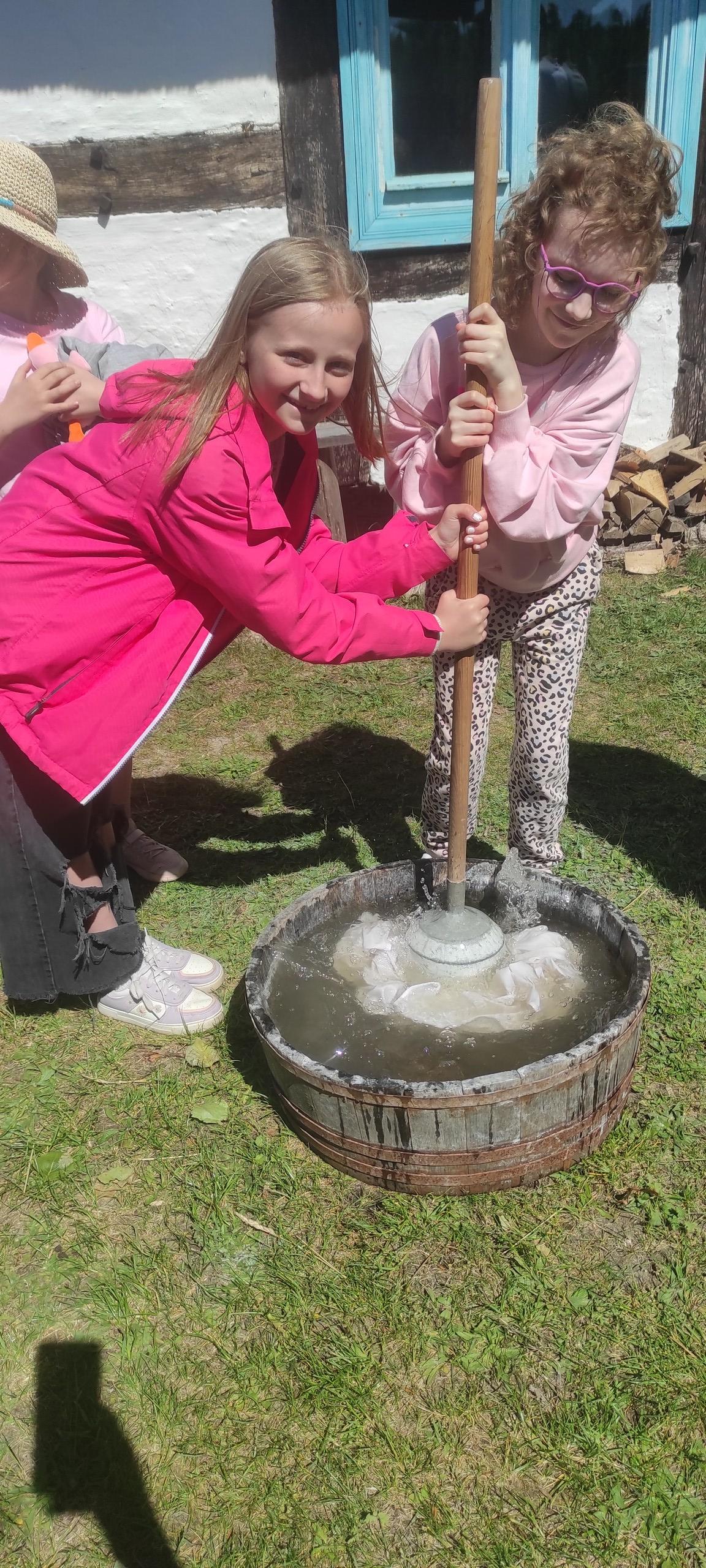 Na miejscu podzieliliśmy się na dwie grupy i ruszyliśmy na zwiedzanie. Jedna z lekcji muzealnych, w której braliśmy udział, poświęcona była kuchni i potrawom gotowanym na wsi słowińskiej i pomorskiej na przełomie XIX i XX wieku. Dzięki bardzo miłym i wyrozumiałym Paniom gospodyniom dzieci poznały sposoby przyrządzania chleba, formowały bochny chlebowe, które potem upiekły się w rozgrzanym piecu. Kolejnym zadaniem było wspólne przygotowywanie kartoflanki, masła i maślanki. Rodzice! Musicie wiedzieć, że macie w domu zdolnych pomocników! Dzieci wspaniale radziły sobie z obieraniem i krojeniem warzyw do zupy. Przy wspólnej pracy słuchali o kuchni regionalnej, tej codziennej i świątecznej.