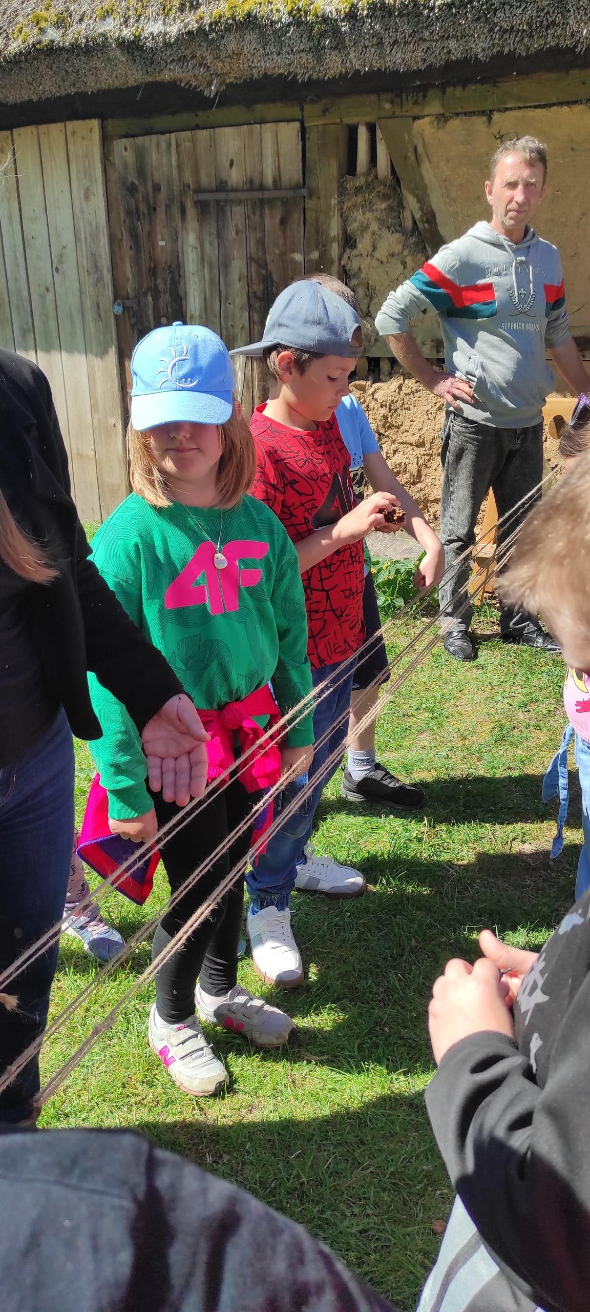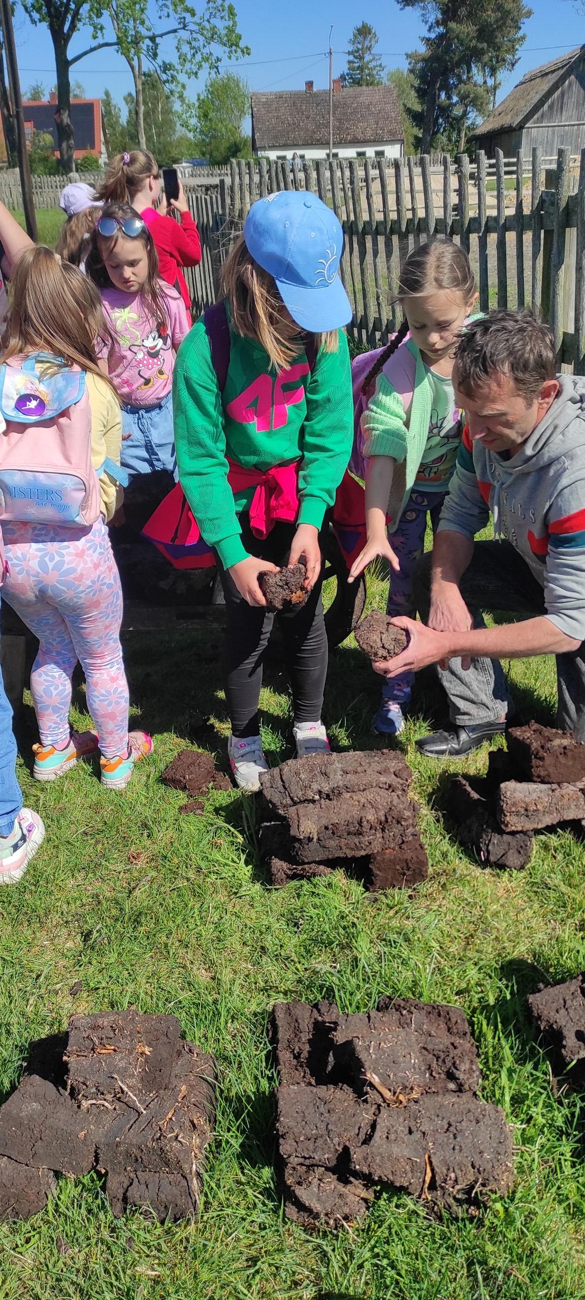 W tym samym czasie druga grupa poznawała życie codzienne Słowińców. Dzieci podczas warsztatów opisywały wygląd zagród i nazywały narzędzia. W kolejnym etapie uczniowie posługując się kopiami tradycyjnych narzędzi i sprzętów wykonywali prace, którymi kiedyś trudnili się mieszkańcy wsi słowińskiej: kopanie torfu, dłubanie butów dla konia, czyli tzw. klumpy, piłowanie drewna czy pranie tarą i dzwonem.