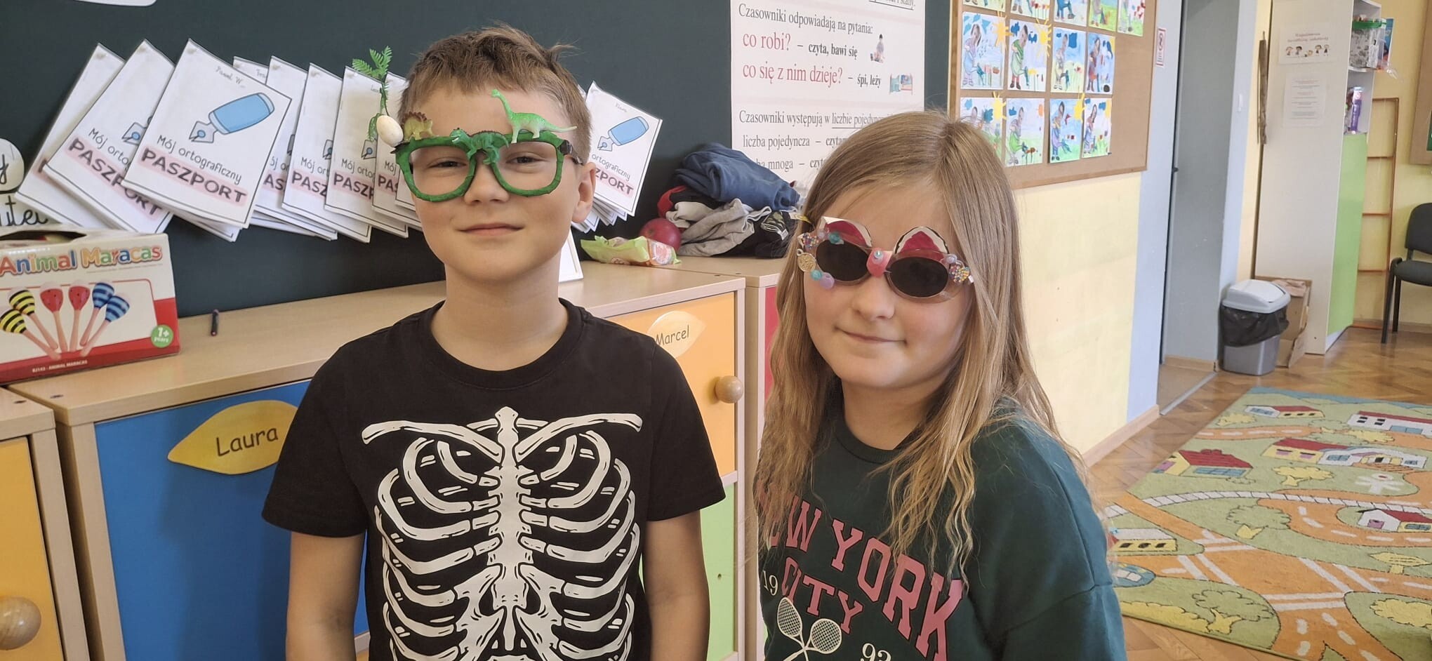 Wtorek w naszej szkole obchodzony w ramach Tygodnia Samorządności upłynął pod hasłem „Okulary Wyobraźni”. Tego dnia uczniowie zaprezentowali własnoręcznie wykonane, oryginalne projekty okularów, które zachwycały pomysłowością i różnorodnością. Szkolne korytarze zamieniły się w przestrzeń pełną kreatywności – można było podziwiać prace w różnych kształtach i kolorach, ozdobione ciekawymi dodatkami i wykonane z dużą starannością. Każda para okularów była wyjątkowa i stanowiła wyraz indywidualności oraz wyobraźni autora. Wydarzenie było doskonałą okazją do rozwijania twórczego myślenia oraz integracji uczniów poprzez wspólną zabawę.