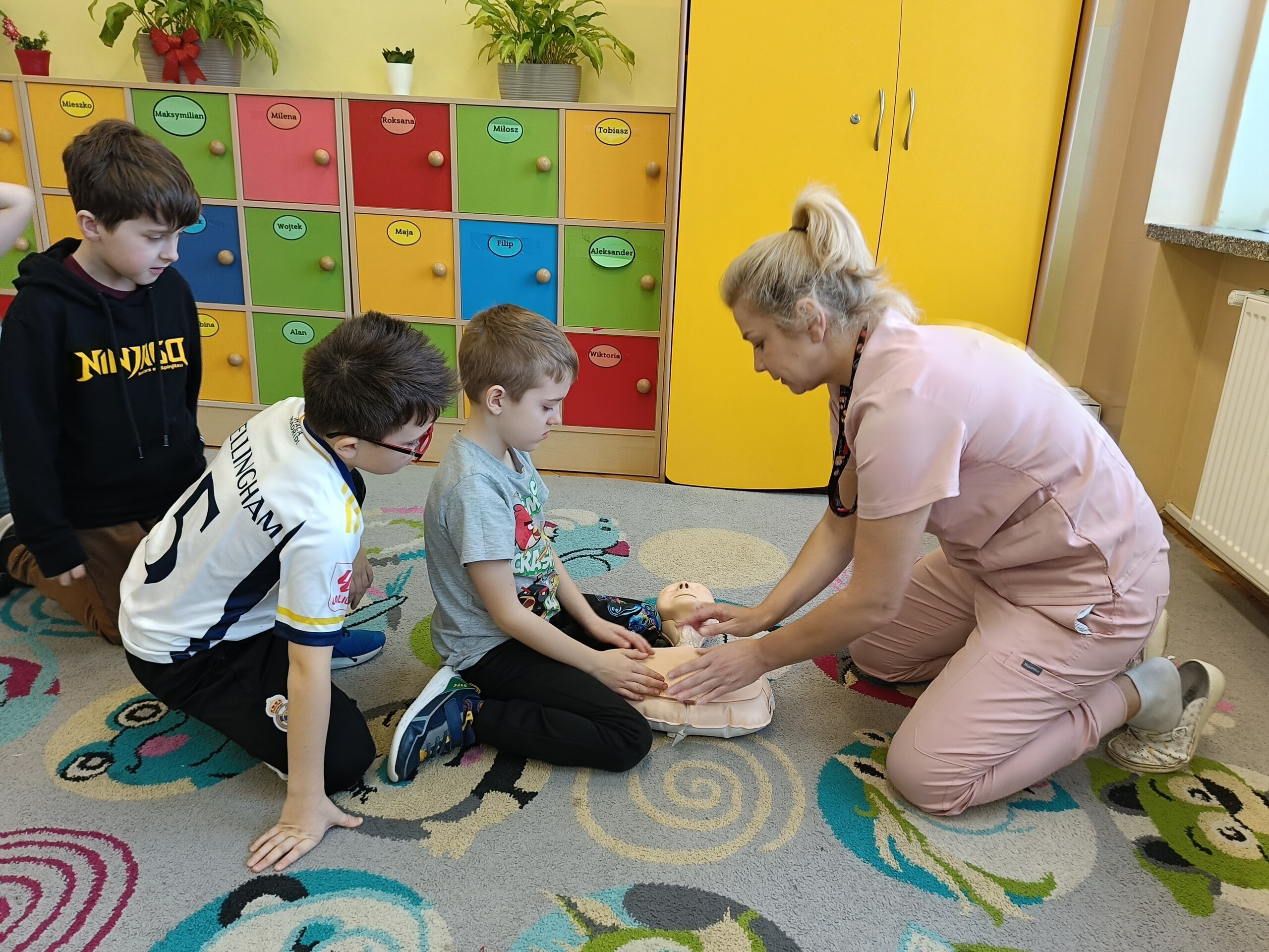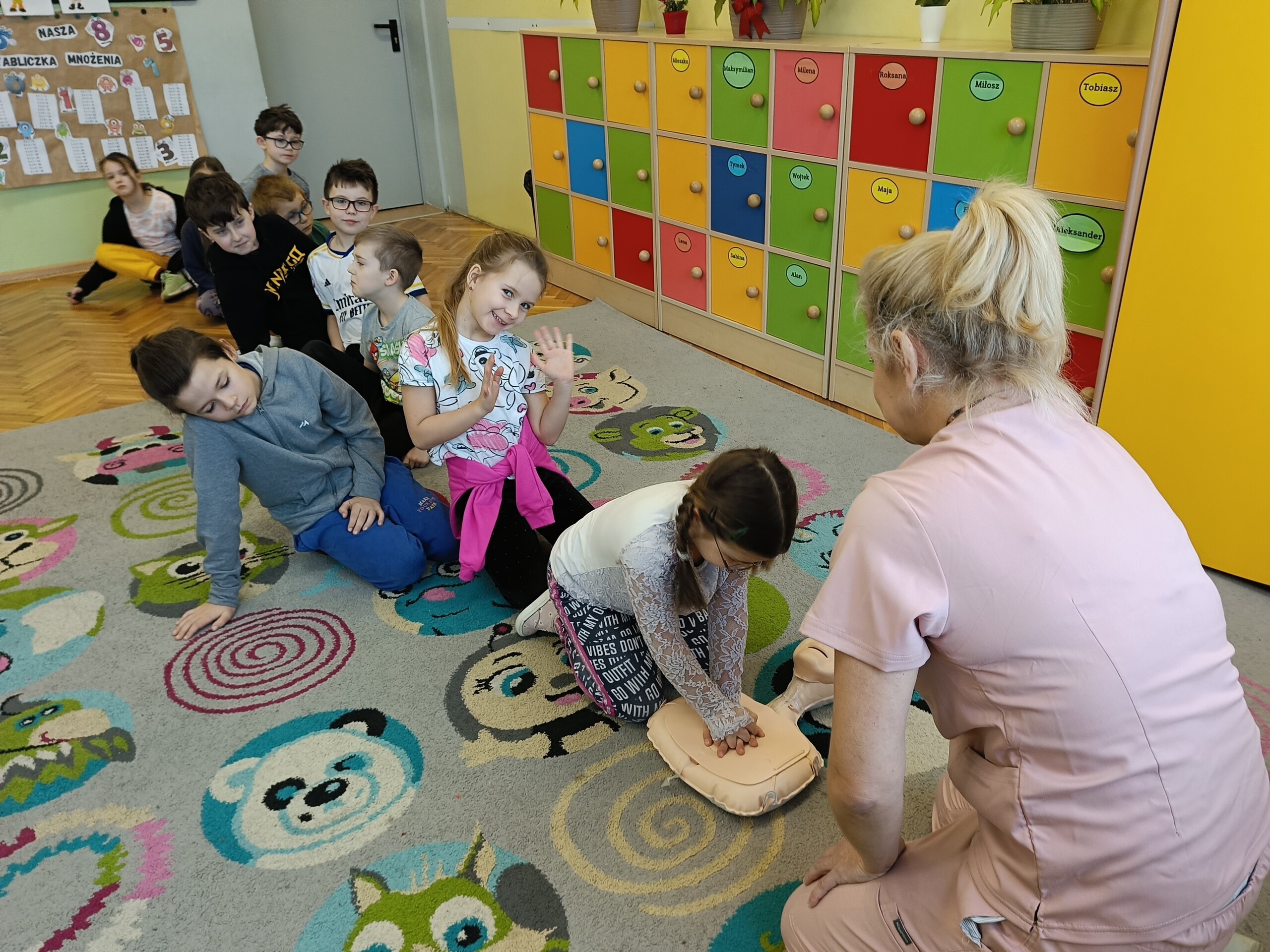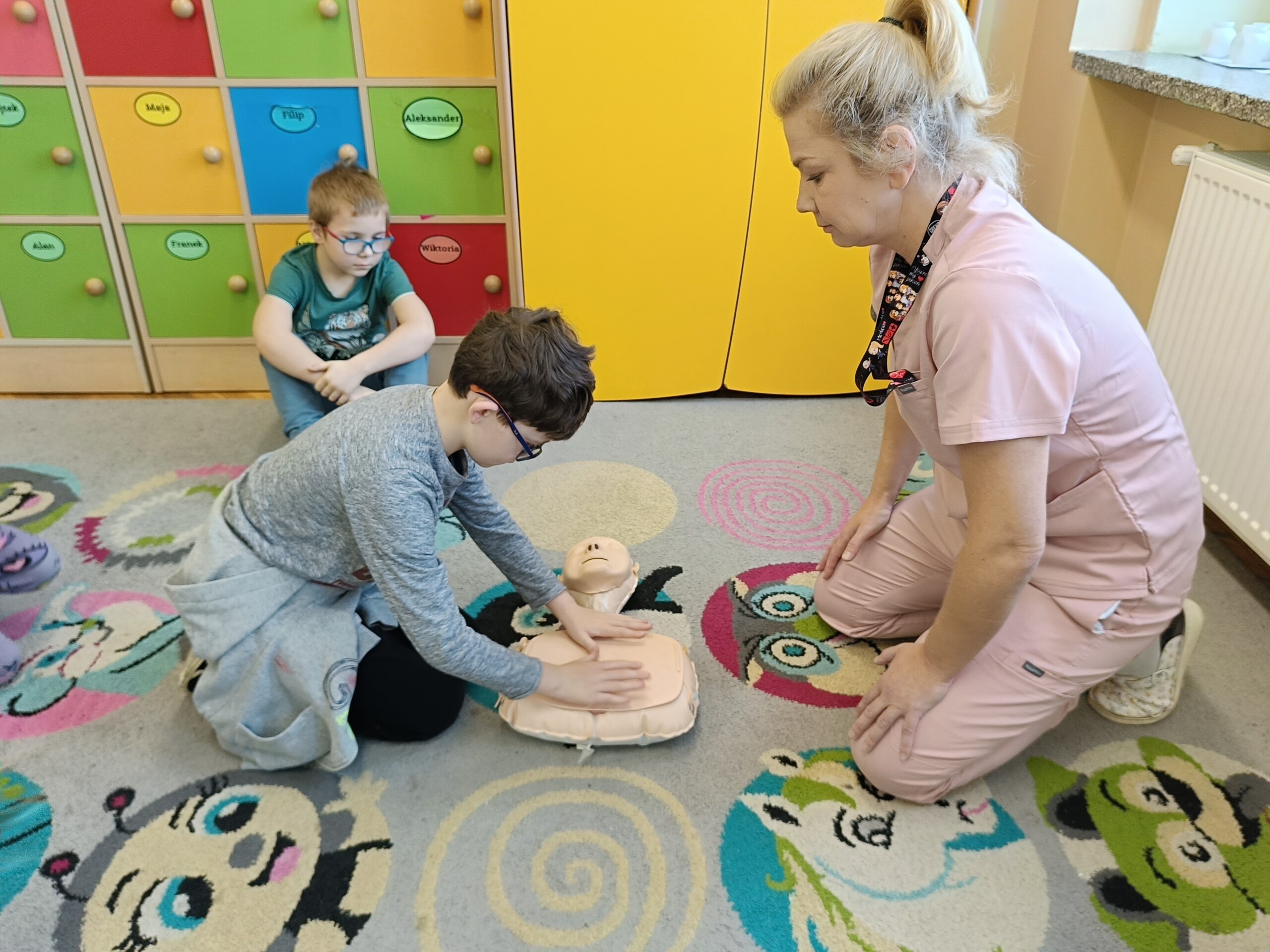 W ostatnich dniach przed feriami uczniowie klasy 2. nabywali umiejętności udzielania pierwszej pomocy przedmedycznej. Uczniowie potrafią wezwać pomoc zgodnie z wytycznymi, ułożyć poszkodowanego w pozycji bocznej bezpiecznej, udzielić pierwszej pomocy w przypadku zranienia oraz utraty przytomności. Tej ostatniej umiejętności uczyli się w praktyce dzięki obecności pani Justyny Wilgi, która jest pracownikiem naszej szkoły, a także opiekunem medycznym. Pani Justyna opowiedziała uczniom o swojej pracy oraz o podstawowych czynnościach, które należy wykonać w przypadku resuscytacji krążeniowo - oddechowej. Uczniowie pod czujnym okiem pani Justyny mieli okazję poćwiczyć na fantomie czynności ratujące życie. Takie zajęcia są ogromnie ważne nie tylko dlatego, że dzięki nim wiemy, jak pomóc osobie potrzebującej, ale uczymy się odpowiedzialności za siebie i innych.