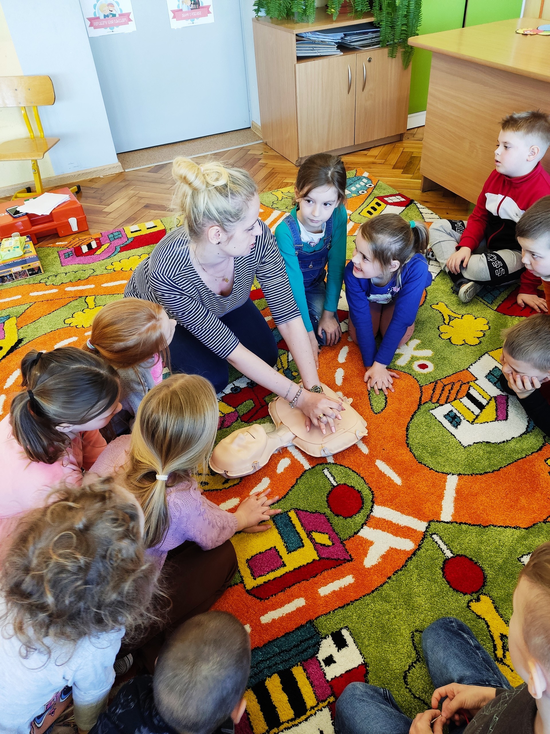 Po omówieniu zasad udzielania pierwszej pomocy uczniowie bardzo chętnie i aktywnie brali udział w ćwiczeniach praktycznych na fantomie wykonując podstawowe czynności ratownicze pod fachowym okiem ratownika. Dzięki takiej lekcji pierwszoklasiści zdobyli ważne umiejętności, które w przyszłości być może przyczynią się do uratowania życia.