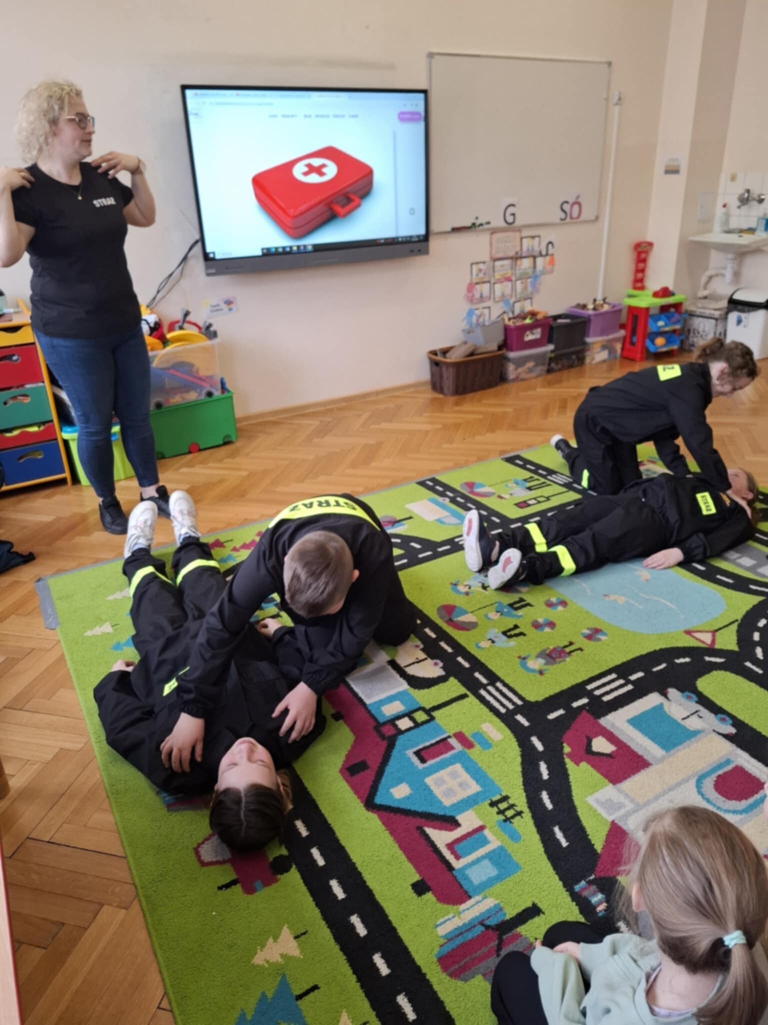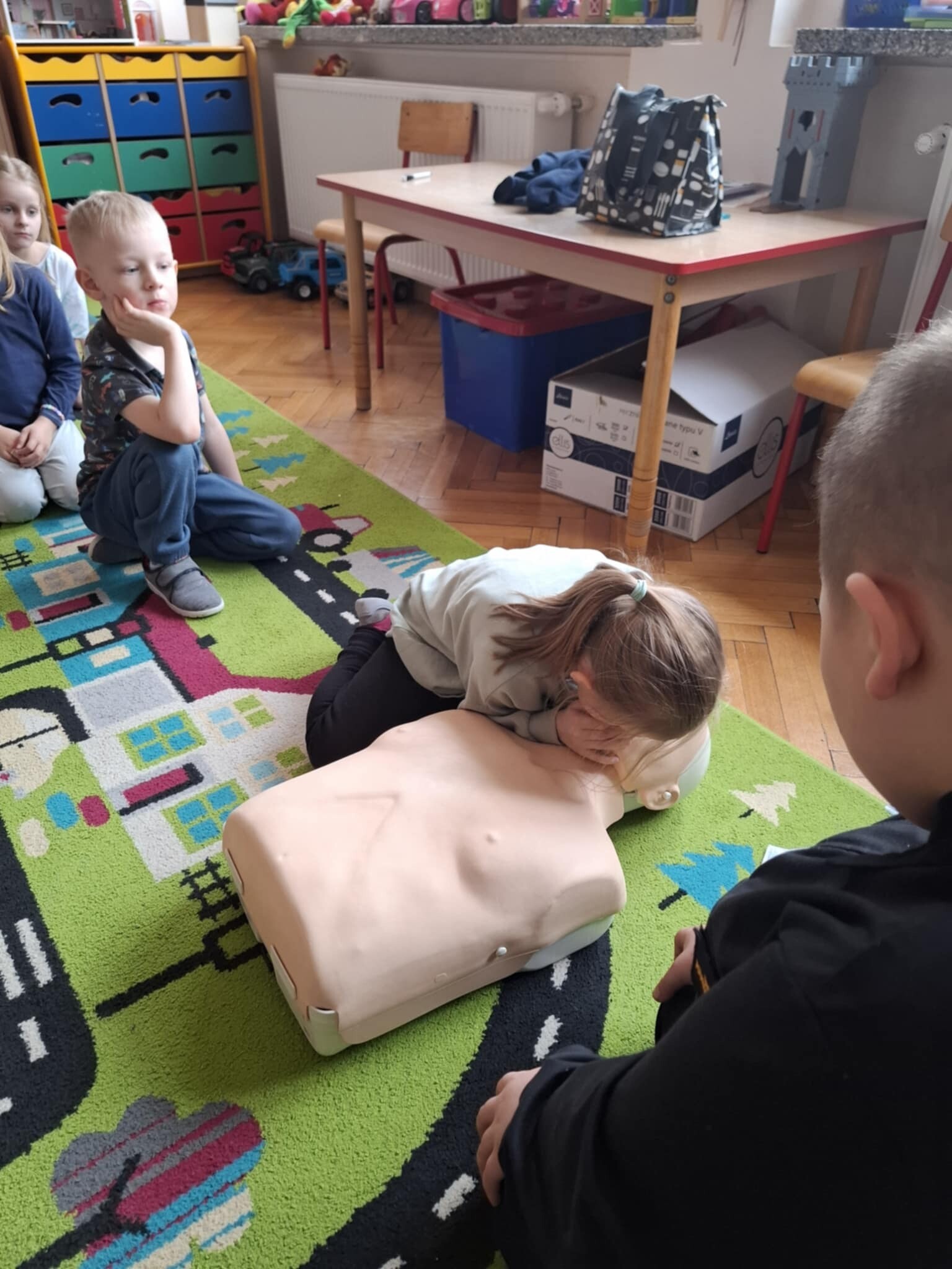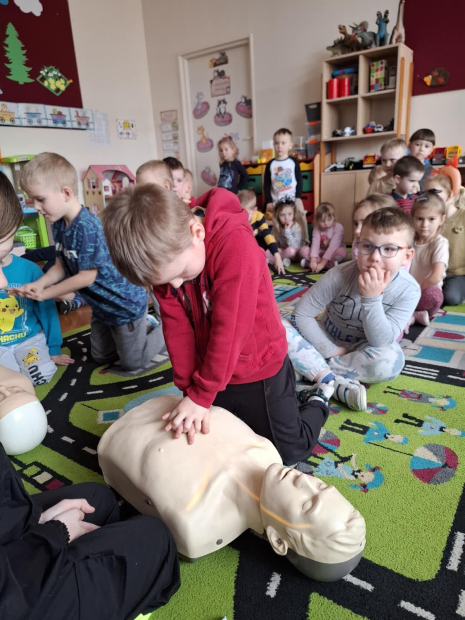 Przedszkolaki uczą się zasad udzielania pierwszej pomocy pod czujnym okiem Młodzieżowej Drużyny Pożarniczej z OSP Łebień. Zajęcia miały na celu zapoznanie dzieci z podstawami resuscytacji krążeniowo-oddechowej (RKO) oraz naukę reagowania w sytuacjach kryzysowych.