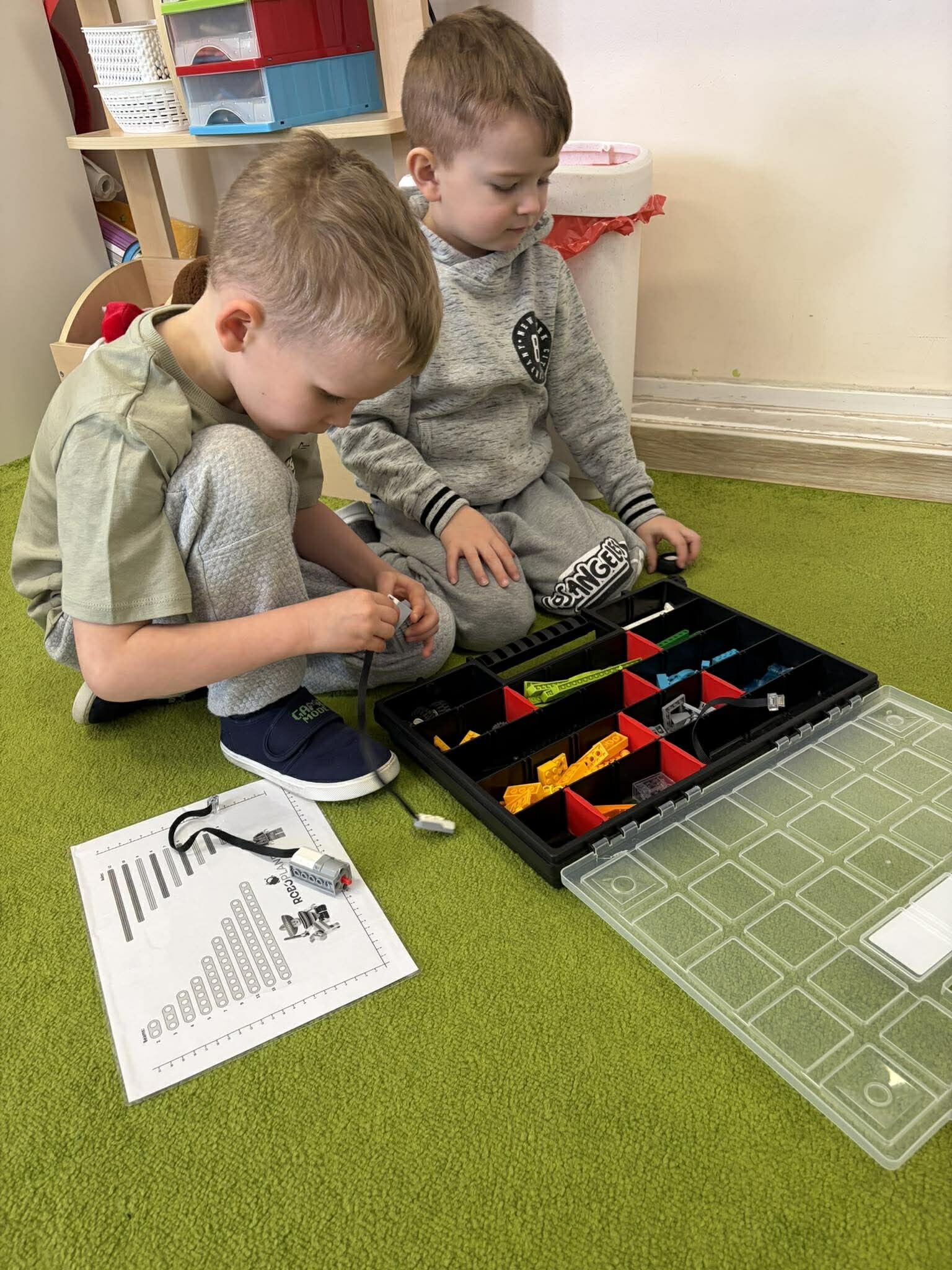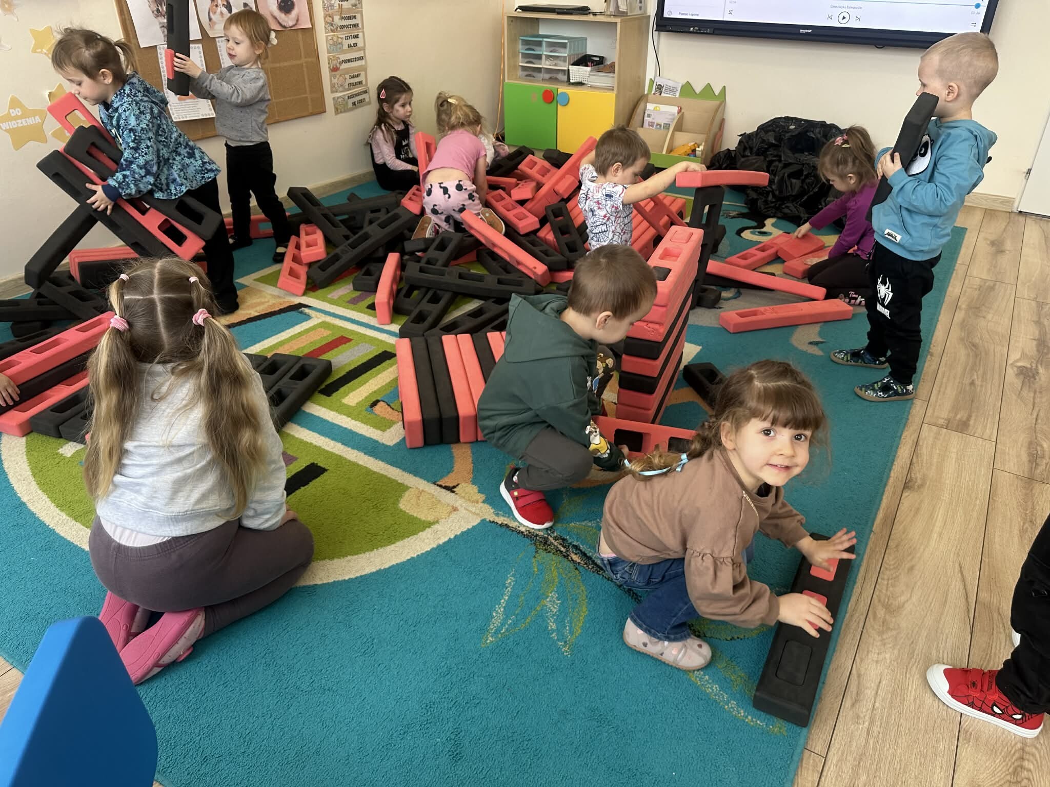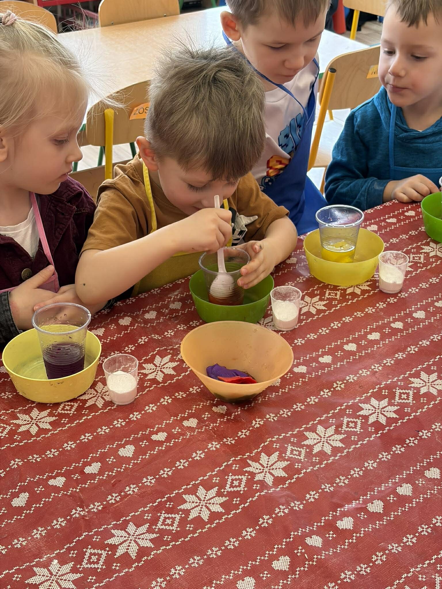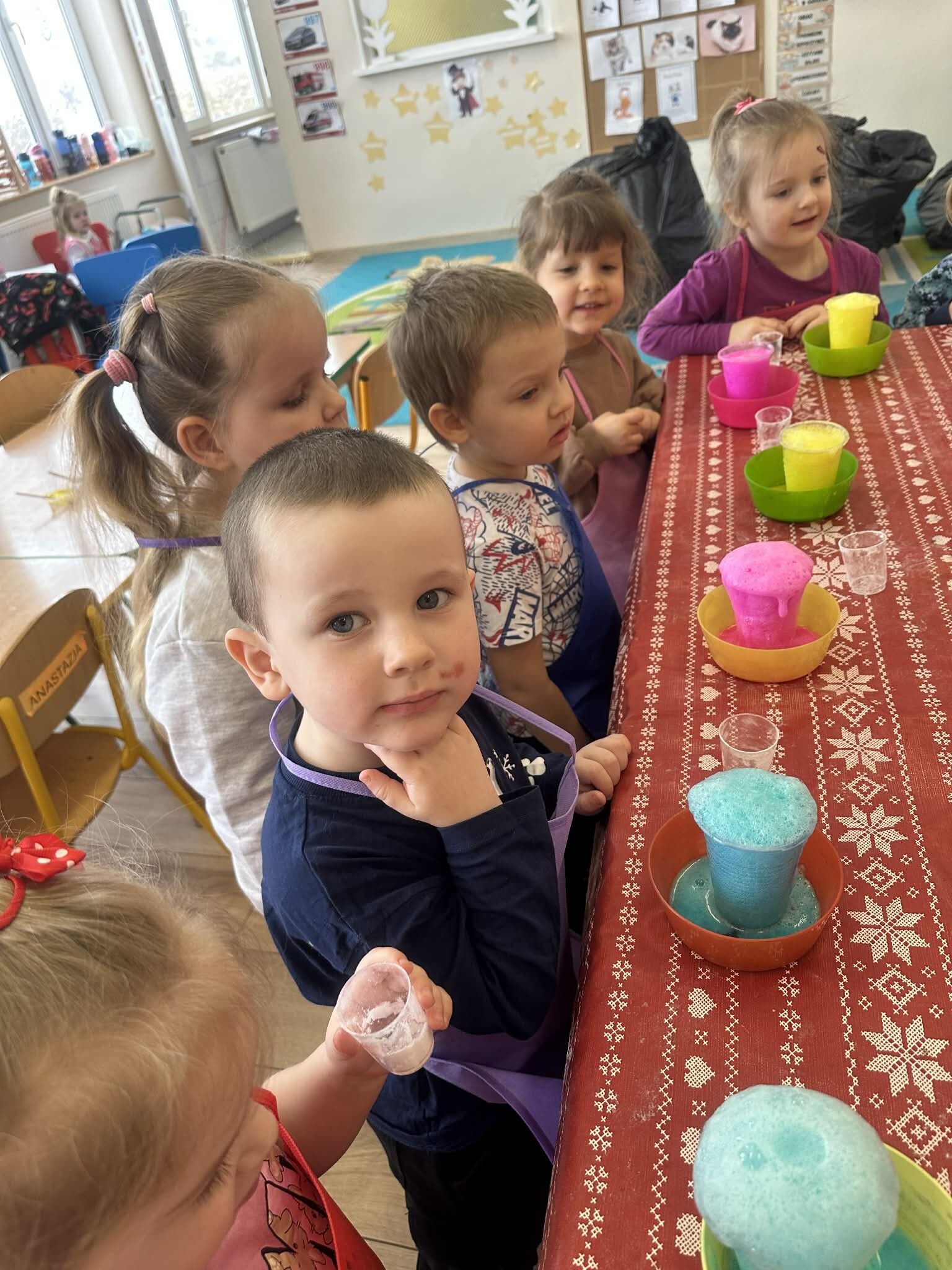 Podczas zajęć przedszkolaki miały okazję konstruować własne autoroboty, rozwijając przy tym wyobraźnię oraz zdolności manualne. Dużo emocji towarzyszyło także mieszaniu farb – dzieci poznawały kolory podstawowe i obserwowały, jakie nowe barwy powstają po ich połączeniu. Nie zabrakło również wyzwań konstrukcyjnych. Mali inżynierowie budowali most z dużych klocków, ucząc się współpracy oraz planowania wspólnej pracy. Ogromne zainteresowanie wzbudził eksperyment z wybuchowym, kolorowym wulkanem. Dzieci z zaciekawieniem obserwowały reakcję chemiczną i mogły poczuć się jak prawdziwi naukowcy.