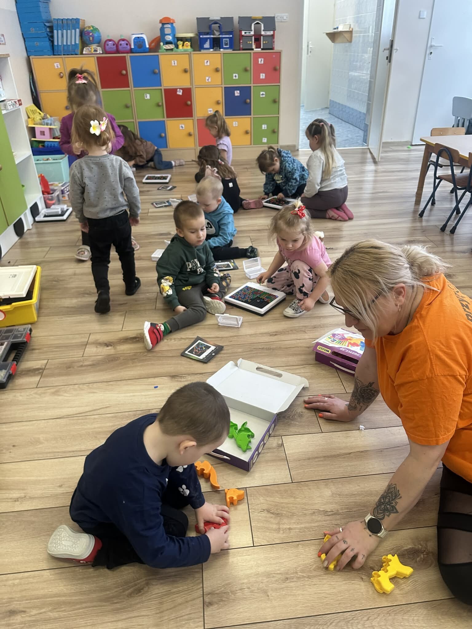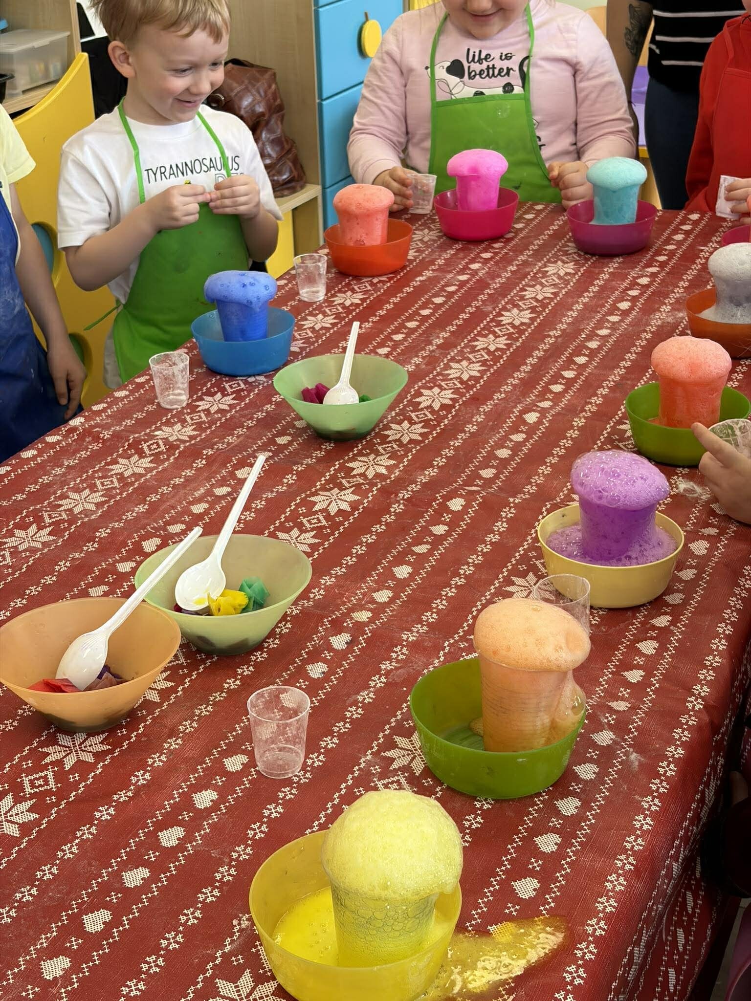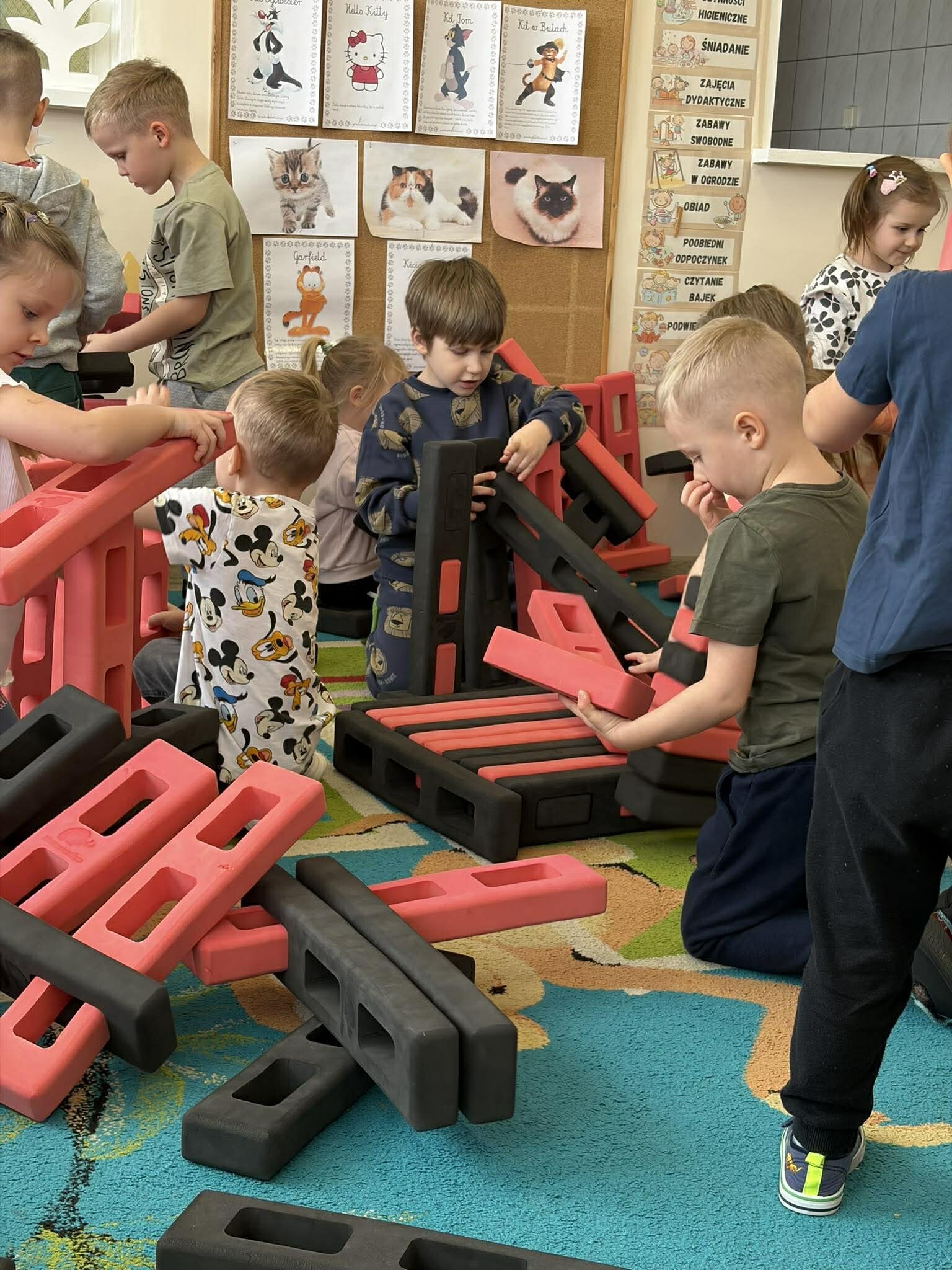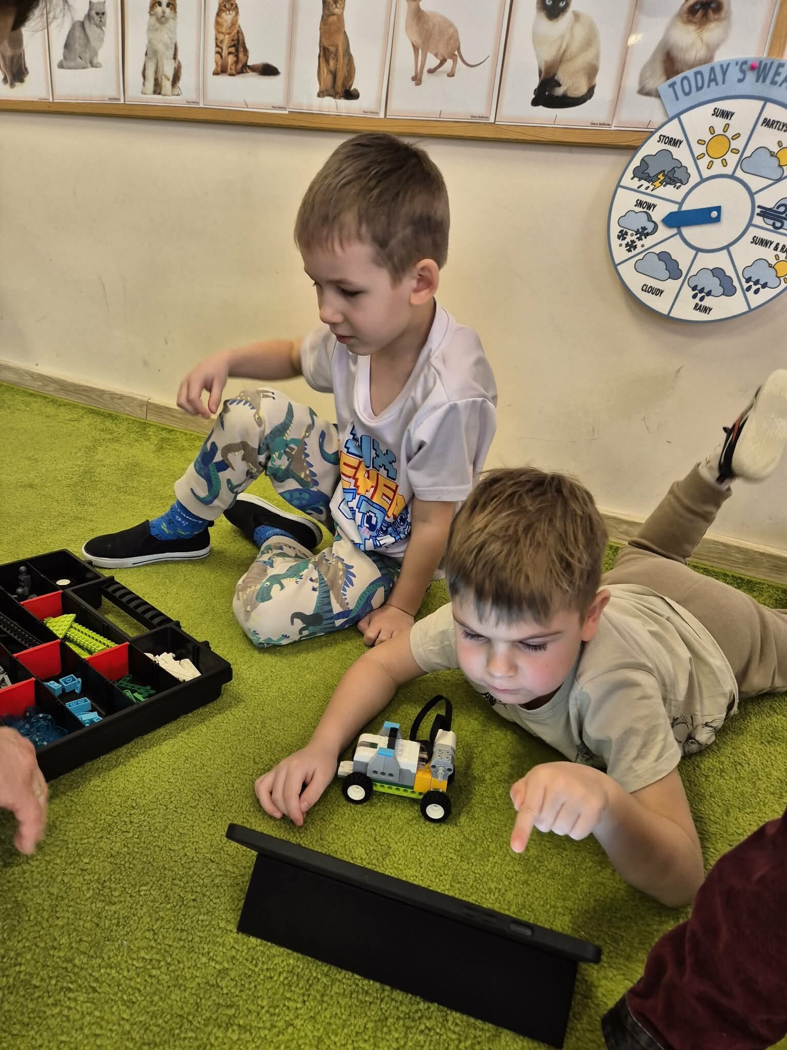 Podczas zajęć przedszkolaki miały okazję konstruować własne autoroboty, rozwijając przy tym wyobraźnię oraz zdolności manualne. Dużo emocji towarzyszyło także mieszaniu farb – dzieci poznawały kolory podstawowe i obserwowały, jakie nowe barwy powstają po ich połączeniu. Nie zabrakło również wyzwań konstrukcyjnych. Mali inżynierowie budowali most z dużych klocków, ucząc się współpracy oraz planowania wspólnej pracy. Ogromne zainteresowanie wzbudził eksperyment z wybuchowym, kolorowym wulkanem. Dzieci z zaciekawieniem obserwowały reakcję chemiczną i mogły poczuć się jak prawdziwi naukowcy.