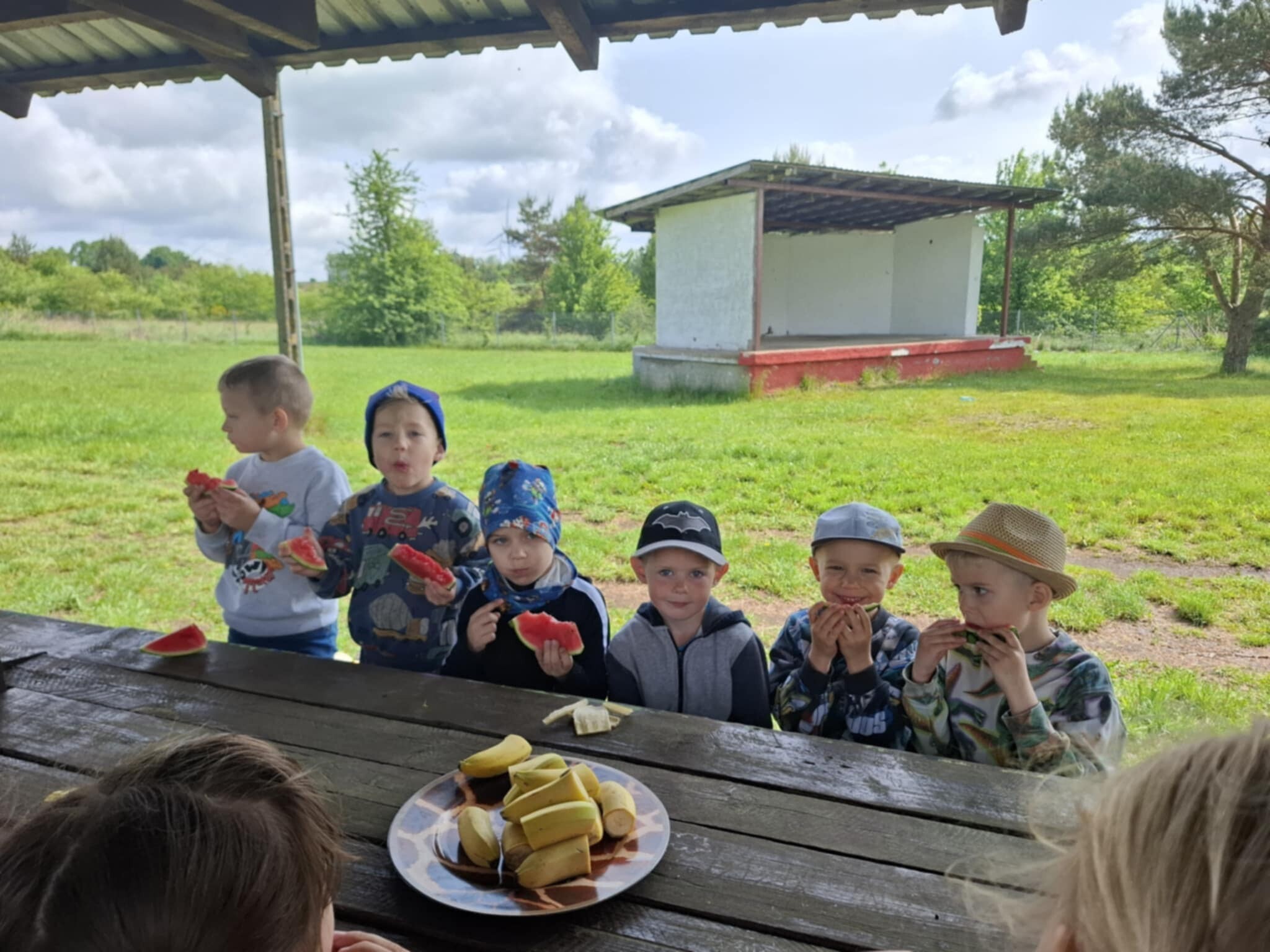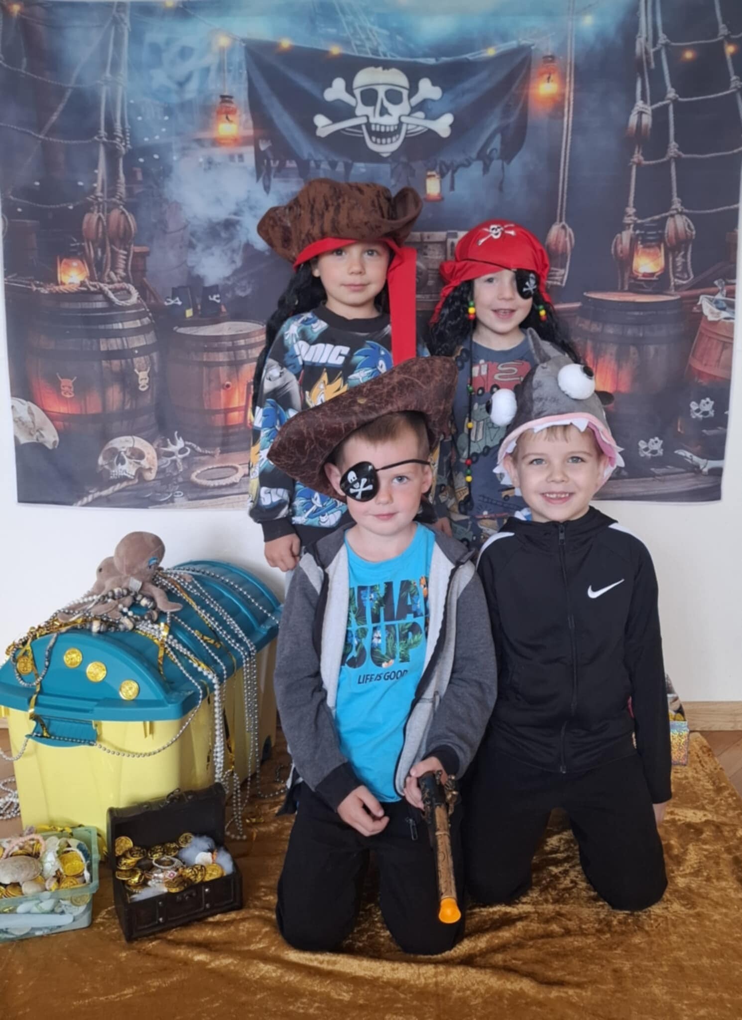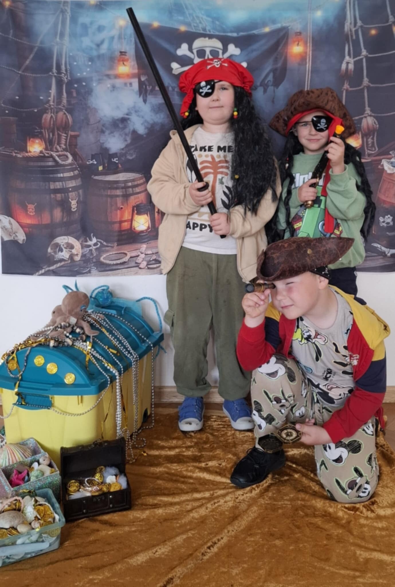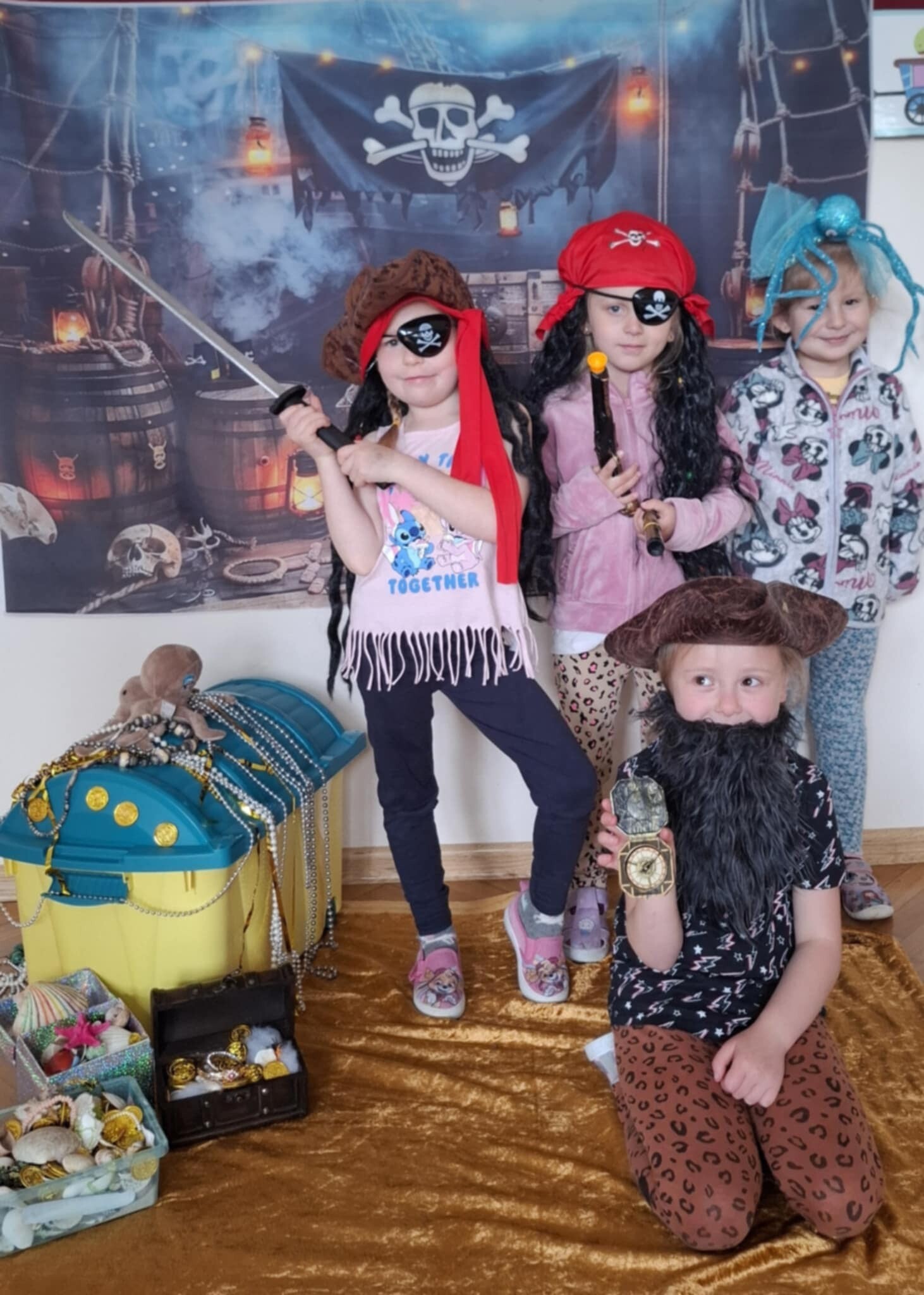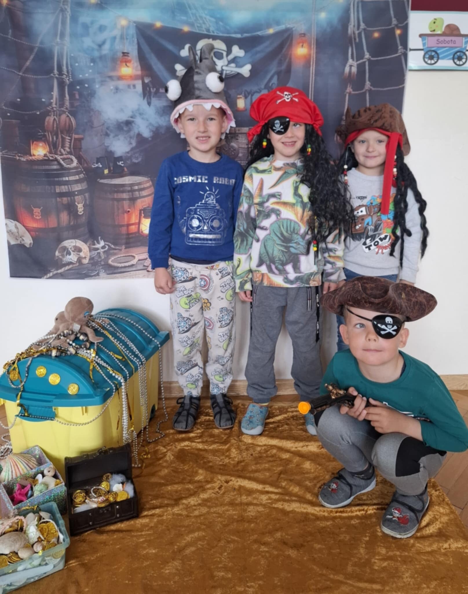 Dzieci z grupy „Kotki” i „Pszczółki” spędziły go na wykonywaniu zadań, które wraz z mapą prowadzącą do ukrytego skarbu, w tajemniczy sposób zostawił im Pirat Białobrody w sali przedszkolnej. Dzieci stanęły przed prawdziwym wyzwaniem, gdyż zadania ukryte były w różnych częściach budynku szkolnego oraz okolicach przedszkola. Motywowane odnalezieniem tajemniczego skarbu z wielkim zaangażowaniem wykonały siedem zadań. Między innymi zaśpiewały piracki hymn, rzucały kulami armatnimi do celu. Poradziły sobie także ze sztormem na morzu, a na folii namalowały piękny krajobraz morski. Po wielkim wysiłku nasi mali rozbójnicy naładowali energię podczas zdrowego, owocowego posiłku i bardzo lubianych przez dzieci pysznych lodach. Na koniec, ku wielkiej radości, odnaleźli skarb ukryty w pobliskim, szkolnym sadzie.