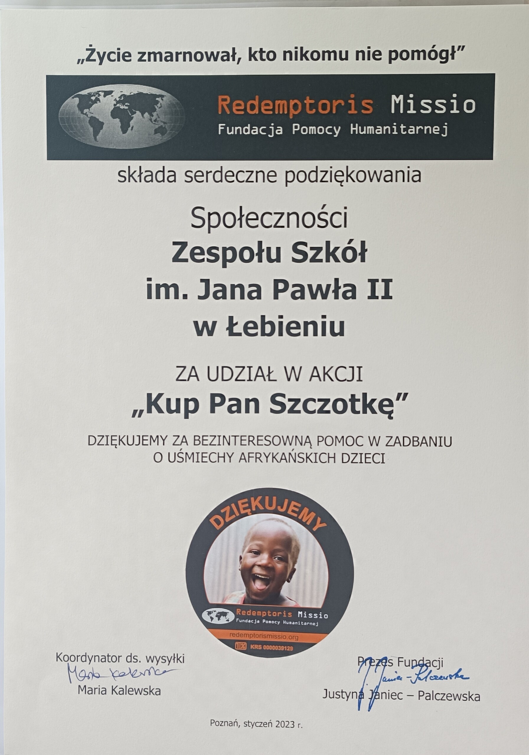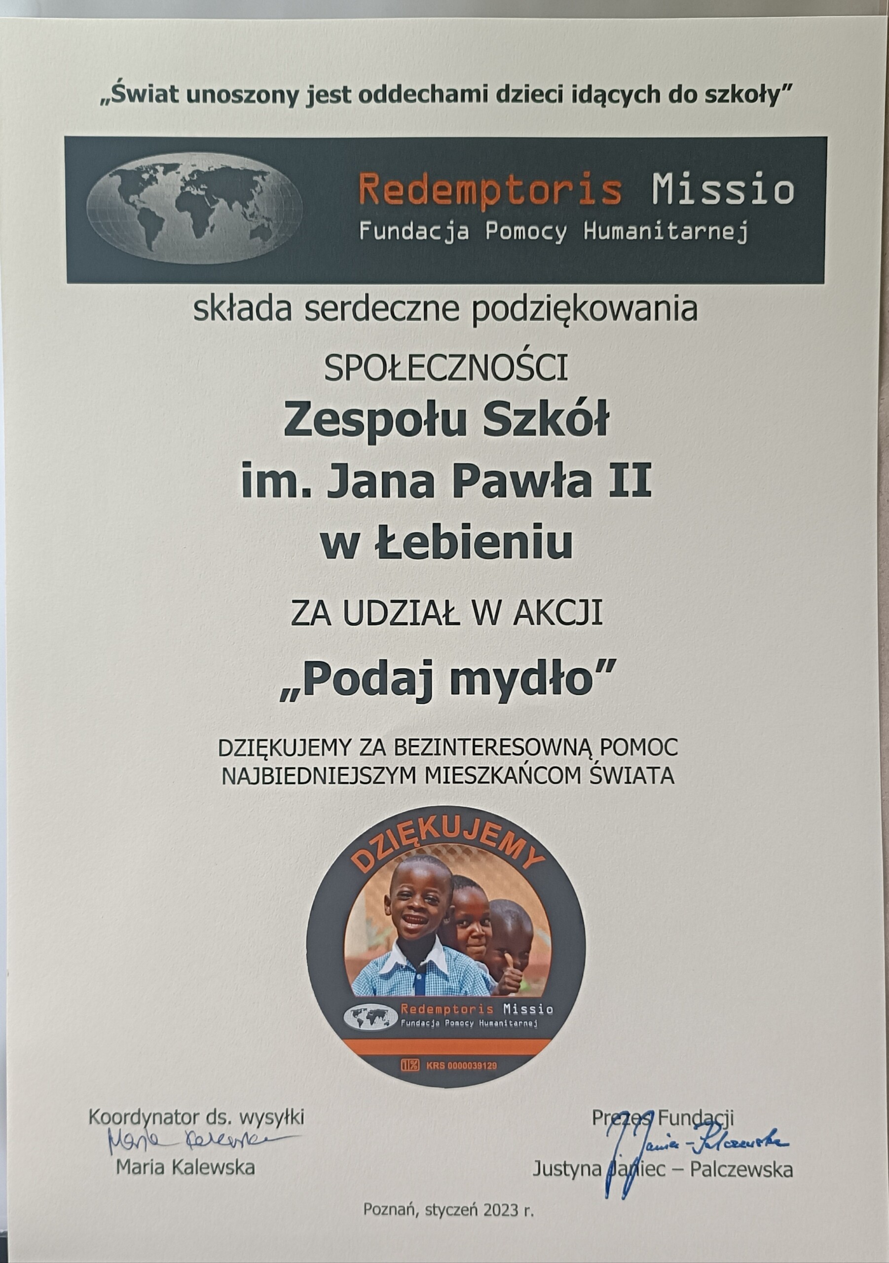 Z końcem listopada ubiegłego roku nasza szkoła przystąpiła do ogólnopolskiej akcji ,,Podaj mydło” i „Kup Pan szczoteczkę”, której organizatorem jest Fundacja Pomocy Humanitarnej Redemptoris Missio z Poznania. Akcja w naszej szkole trwała do 14 stycznia.
