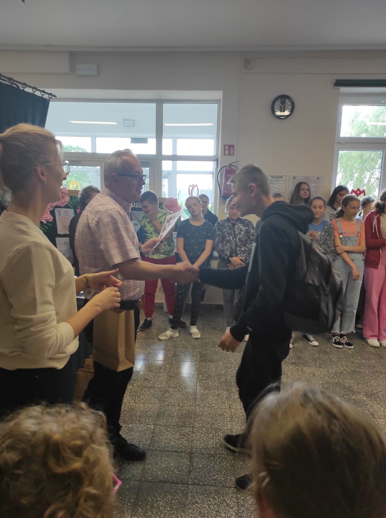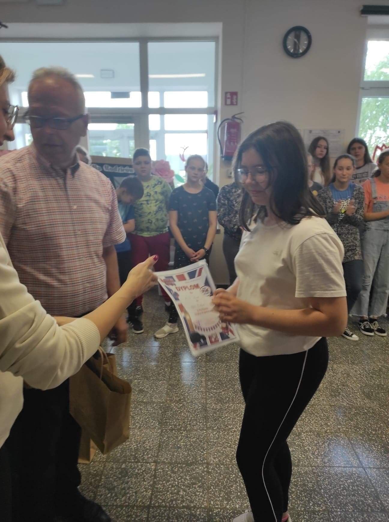 Uczniowie klas 1-3 odebrali nagrody w konkursie plastycznym z języka angielskiego o krajach anglojęzycznych. Pierwsze miejsce otrzymał Mateusz Borzęcki z klasy pierwszej, druga nagroda przypadła Mai Szarafińskiej z klasy trzeciej, natomiast trzecią odebrały Zuzanna Bakalarska i Monika Miazek z klasy trzeciej.