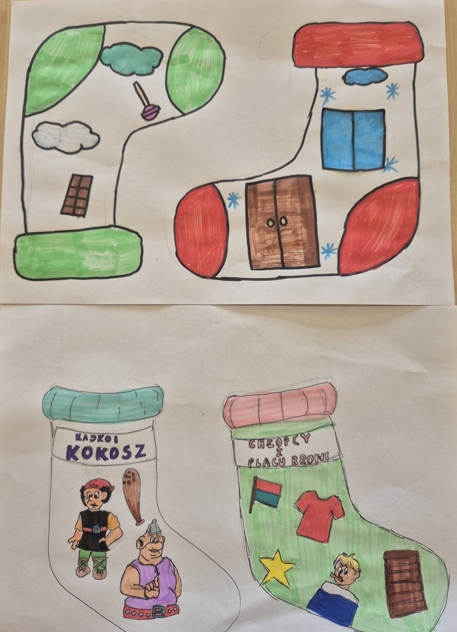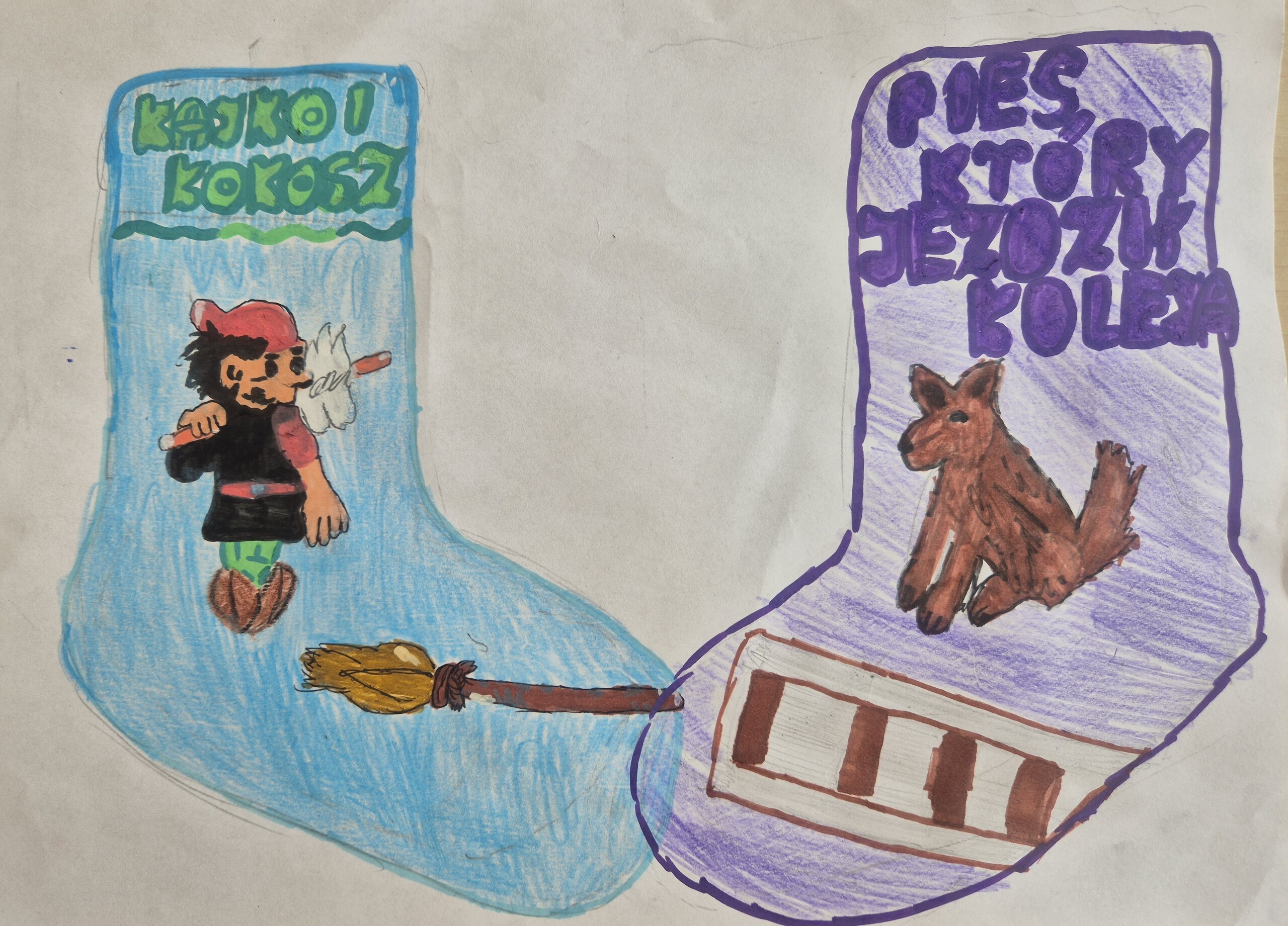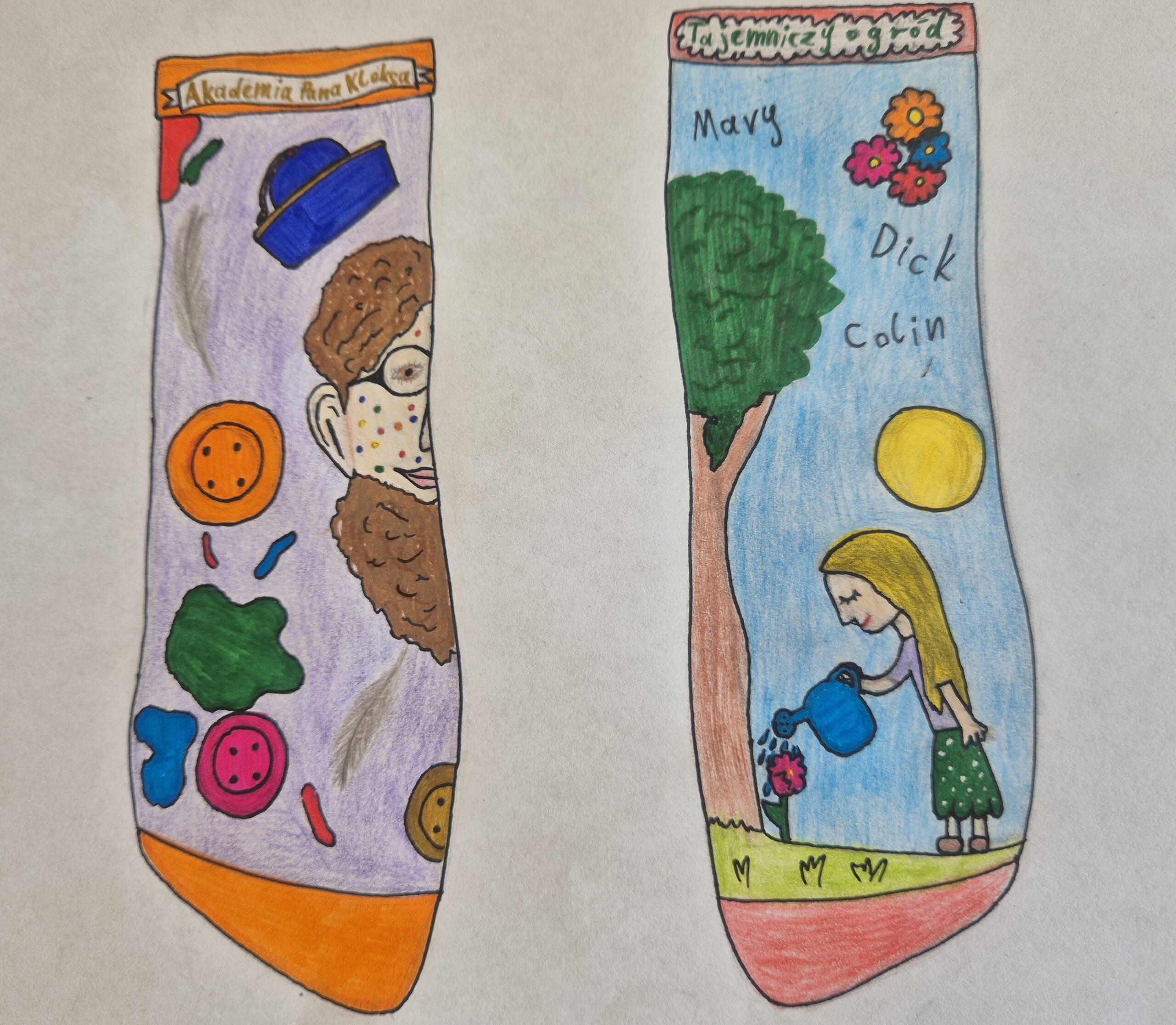 "Skarpetki nie do pary" to kolejne zadanie, z którego uczniowie klasy 5 wywiązali się w ramach Ogólnopolskiego Projektu Edukacyjnego "Polak na essę!2". Piątoklasiści zaprojektowali skarpetki, na których umieścili symbole graficzne związane z ulubionymi lekturami omawianymi podczas lekcji języka polskiego. To zadanie było inspiracją i naszym powtórzeniem wiedzy dotyczącej elementów świata przedstawionego w dotychczas poznanych utworach. Oto plastyczne efekty.