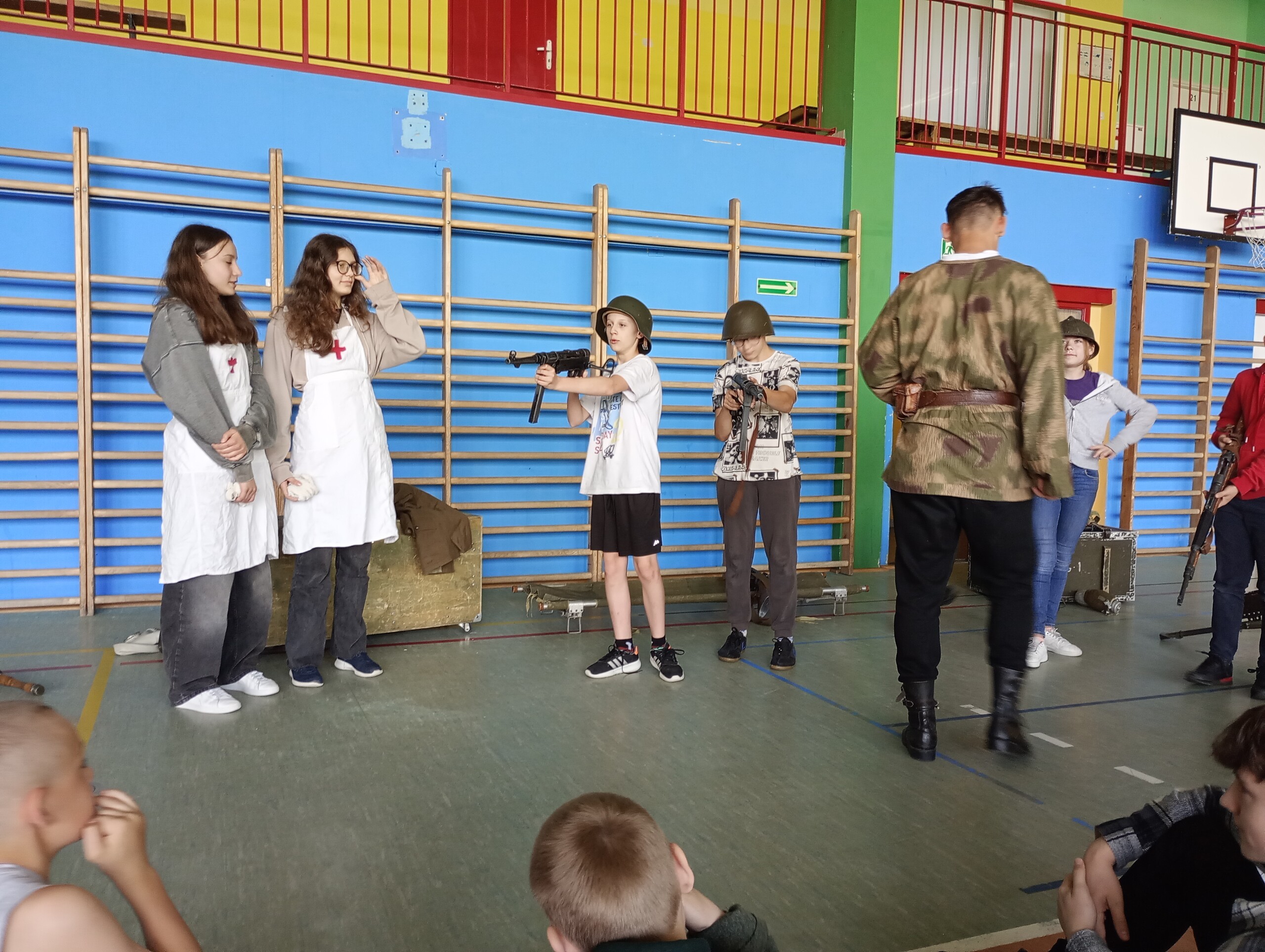 7 maja 2024 roku uczniowie naszej szkoły wzięli aktywny udział w żywej lekcji historii przeprowadzonej przez grupę artystyczną „Rekonstrukto” pod tytułem „Powstanie Warszawskie”.